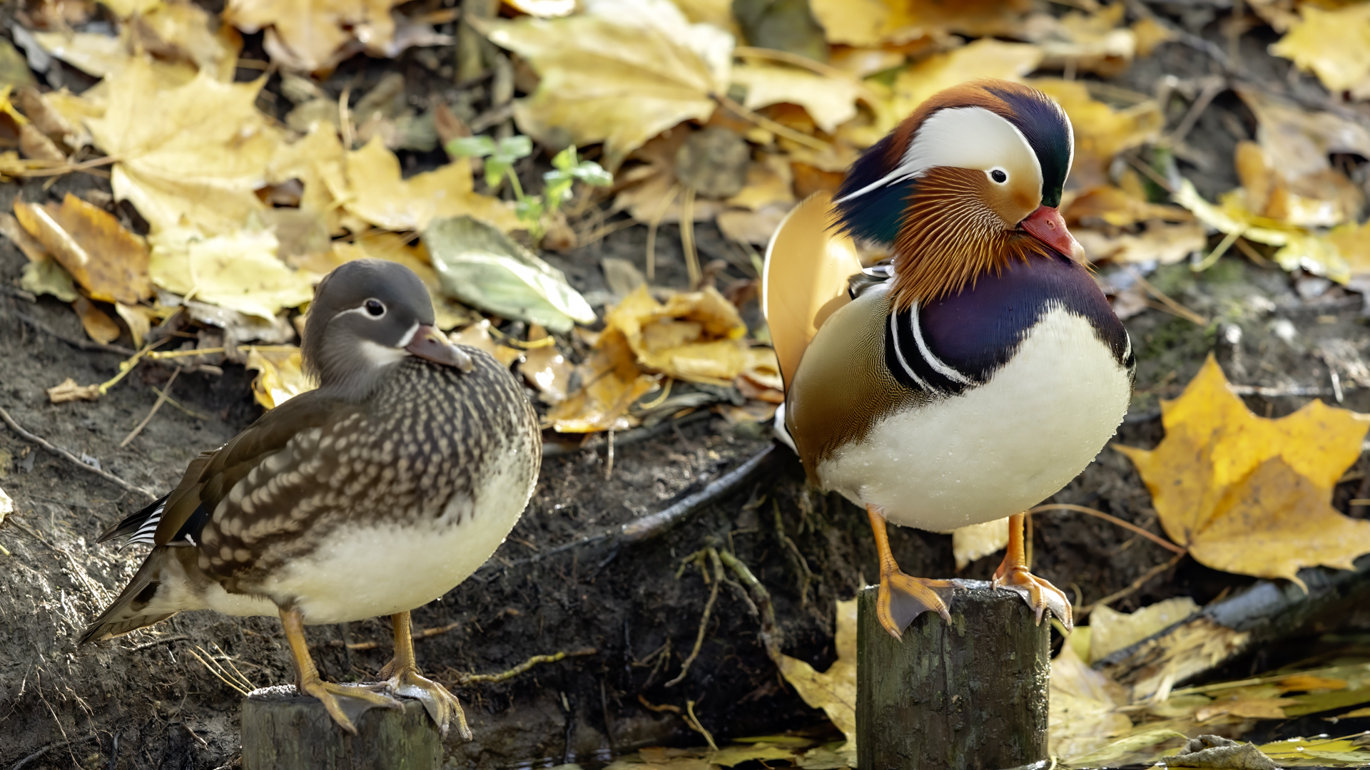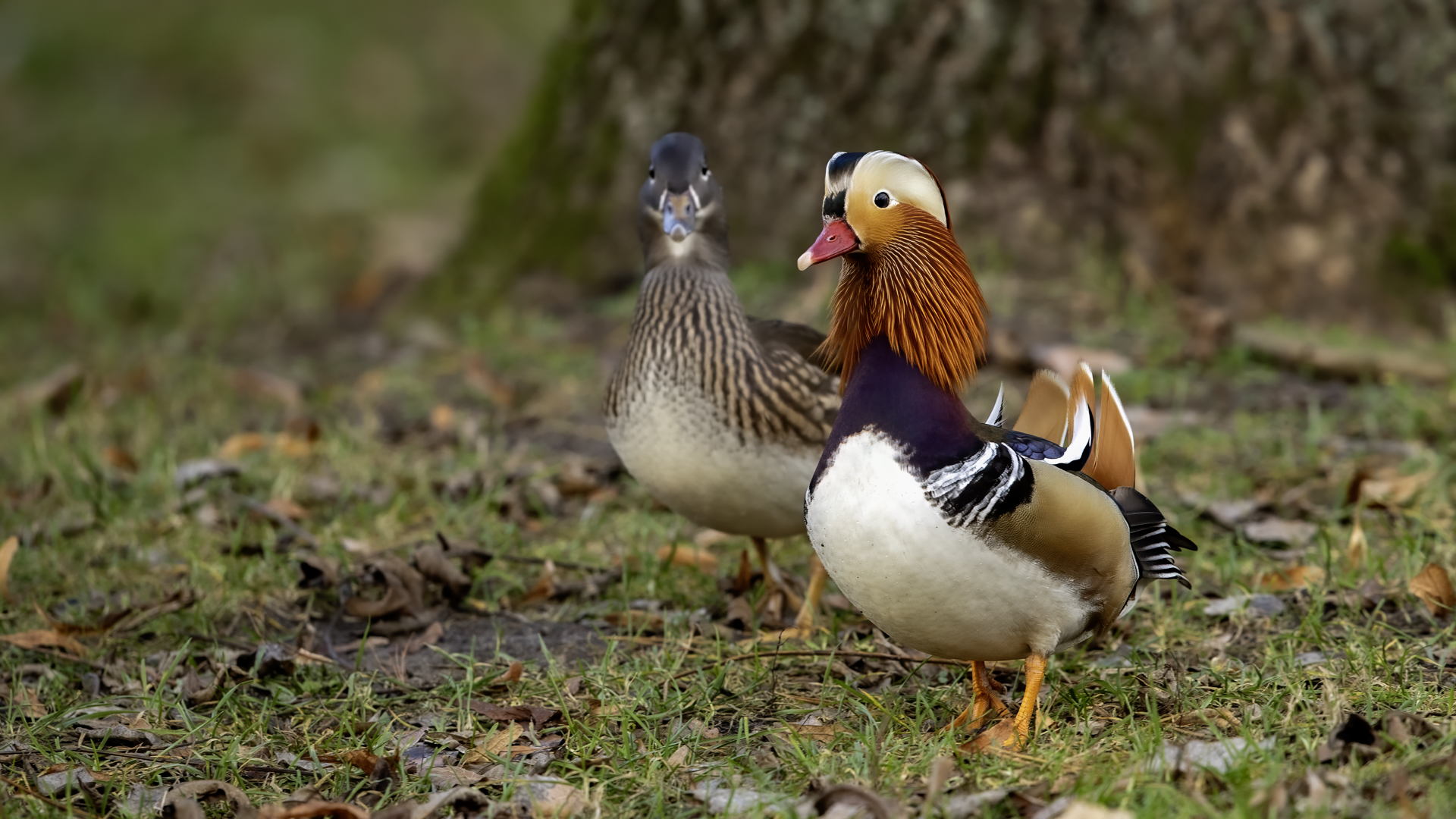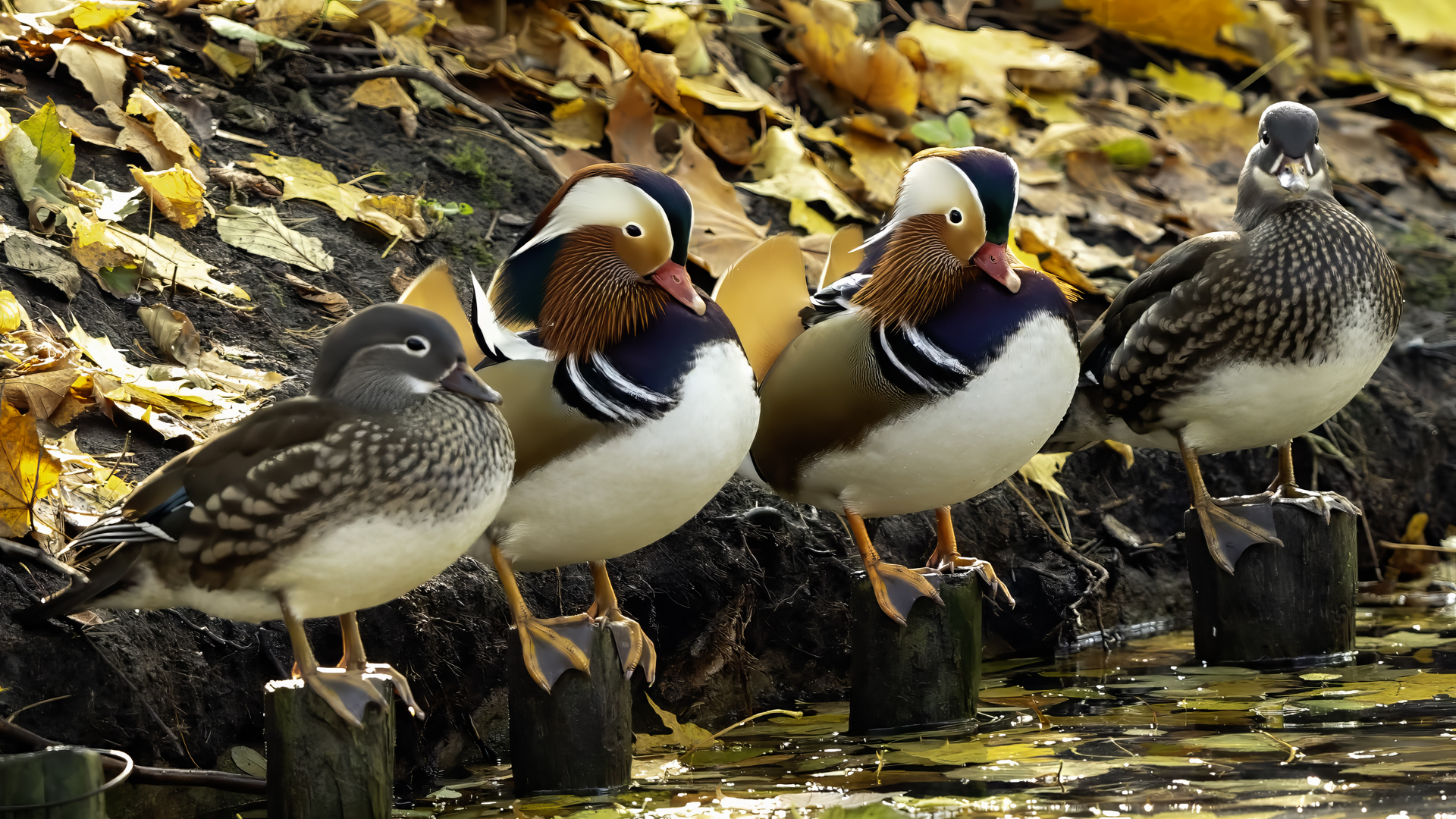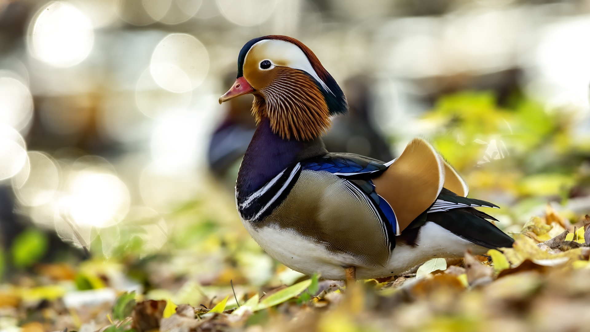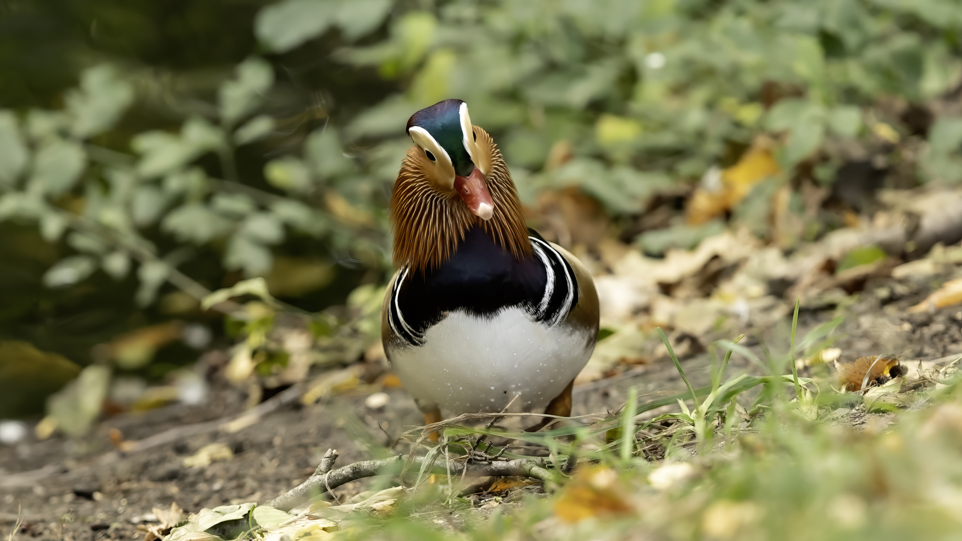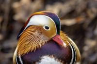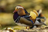 The mandarin duck does not belong to the group of our native species. Taking so many photos of this colorful bird in our country is perhaps possible only in the Royal Lazienki Gardens in Warsaw. Although they are fed in winter, and the hosts of the park do not let water freeze, the ducks are free and half-wild. An interesting thing is that the mandarin duck is an arboreal duck. This means that it nests in tree hollows, sometimes at the height of a dozen plus meters. This is significant as the young in less than one day after hatching must jump from such a great height and get to water to have their first meal. It’s the mother duck that strongly urges them to perform this first and seemingly daredevil jump. Mandarin ducks reportedly came to Łazienki Park all by themselves, and their population is still increasing. They are undoubtedly a true adornment of our parks, although their natural place of occurrence is Eastern Asia (China and Japan). The mandarin duck is a medium-sized duck. It has a weight of about 0.5 kg, and a wingspan of about 70 cm.