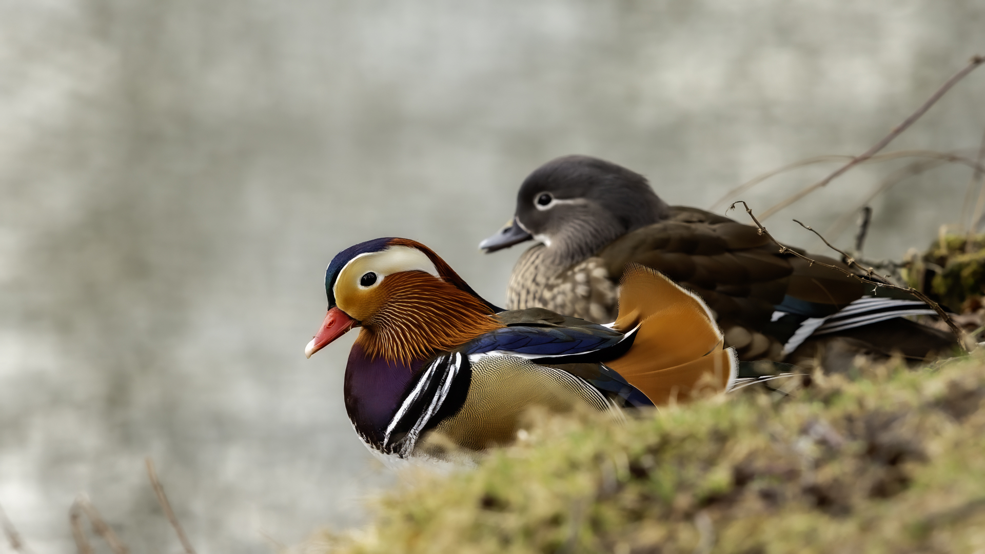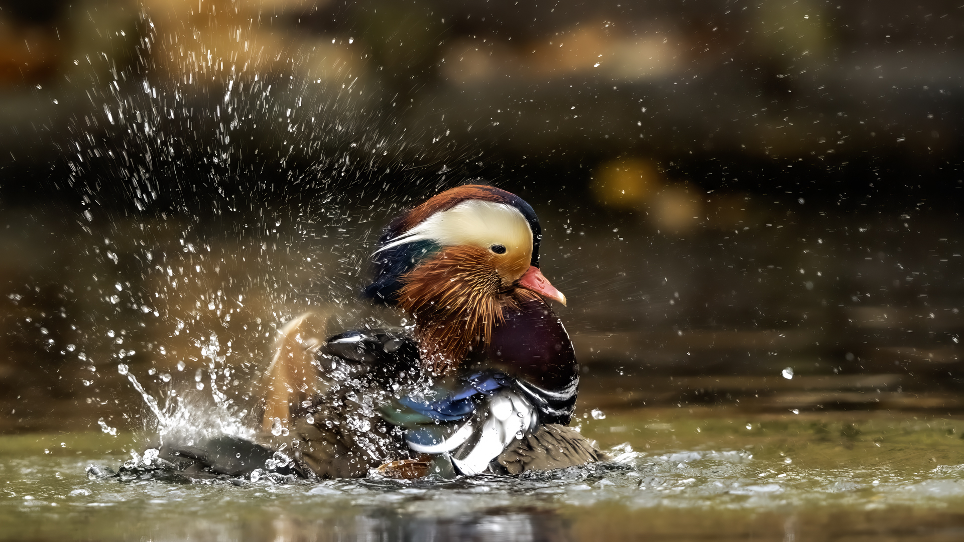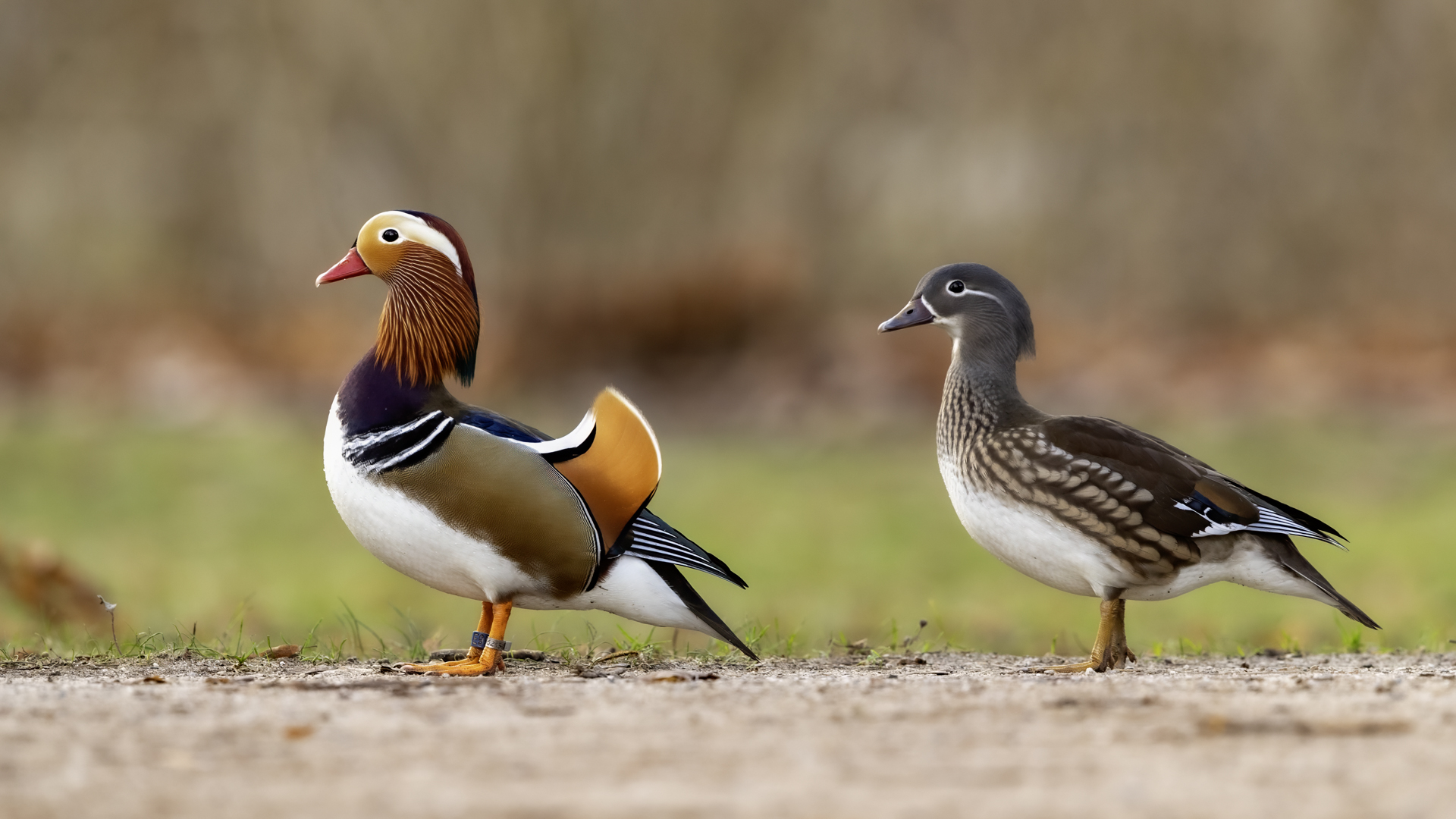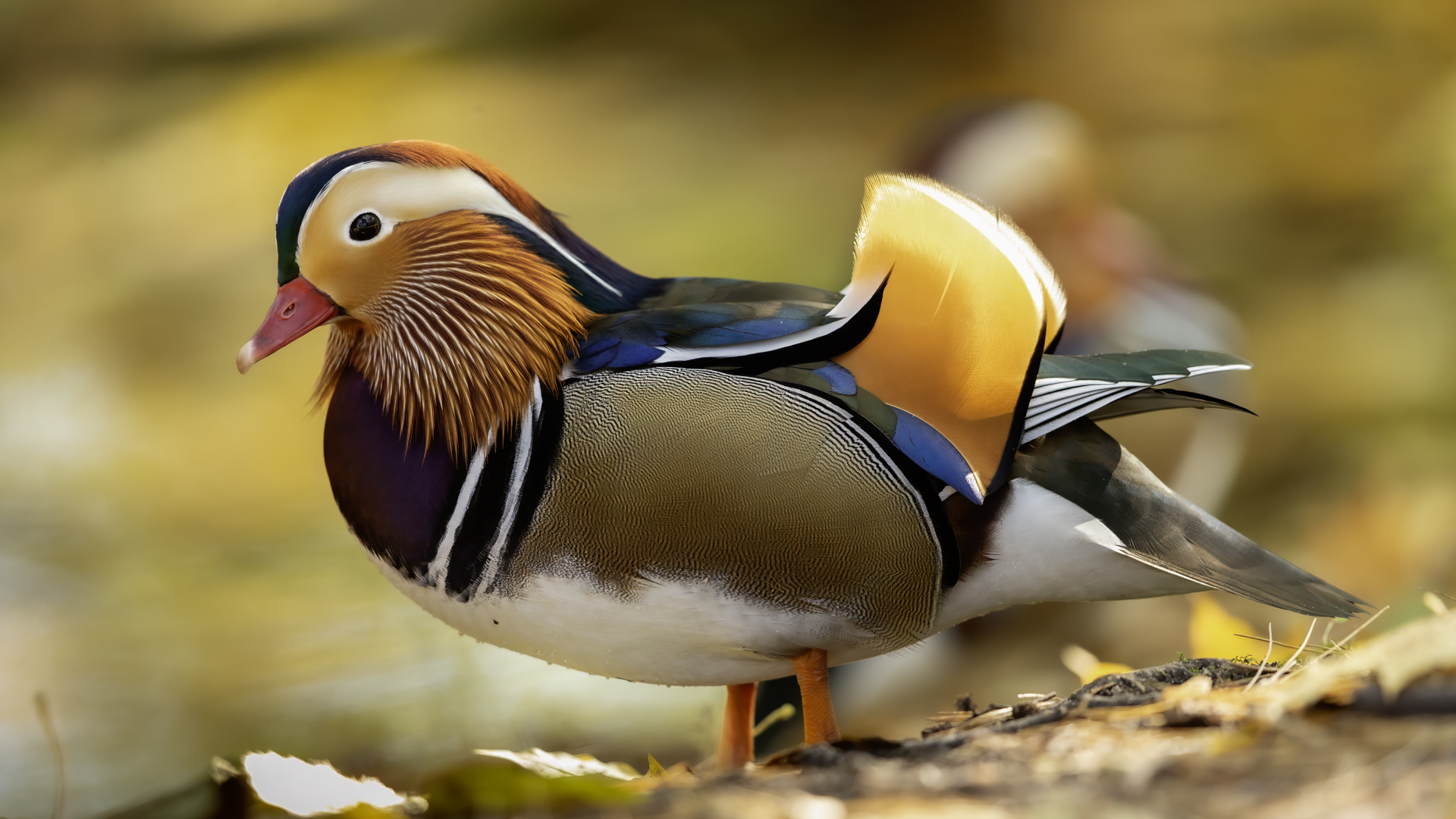 The mandarin duck does not belong to the group of our native species. Taking so many photos of this colorful bird in our country is perhaps possible only in the Royal Lazienki Gardens in Warsaw. Although they are fed in winter, and the hosts of the park do not let water freeze, the ducks are free and half-wild. An interesting thing is that the mandarin duck is an arboreal duck. This means that it nests in tree hollows, sometimes at the height of a dozen plus meters. This is significant as the young in less than one day after hatching must jump from such a great height and get to water to have their first meal. It’s the mother duck that strongly urges them to perform this first and seemingly daredevil jump. Mandarin ducks reportedly came to Łazienki Park all by themselves, and their population is still increasing. They are undoubtedly a true adornment of our parks, although their natural place of occurrence is Eastern Asia (China and Japan). The mandarin duck is a medium-sized duck. It has a weight of about 0.5 kg, and a wingspan of about 70 cm.