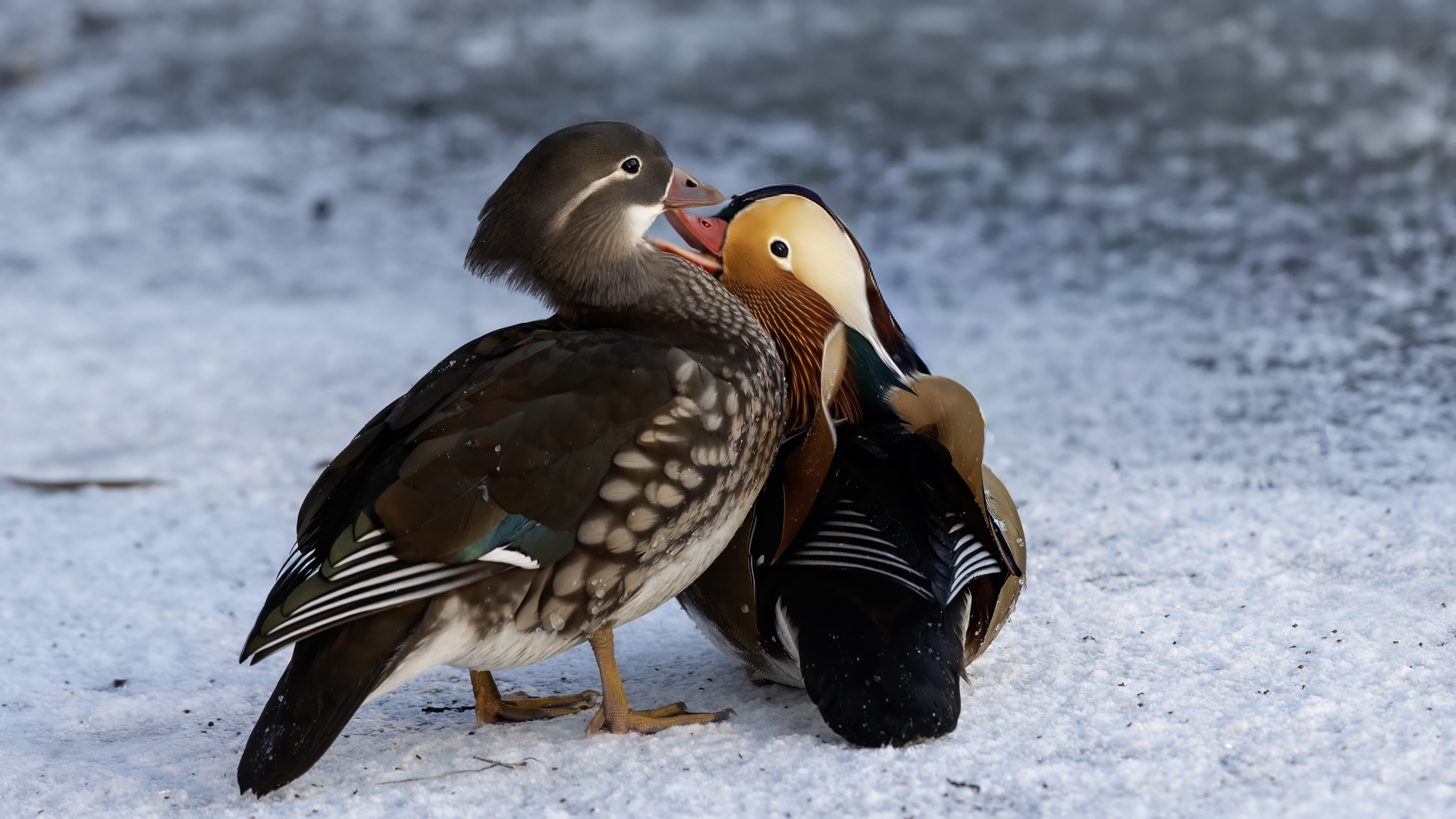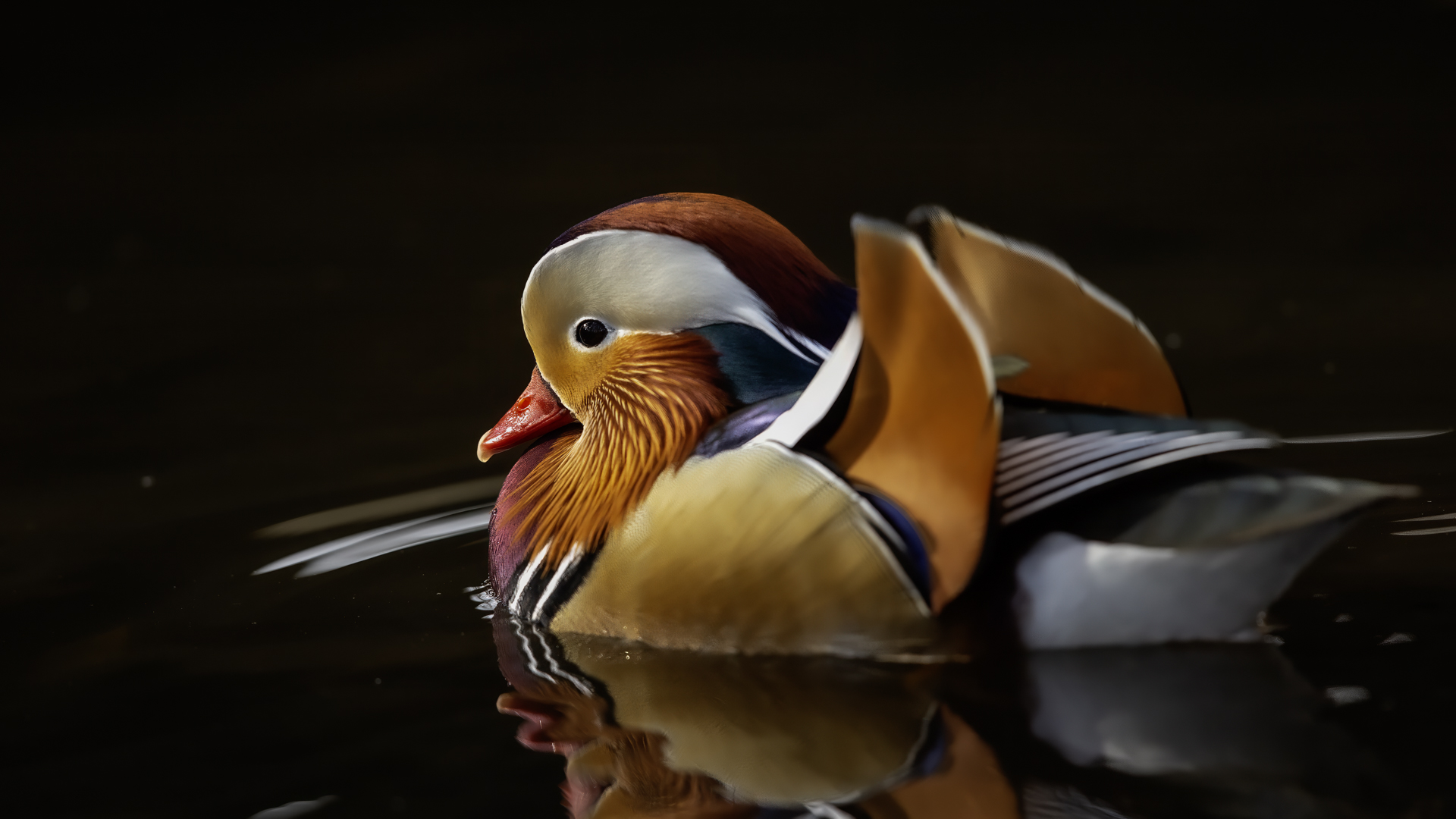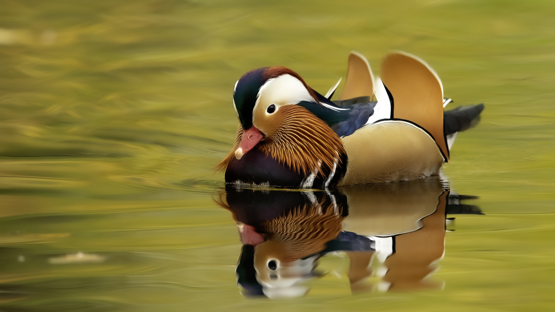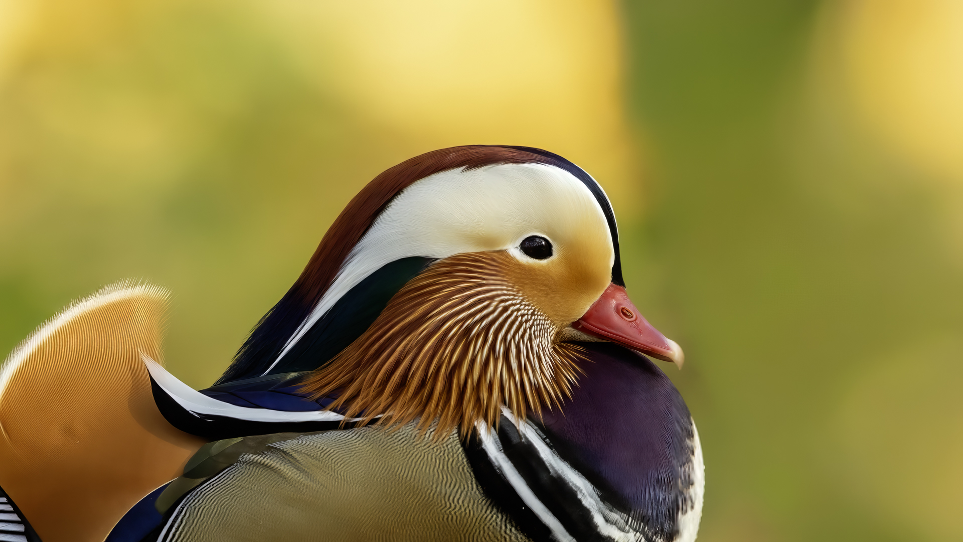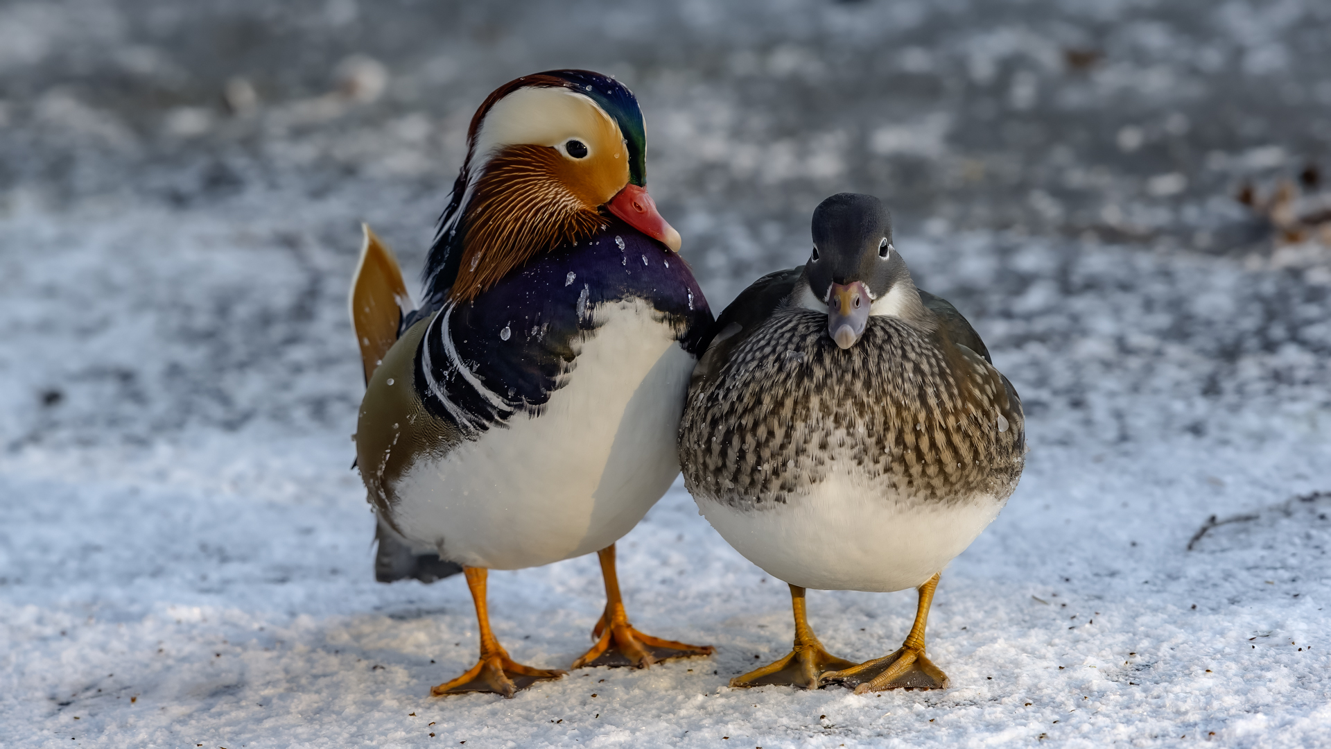 The mandarin duck does not belong to the group of our native species. Taking so many photos of this colorful bird in our country is perhaps possible only in the Royal Lazienki Gardens in Warsaw. Although they are fed in winter, and the hosts of the park do not let water freeze, the ducks are free and half-wild. An interesting thing is that the mandarin duck is an arboreal duck. This means that it nests in tree hollows, sometimes at the height of a dozen plus meters. This is significant as the young in less than one day after hatching must jump from such a great height and get to water to have their first meal. It’s the mother duck that strongly urges them to perform this first and seemingly daredevil jump. Mandarin ducks reportedly came to Łazienki Park all by themselves, and their population is still increasing. They are undoubtedly a true adornment of our parks, although their natural place of occurrence is Eastern Asia (China and Japan). The mandarin duck is a medium-sized duck. It has a weight of about 0.5 kg, and a wingspan of about 70 cm.