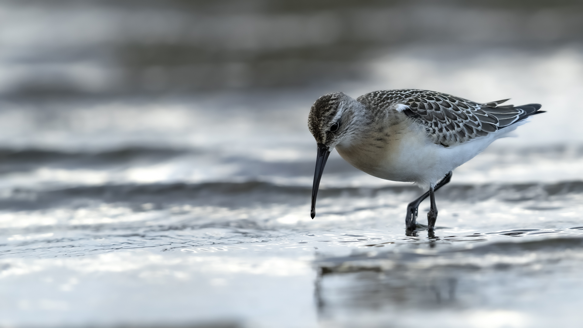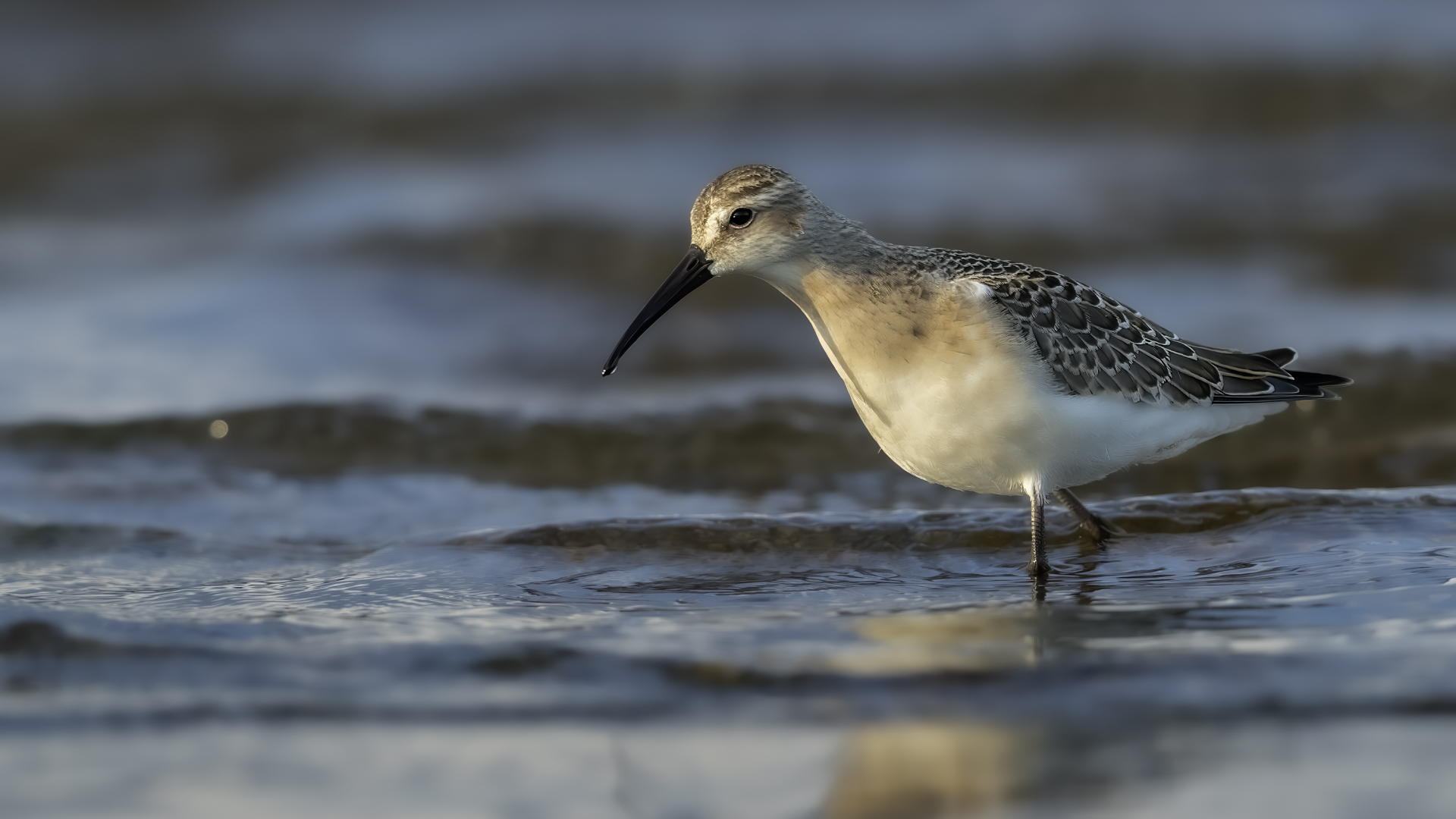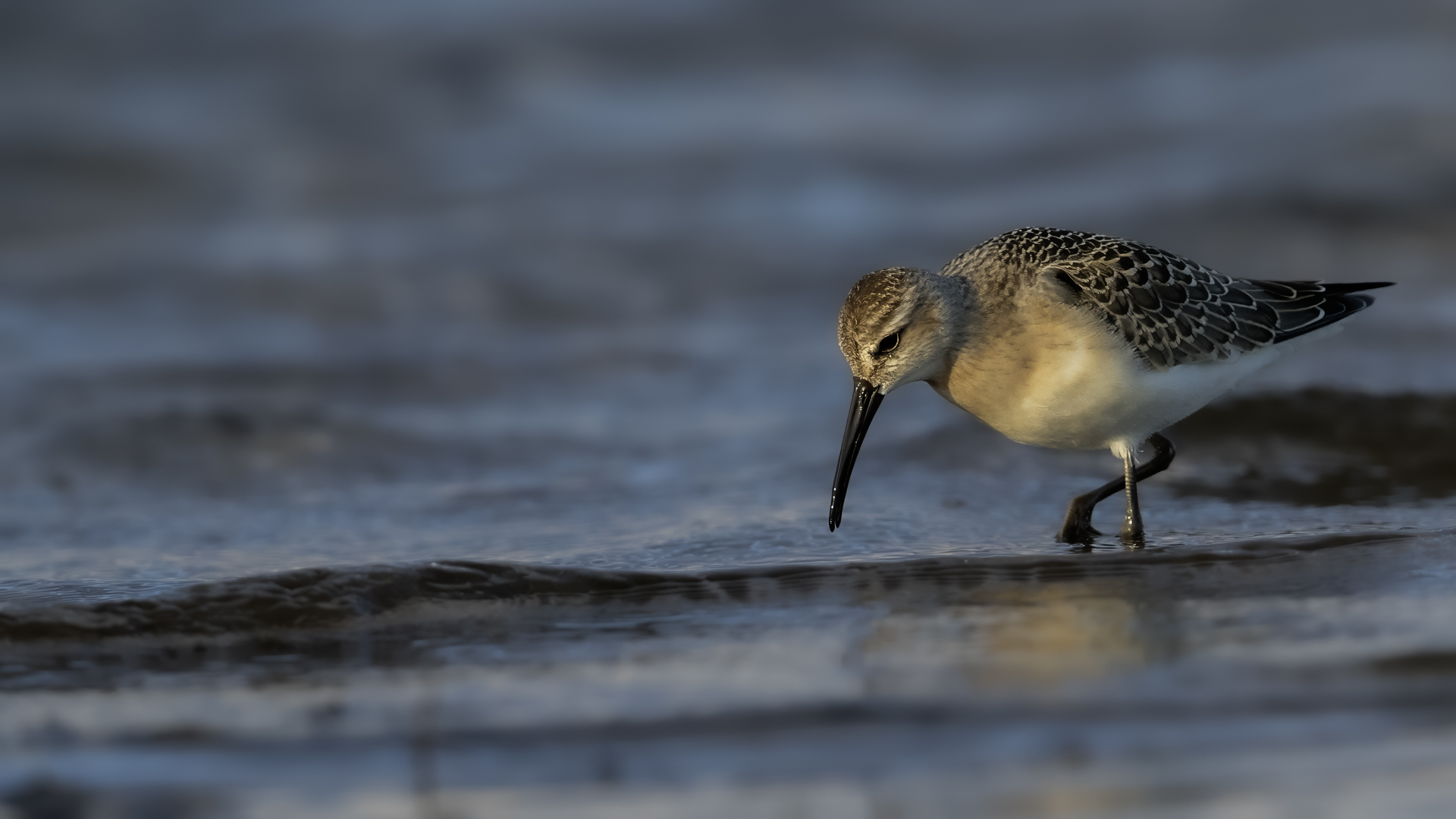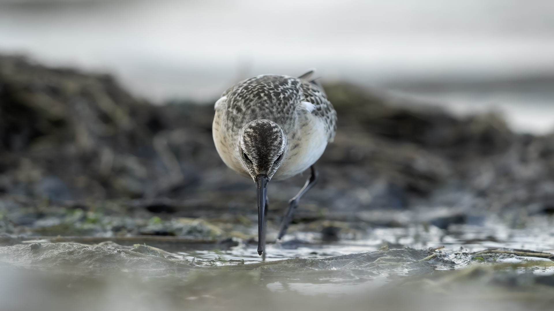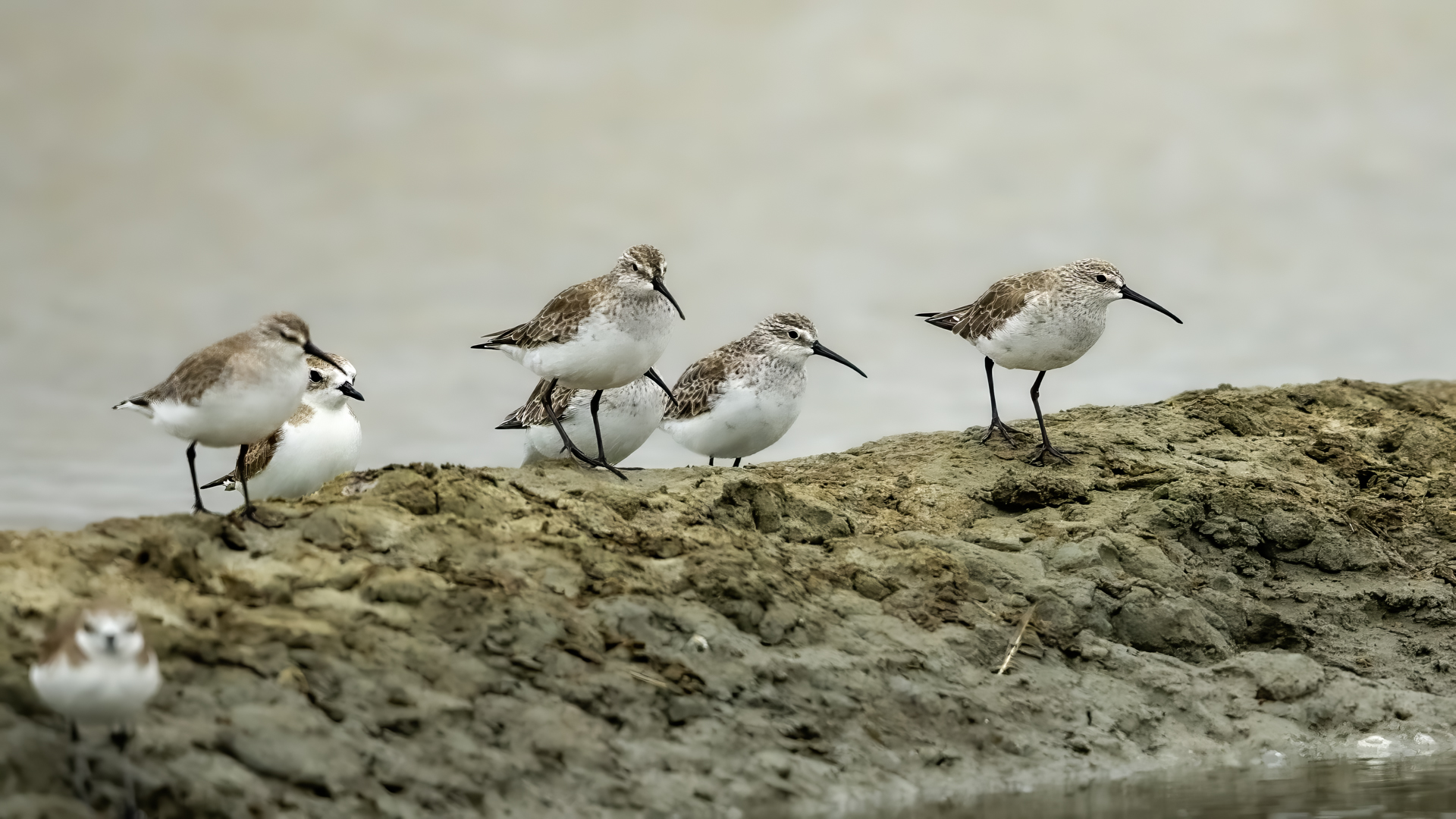 Our previous attempts to photograph Eurasian Curlews were always related to dawn, in the morning. And, since the scenario of the birds' behavior always repeated itself and it was difficult to get photos in good light, something has to change in our operation. I decided to sit in the shelter from noon to dusk. I wonder if Curlews frequent the reservoir during the day and feed on it. To find out you have to watch from the shelter and check. As I planned so I did. Already on the very approach to the shelter a pleasant surprise. Several charadiiformers  dabblers took flight at the sight of me. As it turned out a very short one, because they made a small circle and sat between me and the shelter few dozen meters away. The first pictures were taken just like over our sea during the autumn bird migration. This lasted a minute or two, because it is necessary to enter the shelter, because it is for the Curlews that I came here. For a few hours of waiting in the shelter, almost only the diarrheas appeared in front of the lens: the variable, the curlew and the sandpiper. During those few hours of waiting, I had a whole range of light and weather variability. From steel-contrast sunshine to a rainy downpour to, at the end of the day, a beautiful soft yellow light. In this light, the Gray heron, one of my favorite species, joined the ranks of photographed birds. Interesting photos of all these mentioned species are produced, so this text is common to all the mentioned species. Well, at a rather unusual time, a lot of interesting photos were created, introducing enough changes in the galleries to hit all the photographed species to the news on my website. For the first time in my life I photographed charadriiformes from shelter. They were almost all the time with me. Around 6:30 pm, the light was low enough that I decided to stop photographing at this point. After packing up for a while, I leave the chat room walking in the shallows towards to the car. Suddenly I hear a familiar voice, which for several days has always announced the arrival of Curlews. Birds always landed with making their characteristic sound. I turned around and they are!  All seven of the Curlews, by now birds that had been observed for probably over a month. They landed on an island far away from me. A commemorative documentary photo emerged, which I added, for the time being, to the end of the  Curlew gallery. The birds stay there exclusively from dusk to dawn.