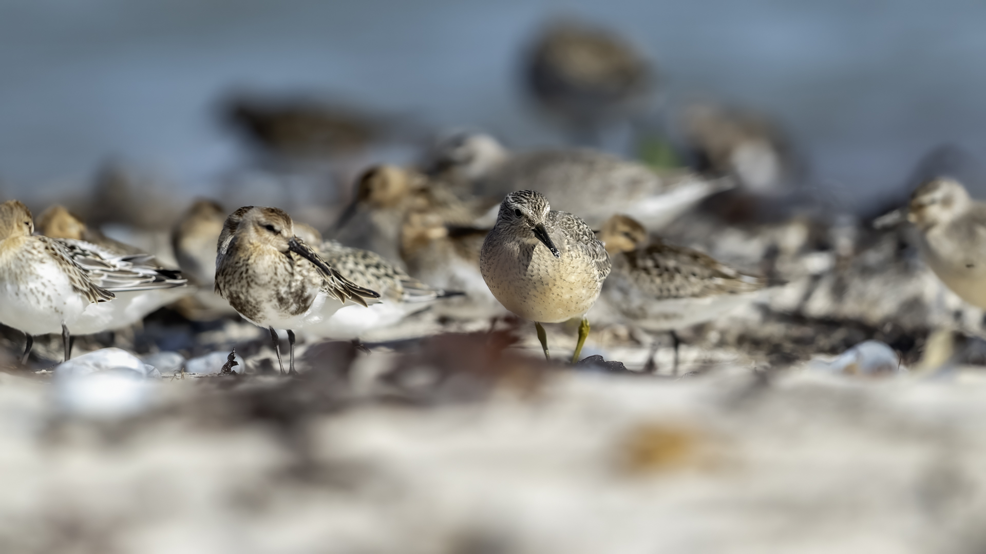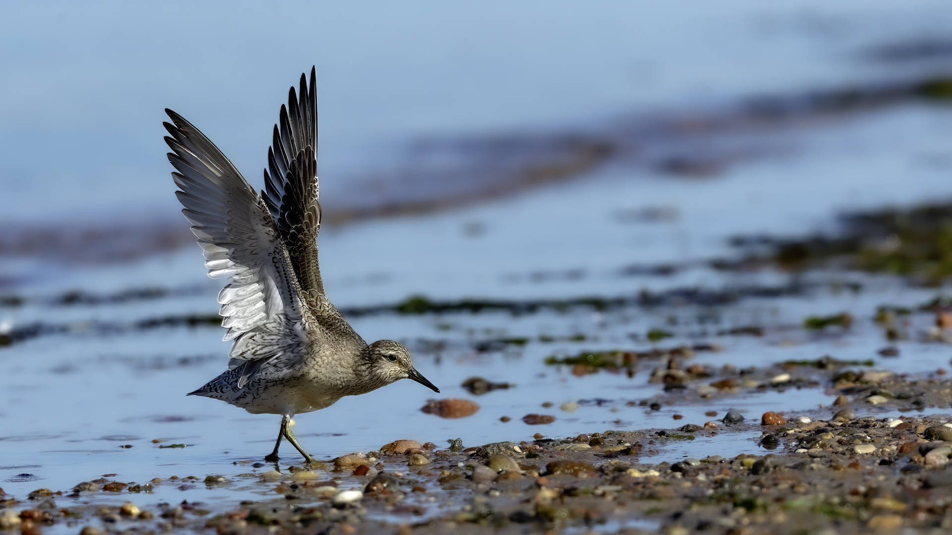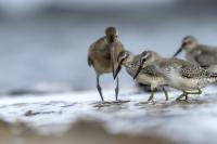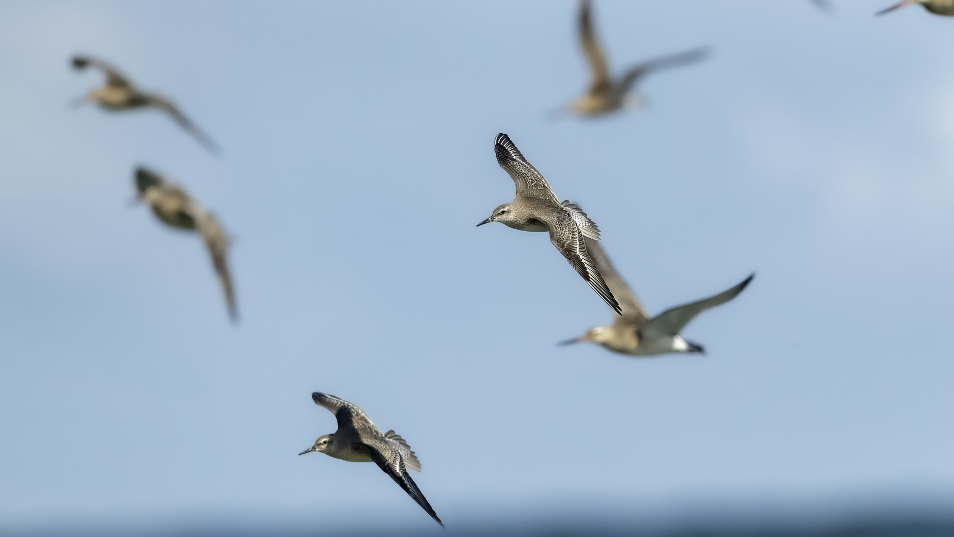 I have added some dynamic pictures of the red knot. Birds preying on the seashore took flight from time to time, only to return to the same feeding place after a while. Thanks to this, dynamic shots of sanderlings, bar- tailed dowits and red knots were created.