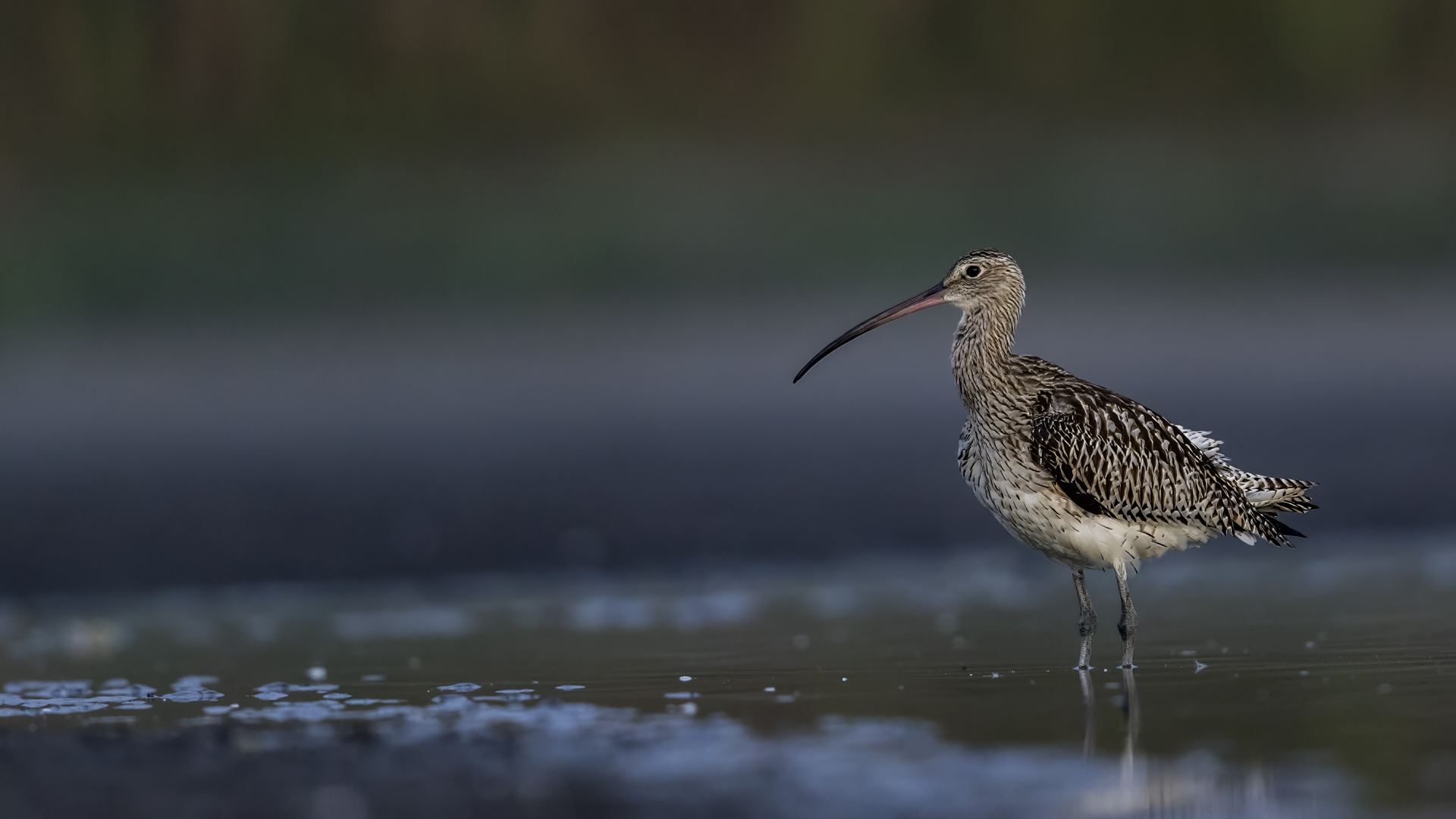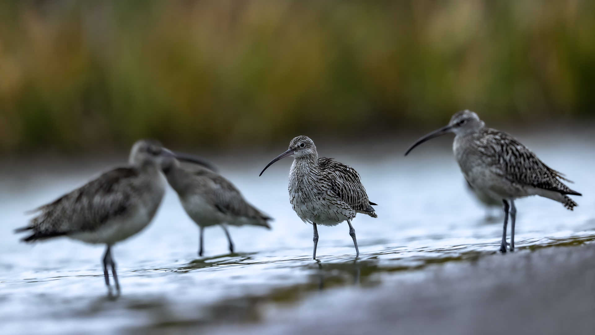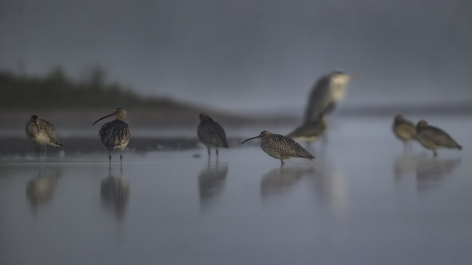 Our previous attempts to photograph Eurasian Curlews were always related to dawn, in the morning. And, since the scenario of the birds' behavior always repeated itself and it was difficult to get photos in good light, something has to change in our operation. I decided to sit in the shelter from noon to dusk. I wonder if Curlews frequent the reservoir during the day and feed on it. To find out you have to watch from the shelter and check. As I planned so I did. Already on the very approach to the shelter a pleasant surprise. Several charadiiformers dabblers took flight at the sight of me. As it turned out a very short one, because they made a small circle and sat between me and the shelter few dozen meters away. The first pictures were taken just like over our sea during the autumn bird migration. This lasted a minute or two, because it is necessary to enter the shelter, because it is for the Curlews that I came here. For a few hours of waiting in the shelter, almost only the diarrheas appeared in front of the lens: the variable, the curlew and the sandpiper. During those few hours of waiting, I had a whole range of light and weather variability. From steel-contrast sunshine to a rainy downpour to, at the end of the day, a beautiful soft yellow light. In this light, the Gray heron, one of my favorite species, joined the ranks of photographed birds. Interesting photos of all these mentioned species are produced, so this text is common to all the mentioned species. Well, at a rather unusual time, a lot of interesting photos were created, introducing enough changes in the galleries to hit all the photographed species to the news on my website. For the first time in my life I photographed charadriiformes from shelter. They were almost all the time with me. Around 6:30 pm, the light was low enough that I decided to stop photographing at this point. After packing up for a while, I leave the chat room walking in the shallows towards to the car. Suddenly I hear a familiar voice, which for several days has always announced the arrival of Curlews. Birds always landed with making their characteristic sound. I turned around and they are! All seven of the Curlews, by now birds that had been observed for probably over a month. They landed on an island far away from me. A commemorative documentary photo emerged, which I added, for the time being, to the end of the Curlew gallery. The birds stay there exclusively from dusk to dawn.