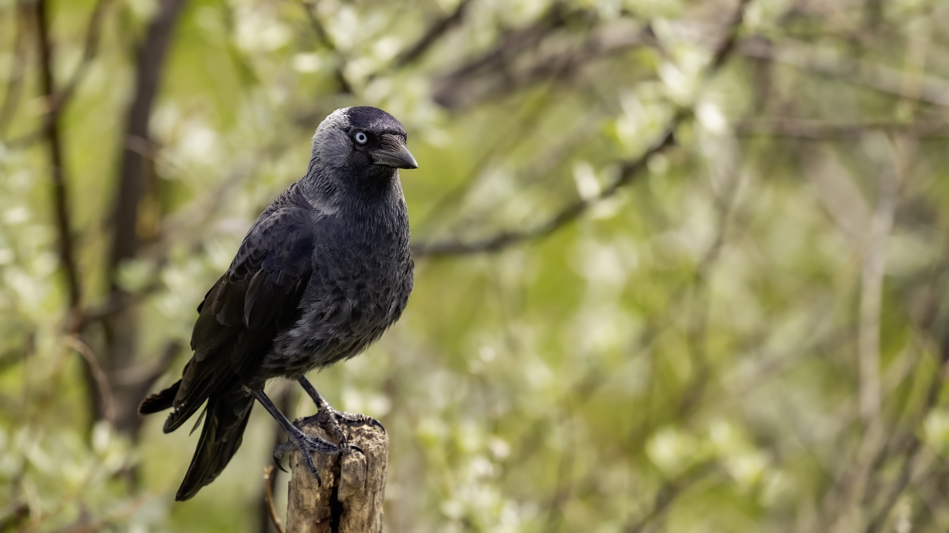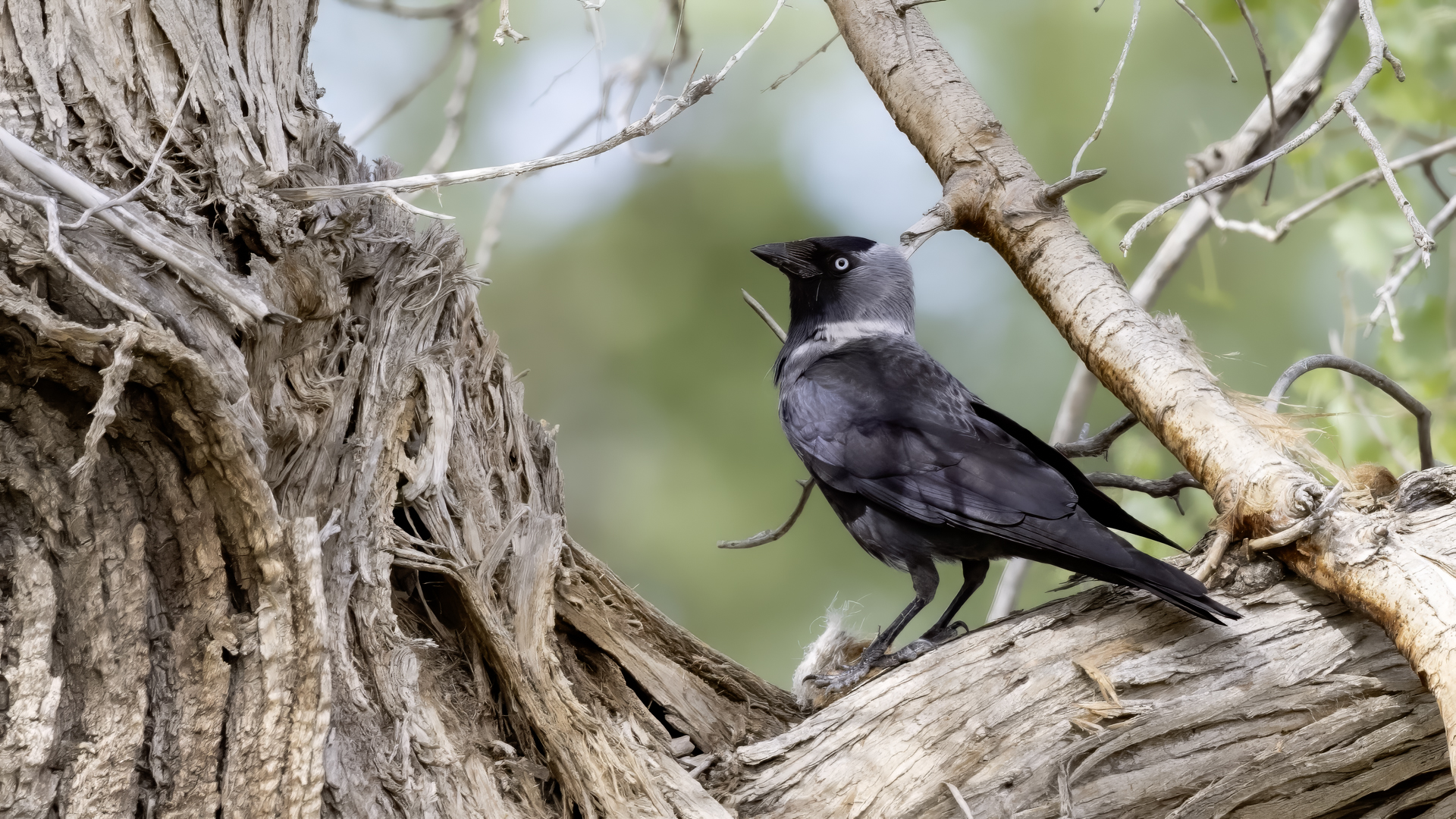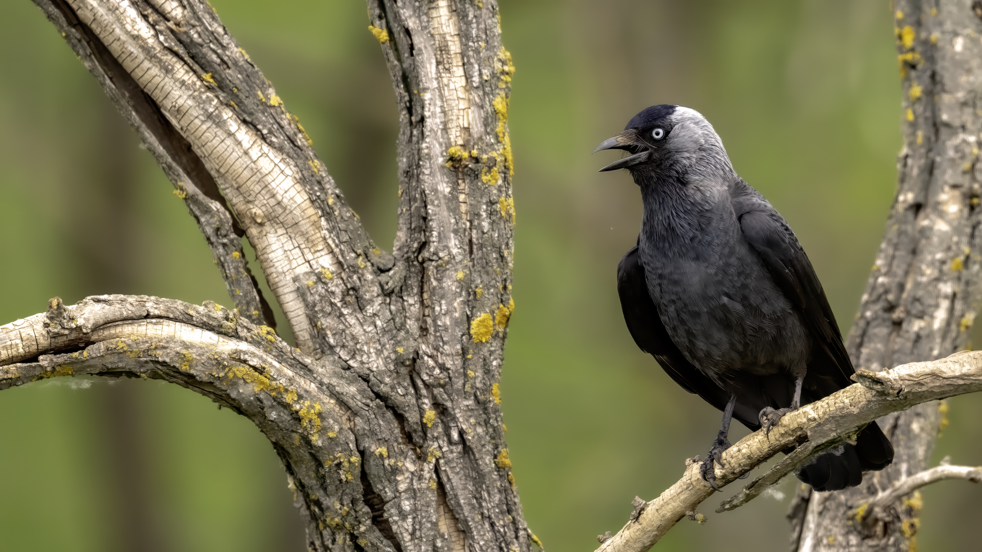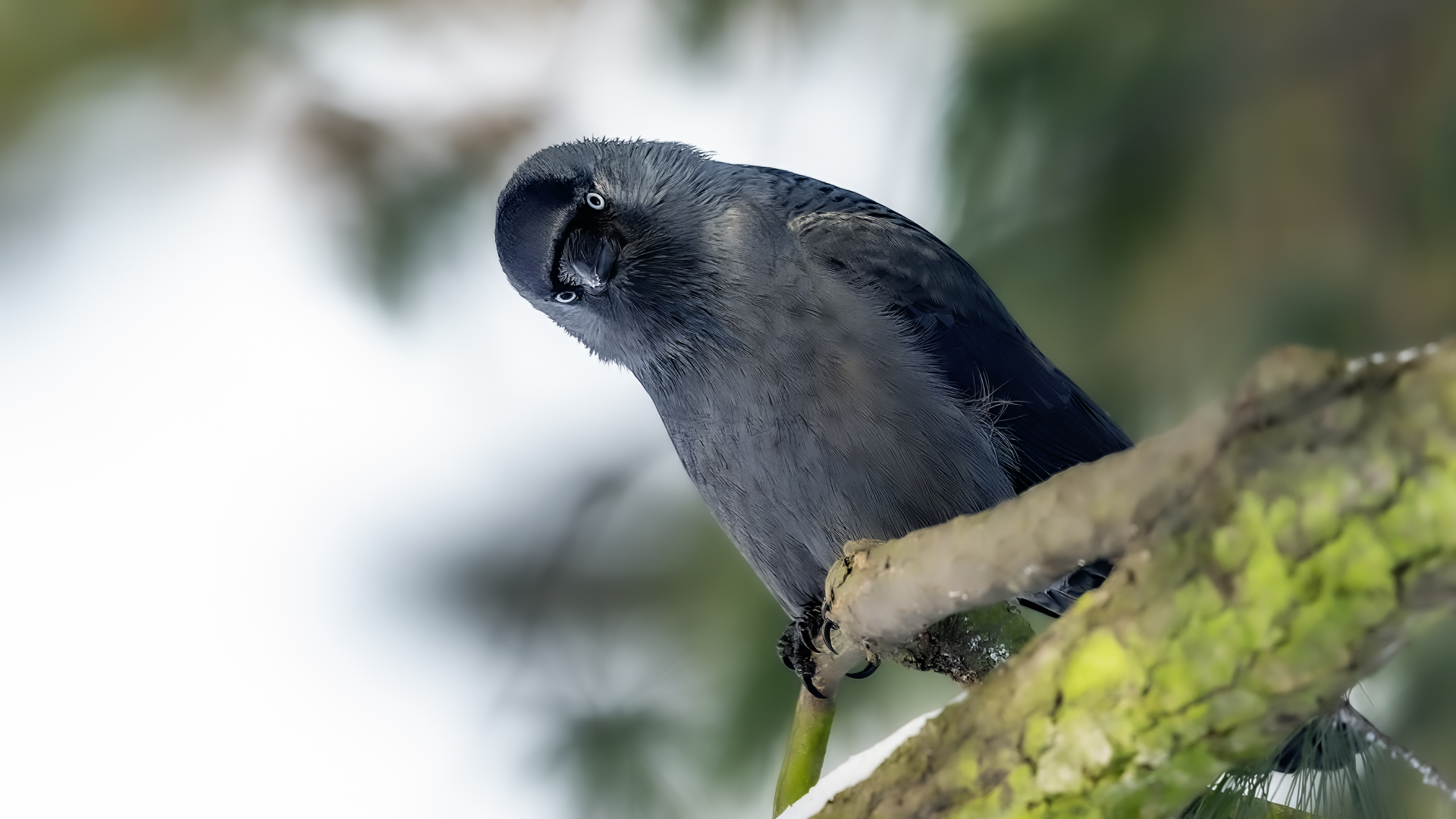 The western jackdaw is, next to the rook and the sparrow, another urban bird, which can be very easily photographed. From a certain distance, the jackdaw is seen as a black, perhaps dull bird. Everything changes when you reduce shooting distance or increase focal length. The jackdaw’s eye is amazing. The white iris makes this bird look „serious” and dignified. Their wing covers are dark-blue, the neck is almost grey, and the belly is graphite-grey. Such details can be observed only when you shorten the distance and use properly subdued light (see my notes for the rook). The jackdaw belongs to medium-sized birds. It has a wingspan of less than 70 cm, and a weight of less than 250 g. We can enjoy watching it all year round, as it doesn’t migrate for winter.