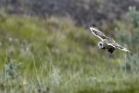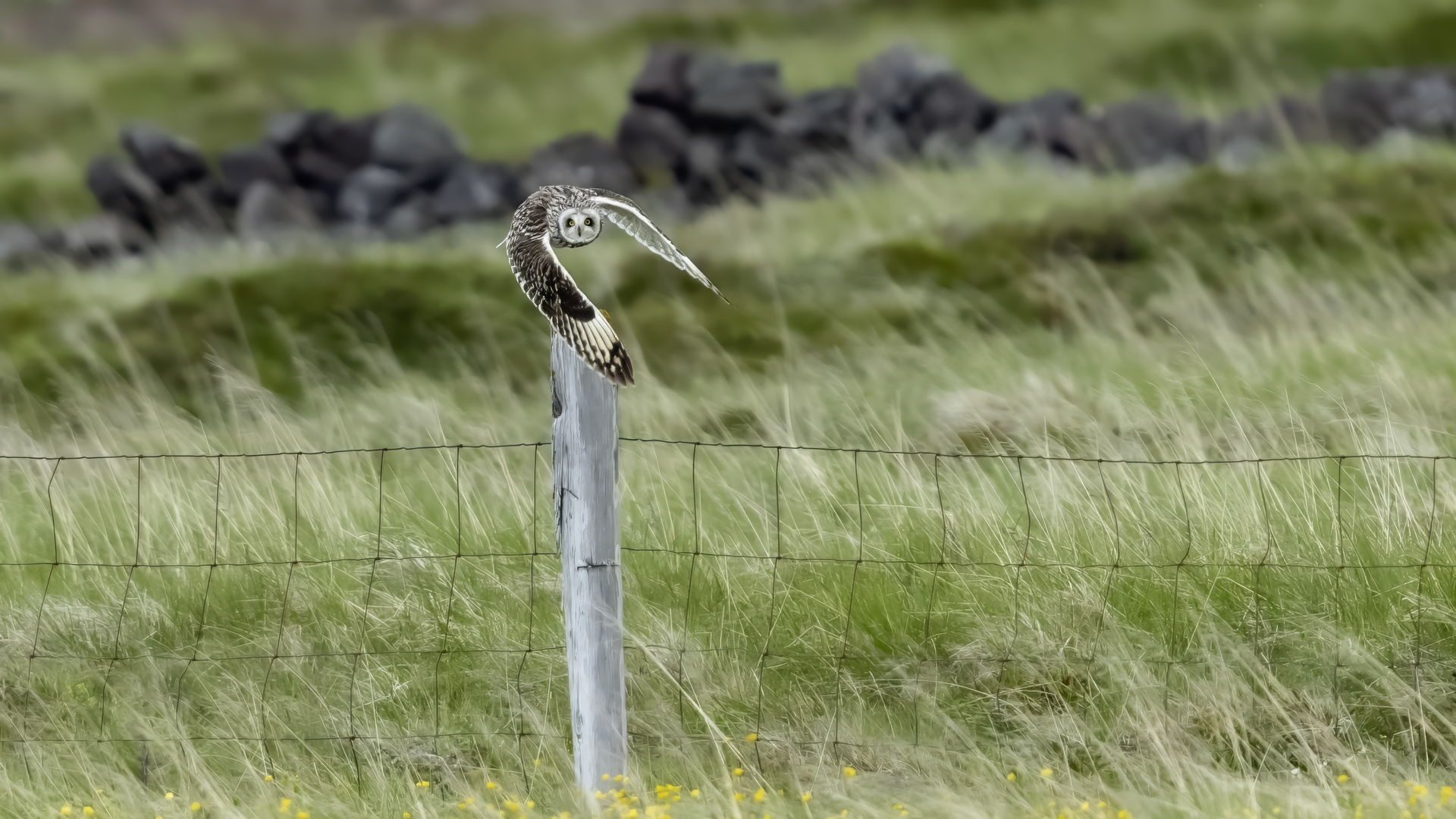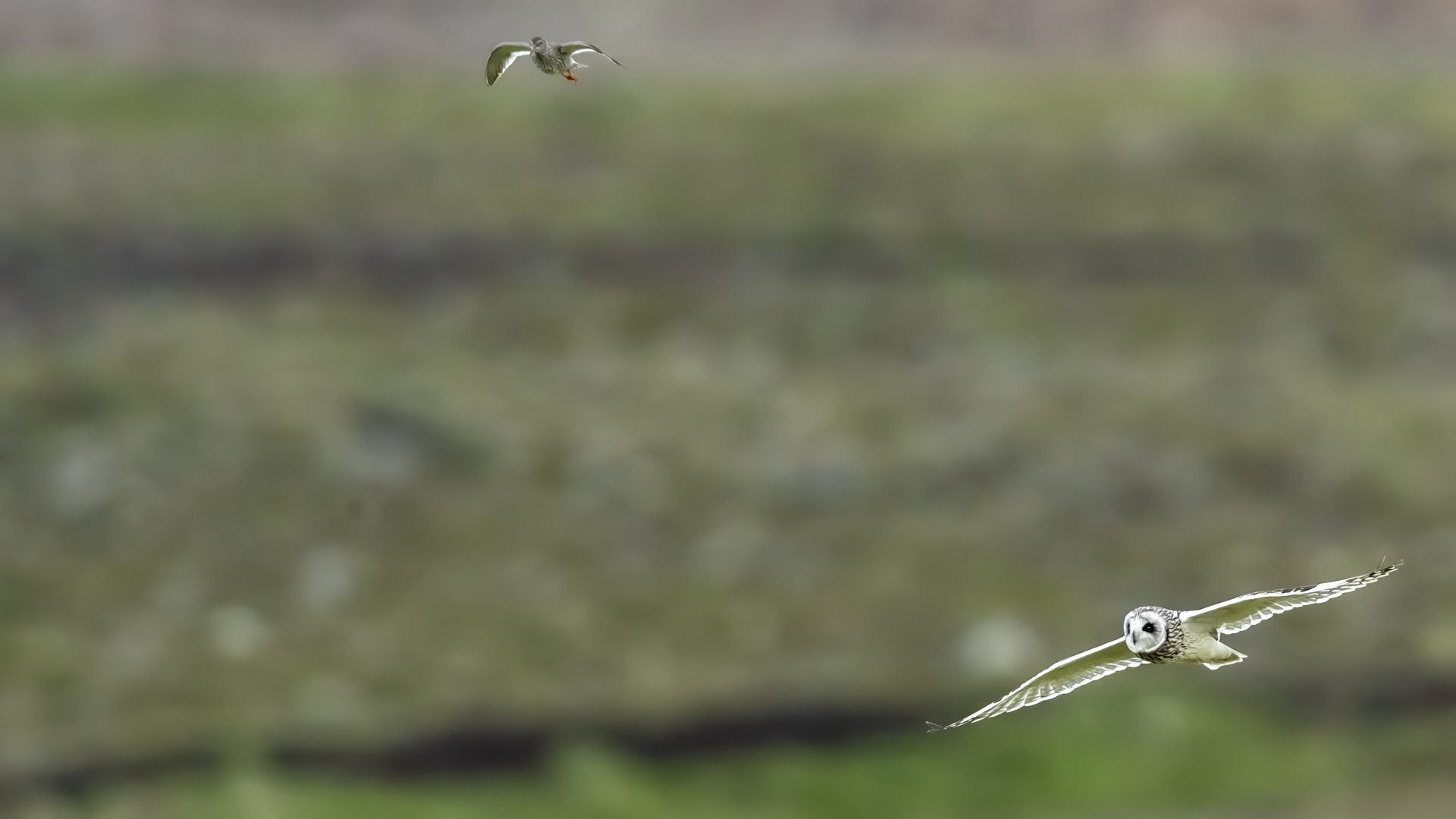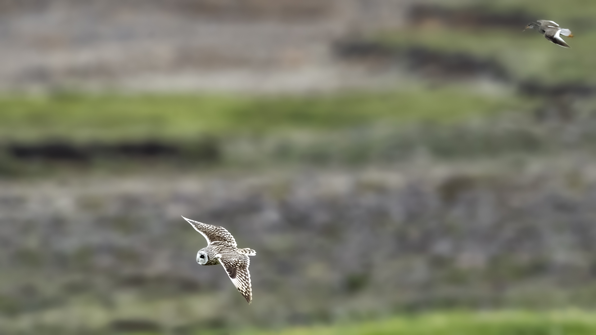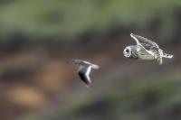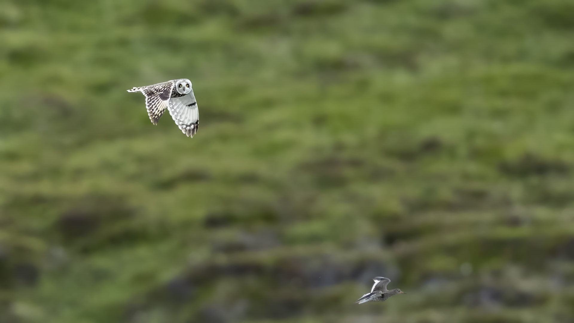 Also this time I encountered a short-eared owl three times in Iceland, each time it was spotted at first from the public road. But one of those meetings was special. It changed my gallery, documentary so far. We could observe how the owl behaved, which hunted in this area - let's say - around us. On other occasions it could be seen for a moment and we could only watch it from a distance, amazed how large is the area it hunts across. Alex, this time you noticed this owl, thank you and best regards. In the other two cases, although we were looking for the bird patiently, it did not make a full circle and did not come back to appear in front of our cameras lenses. It was a good hunter, as during this successful photo session we saw two effective hunts. Unfortunately, it was always a bit too far, though once it was so interested in us that flew just above our heads. The owl sat on the roadside fence posts from where observed the area and started the next hunt. When flying it was always accompanied by other birds - its potential prey. They were probably assuming that it was better to control the threat at close range than to be startled and end up as its meal. Terns, redshanks and redwings assisted the owl in flight. Finally, I took a few interesting photos and the previous documentary gallery of this beautiful bird fell into oblivion. My impressions after this meeting will be long remembered, and the short-eared owl goes to the news.