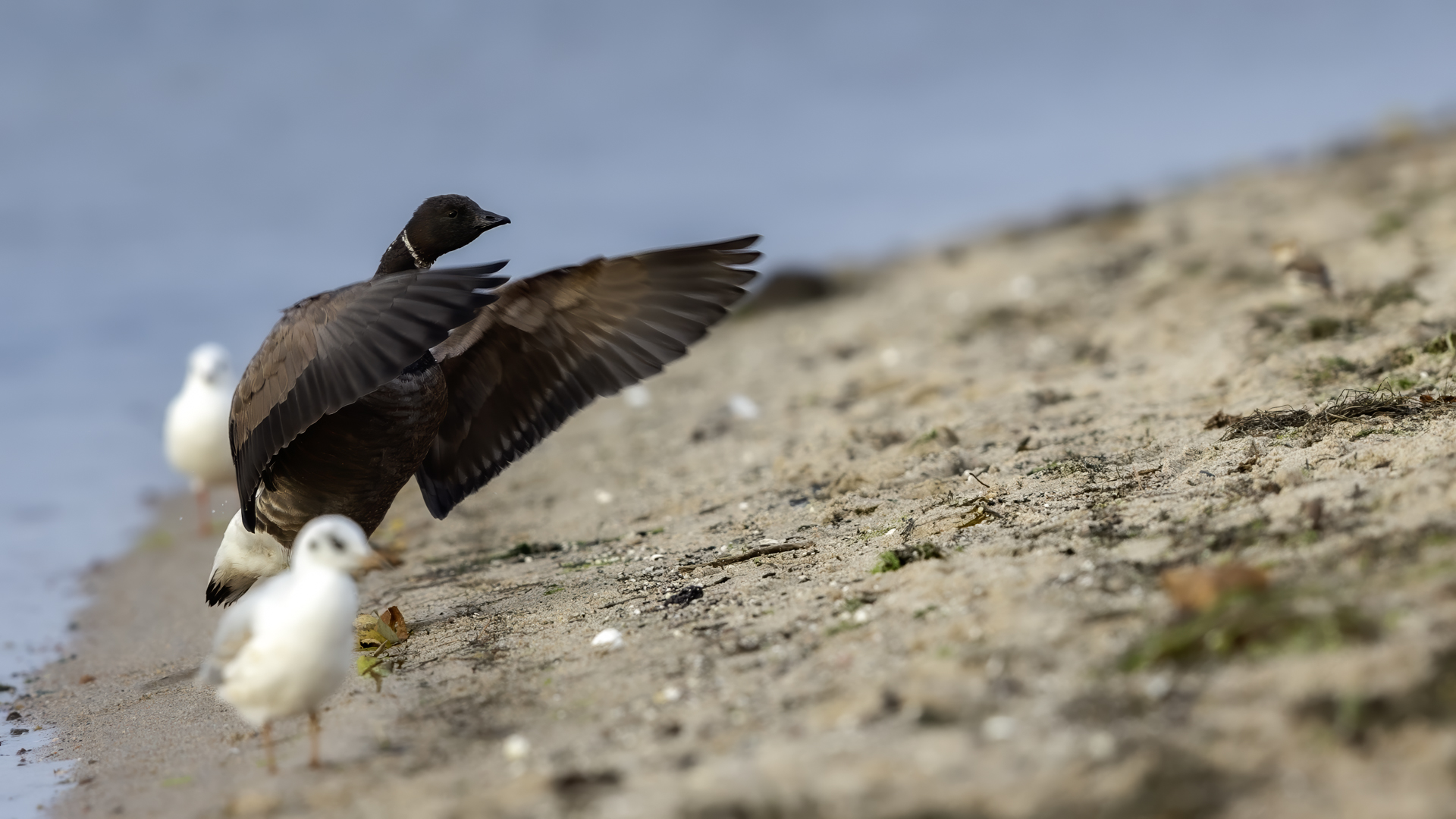 Przyszedłem jeszcze o zmroku w to samo miejsce. Ciemno wszędzie, głucho wszędzie, czas na prosty posiłek (bułki, woda) i przygotowanie sprzętu do nagrywania dźwięków. Nieco przed wschodem słońca pojawiają się pierwsze mewy i kormorany. Niestety nieco za daleko, nie mówiąc już o świetle. Ale co to, bernikla przyleciała w miejsce wczorajszego żerowiska. Ba, nawet od razu zmniejszyła odległość do mnie, no i to wschodzące słońce dało szansę na wykonanie jeszcze lepszych zdjęć. Niestety raz po raz zasłaniane było przez chmury pogarszając radykalnie warunki fotografowania i tym samym jakość zdjęć. Po wykonaniu pierwszej serii zdjęć chciałoby się wykonać bardziej dynamiczne niż tylko spokojnie żerującego ptaka. Apetyt rośnie w miarę jedzenia, a co na to bernikla? Najpierw majestatycznie rozprostowała skrzydła, a potem wykonała kilka kółek wokół mnie, kończąc na lądowaniu w odległości kilkunastu metrów. Nie ma co, pełna współpraca, chyba mnie polubiła. Szkoda, że warunki oświetleniowe były jeszcze nie najlepsze i w kadr nieraz wchodziła mewa. Powstaje ciekawy materiał na galerię. Bernikla zaczęła żerować dalej i obserwowałem ją przez wizjer aparatu, gdy nagle poderwała się do lotu, zresztą jak pozostałe ptaki. Pomyślałem sobie, że jakiś spacerowicz zakończył mi plener. Rozglądam się wokół, ale nie widzę nikogo. To, co było przyczyną ucieczki ptaków siedziało znacznie dalej, jakieś 150 metrów ode mnie. Nie był to człowiek, a największy polski drapieżnik-bielik. Usiadł dostojnie, już samotnie nad brzegiem morza. Kadr byłby przepiękny, gdyby nie odległość i kiepskie światło. Wykonałem kilka zdjęć, ale mają wartość dokumentacyjną. Wyglądał naprawdę niesamowicie budząc respekt w okolicy na tle morza. Zaabsorbowany jego przybyciem nie zauważyłem, że tuż obok mnie w piasku żeruje śnieguła. Kilka zdjęć śnieguły, ale potem rzut oka na miejsce w którym wylądował przed chwilą bielik. Niestety tak samo jak się pojawił nagle, nie wiadomo skąd, tak szybko zniknął. Na szczęście doskonale współpracująca bernikla pojawiła się za chwilę lądując w swoim ulubionym miejscu i dało się wykonać jeszcze kilka dynamicznych zdjęć. Dwie godziny przed zachodem słońca i dwie po wschodzie słońca, a ile wrażeń i emocji, jaki relaks. Po prostu fotografia przyrodnicza…