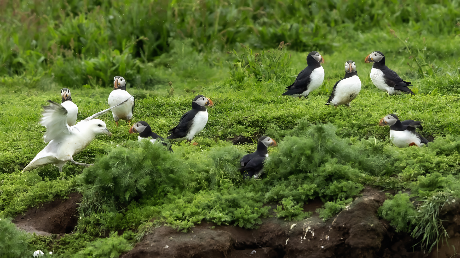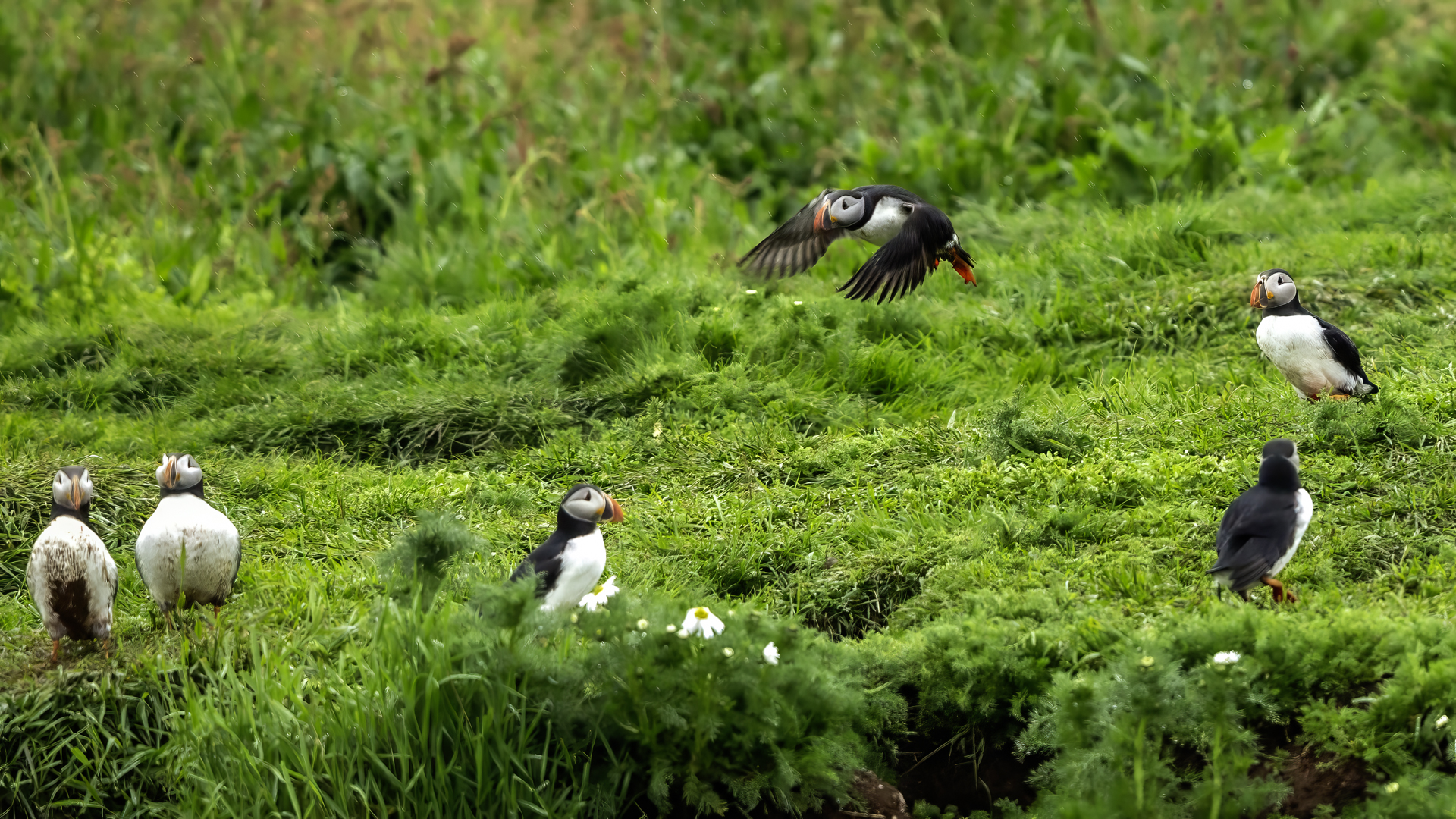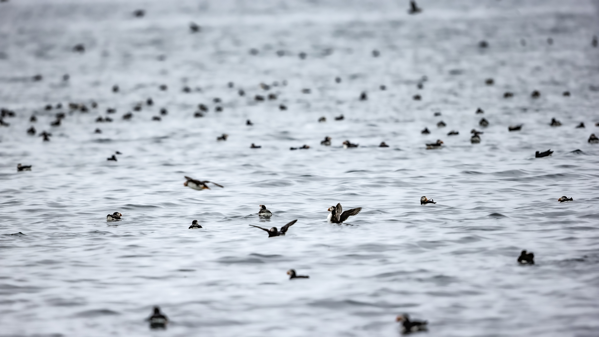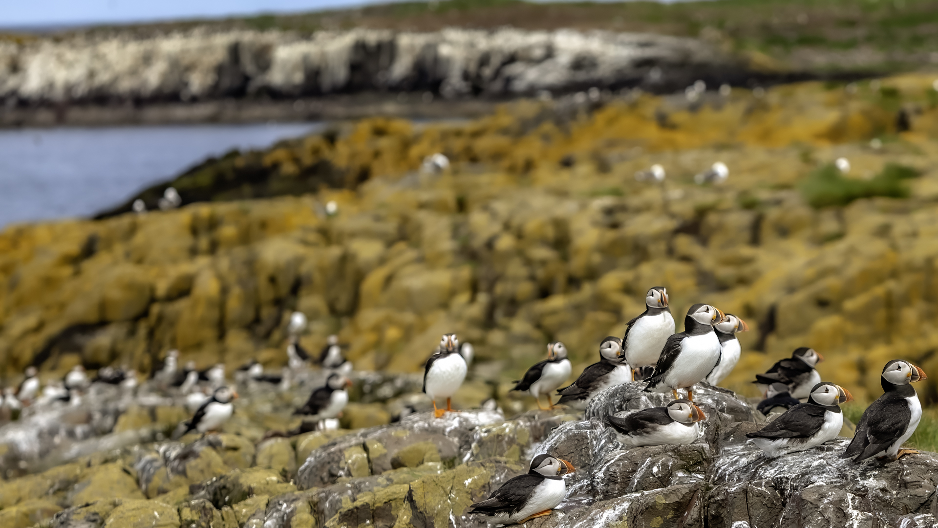 To moje już trzecie spotkanie z ptakami tego gatunku. Najbardziej owocne było pierwsze. Tym razem, mimo, że ptaków były setki, jak nie tysiące, odległość była zawsze dość znaczna. Ale udało się wykonać zdjęcia całych kolonii maskonurów oraz kilka dynamicznych ujęć w locie.