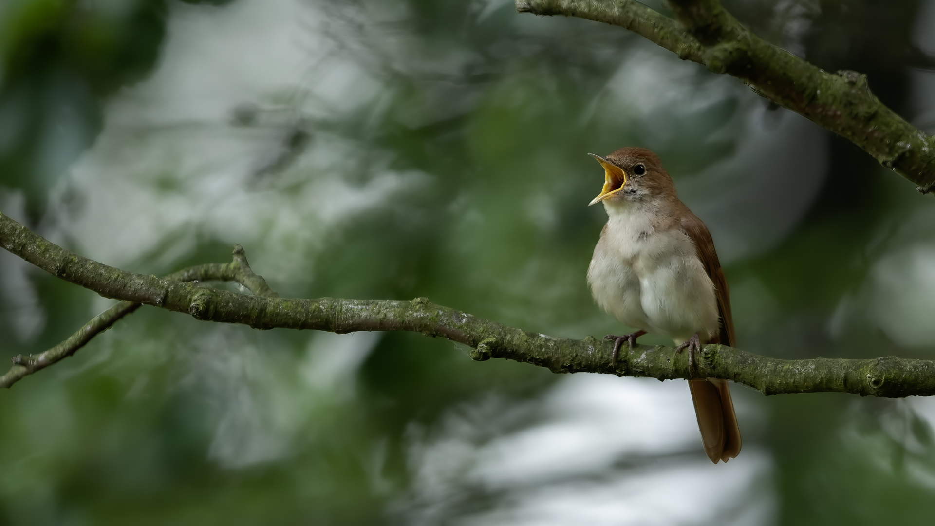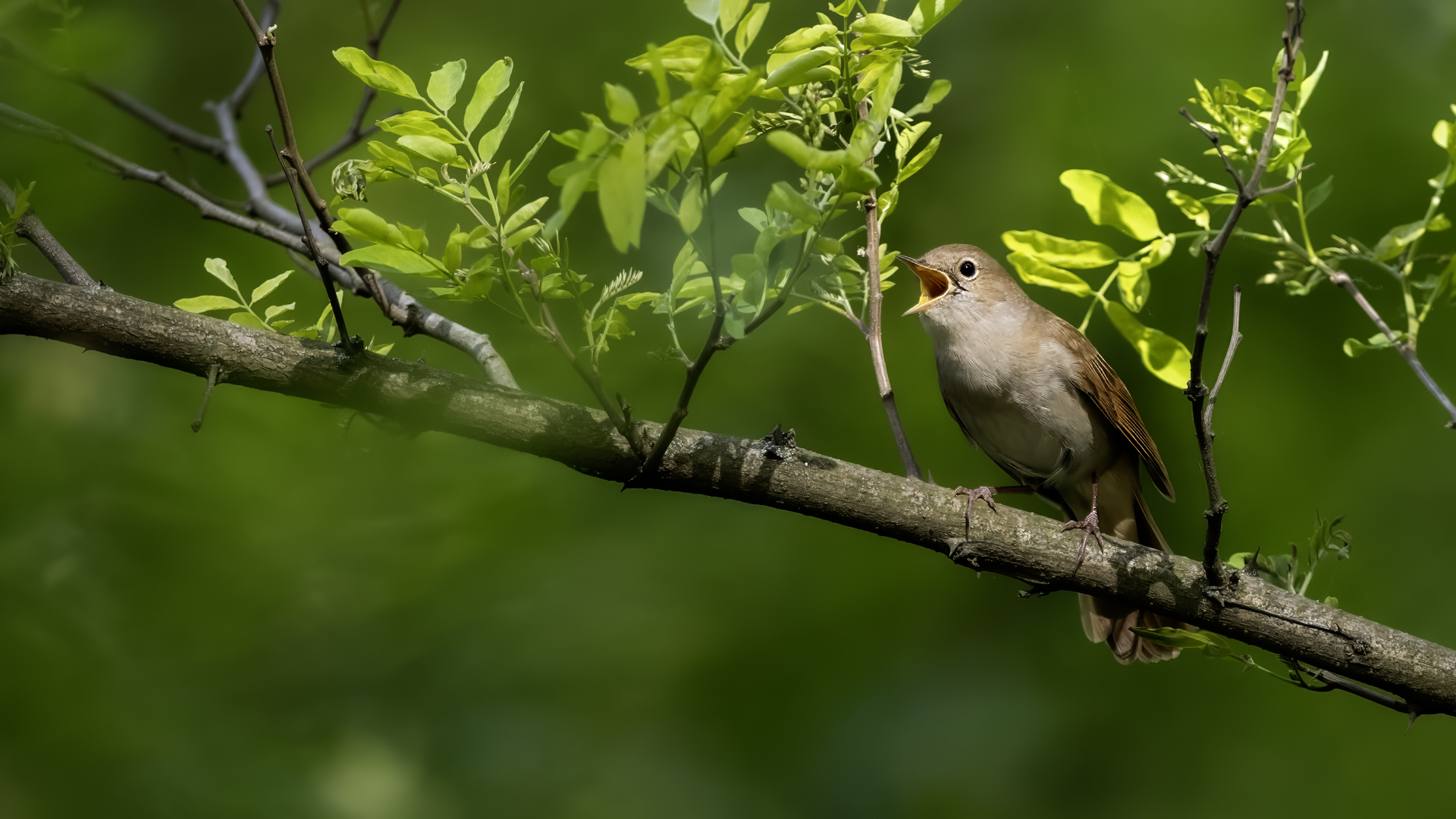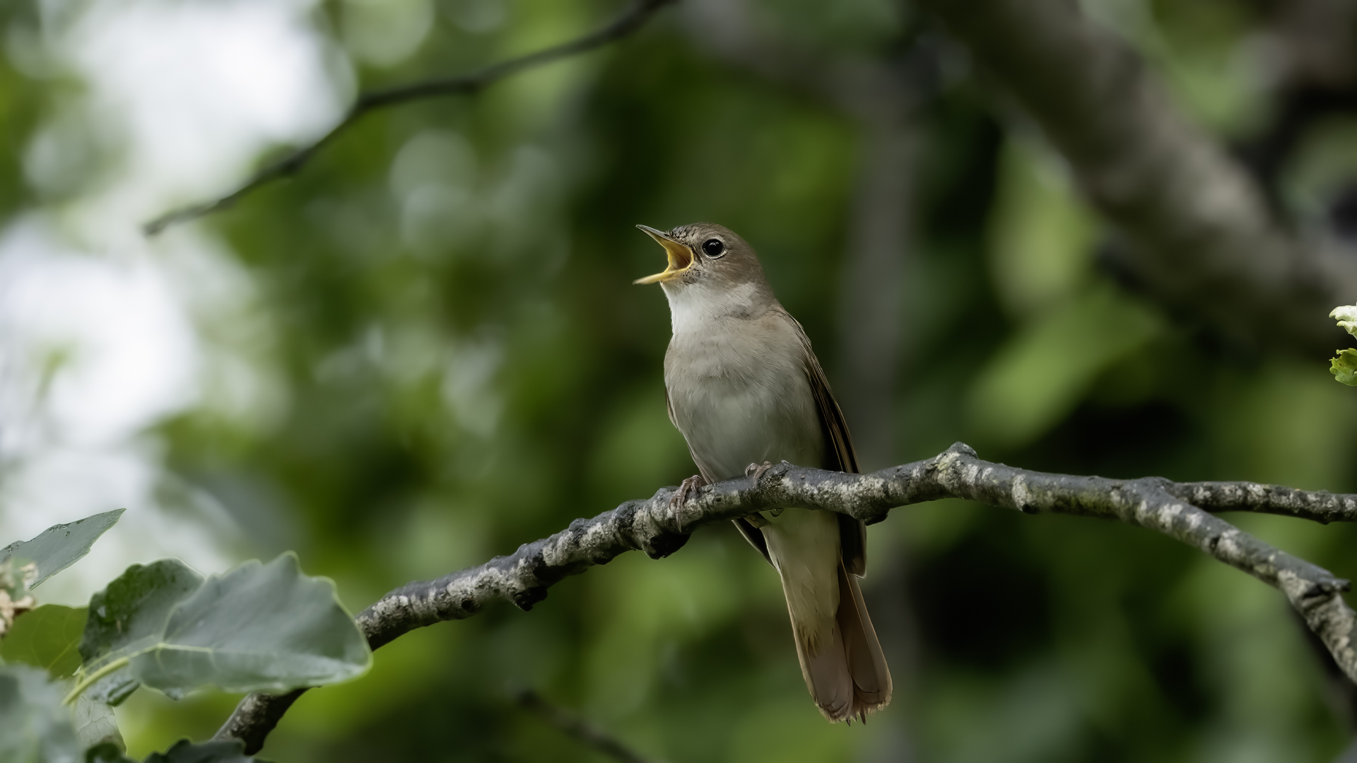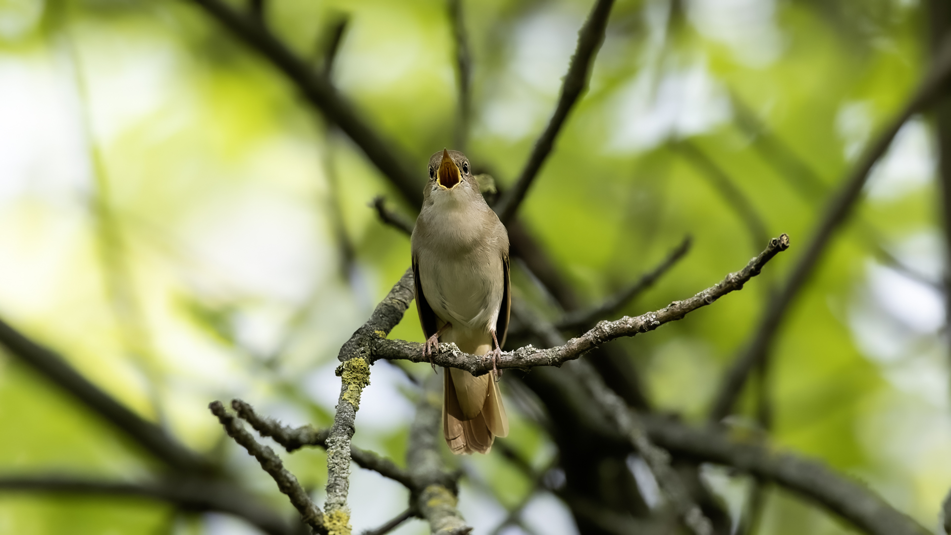 Między polami płynie rów, a miedzy jednym i drugim polem niewielki lasek, a właściwie kępa drzew i krzewów. Zatrzymałem się, bardzo powoli się poruszam, obserwuję licząc, że nagle zauważę zimorodka, bo podobno bywa w tych okolicach. Zadrzewienia, gałązki nad dość czystym rowem wydawać się potwierdzają tę wskazówkę. Trochę czasu, trochę szczęścia, a może pecha i udało się sfotografować … słowika rdzawego. Rzeczywiście jego śpiew jest nietuzinkowy i odmienny. Siedzi dostojnie na gałęzi i śpiewa pełną piersią pokazując wewnętrzną, żółtą barwę swego dzioba. Słowik rdzawy to niewielki ptak, wagą mniejszy od wróbla o rozpiętości skrzydeł około 25 cm, ale za to jak śpiewa!