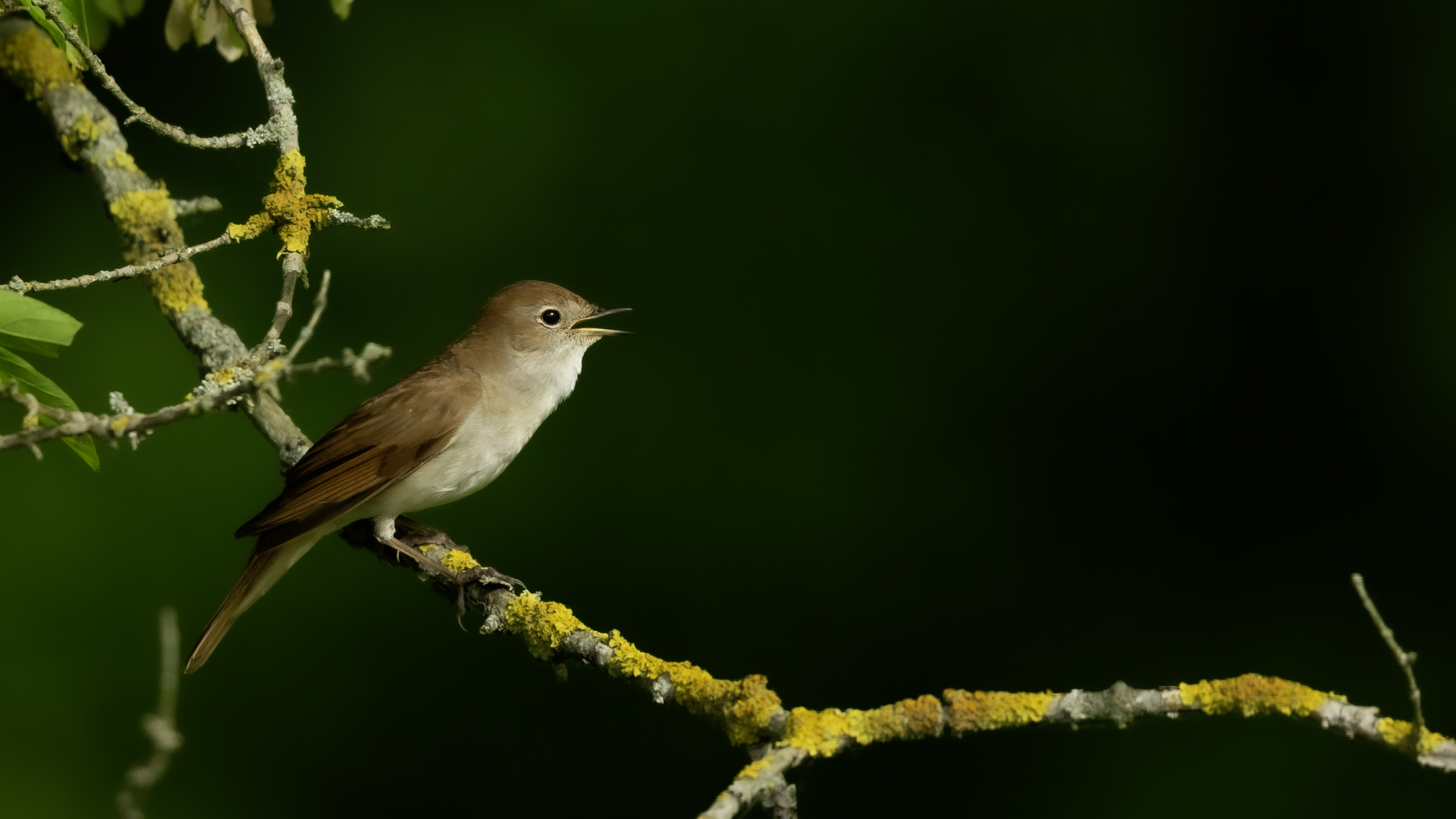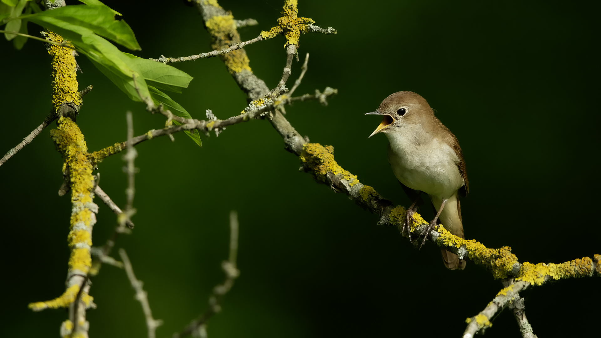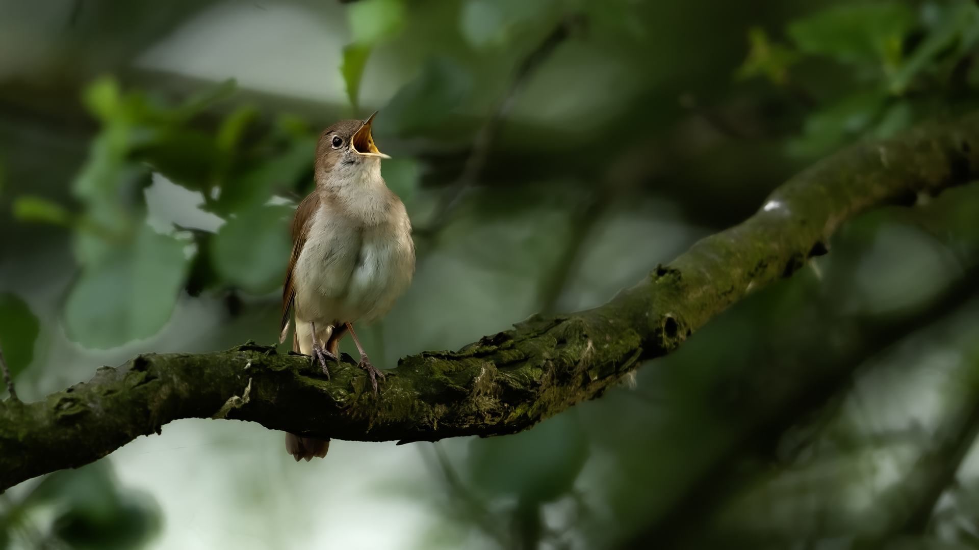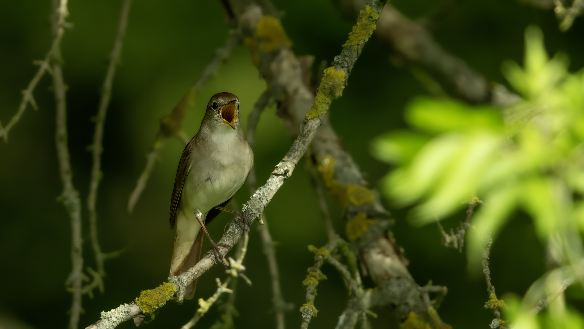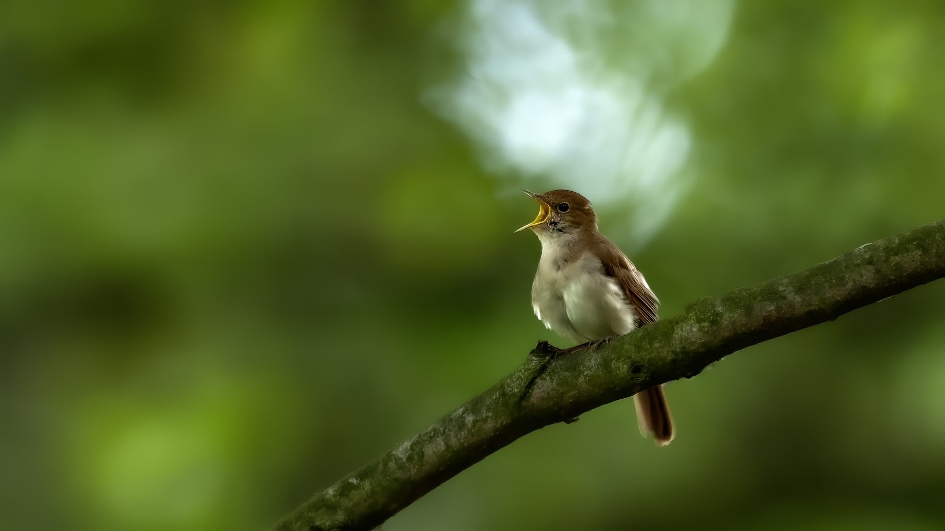 Między polami płynie rów, a miedzy jednym i drugim polem niewielki lasek, a właściwie kępa drzew i krzewów. Zatrzymałem się, bardzo powoli się poruszam, obserwuję licząc, że nagle zauważę zimorodka, bo podobno bywa w tych okolicach. Zadrzewienia, gałązki nad dość czystym rowem wydawać się potwierdzają tę wskazówkę. Trochę czasu, trochę szczęścia, a może pecha i udało się sfotografować … słowika rdzawego. Rzeczywiście jego śpiew jest nietuzinkowy i odmienny. Siedzi dostojnie na gałęzi i śpiewa pełną piersią pokazując wewnętrzną, żółtą barwę swego dzioba. Słowik rdzawy to niewielki ptak, wagą mniejszy od wróbla o rozpiętości skrzydeł około 25 cm, ale za to jak śpiewa!