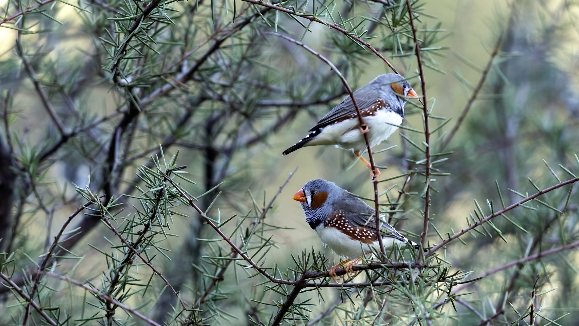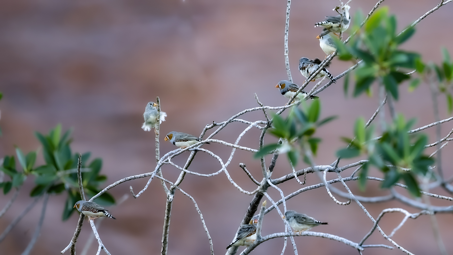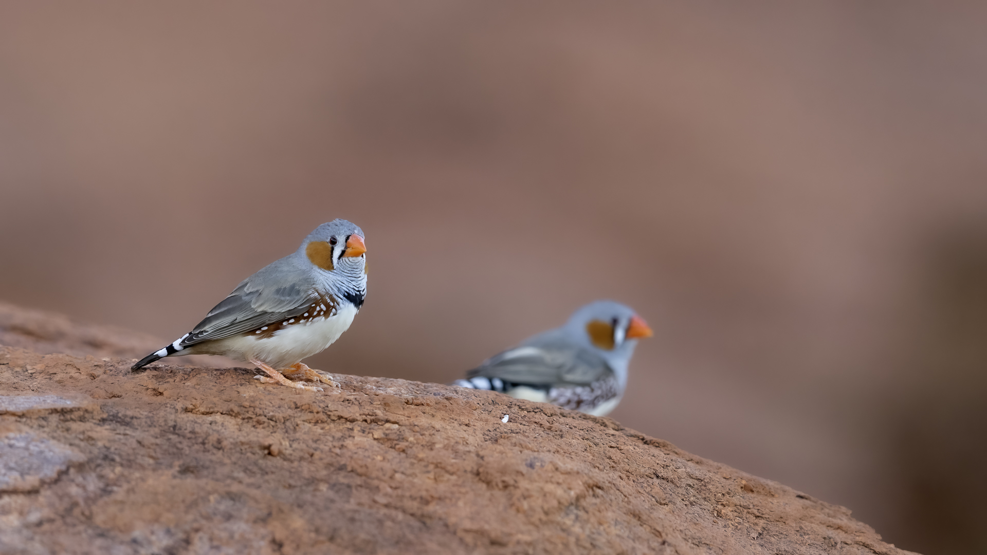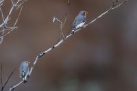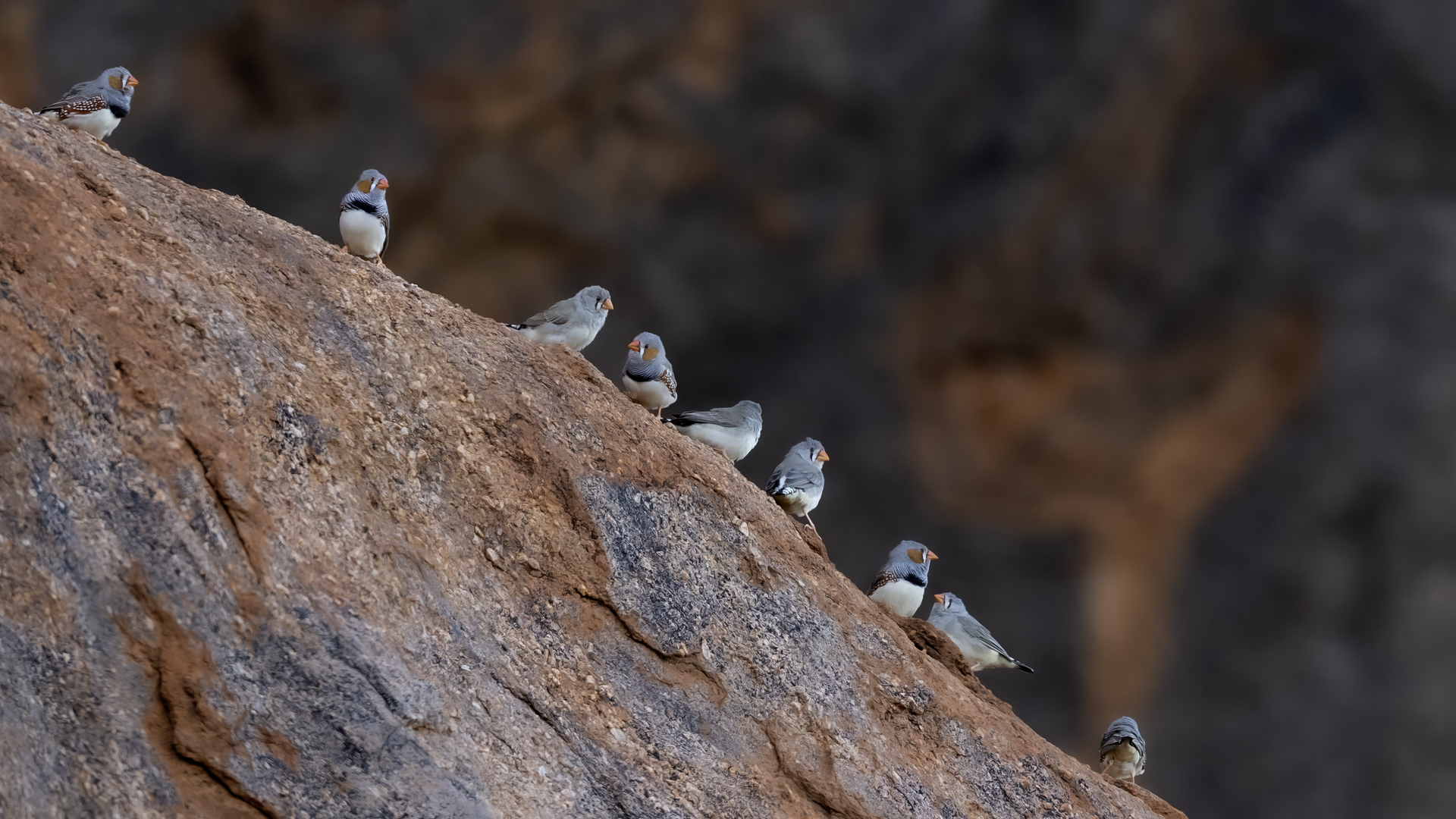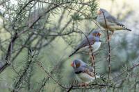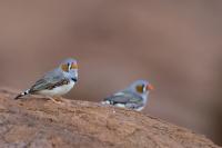 Przy prezentowaniu tego gatunku nasunęło mi się trochę skojarzeń i wspomnień związanych z papugami falistymi. Zeberki to stadne ptaki, które fotografowałem w sercu Australii w Uluru. Setki kilometrów „rdzawej” ziemi, porośniętej skąpo trawą i jeszcze rzadziej niewielkimi drzewami, to środowisko nie tylko zeberki, ale także papugi falistej. Ptaka chyba najbardziej rozpowszechnionego wśród papug hodowlanych w Polsce. Podziwiając te ptaki, kiedyś, lata temu, zbudowałem przy domu sporej wielkości wolierę. Wkopałem w niej przepołowione pnie brzozy, na szczycie pni wydrążyłem otwory i w tylnej ich części zawiesiłem domki lęgowe. Woliera była całoroczna, a ptaki czuły się w niej na tyle dobrze, że przez kilka lat jej funkcjonowania na świat przyszło tam około 200 ptaków. Głównie papug falistych, ale też nimf. Rozelle królewskie trzykrotnie nieskutecznie przystępowały do lęgów. Lecąc do Australii chciałem oczywiście je zobaczyć w ich naturalnym środowisku, ale na samym środowisku  się skończyło. Niestety trzeba byłoby mieć dużo więcej czasu i przewodnika, aby je znaleźć na nieograniczonych przestrzeniach w sercu Australii. Papużki faliste żyją, prócz wybrzeży, praktycznie na całym obszarze Australii. Miejscowa ludność w Uluru pytana o ten gatunek twierdziła, że tak, są tu – wszędzie, na przestrzeniach nie do opisania. No cóż z papugami falistymi widać, nie było mi pisane podziwiać je w ich naturalnym środowisku. Ale mimo, że nie planowałem tego, to udało się fotografować, i to nieraz, stado zeberek, które siadały na charakterystycznych czerwonych skałach Uluru. Zeberki latały w stadzie 20-30 osobników i jak zostawałem z nimi sam na sam (brak innego turysty w zasięgu 15-20 metrów, o co nie było łatwo) na kilka minut, powstały prezentowane zdjęcia. Zeberki siadały najpierw na krzaku lub skale, chwilę obserwowały teren, po czym zlatywały  na niżej położone trawy lub na ziemię i zabierały się do żerowania. Znów dała o sobie znać specyfika australijskiego fotografowania. Oczywiście bez żadnego maskowania, spokojnie podchodząc można było wykonać im zdjęcia z odległości 7-9 metrów. Tu trzeba pamiętać o dwóch utrudnieniach. Jedno, że to dość żwawe stado ptaków. Jeżeli usiądą na krzaku, szczególnie rano żerując, to długo tam nie zagrzeją miejsca. Tak więc podchodzenie nie może być zbyt energiczne, ale zbyt powolne spowoduje, że odlecą lub zlecą na ziemię, gdzie fotografowanie będzie znacznie utrudnione. Druga uciążliwość  w tej okolicy, to średniej wielkości muchy. Jest ich rzeczywiście ogrom i znacznie utrudniają skoncentrowanie się na fotografowaniu. Obsiadają człowieka i nie sposób się od nich odgonić. Reasumując, udało się wykonać zdjęcia na galerię tego barwnego ptaka i to w samym sercu Australii, podobnie jak i kilku innych gatunków, jednak nie w tak okazałej ilości. Z nagraniem głosu nie byłoby problemu, ale niestety zabrakło czasu. Postawiłem na większą liczbę zdjęć, bo ostatecznie głosu zeberki można posłuchać w wielu miejscach w Polsce.