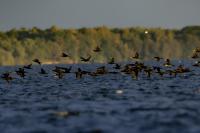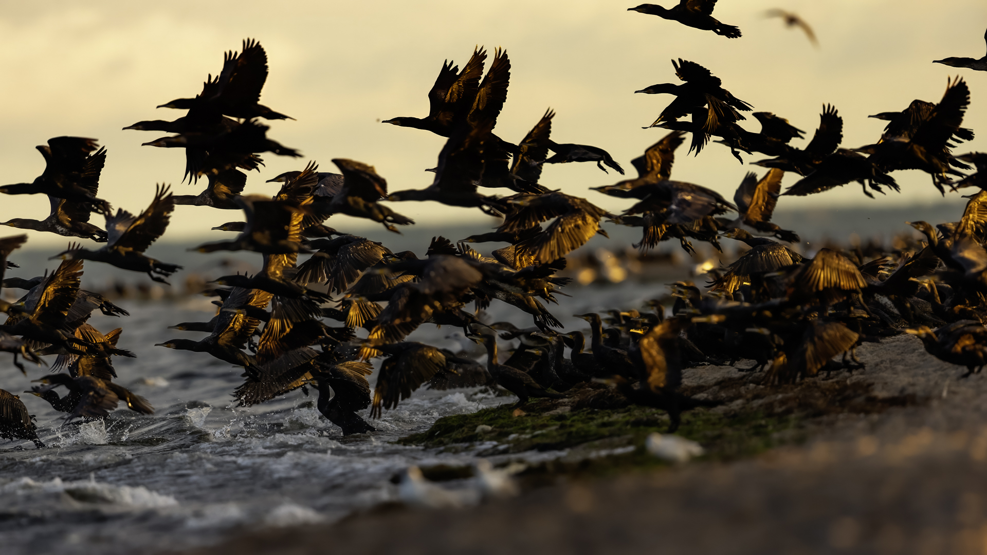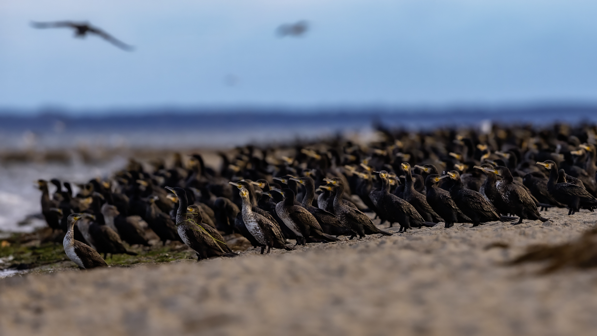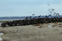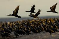 Było dla mnie dużym zaskoczeniem, kiedy to leżąc na plaży o poranku zobaczyłem po lewej stronie gromadzące się stado kormoranów. Początkowo wyglądało to niegroźnie, ale w ciągu pół godziny przyleciało setki, a może ponad tysiąc kormoranów. Mimo dużej odległości stado nie mieściło się w 4 kadrach z 600-tką przykręconą do korpusu! Ciągle nadlatywały tworząc szpaler, który początkowo był skierowany do brzegu, później zaś w kierunku morza. Obserwując płynące w takim szyku setki ptaków, dało się zaobserwować, że niektóre z nich co chwila nurkują, by po chwili wynurzać się z wody z rybą w dziobie. Może to taka technika stadnego połowu. A może po prostu dojrzały ławicę ryb, którą skutecznie przetrzebiły. Zapewniam, że wschód słońca, opary mgły w tle z tysiącem kormoranów tego się nie da zapomnieć. Niestety widok trudny w fotografowaniu. Z jednej strony chciało by się pokazać wszystkie ptaki i z 600 milimetrów przejść na 200, a może 50. Z drugiej zaś strony zbliżenie z wskakującymi do i z wody kormoranami, pełne dynamiki byłoby też ciekawe. Do tego drugiego ujęcia trzeba byłoby jeszcze zmniejszyć odległość lub nałożyć konwerter.