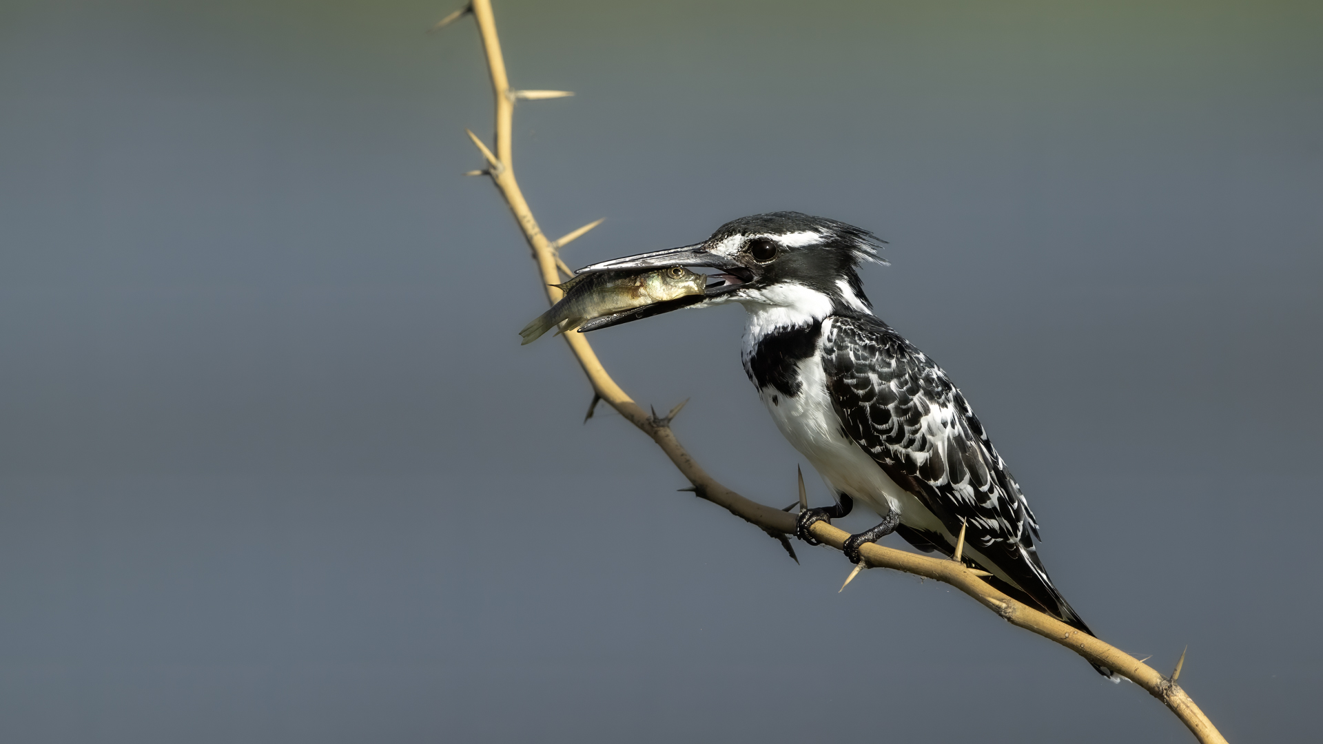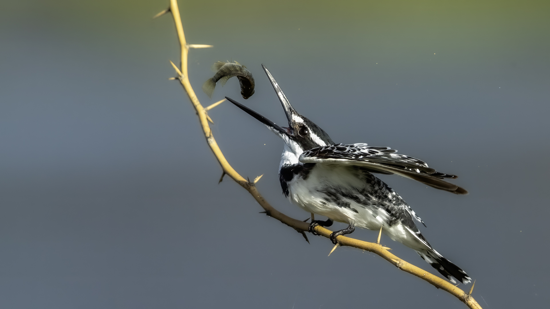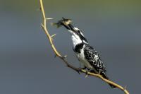 Kolejny gatunek ptaka zaliczanego do fauny polski, a „zdobyty” podczas mojego pobytu w RPA. Pierwsze spotkanie z rybaczkiem srokatym było podczas wyczekiwania o wschodzie słońca na turaki. Dwie pary rybaczków srokatych bardzo skutecznie polowały o poranku. Niestety dzieliła nas spora odległość i nawet konwerter 2X nie pomógł. Ale pierwsze dokumentacyjne zdjęcia powstały i kolejny gatunek do mojej listy ptaków zaliczanych do fauny Polski został dodany. W ostatnim dniu naszego pobytu w RPA szczęście dopisało i udało się wykonać kilka zdjęć ze znacznie mniejszej odległości. Para rybaczków polowała na rozległych zalewowych terenach. Betonowy przepływ był ich ulubionym miejscem i tam dało się wykonać najlepsze zdjęcia.