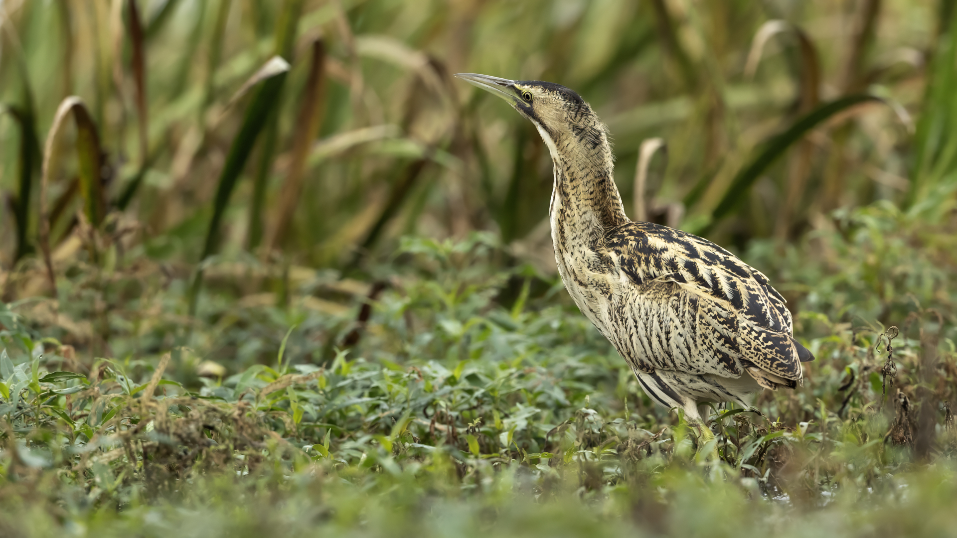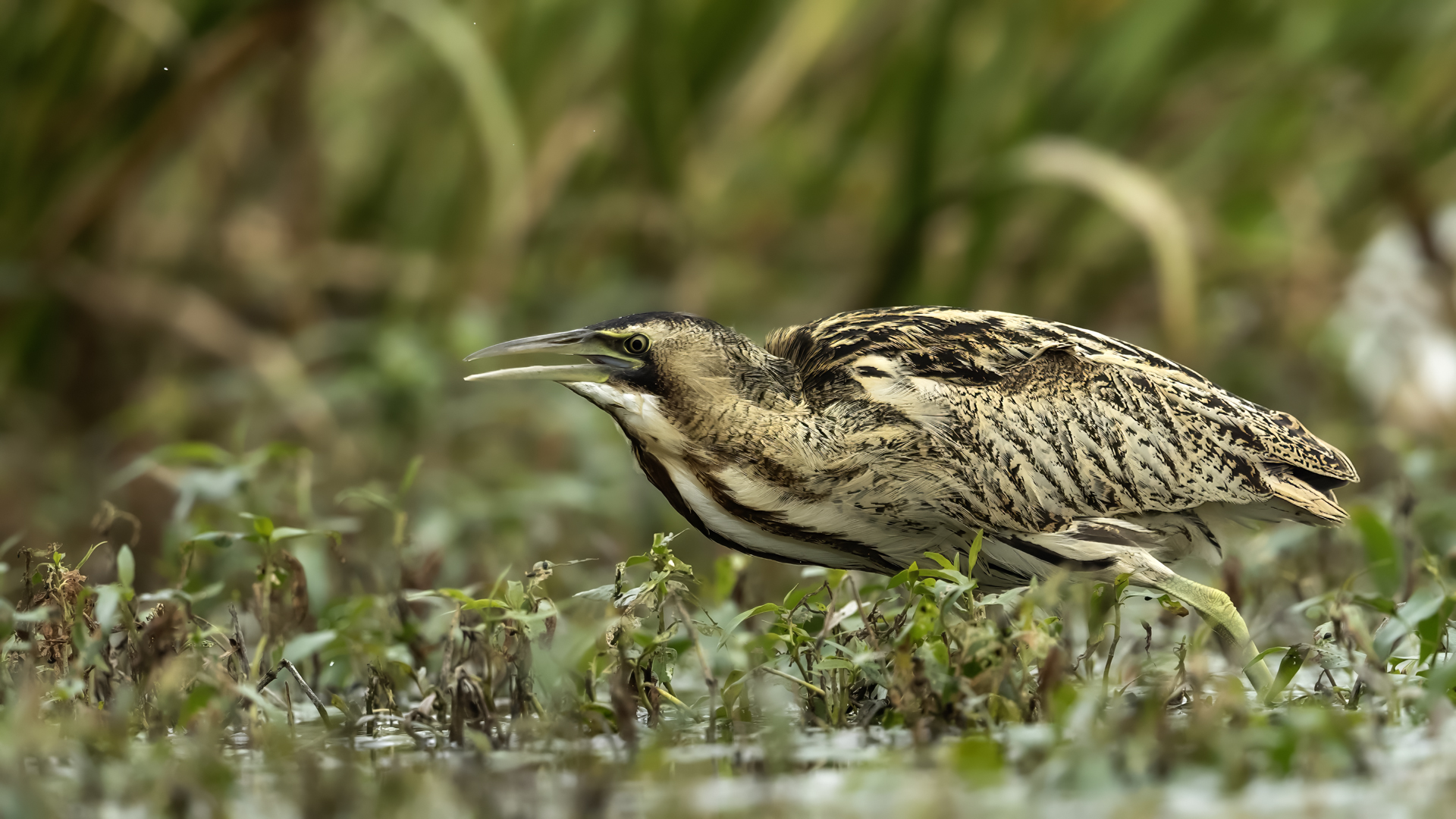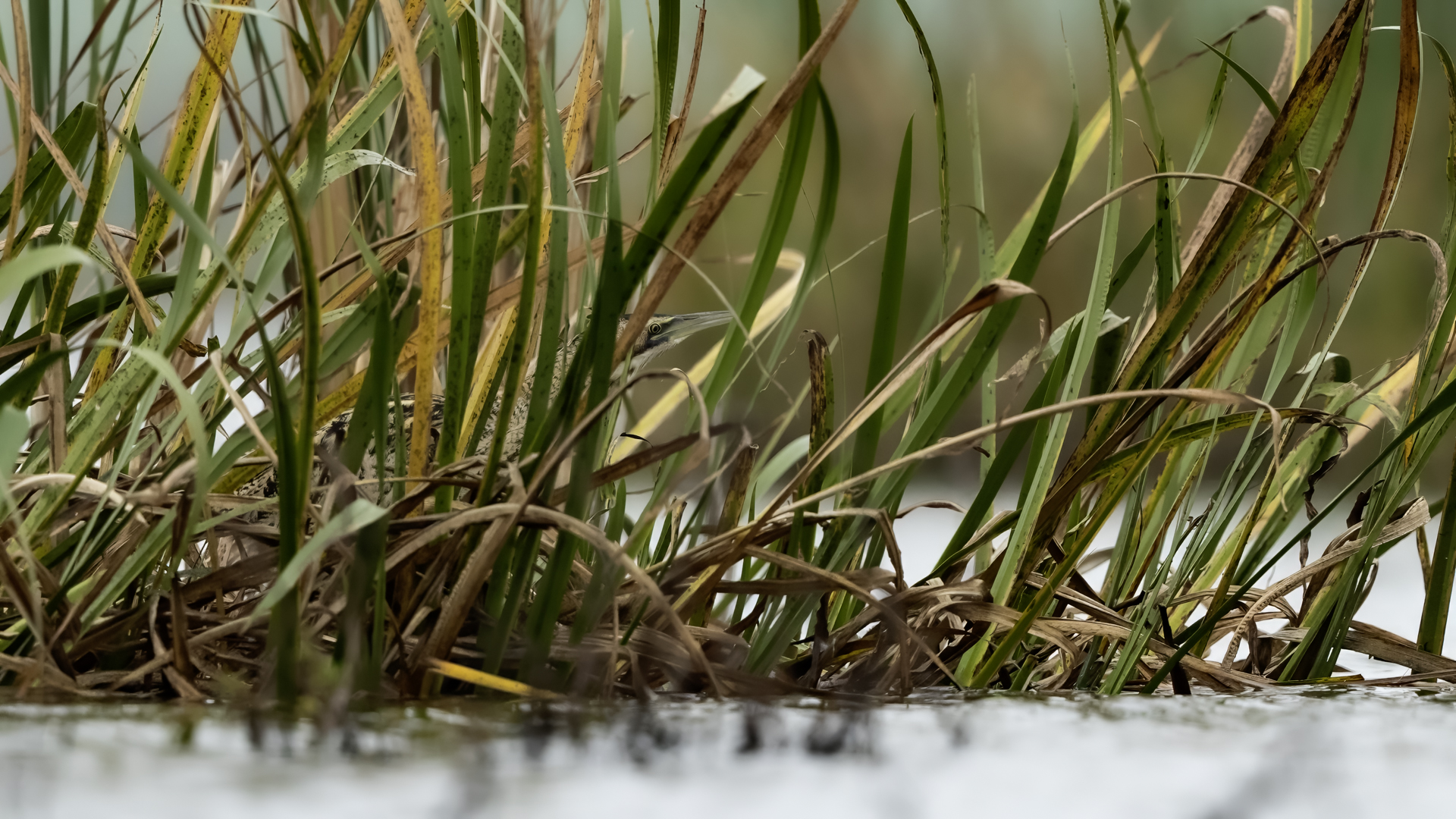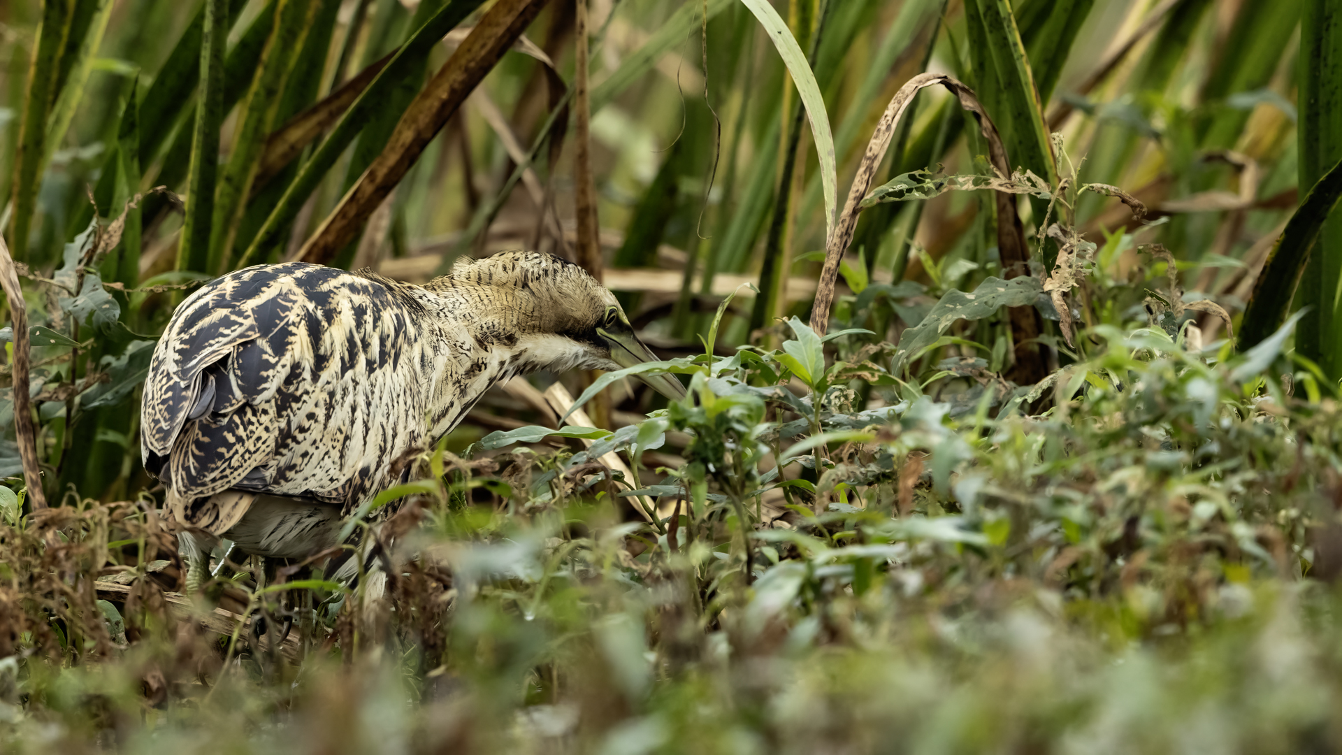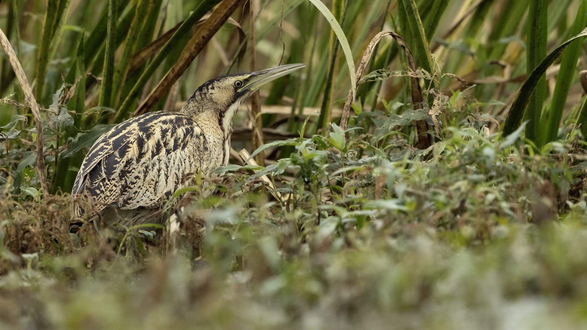 Tym razem wybraliśmy się z Haliną do czatowni właśnie na bąka. Był widziany w tej okolicy, co zwiększało prawdopodobieństwo do 2 %, że się uda :-)) . Ale jak się nie próbuje, to na pewno się nie sfotografuje. Kilka godzin wyczekiwania od świtu i nagle jest w pełnym kadrze przed naszymi obiektywami. Trudno pohamować emocje tak długo wyczekiwanego spotkania, ale Haliny ciśnienie osiągnęło swoje maksimum. Obserwowała go wcześniej ode mnie kilka minut, bo bąk usiadł pół metra od jej ściany czatowni i sprawdzał teren. Jakikolwiek ruch, odgłos wówczas i powiedziałbym, że znów było blisko. Tym razem się udało, choć majestatyczne przejście przed obiektywami trwało niespełna dwie minuty. Tylko i aż dwie minuty. Dwie minuty które pamiętać się będzie do końca życia, zmieniają dotychczasowy dokumentacyjną zawartość galerii no i taaaaaakie spotkanie musi być odnotowane w nowościach…