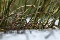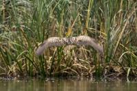 Na kolejny dzień postanowiliśmy spróbować raz jeszcze sfotografować bąka. W dwa poprzednie dni pojawił się o tej samej godzinie. Czyżby był systematyczny w penetrowaniu swojego rewiru? Niestety nie. Tym razem bąki trzymały się zdecydowanie dalej na małej wysepce. Wysepka była na tyle mała, że pojawienie się na niej drugiego bąka doprowadziło do bąkowej potyczki i przegonieniu słabszego osobnika. Niestety odleciał w kierunku przeciwnym, i z dość daleka powstało zdjęcie bąka w locie. Kolejne zdjęcia przedstawiają żerującego, skupionego ptaka. Jakościowo zdjęcia pozostawiają wiele do życzenia, ale warto je dodać do galerii, która staje się nieco bardziej urozmaicona i pokazuje lepiej środowisko w jakim żyje ptak.