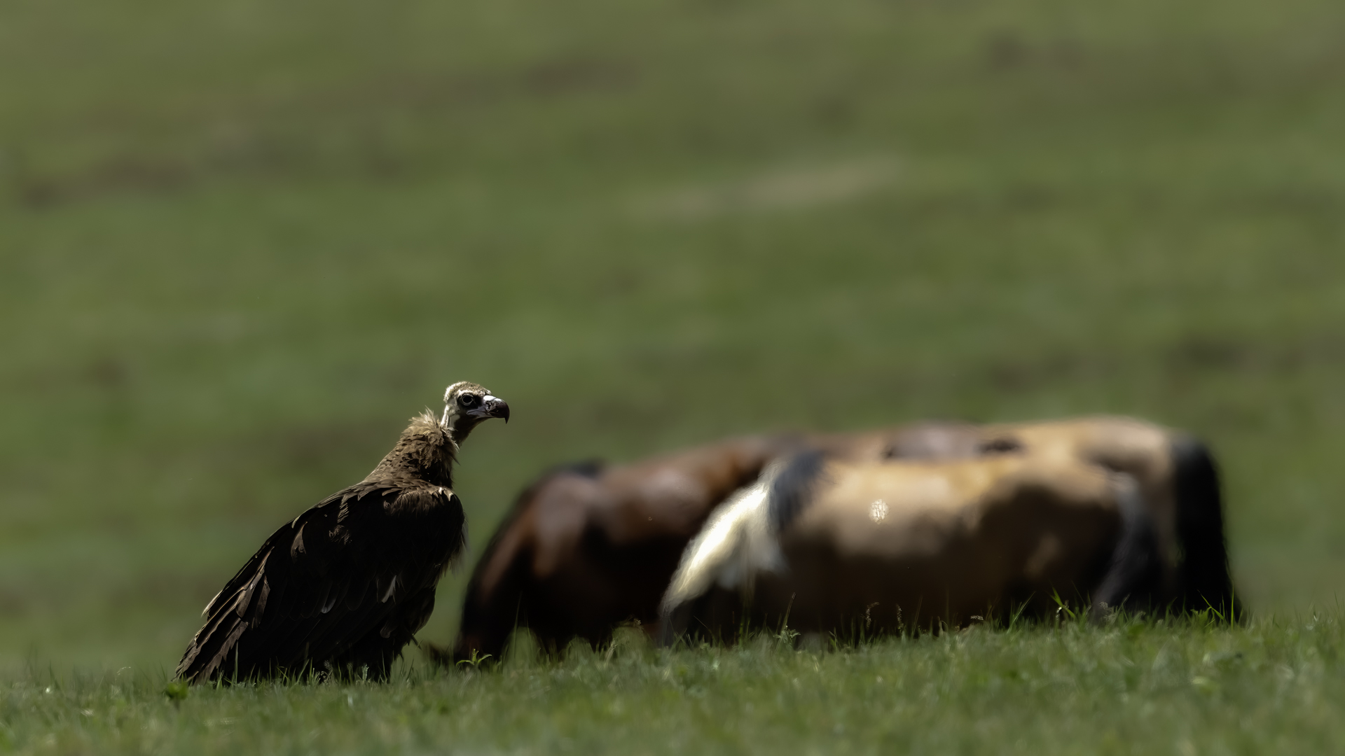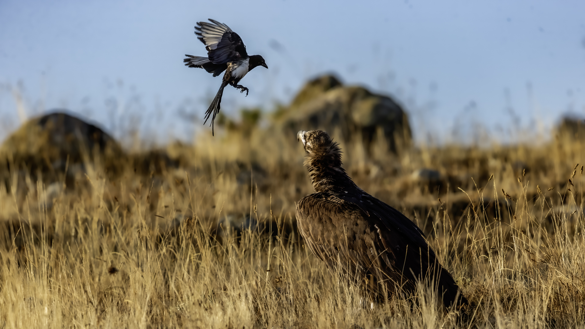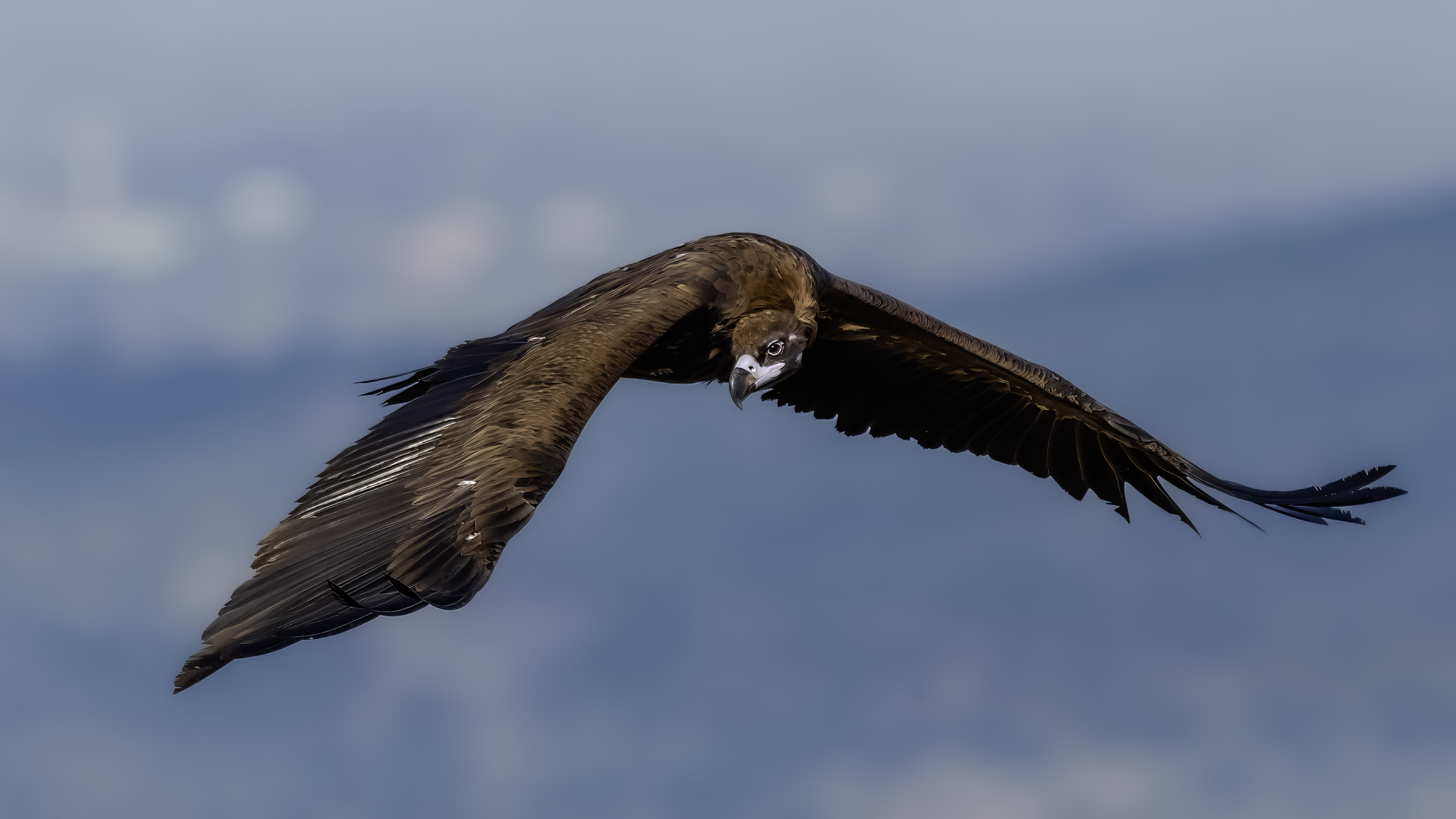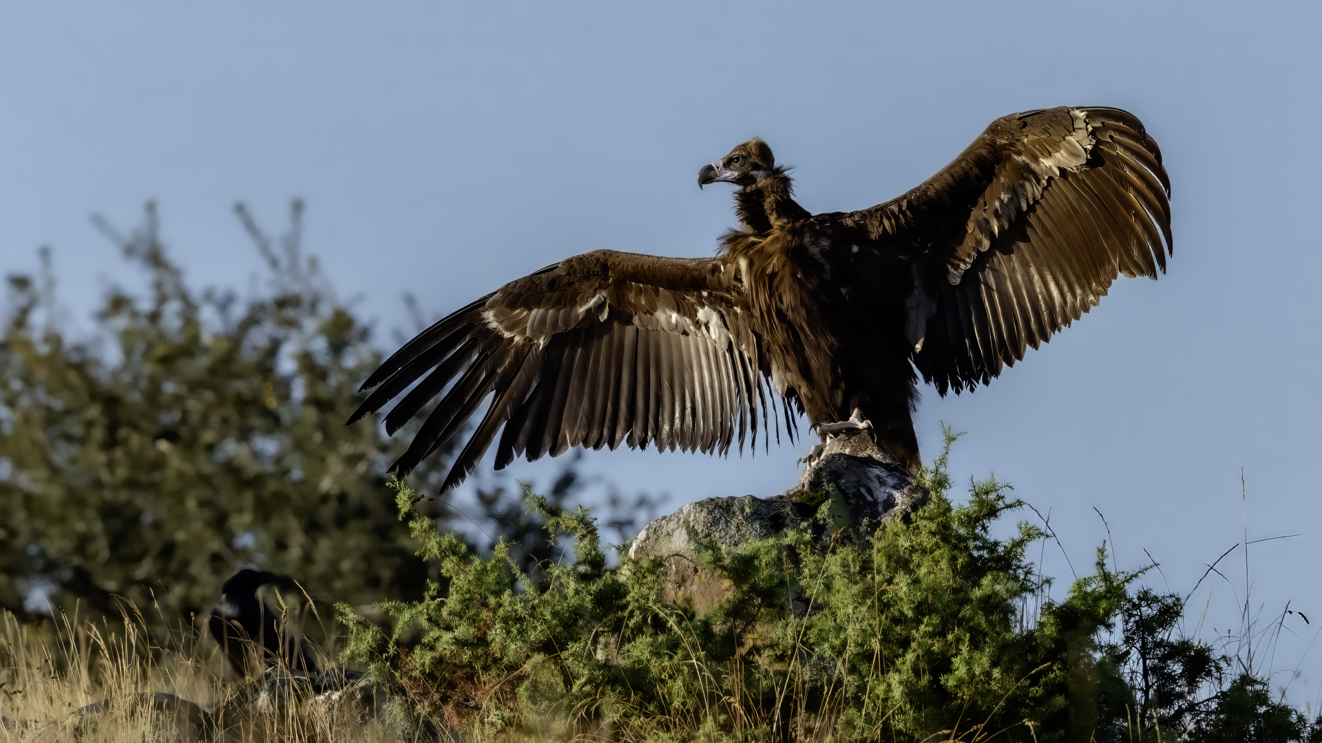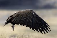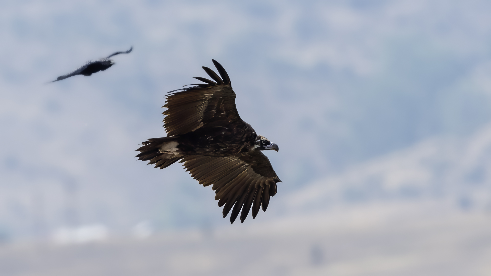 Niespełna 3 metry rozpiętości skrzydeł, waga może przekraczać 12 kilogramów. Potężny, piękny ptak. Sępy kasztanowate były bardzo bojaźliwe i siadały po lewej stronie czatowni, w znacznej odległości godzinami obserwując czatownię i okolicę. Każdego dnia były śmielsze i zmniejszały odległość , a tym samym powstawały coraz lepsze zdjęcia. Oczywiście, sępy, jak to sępy żerują na padlinie. Pozostawiona padlina początkowo była wykorzystywana też przez inne zwierzęta, ale na noc miała być chowana. Jej przeznaczenie to jednak nęcisko dla ptaków i tylko ptaków żerujących za dnia. Niestety organizator warsztatów, próbując wieczorem zabrać padlinę sprzed czatowni, musiał zmienić plany w tym zakresie, gdyż właśnie do kolacji zasiadły przy niej dwa niedźwiedzie, które nie zamierzały rezygnować ze swoich planów wobec pozostawionego mięsa. Sami tego nie widzieliśmy, ale rano następnego dnia świt ukazał, pozostałości po uczcie niedźwiedzi. Tak, więc nasze nęcisko, mocno uszczuplone, ale nadal spełniające swoją funkcję, bo sępy przyleciały. Na szczęście, sępy nabierające zaufania, kilka razy, podeszły tak blisko, że 600 mm obiektyw pokazywał już tylko samą sylwetkę ptaka, a podczas jego odlotu w kadr, nie mieściły się jego skrzydła. Tu powstawała duża trudność w fotografowaniu, bo raz ptak miał metr wysokości, raz 3 metry rozpiętości skrzydeł. Jeżeli siedział i obserwował z oddali, to brakowało ogniskowej, aby wykonać zdjęcia. Jeżeli przyleciał przed czatownię, warto mieć już obiektyw 300 milimetrowy. Nie radzę niczego zmieniać podczas fotografowania, bo może być to tożsame z zakończeniem fotografowania, przynajmniej w tym dniu. Wszystkie ptaki były bardzo bojaźliwe i ostrożne, a jakakolwiek zmiana, ruch powodował, że niebo było czarne od kruków i srok, a przerwa w fotografowaniu mogła trwać kilka godzin. Sępy wielokrotnie przelatywały nad czatownią zaabsorbowane obserwowaniem tego co działo się przy padlinie, z głową skierowaną w dół. Ich lot był na bardzo niskiej wysokości, tak że nie było problemów z wykonaniem zdjęć. Oczywiście niebieskie tło nieba to nie moja ulubiona kompozycja, ale zamieściłem też kilka takich zdjęć, dla ukazania piękna szybującego ptasiego giganta. Dodałem też kilka zdjęć sępa ze sroką, czy krukiem dla zbudowania skali porównawczej i oddania wielkości tego ptaka. Sroki i kruki zawsze były w okolicy tych ptaków, bez względu, czy siedziały na ziemi, czy szybowały w powietrzu. Niestety sępy kasztanowate należą do rzadkich gatunków i ich liczebność na świecie to około 1000 par.