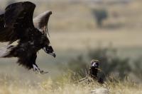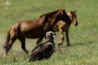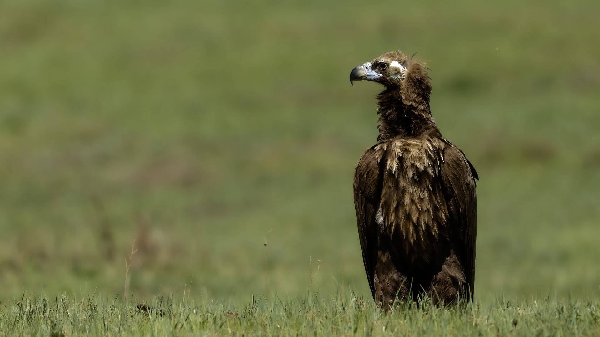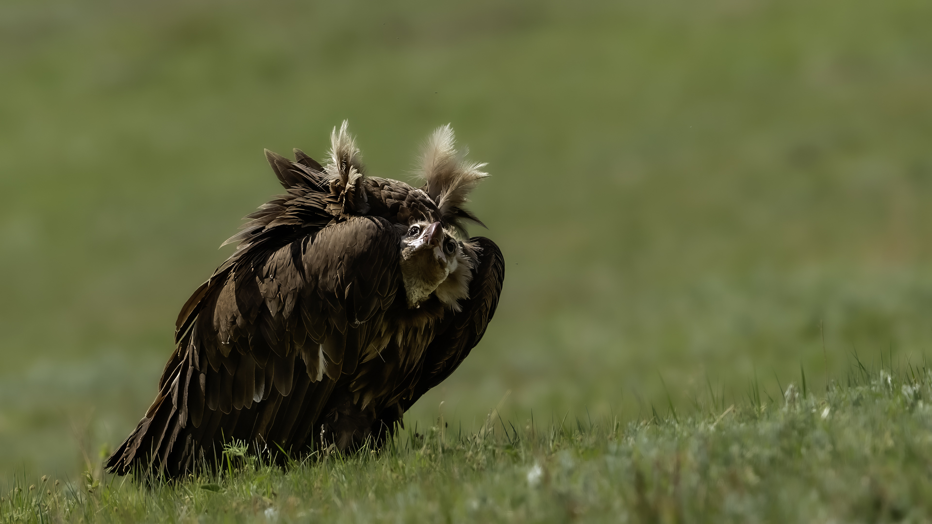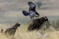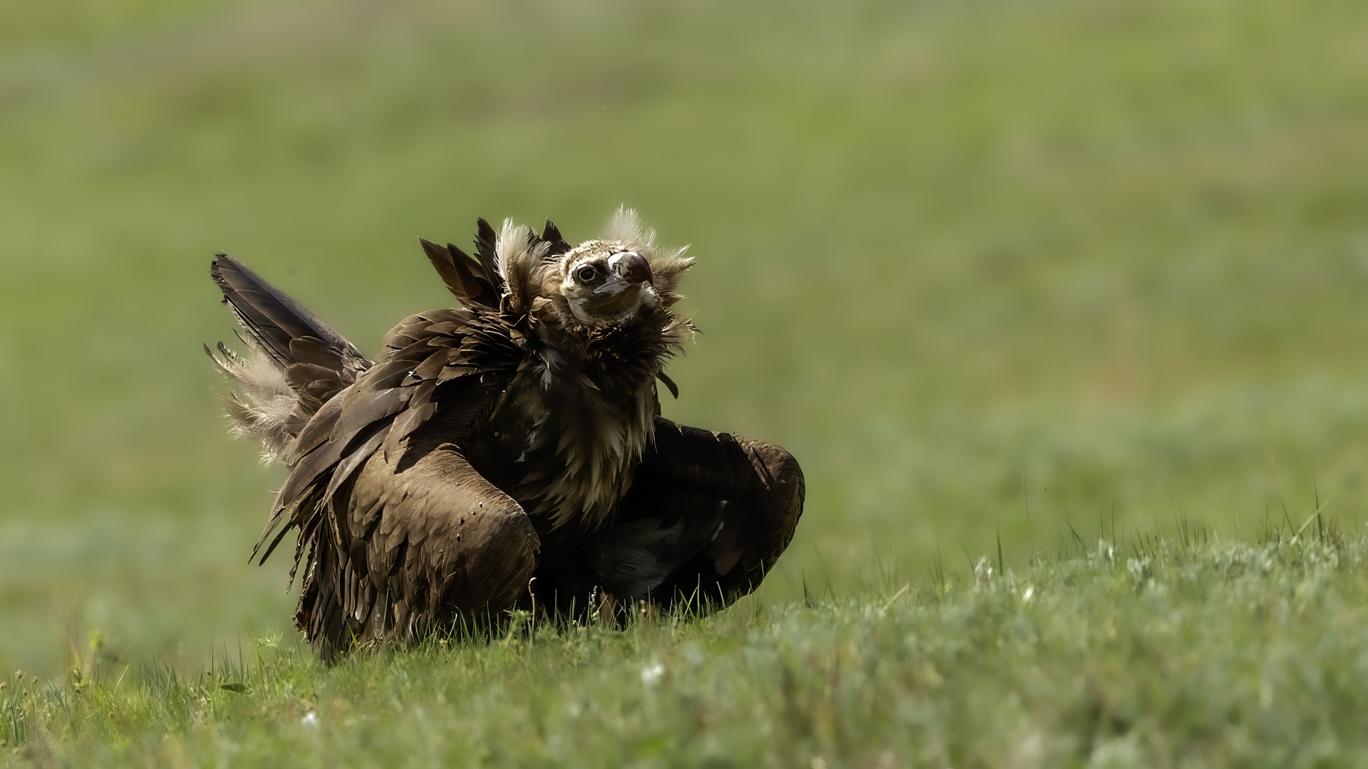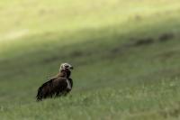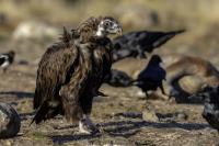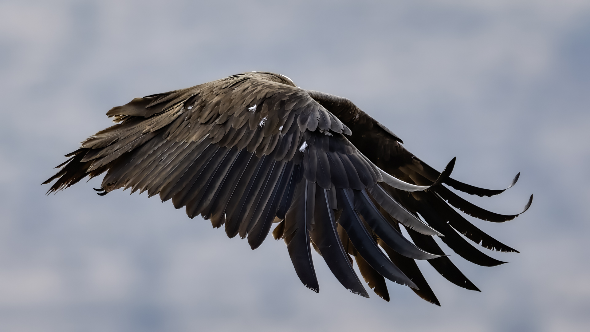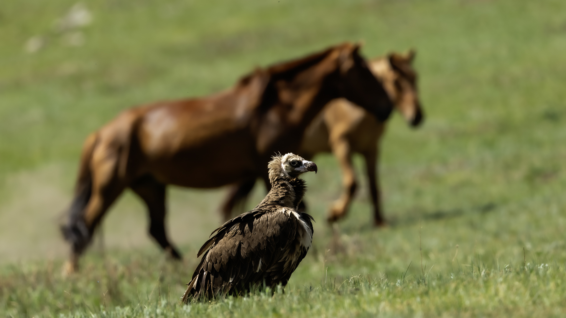 Niespełna 3 metry rozpiętości skrzydeł, waga może przekraczać 12 kilogramów. Potężny, piękny ptak. Sępy kasztanowate były bardzo bojaźliwe i siadały po lewej stronie czatowni, w znacznej odległości godzinami obserwując czatownię i okolicę. Każdego dnia były śmielsze i zmniejszały odległość , a tym samym powstawały coraz lepsze zdjęcia. Oczywiście, sępy, jak to sępy żerują na padlinie. Pozostawiona padlina początkowo była wykorzystywana też przez inne zwierzęta, ale na noc miała być chowana. Jej przeznaczenie to jednak nęcisko dla ptaków i tylko ptaków żerujących za dnia. Niestety organizator warsztatów, próbując wieczorem zabrać padlinę sprzed czatowni, musiał zmienić plany w tym zakresie, gdyż właśnie do kolacji zasiadły przy niej dwa niedźwiedzie, które nie zamierzały rezygnować ze swoich planów wobec pozostawionego mięsa. Sami tego nie widzieliśmy, ale rano następnego dnia świt ukazał, pozostałości po uczcie niedźwiedzi. Tak, więc nasze nęcisko, mocno uszczuplone, ale nadal spełniające swoją funkcję, bo sępy przyleciały. Na szczęście, sępy nabierające zaufania, kilka razy, podeszły tak blisko, że 600 mm obiektyw pokazywał już tylko samą sylwetkę ptaka, a podczas jego odlotu w kadr, nie mieściły się jego skrzydła. Tu powstawała duża trudność w fotografowaniu, bo raz ptak miał metr wysokości, raz 3 metry rozpiętości skrzydeł. Jeżeli siedział i obserwował z oddali, to brakowało ogniskowej, aby wykonać zdjęcia. Jeżeli przyleciał przed czatownię, warto mieć już obiektyw 300 milimetrowy. Nie radzę niczego zmieniać podczas fotografowania, bo może być to tożsame z zakończeniem fotografowania, przynajmniej w tym dniu. Wszystkie ptaki były bardzo bojaźliwe i ostrożne, a jakakolwiek zmiana, ruch powodował, że niebo było czarne od kruków i srok, a przerwa w fotografowaniu mogła trwać kilka godzin. Sępy wielokrotnie przelatywały nad czatownią zaabsorbowane obserwowaniem tego co działo się przy padlinie, z głową skierowaną w dół. Ich lot był na bardzo niskiej wysokości, tak że nie było problemów z wykonaniem zdjęć. Oczywiście niebieskie tło nieba to nie moja ulubiona kompozycja, ale zamieściłem też kilka takich zdjęć, dla ukazania piękna szybującego ptasiego giganta. Dodałem też kilka zdjęć sępa ze sroką, czy krukiem dla zbudowania skali porównawczej i oddania wielkości tego ptaka. Sroki i kruki zawsze były w okolicy tych ptaków, bez względu, czy siedziały na ziemi, czy szybowały w powietrzu. Niestety sępy kasztanowate należą do rzadkich gatunków i ich liczebność na świecie to około 1000 par.