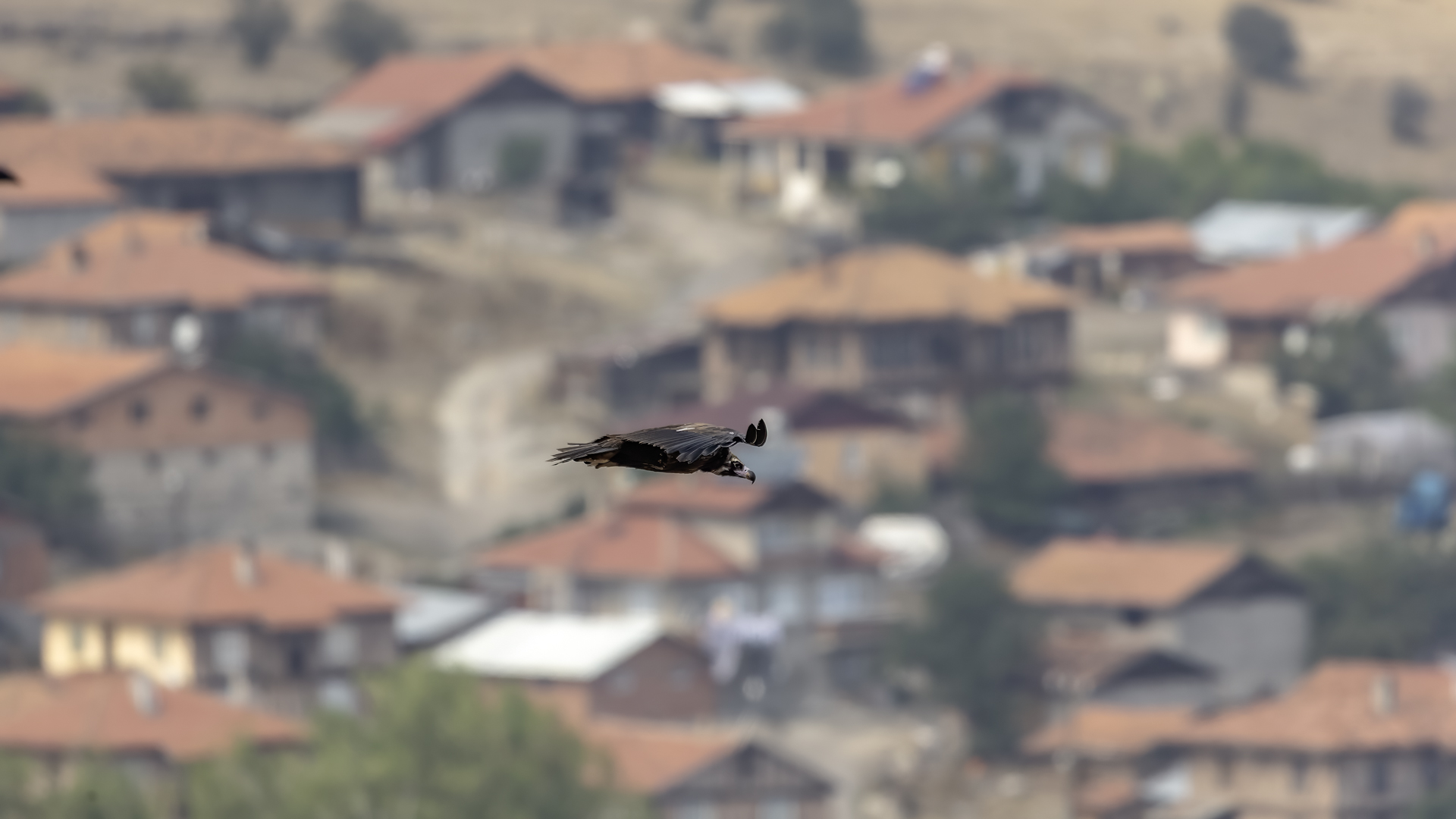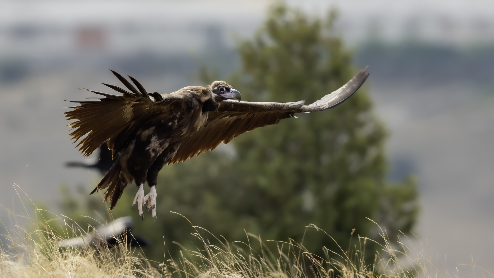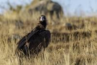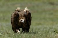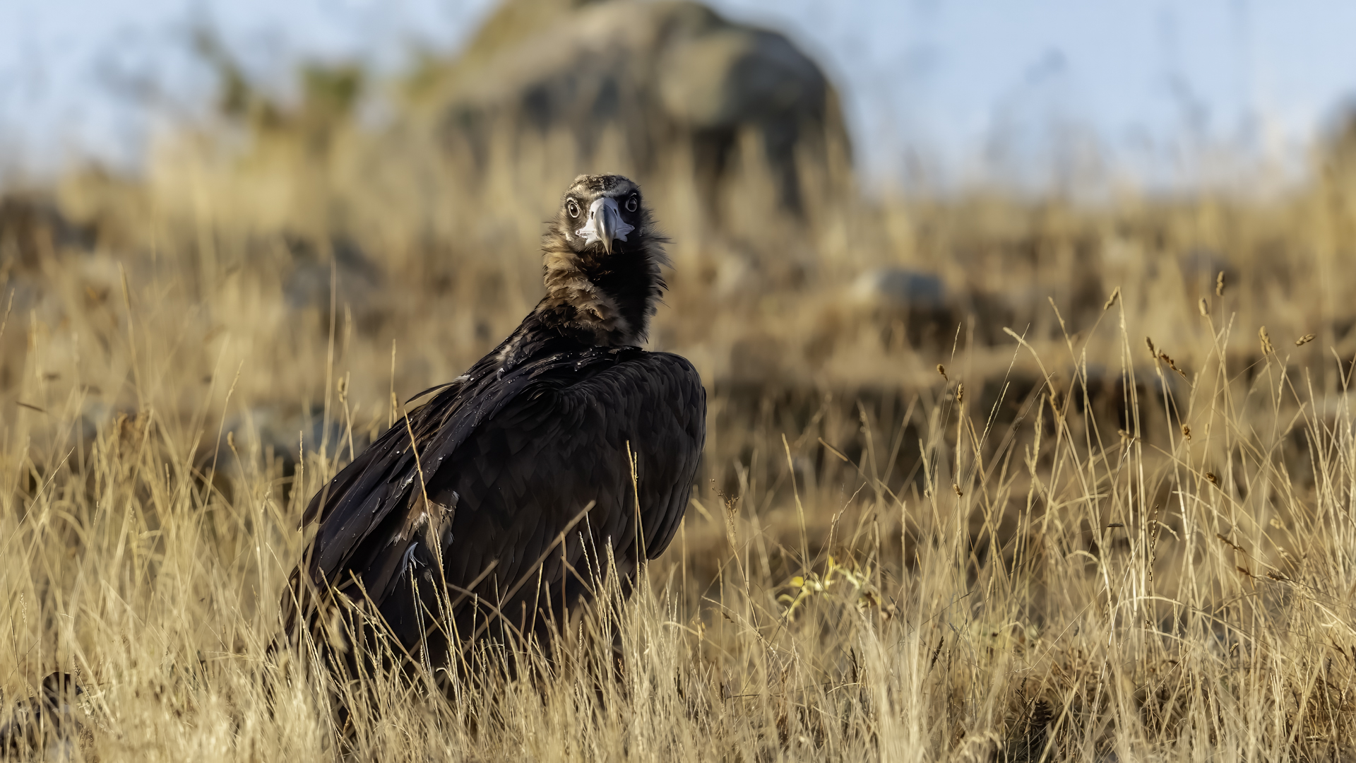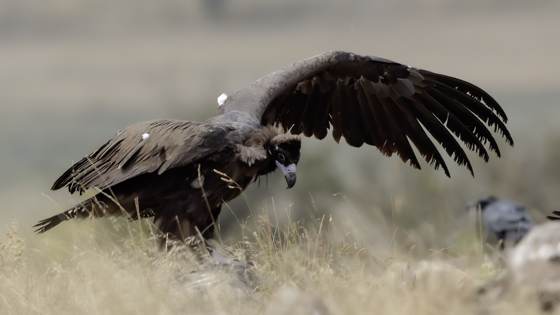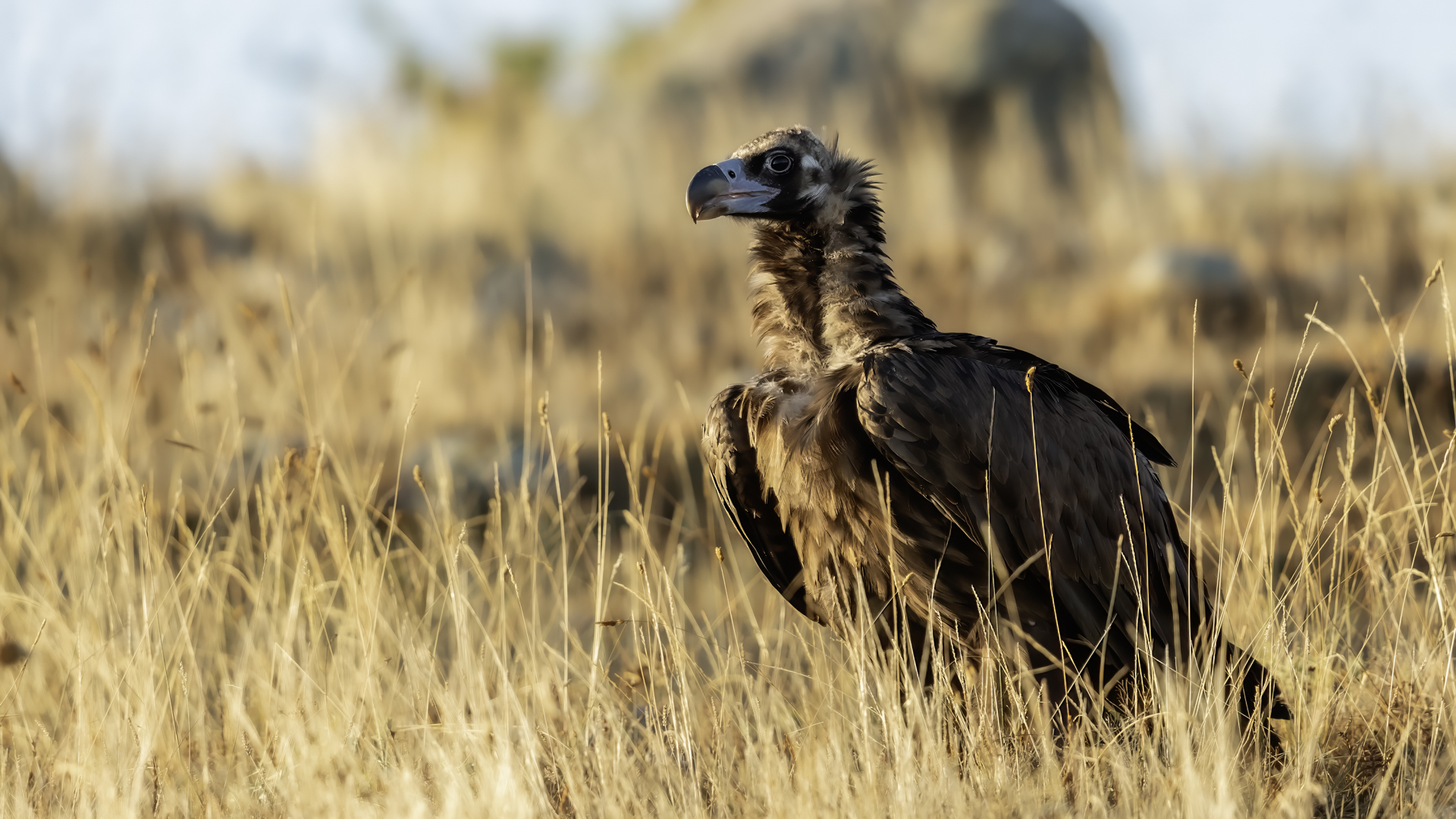 Niespełna 3 metry rozpiętości skrzydeł, waga może przekraczać 12 kilogramów. Potężny, piękny ptak. Sępy kasztanowate były bardzo bojaźliwe i siadały po lewej stronie czatowni, w znacznej odległości godzinami obserwując czatownię i okolicę. Każdego dnia były śmielsze i zmniejszały odległość , a tym samym powstawały coraz lepsze zdjęcia. Oczywiście, sępy, jak to sępy żerują na padlinie. Pozostawiona padlina początkowo była wykorzystywana też przez inne zwierzęta, ale na noc miała być chowana. Jej przeznaczenie to jednak nęcisko dla ptaków i tylko ptaków żerujących za dnia. Niestety organizator warsztatów, próbując wieczorem zabrać padlinę sprzed czatowni, musiał zmienić plany w tym zakresie, gdyż właśnie do kolacji zasiadły przy niej dwa niedźwiedzie, które nie zamierzały rezygnować ze swoich planów wobec pozostawionego mięsa. Sami tego nie widzieliśmy, ale rano następnego dnia świt ukazał, pozostałości po uczcie niedźwiedzi. Tak, więc nasze nęcisko, mocno uszczuplone, ale nadal spełniające swoją funkcję, bo sępy przyleciały. Na szczęście, sępy nabierające zaufania, kilka razy, podeszły tak blisko, że 600 mm obiektyw pokazywał już tylko samą sylwetkę ptaka, a podczas jego odlotu w kadr, nie mieściły się jego skrzydła. Tu powstawała duża trudność w fotografowaniu, bo raz ptak miał metr wysokości, raz 3 metry rozpiętości skrzydeł. Jeżeli siedział i obserwował z oddali, to brakowało ogniskowej, aby wykonać zdjęcia. Jeżeli przyleciał przed czatownię, warto mieć już obiektyw 300 milimetrowy. Nie radzę niczego zmieniać podczas fotografowania, bo może być to tożsame z zakończeniem fotografowania, przynajmniej w tym dniu. Wszystkie ptaki były bardzo bojaźliwe i ostrożne, a jakakolwiek zmiana, ruch powodował, że niebo było czarne od kruków i srok, a przerwa w fotografowaniu mogła trwać kilka godzin. Sępy wielokrotnie przelatywały nad czatownią zaabsorbowane obserwowaniem tego co działo się przy padlinie, z głową skierowaną w dół. Ich lot był na bardzo niskiej wysokości, tak że nie było problemów z wykonaniem zdjęć. Oczywiście niebieskie tło nieba to nie moja ulubiona kompozycja, ale zamieściłem też kilka takich zdjęć, dla ukazania piękna szybującego ptasiego giganta. Dodałem też kilka zdjęć sępa ze sroką, czy krukiem dla zbudowania skali porównawczej i oddania wielkości tego ptaka. Sroki i kruki zawsze były w okolicy tych ptaków, bez względu, czy siedziały na ziemi, czy szybowały w powietrzu. Niestety sępy kasztanowate należą do rzadkich gatunków i ich liczebność na świecie to około 1000 par.