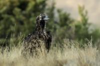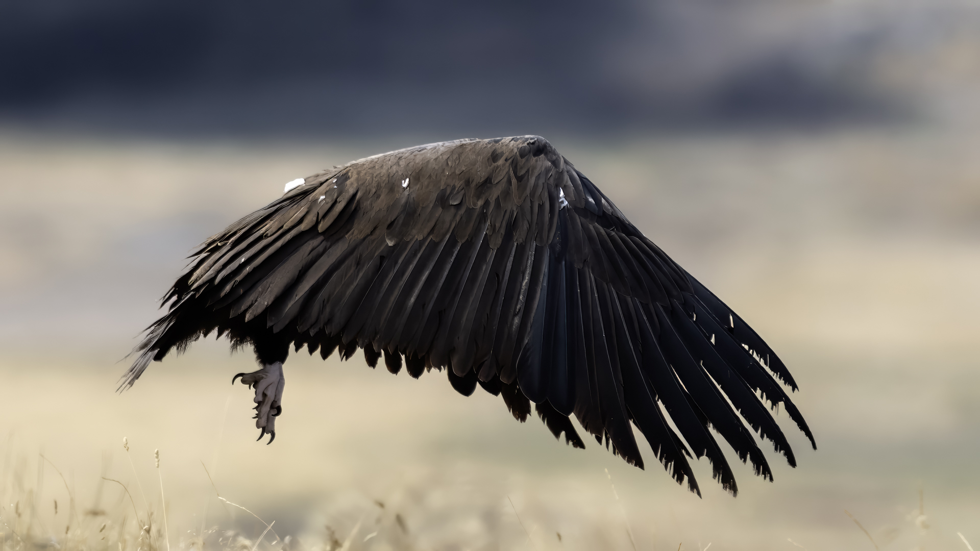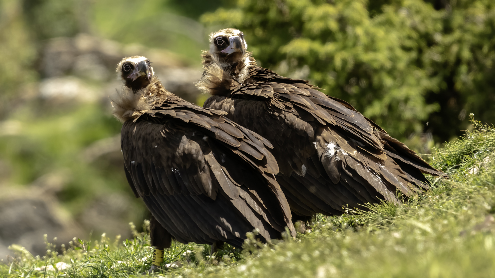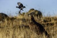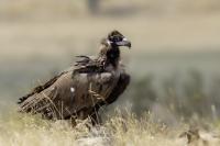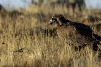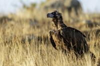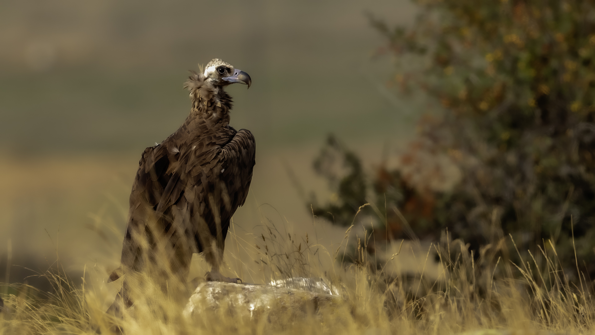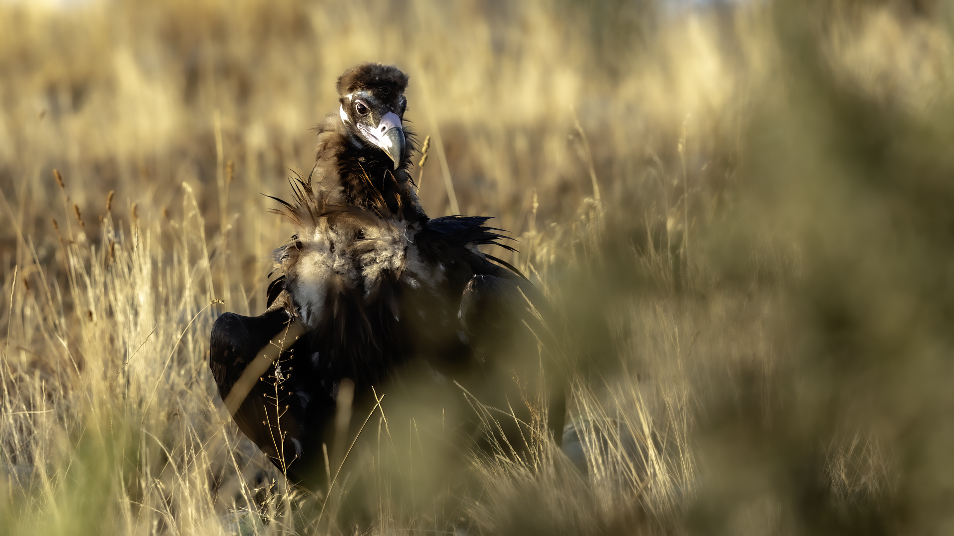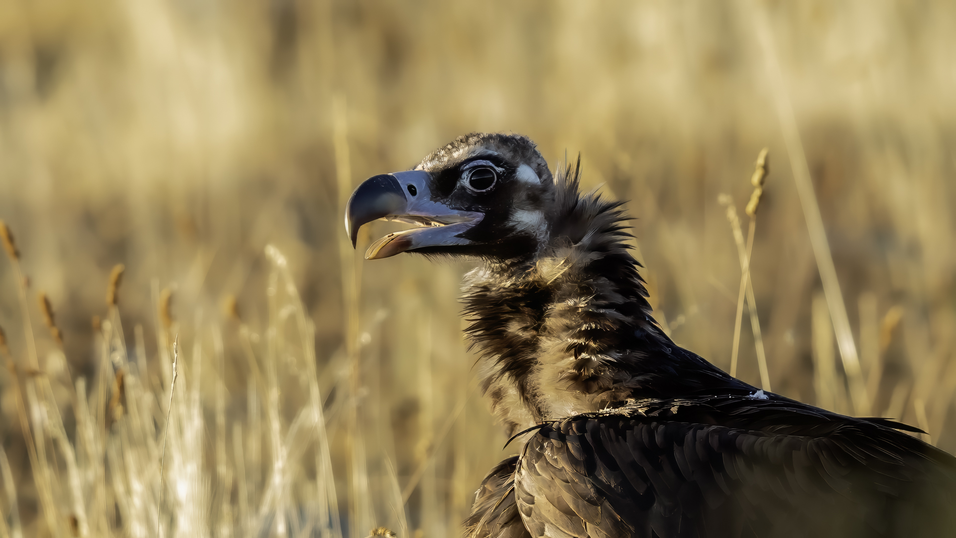 Niespełna 3 metry rozpiętości skrzydeł, waga może przekraczać 12 kilogramów. Potężny, piękny ptak. Sępy kasztanowate były bardzo bojaźliwe i siadały po lewej stronie czatowni, w znacznej odległości godzinami obserwując czatownię i okolicę. Każdego dnia były śmielsze i zmniejszały odległość , a tym samym powstawały coraz lepsze zdjęcia. Oczywiście, sępy, jak to sępy żerują na padlinie. Pozostawiona padlina początkowo była wykorzystywana też przez inne zwierzęta, ale na noc miała być chowana. Jej przeznaczenie to jednak nęcisko dla ptaków i tylko ptaków żerujących za dnia. Niestety organizator warsztatów, próbując wieczorem zabrać padlinę sprzed czatowni, musiał zmienić plany w tym zakresie, gdyż właśnie do kolacji zasiadły przy niej dwa niedźwiedzie, które nie zamierzały rezygnować ze swoich planów wobec pozostawionego mięsa. Sami tego nie widzieliśmy, ale rano następnego dnia świt ukazał, pozostałości po uczcie niedźwiedzi. Tak, więc nasze nęcisko, mocno uszczuplone, ale nadal spełniające swoją funkcję, bo sępy przyleciały. Na szczęście, sępy nabierające zaufania, kilka razy, podeszły tak blisko, że 600 mm obiektyw pokazywał już tylko samą sylwetkę ptaka, a podczas jego odlotu w kadr, nie mieściły się jego skrzydła. Tu powstawała duża trudność w fotografowaniu, bo raz ptak miał metr wysokości, raz 3 metry rozpiętości skrzydeł. Jeżeli siedział i obserwował z oddali, to brakowało ogniskowej, aby wykonać zdjęcia. Jeżeli przyleciał przed czatownię, warto mieć już obiektyw 300 milimetrowy. Nie radzę niczego zmieniać podczas fotografowania, bo może być to tożsame z zakończeniem fotografowania, przynajmniej w tym dniu. Wszystkie ptaki były bardzo bojaźliwe i ostrożne, a jakakolwiek zmiana, ruch powodował, że niebo było czarne od kruków i srok, a przerwa w fotografowaniu mogła trwać kilka godzin. Sępy wielokrotnie przelatywały nad czatownią zaabsorbowane obserwowaniem tego co działo się przy padlinie, z głową skierowaną w dół. Ich lot był na bardzo niskiej wysokości, tak że nie było problemów z wykonaniem zdjęć. Oczywiście niebieskie tło nieba to nie moja ulubiona kompozycja, ale zamieściłem też kilka takich zdjęć, dla ukazania piękna szybującego ptasiego giganta. Dodałem też kilka zdjęć sępa ze sroką, czy krukiem dla zbudowania skali porównawczej i oddania wielkości tego ptaka. Sroki i kruki zawsze były w okolicy tych ptaków, bez względu, czy siedziały na ziemi, czy szybowały w powietrzu. Niestety sępy kasztanowate należą do rzadkich gatunków i ich liczebność na świecie to około 1000 par.