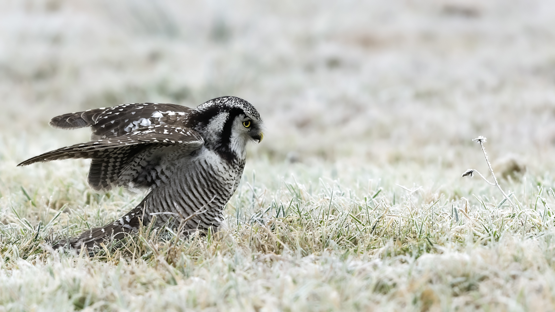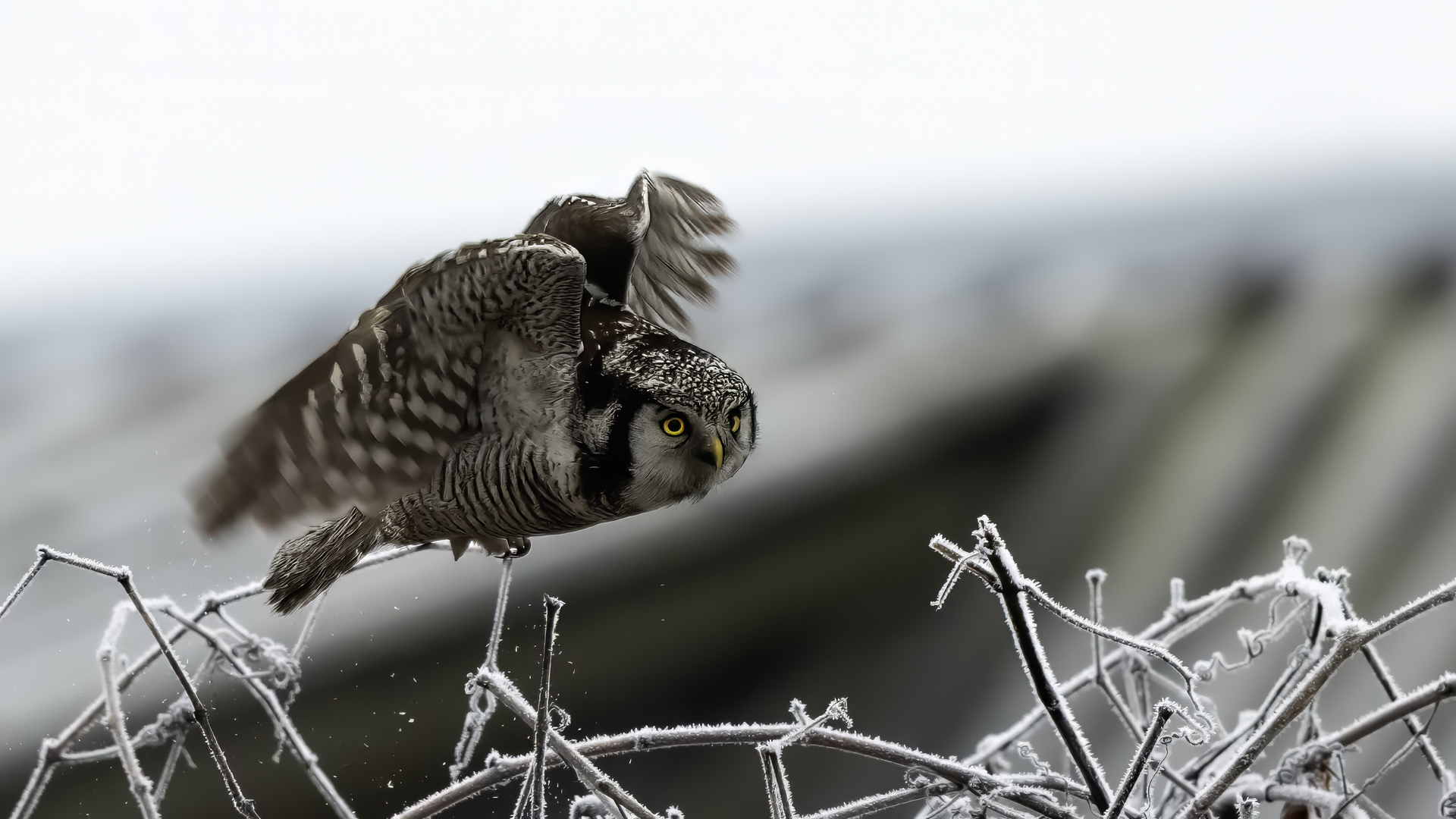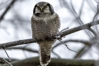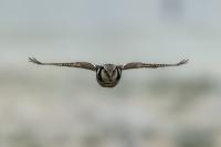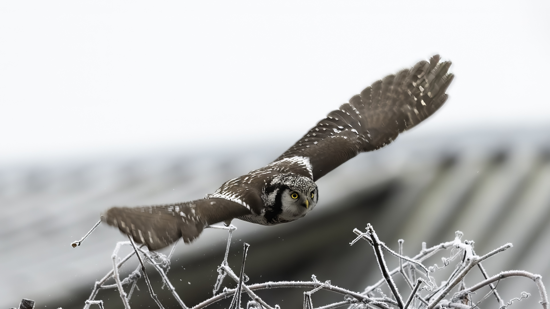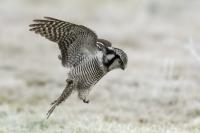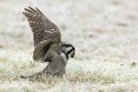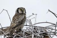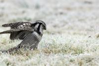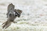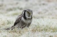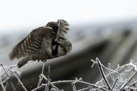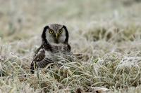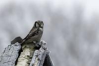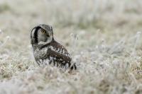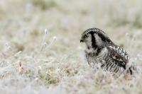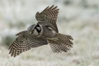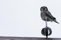 Przedstawiam Wam chyba najbardziej obfotografowanego ptaka w Polsce w ostatnim czasie (11/2013). I wcale mnie nie dziwi jego popularność i zainteresowanie związane z jego przybyciem. Zwłaszcza, że to wielka rzadkość obserwowanie przedstawiciela tego gatunku w Polsce i to jeszcze w tak łatwy sposób. Sowa ma wręcz swoje miejsce „dyżurne” w miejscowości Lutobork, gdzie zawsze można ją spotkać i bez trudu sfotografować. Oczywiście fotografia fotografii nierówna, ale na mojej sesji, a właściwie naszej, zabrakło światła (pozdrawiam Pawła i Łukasza, z którymi w miłej atmosferze, mimo mrozu, miałem przyjemność fotografować tego wspaniałego ptaka). Zdjęcia w mroźny poranek mają swój klimat, ale prognozy w tym dniu zupełnie się nie sprawdziły. Miał być piękny wschód słońca, a okazało się, że słońce nie wyjrzało nawet na chwilę. Przynajmniej w godzinach rannych. Wiele zdjęć nieostrych i brakowało im tej ciepłej barwy, nie mówiąc już o możliwości zastosowania krótszych czasów naświetlania i zrobienia jeszcze lepszych, dynamicznych ujęć. Zdumiewającym jest, że sowa zachowywała się wręcz jak oswojona, zupełnie lekceważąc przejeżdżające samochody, czy przechodzących ludzi. Raz nawet przeleciała około metra ode mnie. Niesamowite wrażenie, kiedy tak piękny i rzadki ptak jest na wyciągnięcie ręki i czuć na twarzy wir powietrza spowodowany jej lotem. Wróble zachowują większy dystans do nas. Ale nie sowy. Tu analogia do fotografowanej niedawno sóweczki i jej zachowań. Na niektórych zdjęciach sowa jest w zurbanizowanym otoczeniu, ale właśnie w takim ją sfotografowałem. W swoich galeriach zawsze staram się oddać naturalne środowisko fotografowanego zwierzęcia zamieszczając w tym celu nieraz duże ilości zdjęć (drop, bielik, myszołów). Wracając jednak do sesji i warunków oświetleniowych. Szkoda, że tak wypadło bo kwintesencją fotografii tak szybkiego ptaka drapieżnego jest dynamiczne jego ujęcie w locie. Zamieszczam kilka zdjęć, ale zdecydowana większość powędrowała do kosza. Szybkość jej lotu, brak światła i panujący mróz obniżający refleks, nie sprzyjał wykonaniu oddających w pełni urok tego ptaka. Niemniej jednak powstało kilka zdjęć takich, które dokumentują moje pierwsze spotkanie z tym gatunkiem. Sowa jarzębata zamieszkuje północną część Euroazji i Ameryki Północnej. Jej waga to koło 300-350 gramów, przy rozpiętości skrzydeł około 80 cm. Pozuje już ponad miesiąc i widać, że jest w dobrej kondycji. Kto wie, może zostanie już na stałe? Byłaby pięknym i ciekawym uzupełnieniem rodzimych naszych gatunków. Tak więc galeria powstała niestety bez własnego nagrania dźwięku sowy jarzębatej. Cały, krótki czas poświęcony był na sesję fotograficzną sowy, która pod względem akustycznym nie współpracowała. Była praktycznie niema. Kilka cichych dźwięków i tak nie utworzyłoby ciekawego nagrania. Zapraszam jednak do mojej galerii fotograficznej sowy jarzębatej . . .