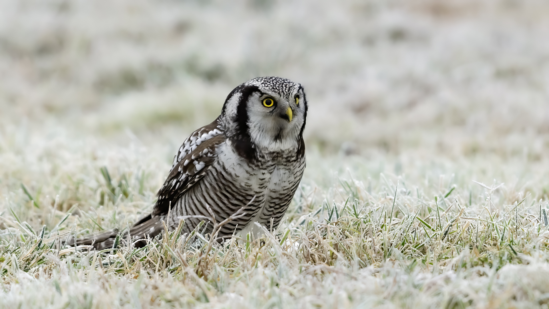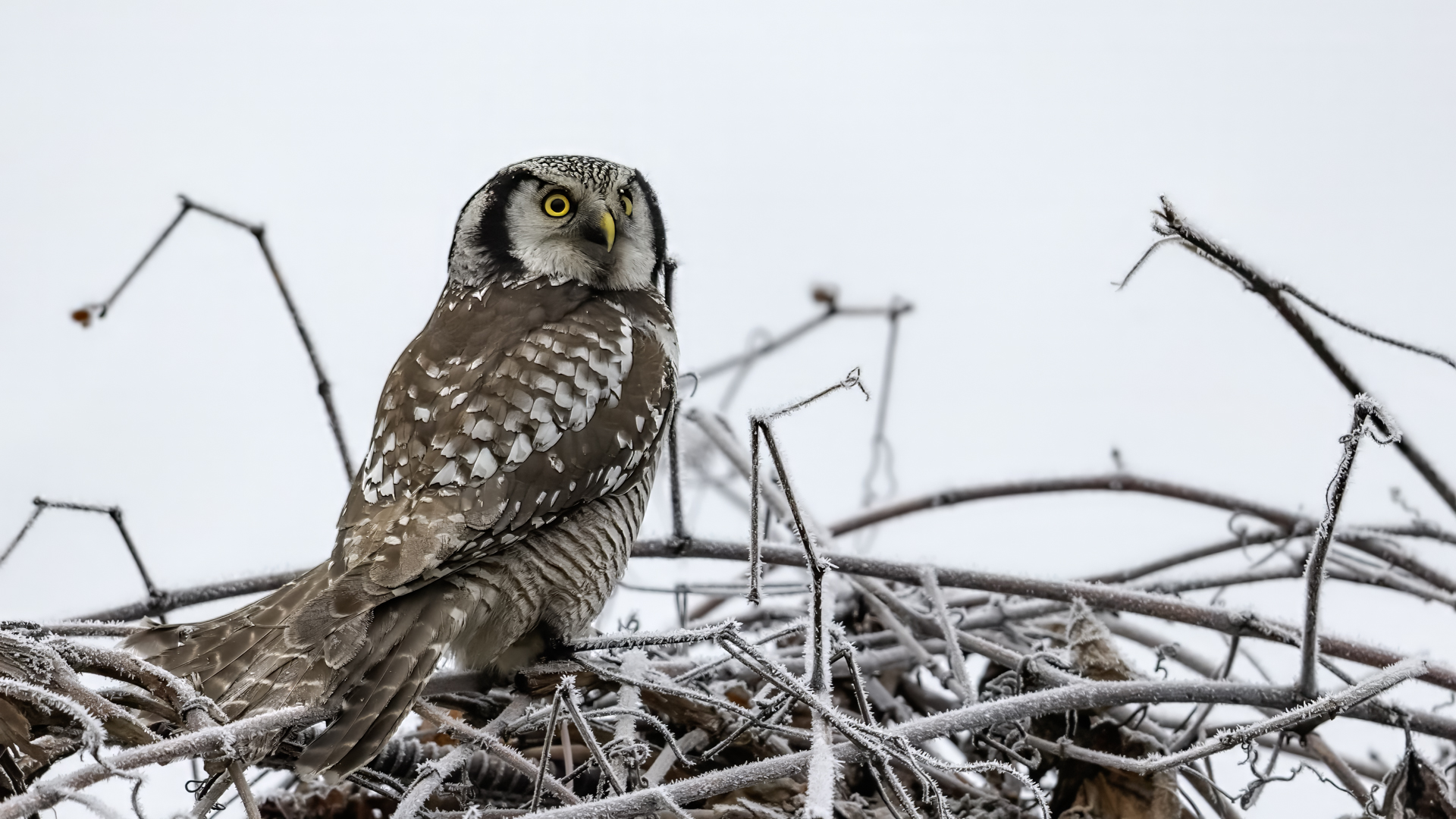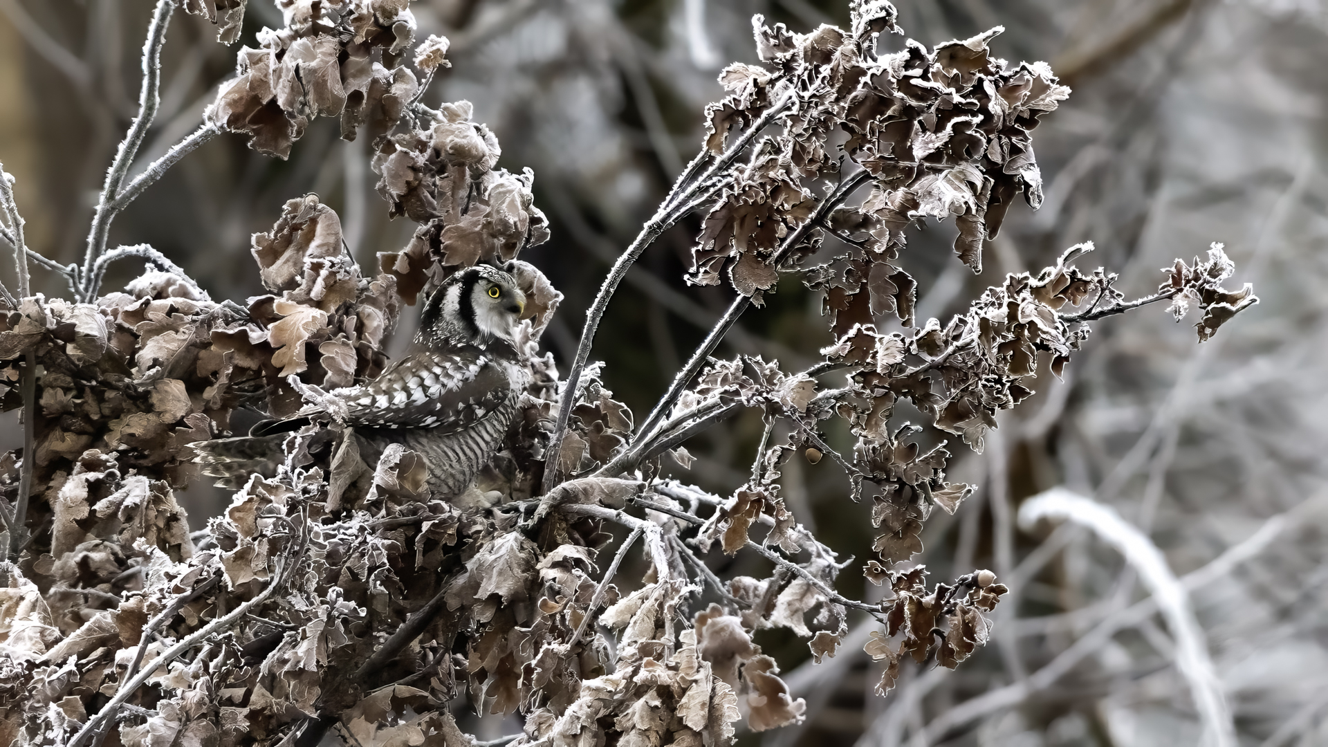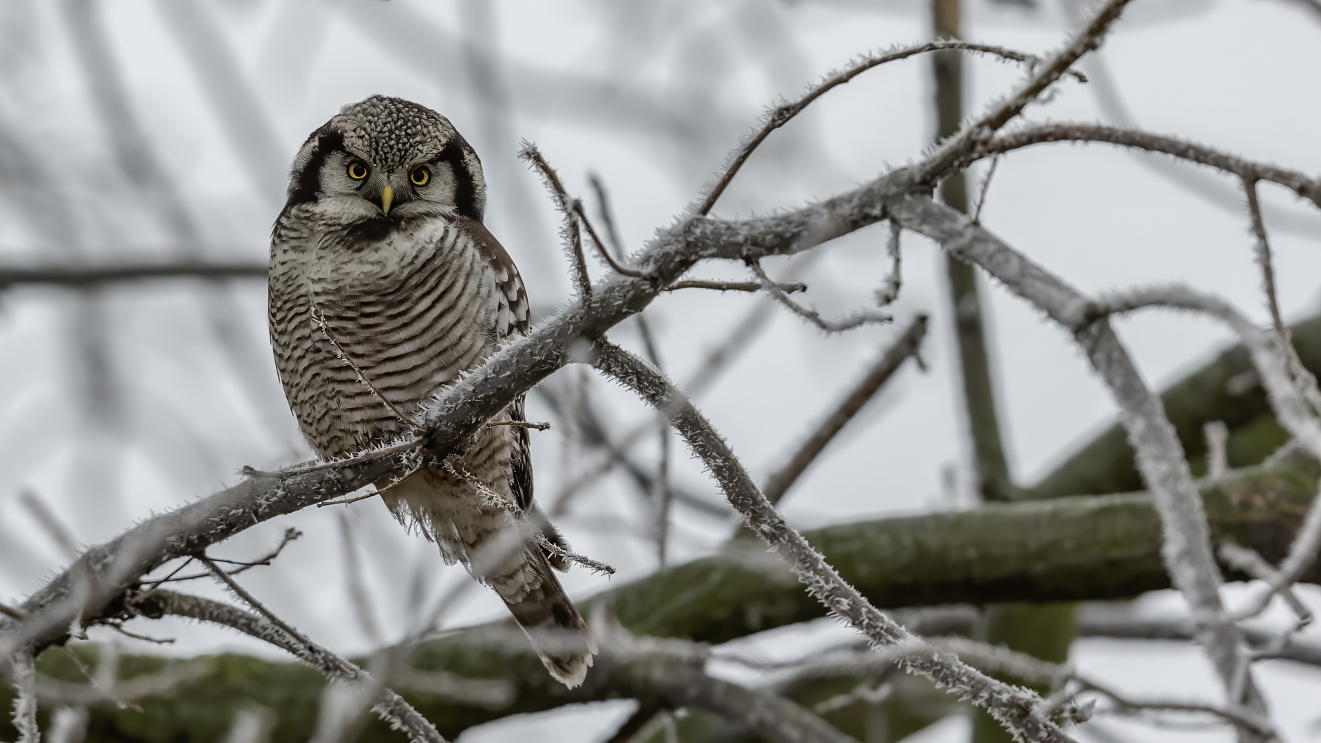 Przedstawiam Wam chyba najbardziej obfotografowanego ptaka w Polsce w ostatnim czasie (11/2013). I wcale mnie nie dziwi jego popularność i zainteresowanie związane z jego przybyciem. Zwłaszcza, że to wielka rzadkość obserwowanie przedstawiciela tego gatunku w Polsce i to jeszcze w tak łatwy sposób. Sowa ma wręcz swoje miejsce „dyżurne” w miejscowości Lutobork, gdzie zawsze można ją spotkać i bez trudu sfotografować. Oczywiście fotografia fotografii nierówna, ale na mojej sesji, a właściwie naszej, zabrakło światła (pozdrawiam Pawła i Łukasza, z którymi w miłej atmosferze, mimo mrozu, miałem przyjemność fotografować tego wspaniałego ptaka). Zdjęcia w mroźny poranek mają swój klimat, ale prognozy w tym dniu zupełnie się nie sprawdziły. Miał być piękny wschód słońca, a okazało się, że słońce nie wyjrzało nawet na chwilę. Przynajmniej w godzinach rannych. Wiele zdjęć nieostrych i brakowało im tej ciepłej barwy, nie mówiąc już o możliwości zastosowania krótszych czasów naświetlania i zrobienia jeszcze lepszych, dynamicznych ujęć. Zdumiewającym jest, że sowa zachowywała się wręcz jak oswojona, zupełnie lekceważąc przejeżdżające samochody, czy przechodzących ludzi. Raz nawet przeleciała około metra ode mnie. Niesamowite wrażenie, kiedy tak piękny i rzadki ptak jest na wyciągnięcie ręki i czuć na twarzy wir powietrza spowodowany jej lotem. Wróble zachowują większy dystans do nas. Ale nie sowy. Tu analogia do fotografowanej niedawno sóweczki i jej zachowań. Na niektórych zdjęciach sowa jest w zurbanizowanym otoczeniu, ale właśnie w takim ją sfotografowałem. W swoich galeriach zawsze staram się oddać naturalne środowisko fotografowanego zwierzęcia zamieszczając w tym celu nieraz duże ilości zdjęć (drop, bielik, myszołów). Wracając jednak do sesji i warunków oświetleniowych. Szkoda, że tak wypadło bo kwintesencją fotografii tak szybkiego ptaka drapieżnego jest dynamiczne jego ujęcie w locie. Zamieszczam kilka zdjęć, ale zdecydowana większość powędrowała do kosza. Szybkość jej lotu, brak światła i panujący mróz obniżający refleks, nie sprzyjał wykonaniu oddających w pełni urok tego ptaka. Niemniej jednak powstało kilka zdjęć takich, które dokumentują moje pierwsze spotkanie z tym gatunkiem. Sowa jarzębata zamieszkuje północną część Euroazji i Ameryki Północnej. Jej waga to koło 300-350 gramów, przy rozpiętości skrzydeł około 80 cm. Pozuje już ponad miesiąc i widać, że jest w dobrej kondycji. Kto wie, może zostanie już na stałe? Byłaby pięknym i ciekawym uzupełnieniem rodzimych naszych gatunków. Tak więc galeria powstała niestety bez własnego nagrania dźwięku sowy jarzębatej. Cały, krótki czas poświęcony był na sesję fotograficzną sowy, która pod względem akustycznym nie współpracowała. Była praktycznie niema. Kilka cichych dźwięków i tak nie utworzyłoby ciekawego nagrania. Zapraszam jednak do mojej galerii fotograficznej sowy jarzębatej . . .