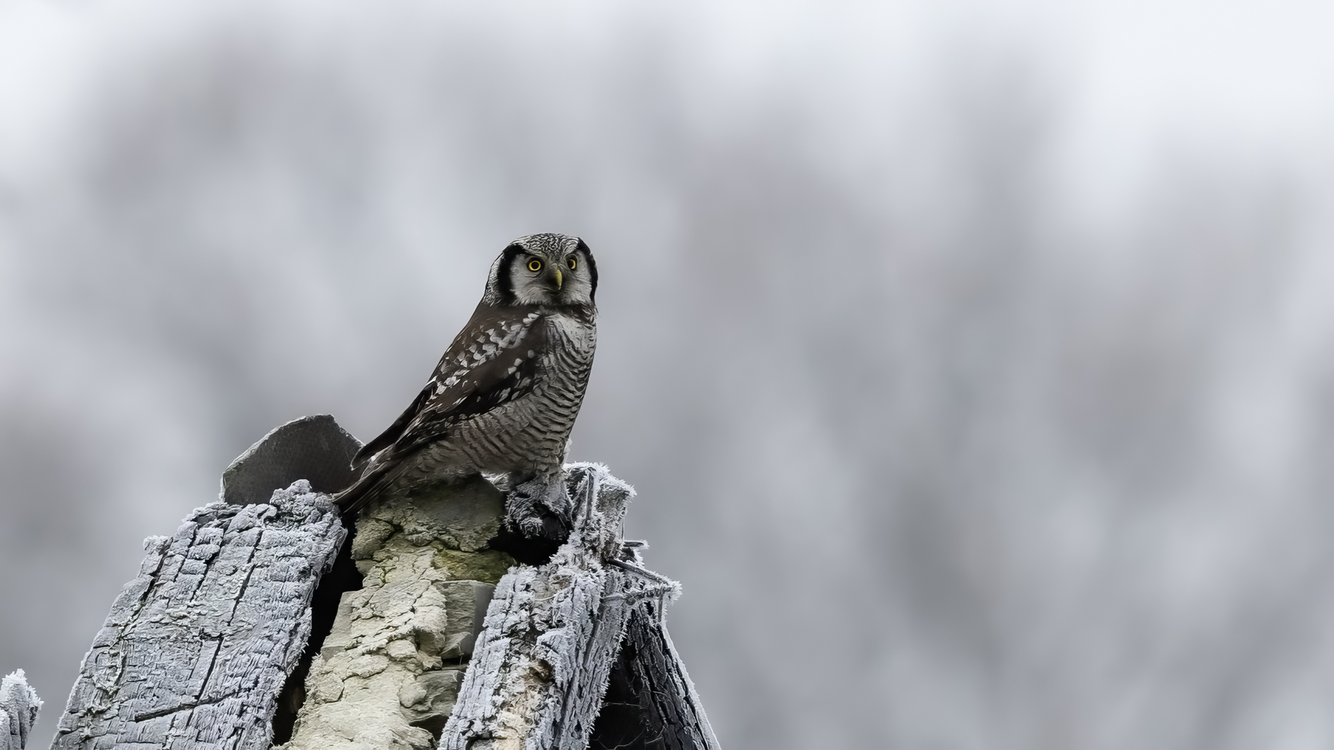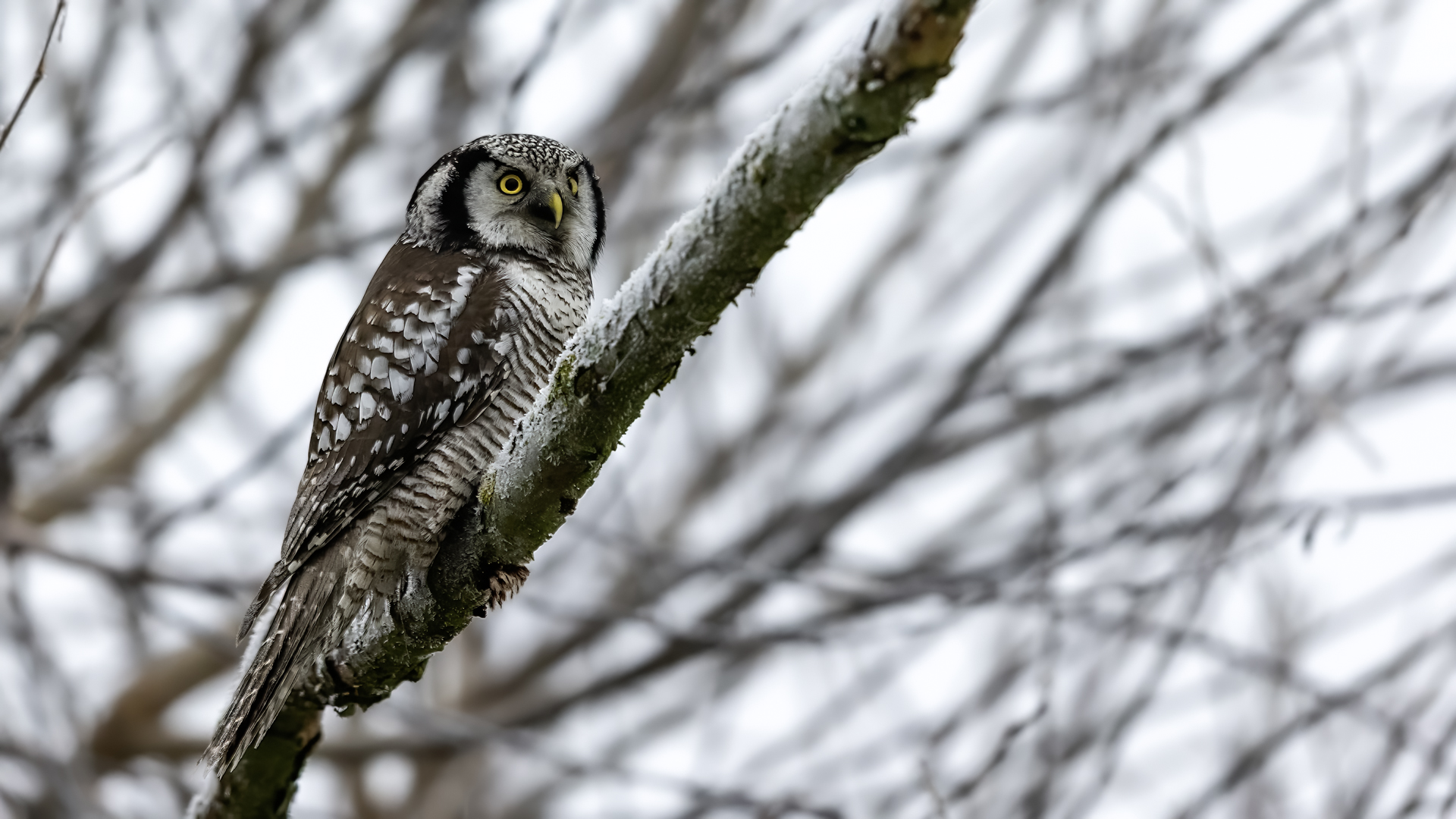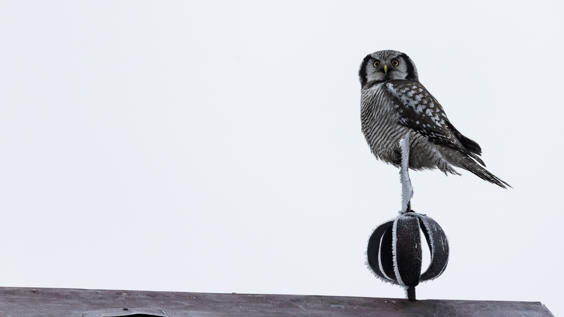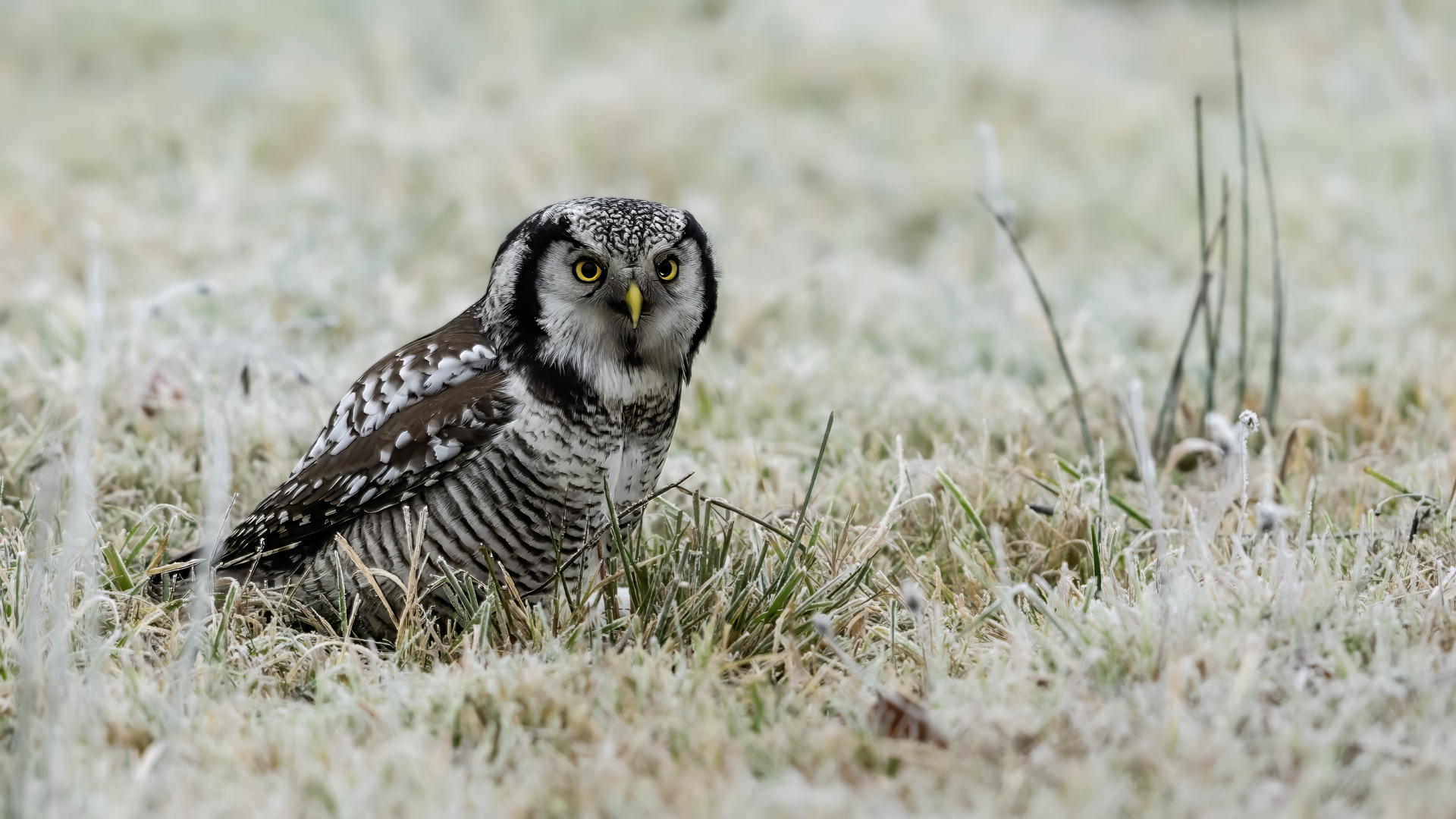 Przedstawiam Wam chyba najbardziej obfotografowanego ptaka w Polsce w ostatnim czasie (11/2013). I wcale mnie nie dziwi jego popularność i zainteresowanie związane z jego przybyciem. Zwłaszcza, że to wielka rzadkość obserwowanie przedstawiciela tego gatunku w Polsce i to jeszcze w tak łatwy sposób. Sowa ma wręcz swoje miejsce „dyżurne” w miejscowości Lutobork, gdzie zawsze można ją spotkać i bez trudu sfotografować. Oczywiście fotografia fotografii nierówna, ale na mojej sesji, a właściwie naszej, zabrakło światła (pozdrawiam Pawła i Łukasza, z którymi w miłej atmosferze, mimo mrozu, miałem przyjemność fotografować tego wspaniałego ptaka). Zdjęcia w mroźny poranek mają swój klimat, ale prognozy w tym dniu zupełnie się nie sprawdziły. Miał być piękny wschód słońca, a okazało się, że słońce nie wyjrzało nawet na chwilę. Przynajmniej w godzinach rannych. Wiele zdjęć nieostrych i brakowało im tej ciepłej barwy, nie mówiąc już o możliwości zastosowania krótszych czasów naświetlania i zrobienia jeszcze lepszych, dynamicznych ujęć. Zdumiewającym jest, że sowa zachowywała się wręcz jak oswojona, zupełnie lekceważąc przejeżdżające samochody, czy przechodzących ludzi. Raz nawet przeleciała około metra ode mnie. Niesamowite wrażenie, kiedy tak piękny i rzadki ptak jest na wyciągnięcie ręki i czuć na twarzy wir powietrza spowodowany jej lotem. Wróble zachowują większy dystans do nas. Ale nie sowy. Tu analogia do fotografowanej niedawno sóweczki i jej zachowań. Na niektórych zdjęciach sowa jest w zurbanizowanym otoczeniu, ale właśnie w takim ją sfotografowałem. W swoich galeriach zawsze staram się oddać naturalne środowisko fotografowanego zwierzęcia zamieszczając w tym celu nieraz duże ilości zdjęć (drop, bielik, myszołów). Wracając jednak do sesji i warunków oświetleniowych. Szkoda, że tak wypadło bo kwintesencją fotografii tak szybkiego ptaka drapieżnego jest dynamiczne jego ujęcie w locie. Zamieszczam kilka zdjęć, ale zdecydowana większość powędrowała do kosza. Szybkość jej lotu, brak światła i panujący mróz obniżający refleks, nie sprzyjał wykonaniu oddających w pełni urok tego ptaka. Niemniej jednak powstało kilka zdjęć takich, które dokumentują moje pierwsze spotkanie z tym gatunkiem. Sowa jarzębata zamieszkuje północną część Euroazji i Ameryki Północnej. Jej waga to koło 300-350 gramów, przy rozpiętości skrzydeł około 80 cm. Pozuje już ponad miesiąc i widać, że jest w dobrej kondycji. Kto wie, może zostanie już na stałe? Byłaby pięknym i ciekawym uzupełnieniem rodzimych naszych gatunków. Tak więc galeria powstała niestety bez własnego nagrania dźwięku sowy jarzębatej. Cały, krótki czas poświęcony był na sesję fotograficzną sowy, która pod względem akustycznym nie współpracowała. Była praktycznie niema. Kilka cichych dźwięków i tak nie utworzyłoby ciekawego nagrania. Zapraszam jednak do mojej galerii fotograficznej sowy jarzębatej . . .