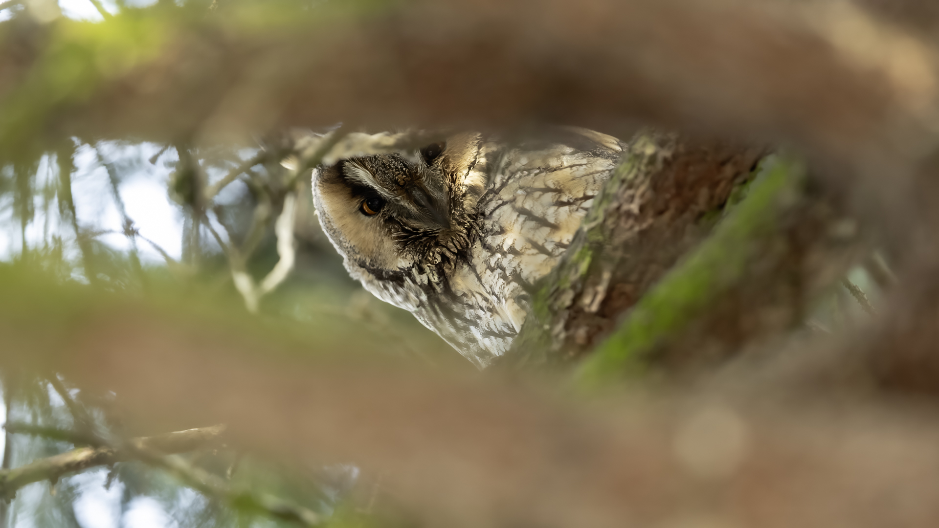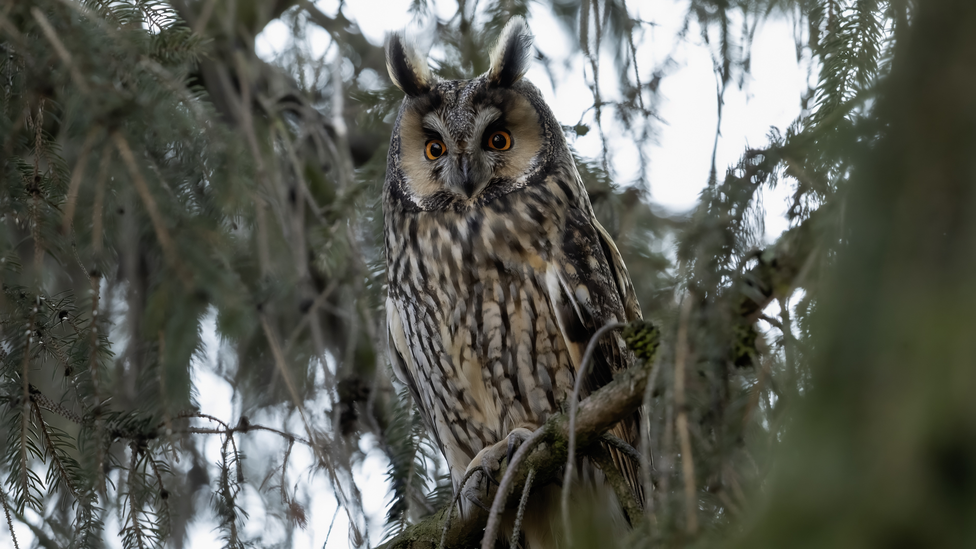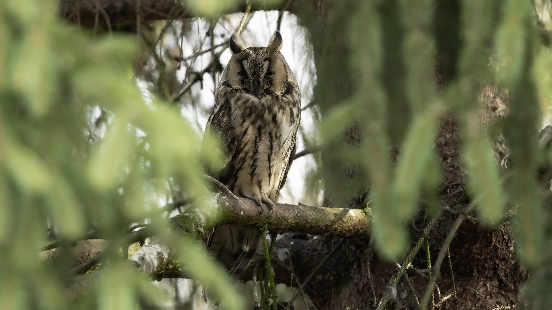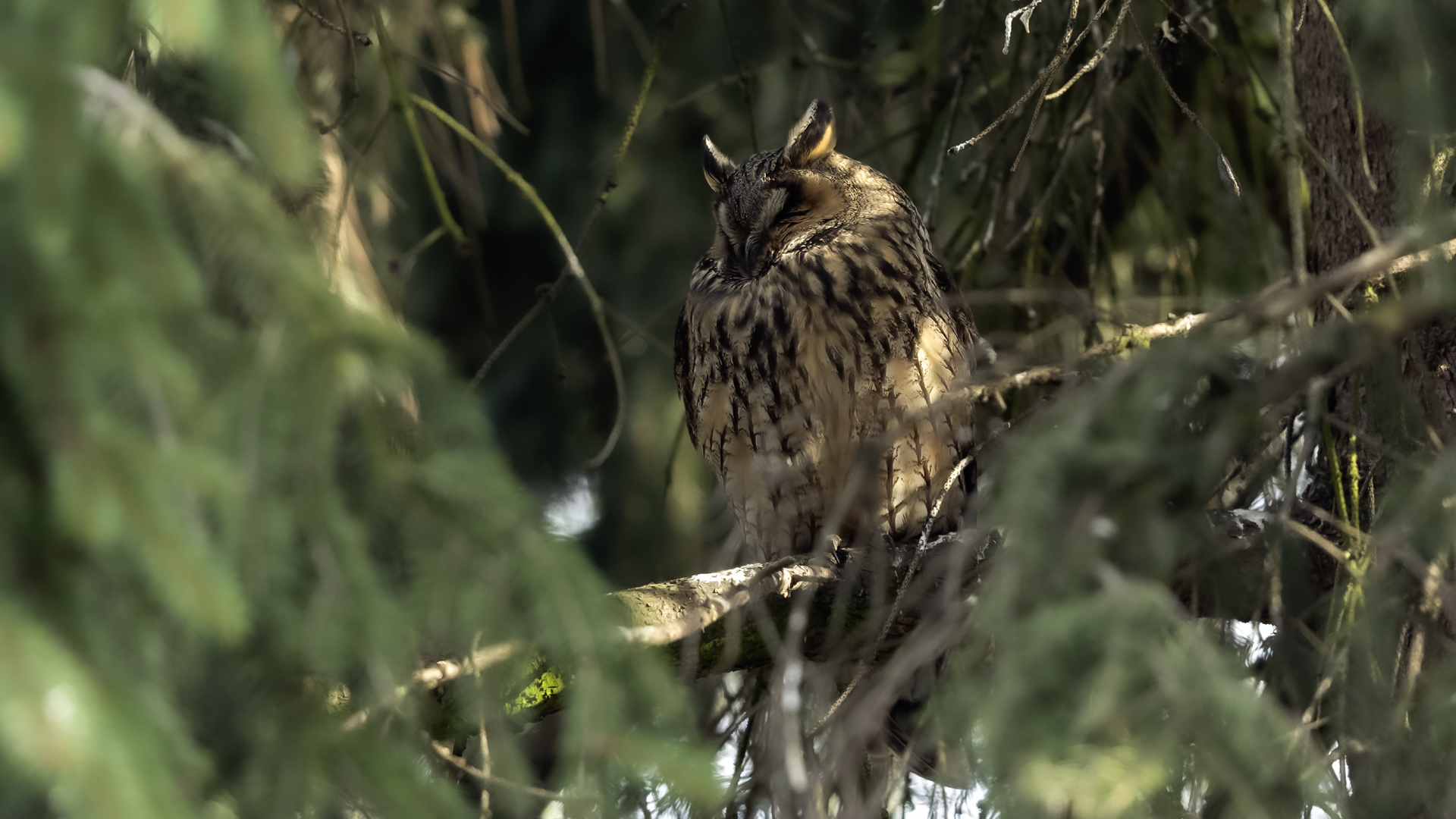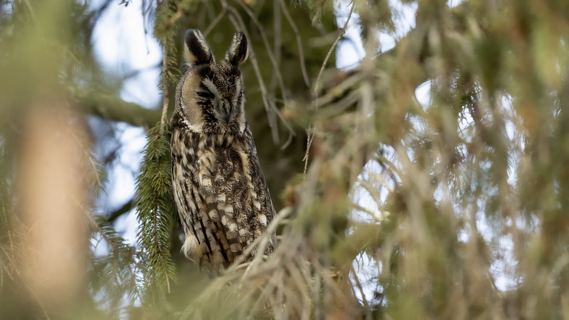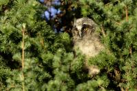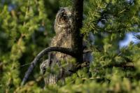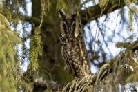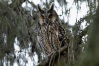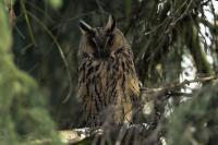 Kolejny gatunek sowy trafia do mojej galerii, a to za sprawą zwyczajnej ludzkiej życzliwości i spontaniczności (Sławek dziękuję za podpowiedź i pozdrawiam, bo w naszych czasach o życzliwość i wspólne podziwianie naszej ptasiej fauny wśród fotografów przyrody coraz trudniej, zastępuje ją często źle pojmowana rywalizacja i współzawodnictwo. Niestety, takie czasy). A miejsce w którym sfotografowałem uszatki wręcz szokuje. Dość ruchliwa ulica przy której na sosnach nie zwracające na ruch kołowy, przechodzących ludzi siedzą uszatki w koronach drzew. Niesamowite wrażenie patrząc na dotychczasowe moje doświadczenia w fotografowaniu ptaków w Polsce. Sowy, a było ich sześć, spały i cała trudność w ich fotografowaniu polegała na wyczekaniu momentu w którym sowa obróci głowę, aby móc sfotografować jej piękne rubinowe oczy, no i uwiecznić uszatkowe uszy. Miejsce także jest niesamowite pod względem życzliwości mieszkańców. Widząc statyw, obiektyw podchodzili i wypatrywali sowy w koronach drzew, aby pomóc w fotografowaniu. Kto wie, może obecność sów pozytywnie wpływa na ludzi? Podobno w okresie zimowym może być ich tam nawet kilkanaście. Sowy uszate osiągają wagę nieco większą od 0,25 kilograma, a rozpiętość skrzydeł nie przekracza metra. Pewnie trzeba będzie w okresie zimowym wrócić to niesamowite miejsce i dodać do galerii zdjęcia w zimowej scenerii, no i z lepszym światłem, bo tym razem nie dopisało.