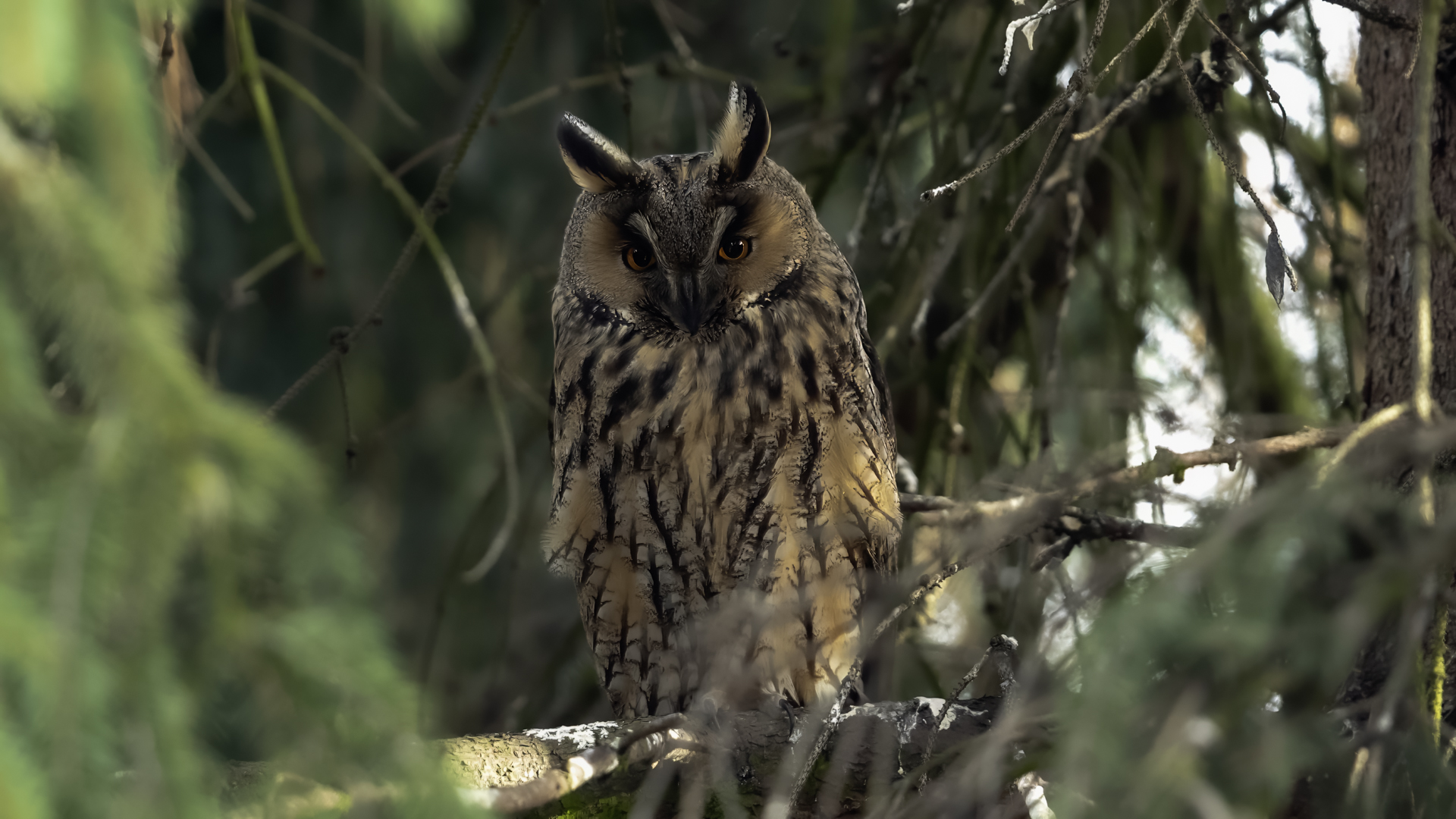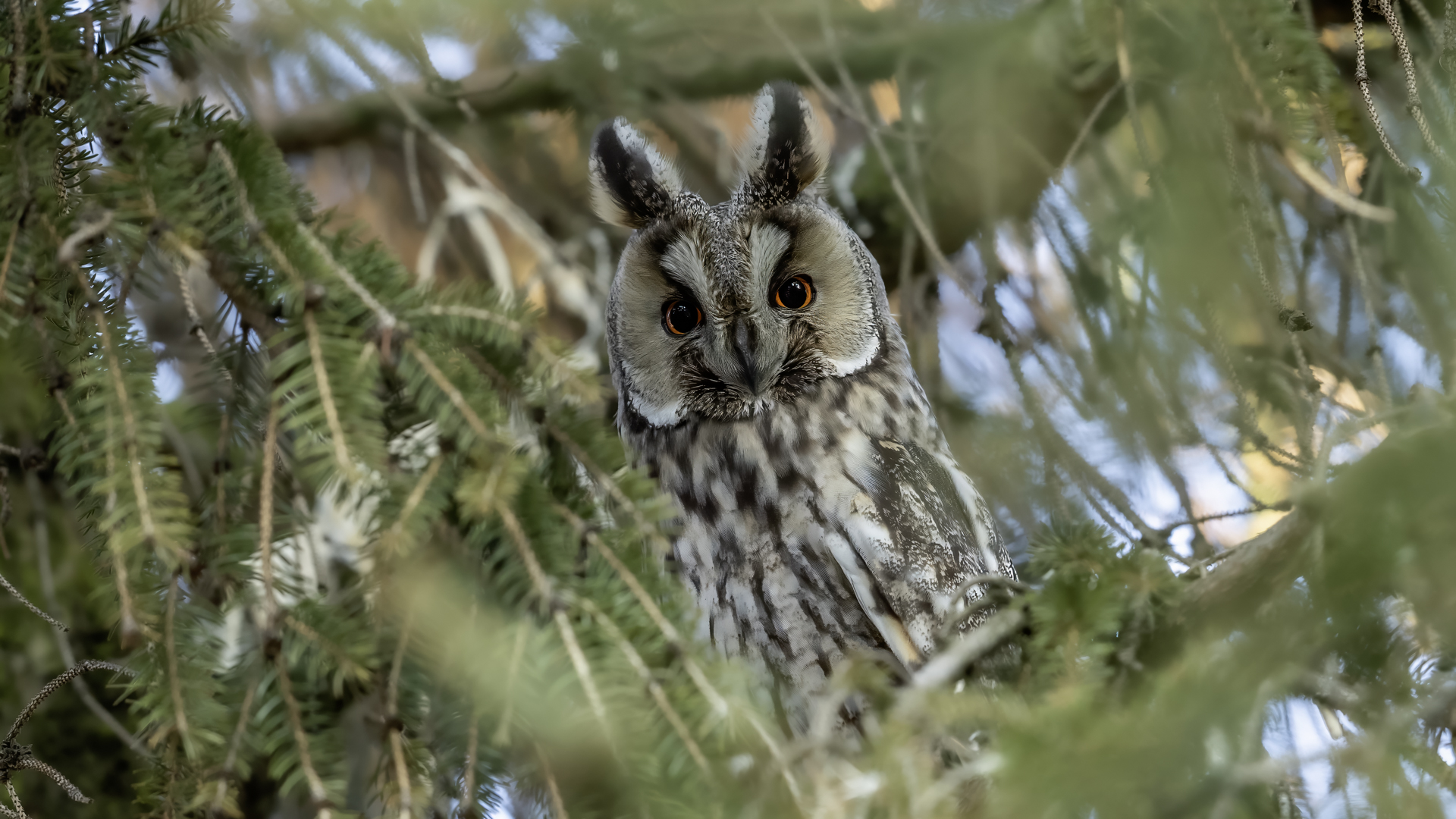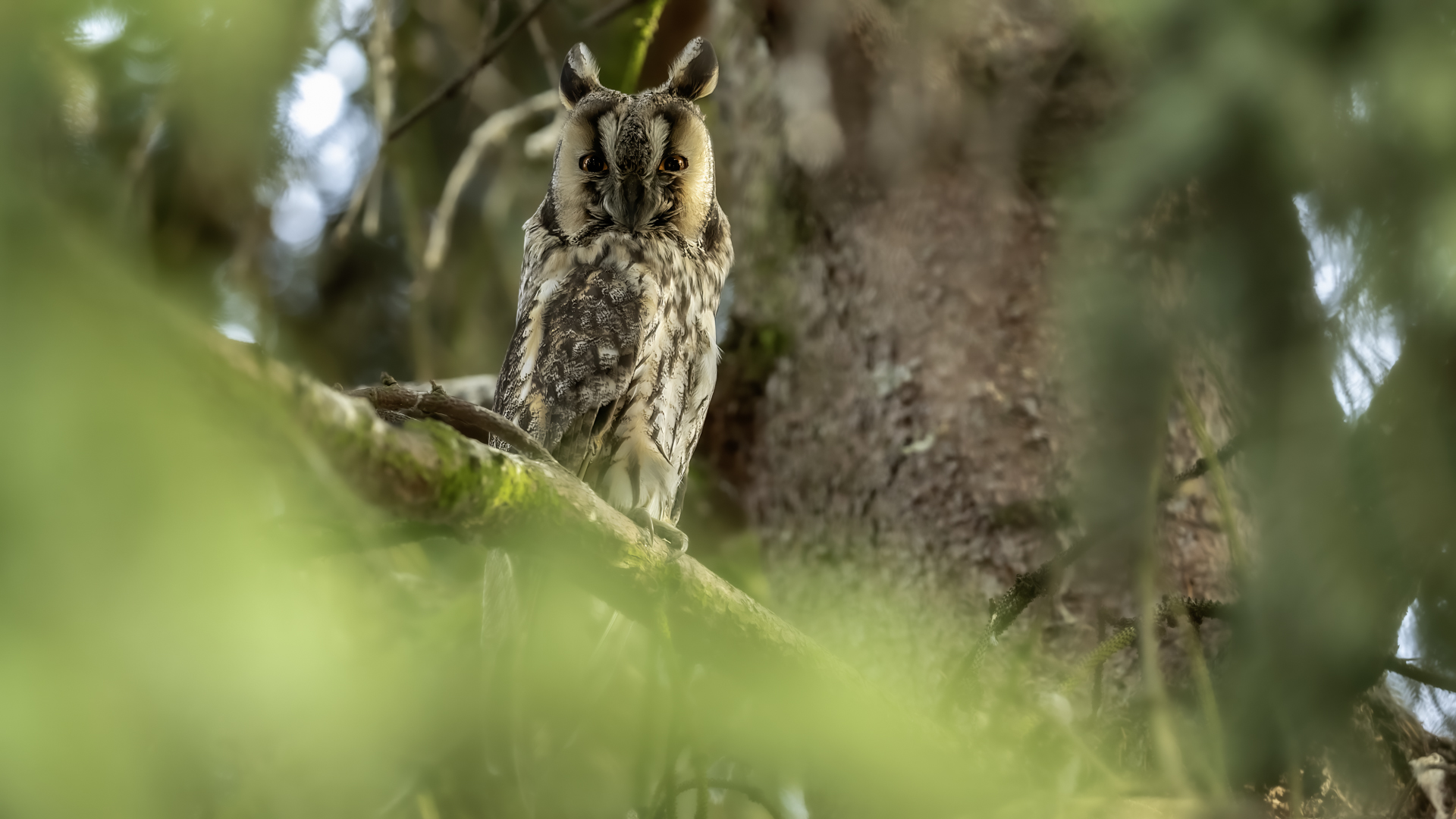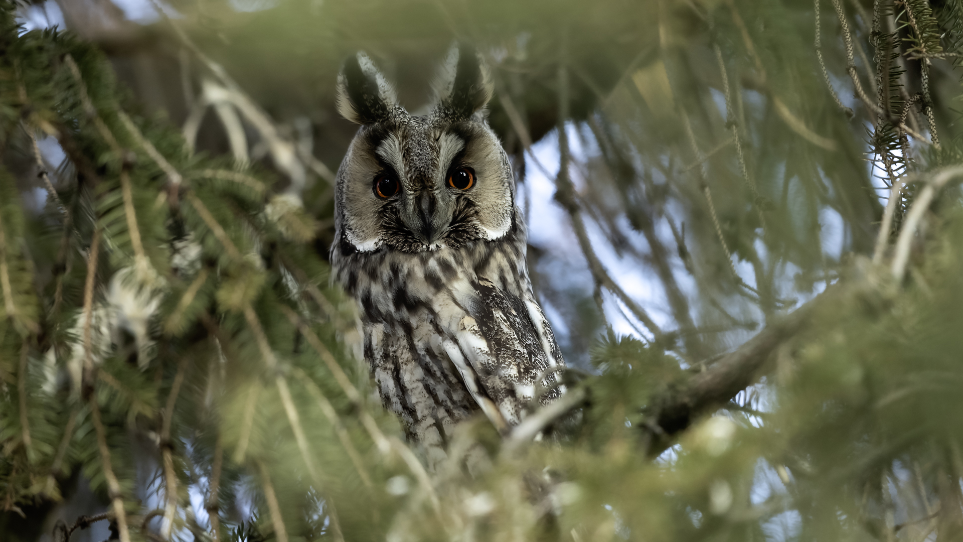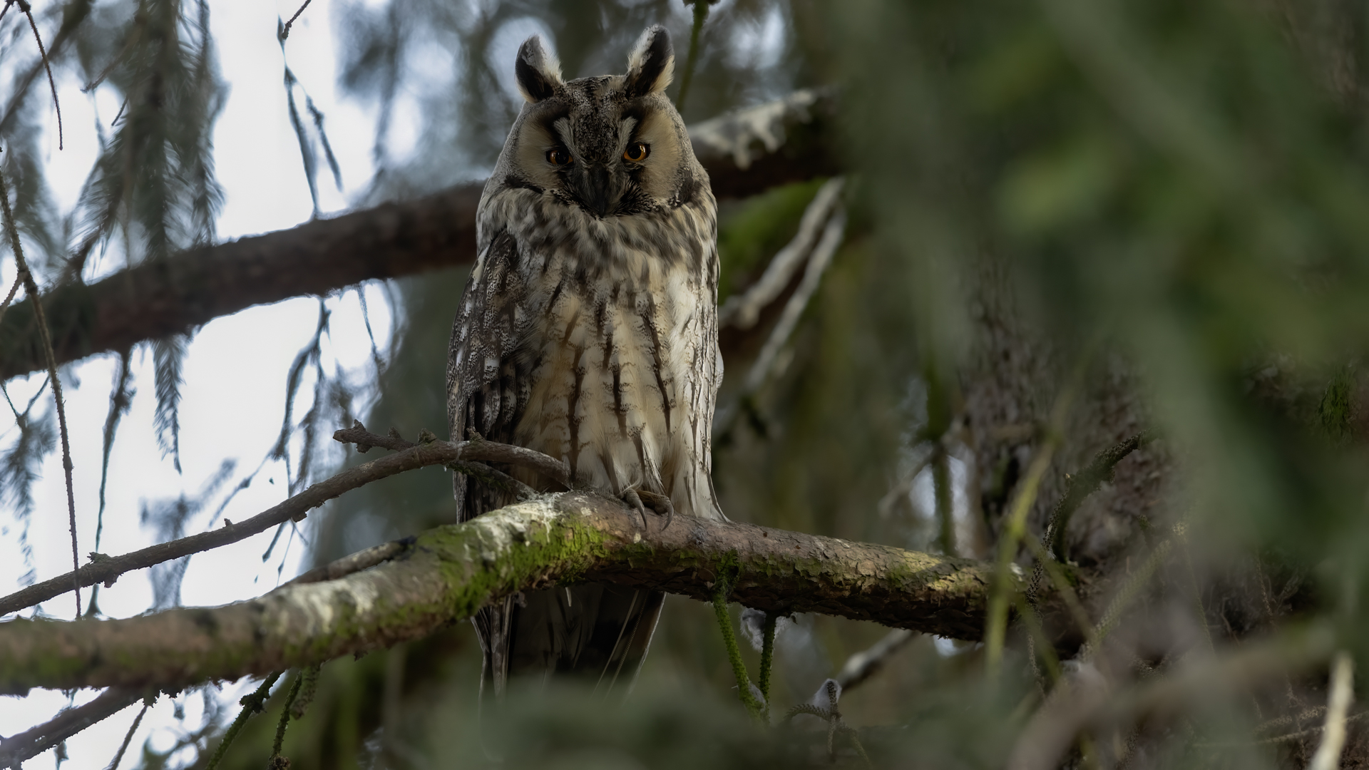 Kolejny gatunek sowy trafia do mojej galerii, a to za sprawą zwyczajnej ludzkiej życzliwości i spontaniczności (Sławek dziękuję za podpowiedź i pozdrawiam, bo w naszych czasach o życzliwość i wspólne podziwianie naszej ptasiej fauny wśród fotografów przyrody coraz trudniej, zastępuje ją często źle pojmowana rywalizacja i współzawodnictwo. Niestety, takie czasy). A miejsce w którym sfotografowałem uszatki wręcz szokuje. Dość ruchliwa ulica przy której na sosnach nie zwracające na ruch kołowy, przechodzących ludzi siedzą uszatki w koronach drzew. Niesamowite wrażenie patrząc na dotychczasowe moje doświadczenia w fotografowaniu ptaków w Polsce. Sowy, a było ich sześć, spały i cała trudność w ich fotografowaniu polegała na wyczekaniu momentu w którym sowa obróci głowę, aby móc sfotografować jej piękne rubinowe oczy, no i uwiecznić uszatkowe uszy. Miejsce także jest niesamowite pod względem życzliwości mieszkańców. Widząc statyw, obiektyw podchodzili i wypatrywali sowy w koronach drzew, aby pomóc w fotografowaniu. Kto wie, może obecność sów pozytywnie wpływa na ludzi? Podobno w okresie zimowym może być ich tam nawet kilkanaście. Sowy uszate osiągają wagę nieco większą od 0,25 kilograma, a rozpiętość skrzydeł nie przekracza metra. Pewnie trzeba będzie w okresie zimowym wrócić to niesamowite miejsce i dodać do galerii zdjęcia w zimowej scenerii, no i z lepszym światłem, bo tym razem nie dopisało.