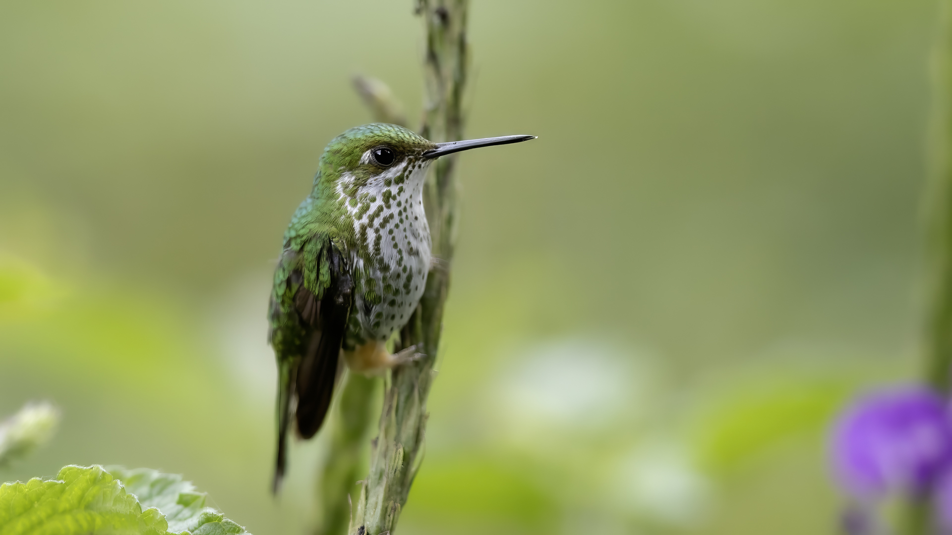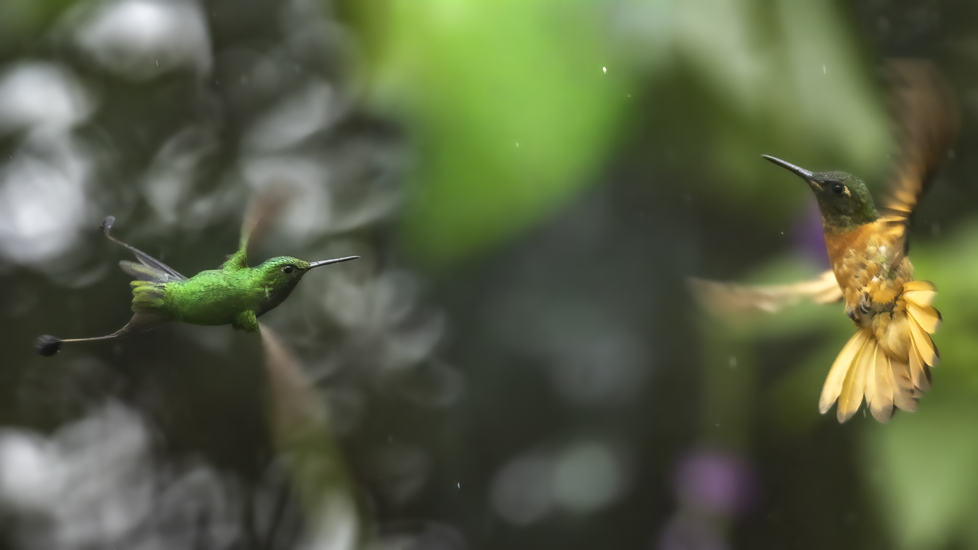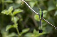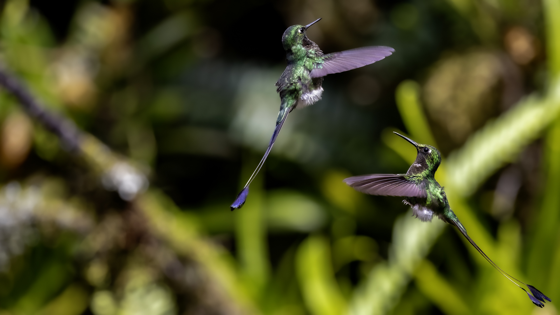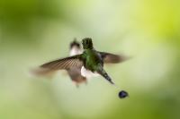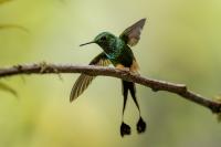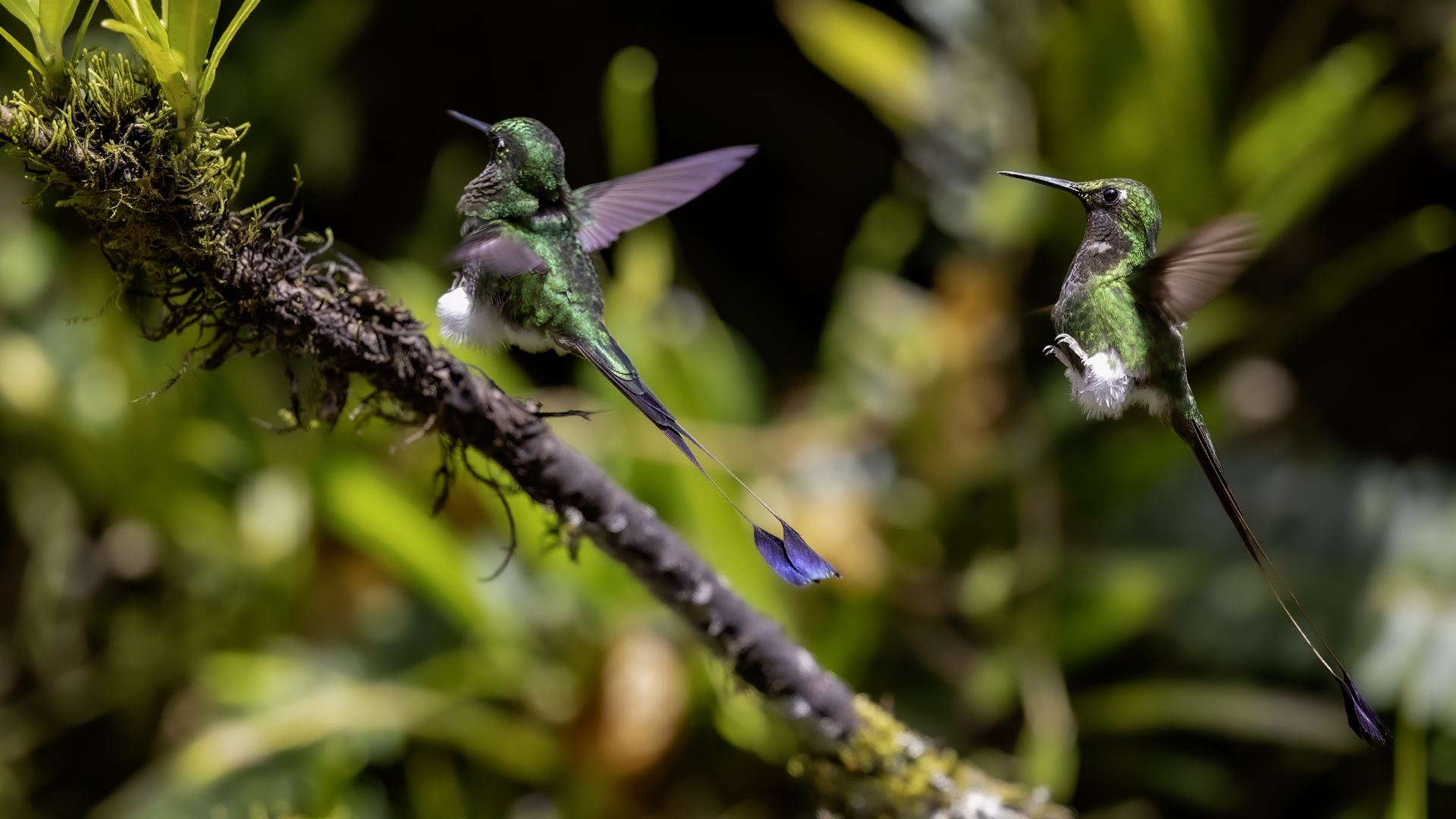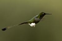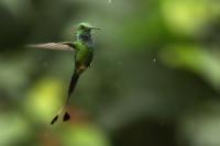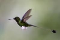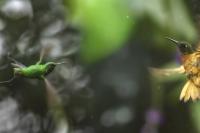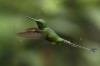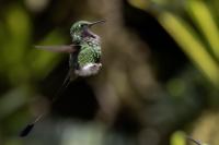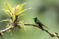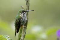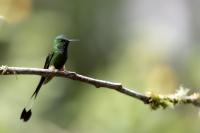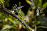 Według książki Milesa McMullana „The Guide to the Hummingbirds” na świecie żyje od 330 do 360 gatunków kolibrów i aż 129 gatunków z nich w Ekwadorze. Kolibry występują od Alaski w Ameryce Północnej po południe Ameryki Południowej. A więc na dwóch potężnych kontynentach, a na niewielkim w porównaniu z tym obszarem, powierzchni Ekwadoru jest tam ponad 30 procent gatunków kolibrów. Są rzeczywiście niemal wszędzie w Ekwadorze, a przynajmniej podczas całego naszego pobytu, dało się je codziennie zaobserwować. Przydrożne restauracje prawie zawsze mają poidełka kolibrowe. W oczekiwaniu na posiłek nigdy się nie nudziliśmy bo w tym czasie zawsze coś się działo przy karmnikach i powstawały zdjęcia. Kontakt z naturą jest tak bliski, że w jednym z takich miejsc zrobiliśmy sobie przerwę na obiad i jedząc zupę nieopodal poidełek kolibrowych, jeden z kolibrów usiadł mi na przedramieniu i obserwował co robię. Niesamowite spotkanie, niesamowity kontakt z przyrodą.  Jeszcze w innym miejscu stoję na wprost poidełka dla kolibrów, niemal w bezruchu próbując zdobyć dynamiczne zdjęcie kolibra, podczas gdy inny chciał sprawdzić czystość mojego ucha. Zapewniam, że to niemiłe uczucie słyszeć centymetr, dwa od ucha świst jego piór i mieć świadomość, że wsunie do ucha swój długi dziób. Trzeba się powstrzymać od odruchu, jaki towarzyszy w takiej sytuacji w przypadku komara, czy muchy, a więc machnąć energicznie ręka. To mogło by być śmiertelne dla kolibra. Wystarczy energicznie ruszyć głową i ptak odleci. Trzymając w takich miejscach w ręce kwiat, można liczyć, że koliber na niej usiądzie i sprawdzi, czy nie ma tam czasami smacznego nektaru. Nakręciliśmy takie krótkie filmy i wysłaliśmy je do Polski „z pozdrowieniami” z Ekwadoru. Czy może być piękniejsza „pocztówka” z pozdrowieniami z wakacji? Mimo bliskiego kontaktu z kolibrami fotografowanie do łatwych nie należy. Nie myślę  tu o zdjęciach pijących kolibrów z plastikowych pojemników lub siedzących na nich. Myślę o dynamicznych zdjęciach w locie tych niesamowitych podniebnych akrobatów. Samo fotografowanie warto, aby było poprzedzone krótką obserwacją gatunków tam występujących. Często się zdarza, że któryś z nich jest gatunkiem dominującym, bardzo terytorialnym i zachowuje się w charakterystyczny, przewidywalny sposób. Te gatunki zawsze łatwiej fotografować. Podlatują one czasami na kilka centymetrów od poidła, zawisają na sekundę, dwie, trzy w powietrzu, upewniają się, że jest bezpiecznie, po czym zaczynają swój słodki posiłek. Ten moment to sytuacja w której mogą powstać dynamiczne zdjęcia. Podobnie jak z kwiatami usytuowanymi w pobliżu dotychczasowych poideł. Ptaki zawisają przy nich i spijają sztucznie zostawiony tam słodką wodę. To te przewidywalne gatunki. Są jednak taki, które nagle wylatują z krzewów prosto do poidła, posilają się i tak szybko jak się pojawiły, tak szybko znikają. Z tymi człowiek prawie nie ma szans. Podobnie jak powietrzne kłótnie, potyczki kolibrów. Są tak szybkie, tak synchroniczna poruszanie się dwóch osobników, że można poprzestać tylko na obserwacji. Sfotografowanie takiej kłótni to czysty przypadek. Ostatecznie udało się sfotografować 41 gatunków kolibrów podczas całej wyprawy do Ekwadoru. Wszystkie mają zamieszczony niniejszy tekst, a jedynie Gigancik i Górzak fioletowogłowy, mają tekst rozszerzony o indywidualne informacje. Zaznaczyłem to jako podwójne T-„TT”.