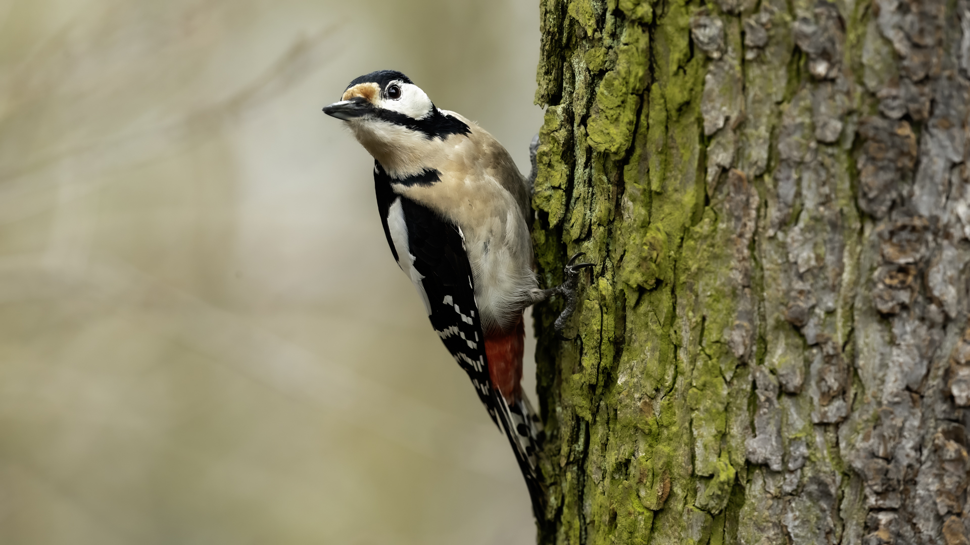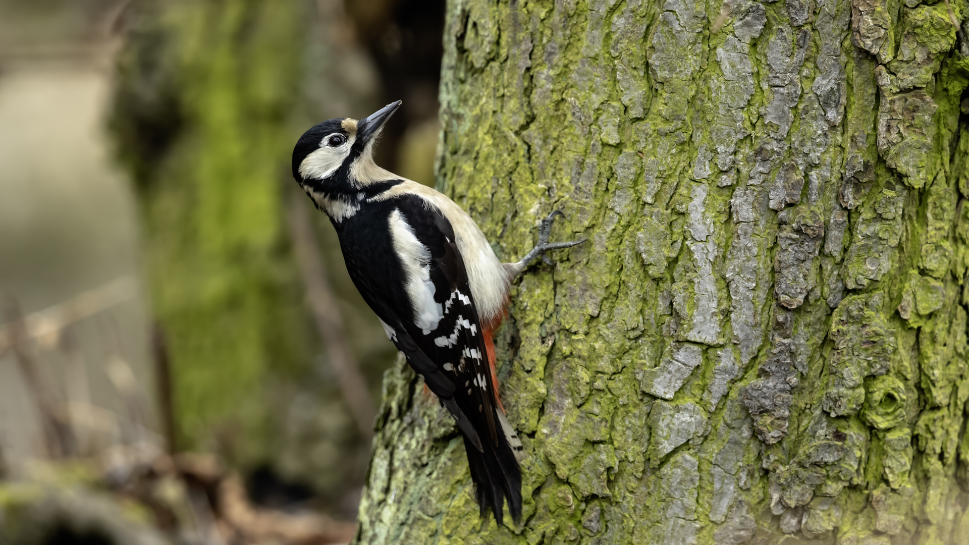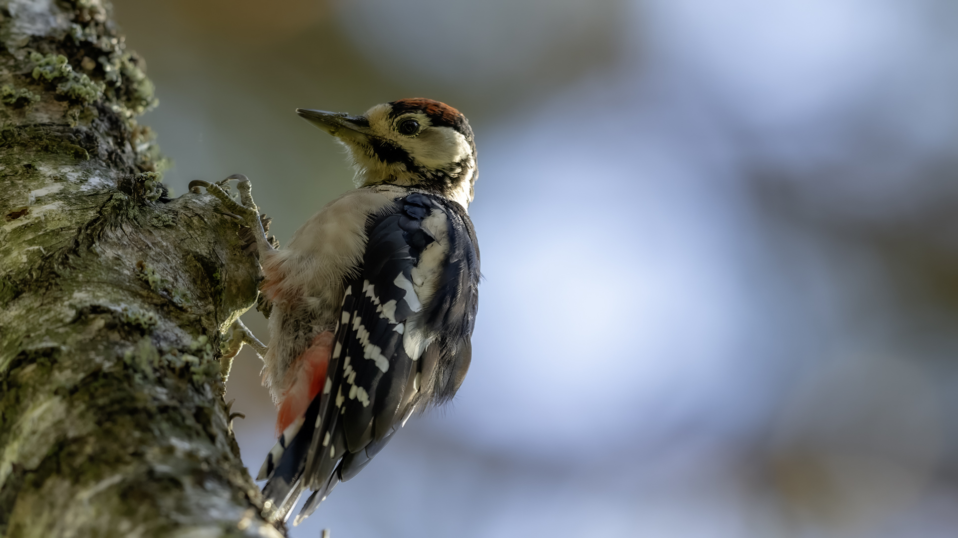 Dzięcioł duży to chyba najliczniej występujący dzięcioł w naszym kraju. Fotografowanie go z pewnej odległości nie nastarcza trudności, problem pojawia się, gdy chcemy wykonać zbliżeniowe, wręcz anatomiczne zdjęcia. Tu dzięcioły nie są już tak ufne i przyjazne, odlatując na bezpieczną dla nich odległość. Tak naprawdę siedziałem zamaskowany i czekałem na bobrzą rodzinę z nadzieją na sfotografowanie dzięcioła czarnego. Przy ostatniej zasiadce dało się wykonać kilka zdjęć dzięciołów czarnych i nagrania ich dźwięków. Tym razem zamaskowanie było dużo lepsze, a efekty odwrotnie proponcjonalne do wkładu pracy w maskowanie. Nie dość, że nie udało się sfotografować bobrów to dzięcioł czarny przeleciał kilkukrotnie nie siadając ani na chwilę w polu mojego widzenia. I aby nie było całkowitego „bezrybia” z odsieczą przyleciały raniuszki i dzięcioł duży. Usiadł kilka metrów przed czatownią, na brzozie z której spokojnie wybierał owady. Szkoda, że stosunkowo wysoko się usadowił, bo fotografowanie w górę nie należy do ulubionych moich kadrów, nie mówiąc już o odbiorze takich zdjęć. Ale cóż, dobrze że się pojawił, bo są to chyba najlepsze moje zdjęcia dzięcioła dużego, a może to tylko emocje i radość z nowo zrobionych zdjęć?