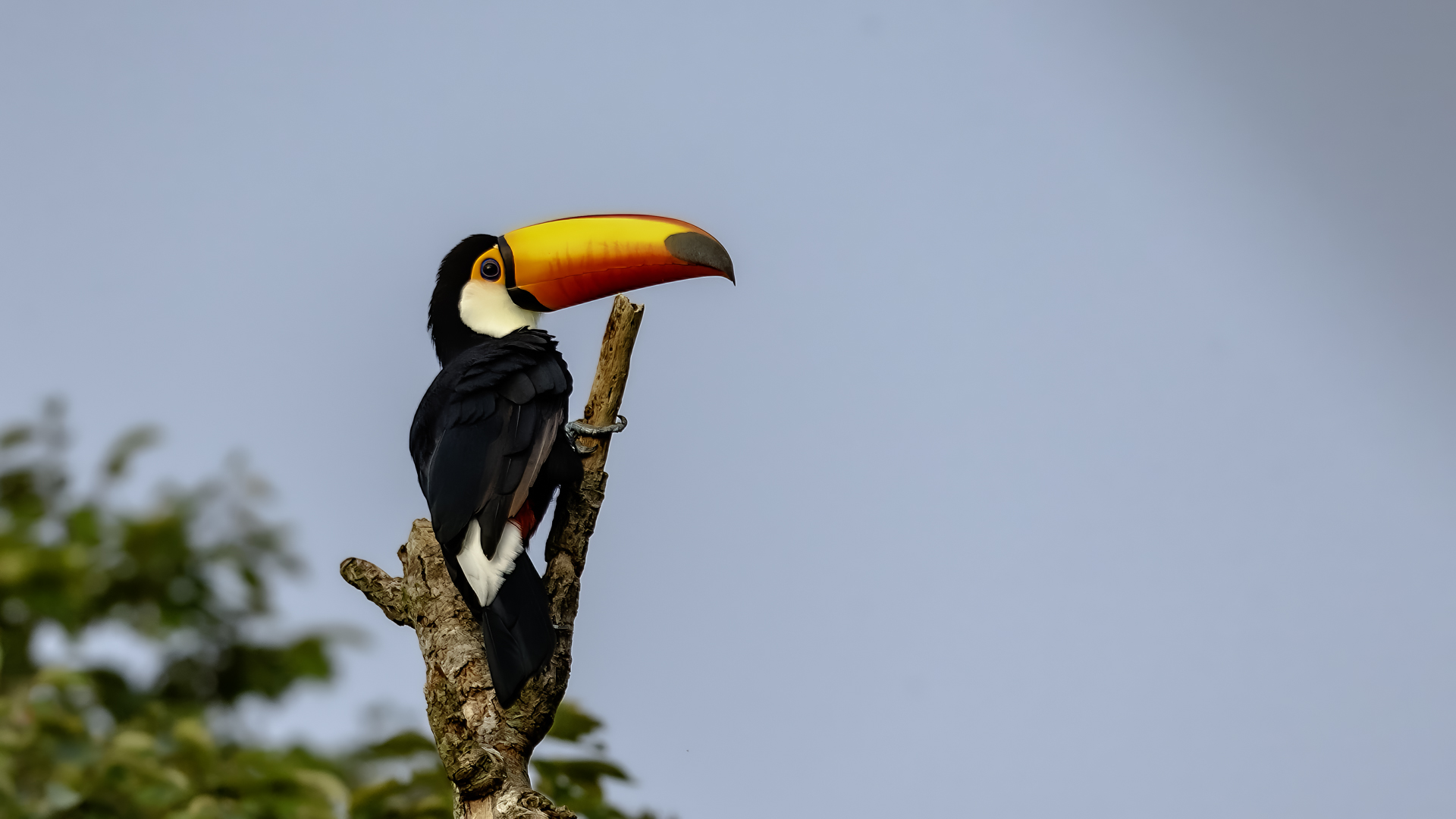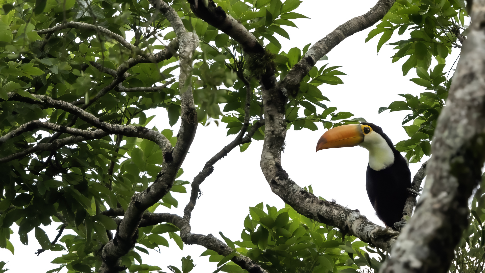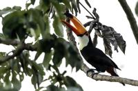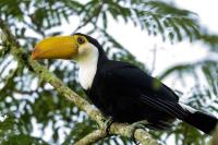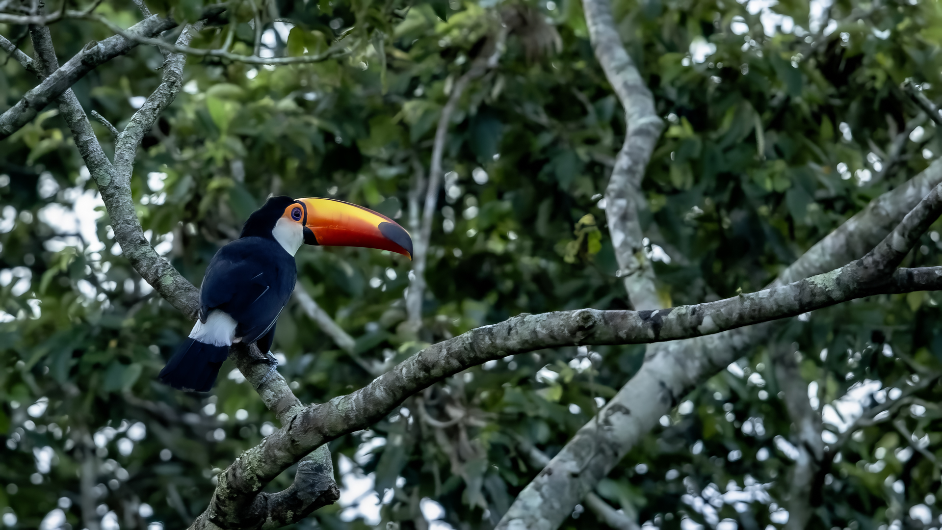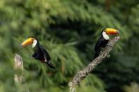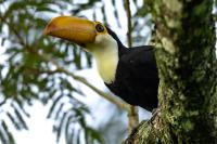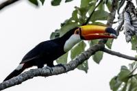 Niesamowity piękny ptak, niesamowite spojrzenie i wyróżniający go z grona innych ptaków potężny dziób. Tukany fotografowałem o wschodzie słońca niedaleko wodospadu Iguazú. Huk spadającej wody był wszechobecny. Tukany pojawiły się dosłownie na kilkadziesiąt minut. Było ich około 10-ciu. Powoli się do nas przybliżały, by po chwili odlecieć na żerowiska położone w lesie deszczowym. Musiały spać w lasach niedaleko wodospadu, a my stanęliśmy im w przelocie, a właściwie przemieszczaniu się na drodze na śniadanie. Tukany powoli penetrowały korony drzew w poszukiwaniu pożywienia. Przeskakiwały z gałęzi na gałąź lub przelatywały niewielkie odległości pomiędzy drzewami. Dzięki tylko takiemu spokojnemu zachowaniu, mogło powstać tyle prezentowanych zdjęć. Będąc popołudniu w lesie deszczowym widziałem tukany wielkie oraz drugi gatunek tukana, jaki udało mi się sfotografować – arasari brązowouchego. Ten drugi gatunek, prawie zawsze jednak na tle nieba i ze znacznie większej odległości. No cóż, te kilkadziesiąt minut obcowania z tukanami wielkimi zaowocowało powstaniem prezentowanej galerii, a wrażenie i emocje tak duże, że tekst związany z tym ptakiem, staje się tekstem wprowadzającym do argentyńskich galerii na mojej stronie. Tukan wielki, jest największym spośród żyjących tukanów w Ameryce Południowej. Waga jego ciała to niespełna kilogram (około 800-900 gramów). Samice znacznie mniejsze, ważą około 0,5 kilograma. Wyróżniający go potężny dziób mierzy około 20 centymetrów. Tukany należą do rodziny dzięciołowatych i żywią się głównie owocami.
