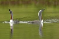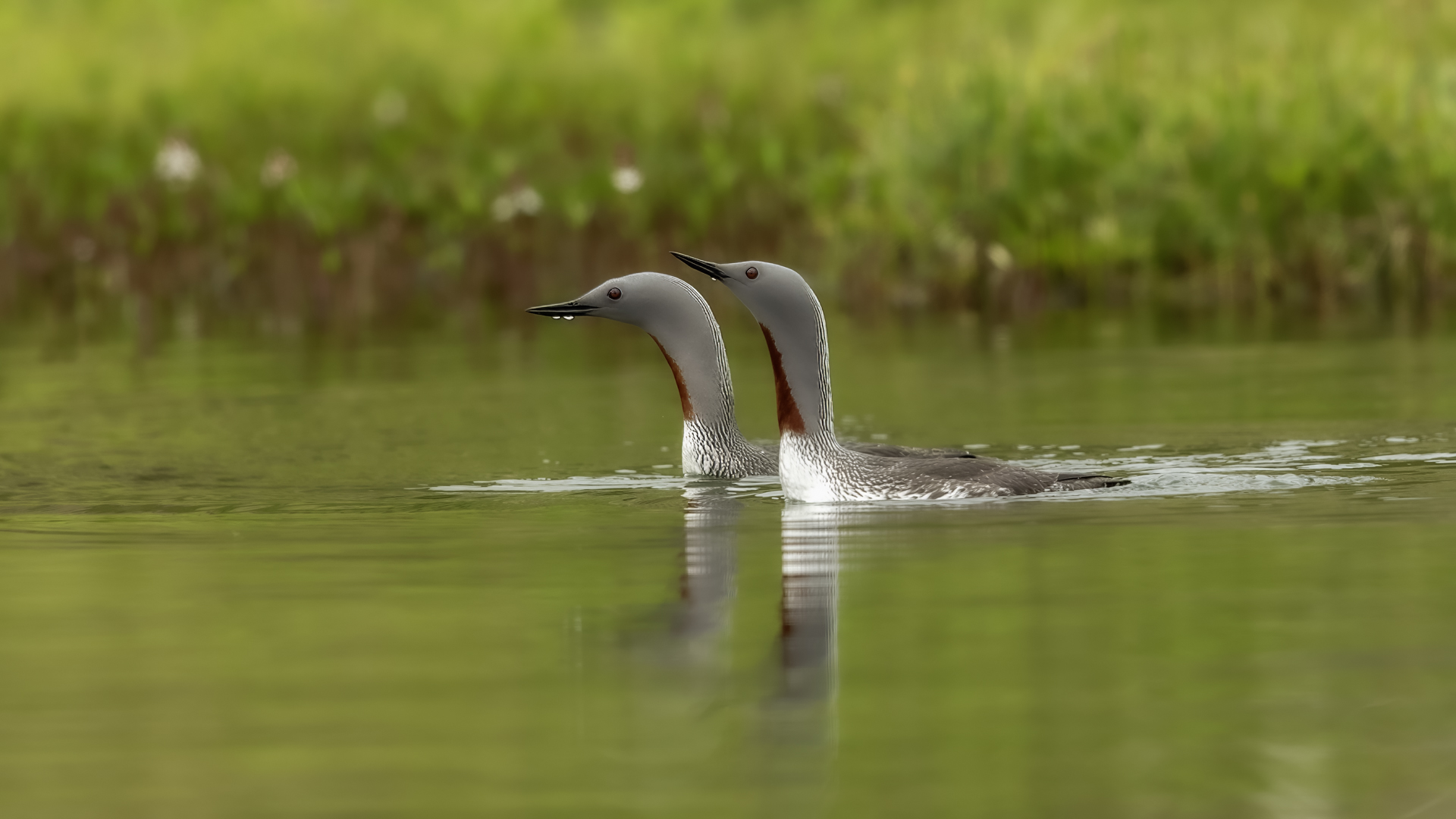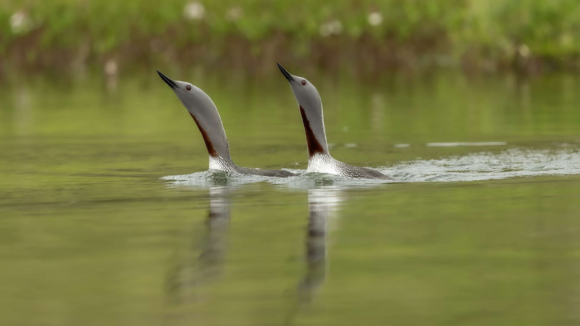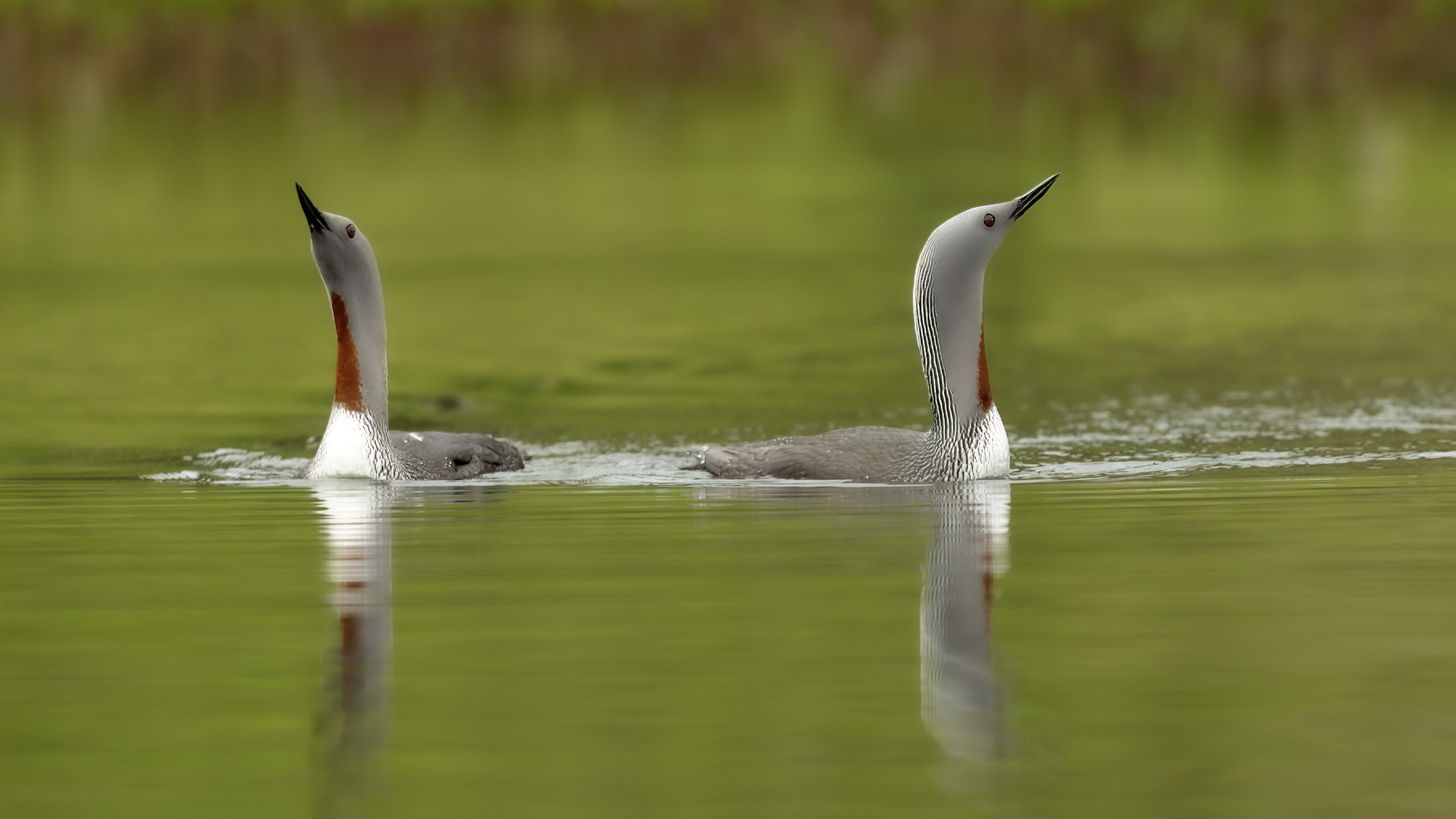 Przejechaliśmy niewielki most, z którego widać było siedzące po lewej stronie kamieniuszki, a po prawej nury rdzawoszyje. A że kamieniuszki dla mnie to nowy gatunek zaczynam fotografowanie od nich, powoli się zbliżając. Po krótkiej sesji z kamieniuszkami przechodzę drogę i próbuję tego samego z nurami. Mocno zgarbiony, bardzo nieśmiało i powoli zbliżam się do nurów. Są nieco zaniepokojone, ale nie uciekają. Miejsce malownicze, bo zakręt średniej wielkości rzeczki, odbicia na wodzie raz nadają wodzie niebieską barwę, raz zieloną. Kilkadziesiąt minut zabrało mi podejście do nurów. Usiadłem naprzeciwko i fotografowałem je jak przepływały kilkadziesiąt metrów to w lewo, to w prawo. Podczas ich nurkowania przechodziłem szybkim krokiem za nimi, tak aby podczas ich wynurzenia siedzieć znów nieruchomo blisko nich. Były zdziwione, ale nie uciekały, mało tego, kilka razy podpłynęły tak blisko, że nie mieściły się w kadrze. Niesamowite wrażenia z takiego obcowania z takimi ptakami. Wykonałem wiele zdjęć i pomyślałem, że czas nagrać ich głos. Tu duże zaskoczenie, bo zapomniałem zabrać mikrofon z samochodu. Bardzo powoli, aby ich nie denerwować i nie spłoszyć oddalałem się w kierunku samochodu. Zmontowałem zestaw do nagrywania i powoli zbliżam się do nurów ponownie. Niesamowite, obydwa bacznie mnie obserwowały i nie uciekały, pływały w pobliżu. Zaczynam nagrywać. Niestety nie są tak dynamiczne pod kątem wydawania dźwięków, jak lodowce. Siedzę na brzegu rzeki, na wprost dwa nury rdzawoszyje w odległości kilkunastu metrów, i obserwujemy się wzajemnie. Myślałem przez chwilę, że to nie może się dziać naprawdę. W Polsce, bez czatowni, maskowania nie da się wykonać taaaaaaakich zdjęć i być tak blisko fotografowanego dzikiego ptaka. Ale to przecież mało zaludniona Islandia, gdzie jest większa tolerancja dla człowieka ze strony dzikiej przyrody. Siedzimy na wprost siebie, z tą różnicą, że ja chcę nagrać ich odgłosy. Mija kilkadziesiąt minut i wreszcie kilka „westchnień” nura udaje się nagrać. Dobrze, bo w tak skulonej pozycji, w bezruchu trudno by było wytrzymać dłużej. Ale to nie wszystko z niesamowitych spotkań na Islandii i w dodatku z tym niesamowitym gatunkiem ptaka. Drugie spotkanie, chyba było jeszcze bardziej ekscytujące. Mały staw, 10 metrów od niego droga asfaltowa, zatrzymujemy samochód i widzimy parę nurów. Jeden siedzi na gnieździe, drugi pływa w pobliżu. Bardzo powoli podchodzę nad brzeg, kładę się na wprost gniazda i fotografuję nura na tafli wody czyszczącego swoje upierzenie. Mija jakieś pół godziny i byłem świadkiem zmiany w opiece nad gniazdem ptaków. Ptak po zejściu z wysiadywania zanurkował i wypłynął w pobliżu partnera. Wykonali przepiękne synchroniczne pływanie po torze w kształcie litery S po czym oddalili się od siebie o około metr i także synchronicznie rozpostarły skrzydła. Niestety ptaki były tak blisko mnie, że tylko jednego dało się uwiecznić w kadrze i połowę drugiego. Było to coś niesamowitego, przepięknego, powstawały dziesiątki zdjęć i pomyślałem, że trudno czegokolwiek więcej oczekiwać. A tu proszę, ptak początkowo czyścił swoje upierzenie, po kilkunastu minutach wzbił się w powietrze na moich oczach. Startował z odległości kilkunastu metrów ode mnie, a więc nie było problemów z wykonaniem całej sekwencji ze startu ptaka. Z opisywanych spotkań powstało tak wiele zdjęć, że trudno było się zdecydować na ostateczną wersję galerii. Zobaczcie sami moje bliskie spotkania z nurami rdzawoszyimi na Islandii….