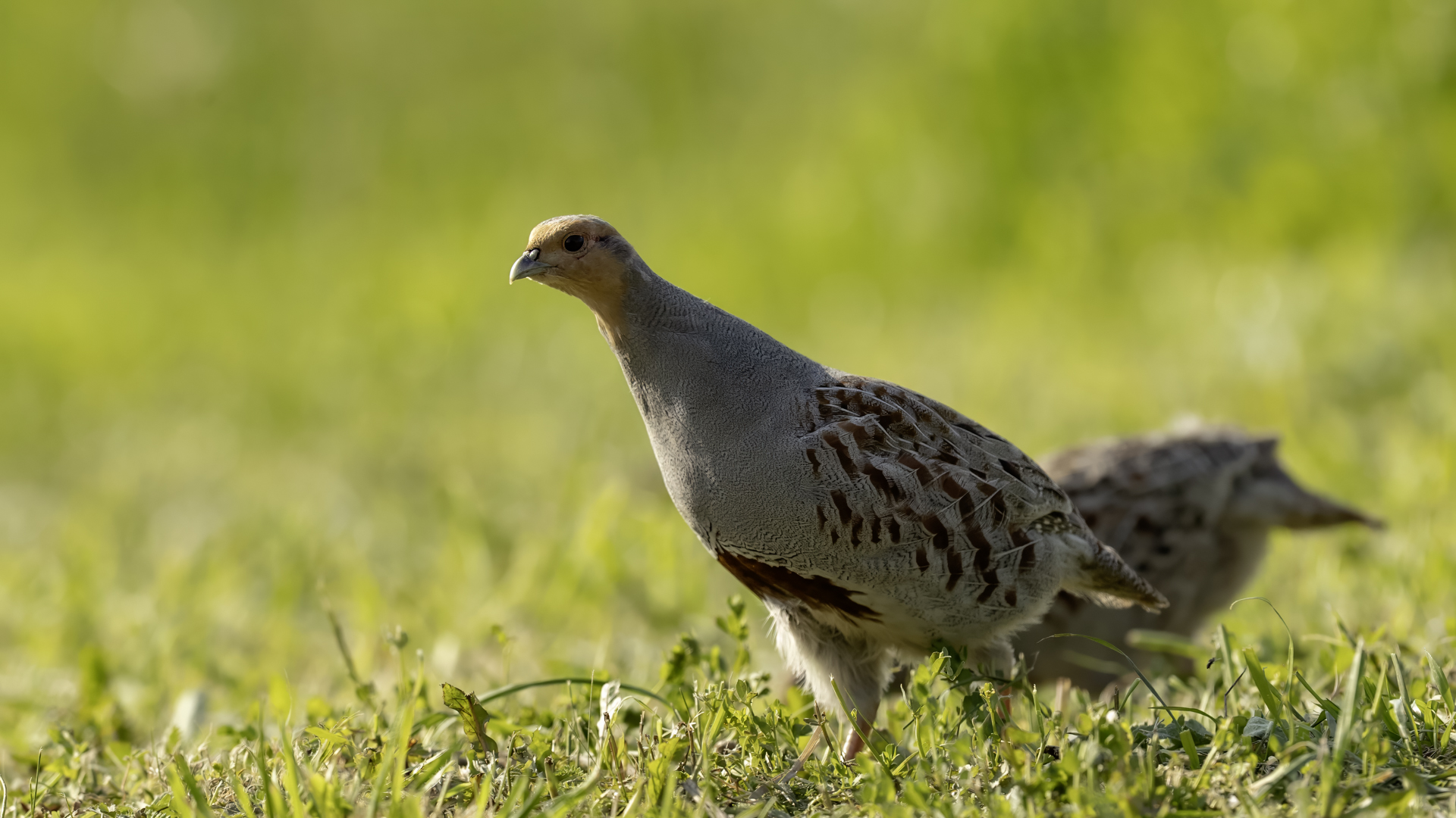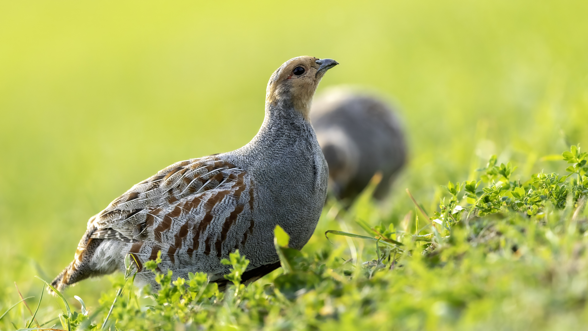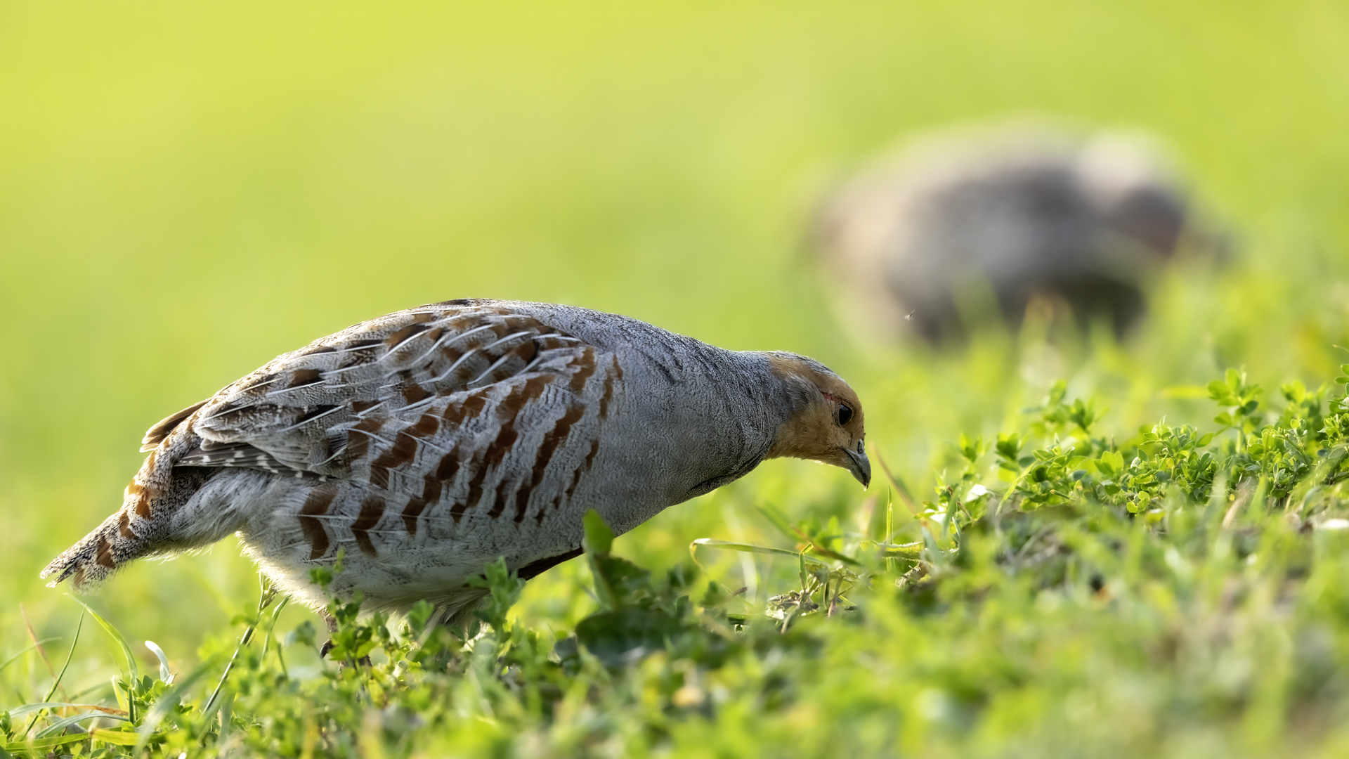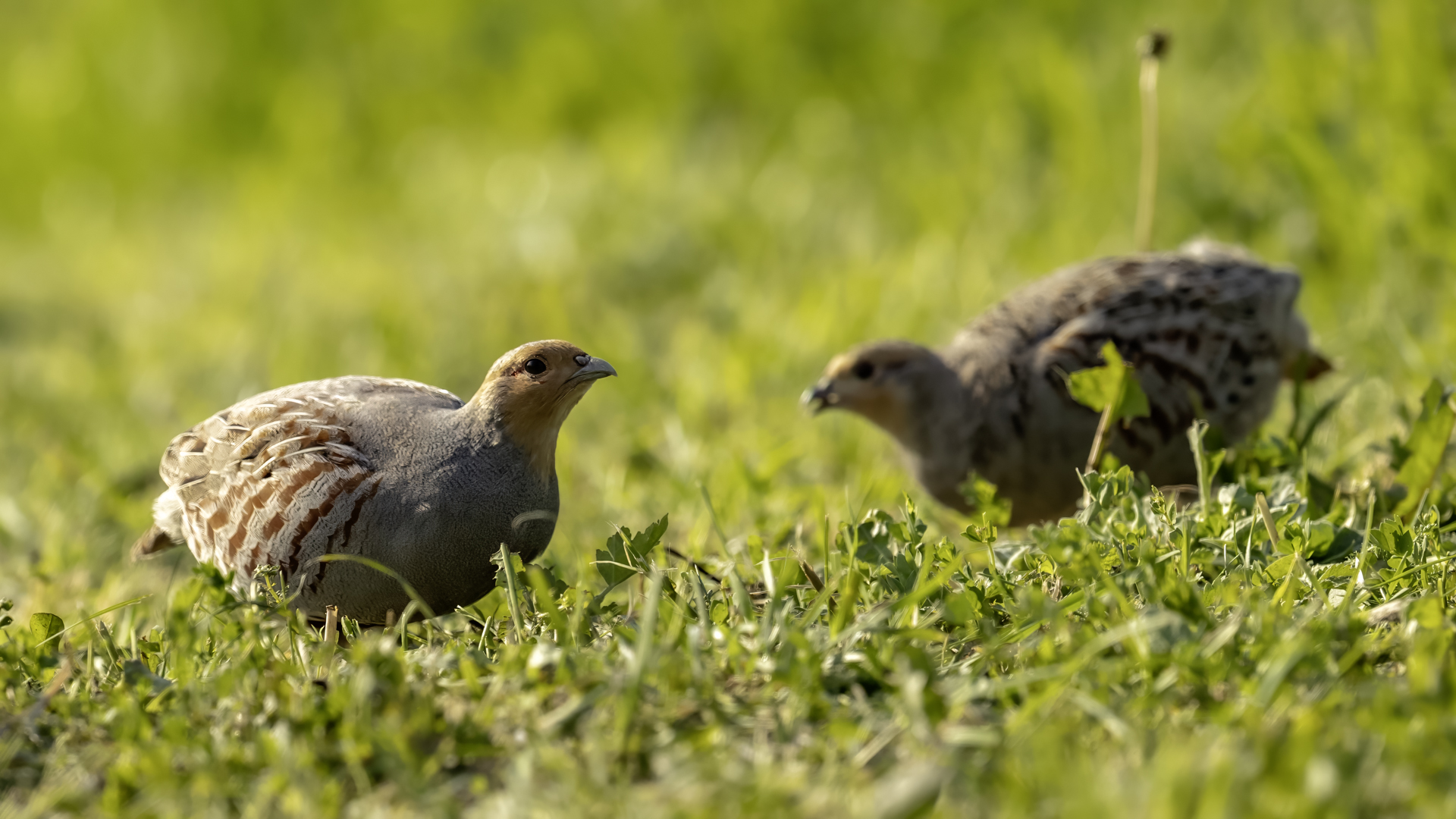 Dwa powroty w miejsce, gdzie fotografowałem pierwszy raz kuropatwy, nie zakończyły się jakimś spektakularnym sukcesem zdjęciowym. Ale prawie półtorej godziny obserwowania kuropatw dało okazję do poznania ich zachowań. Zawsze jeden z ptaków monitorował otoczenie wypatrując niebezpieczeństw. Obserwacja dwóch żerujących ptaków była rzadkością. Najczęściej samiec stał na straży, a samica posilała się lub ucinała sobie krótka drzemkę. Niestety i tym razem odległość była znaczna i bez konwerterów się nie obyło. Do tego mocno żółte poranne oświetlenie też nie ułatwiało powstania lepszych zdjęć. Ważne, że wiadomo gdzie wrócić, i oby kuropatwy nie zmieniły swych zwyczajów...