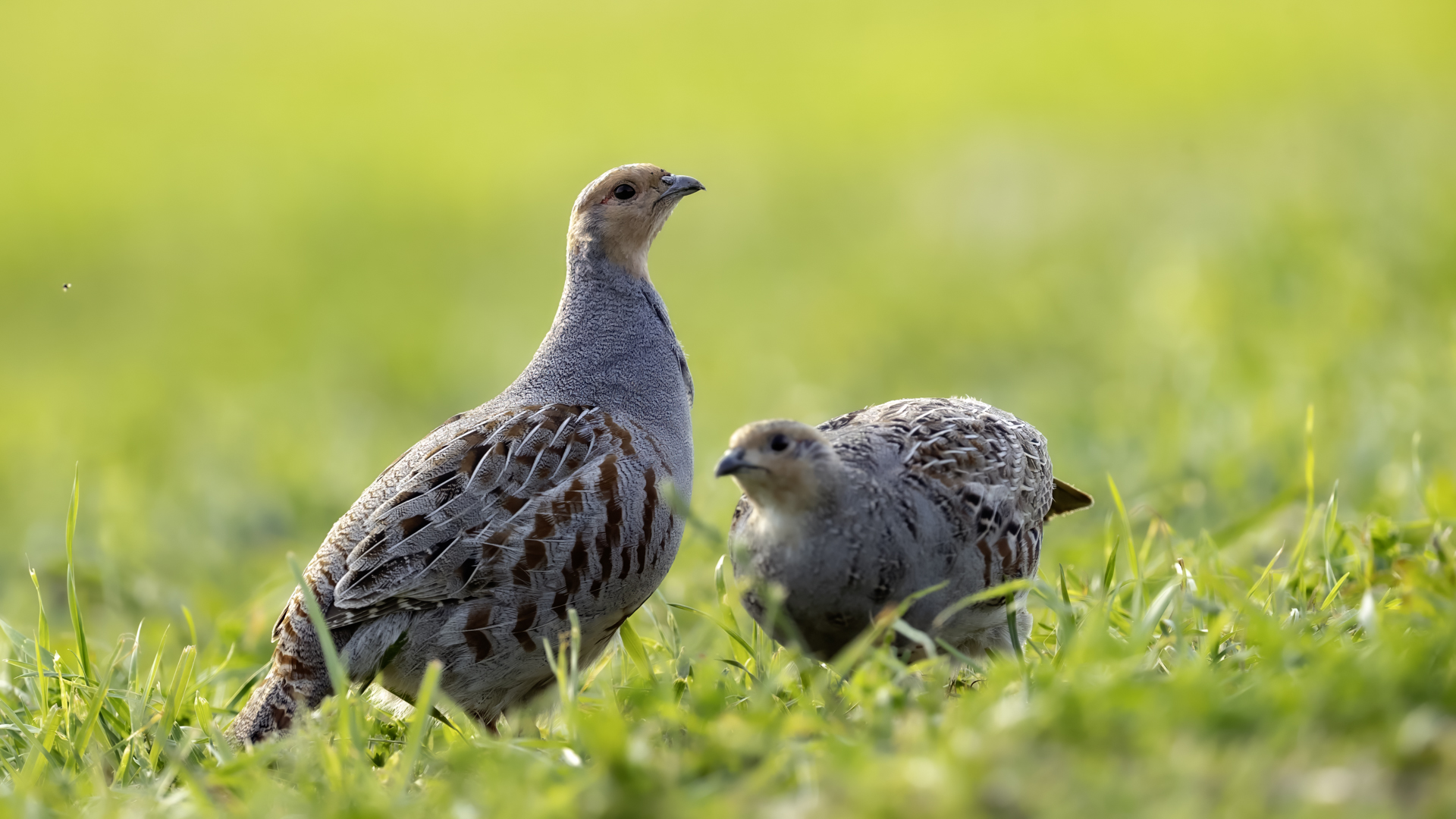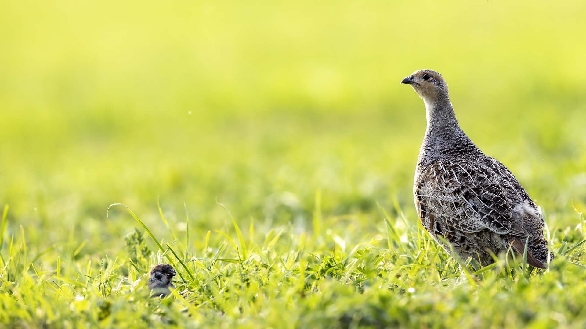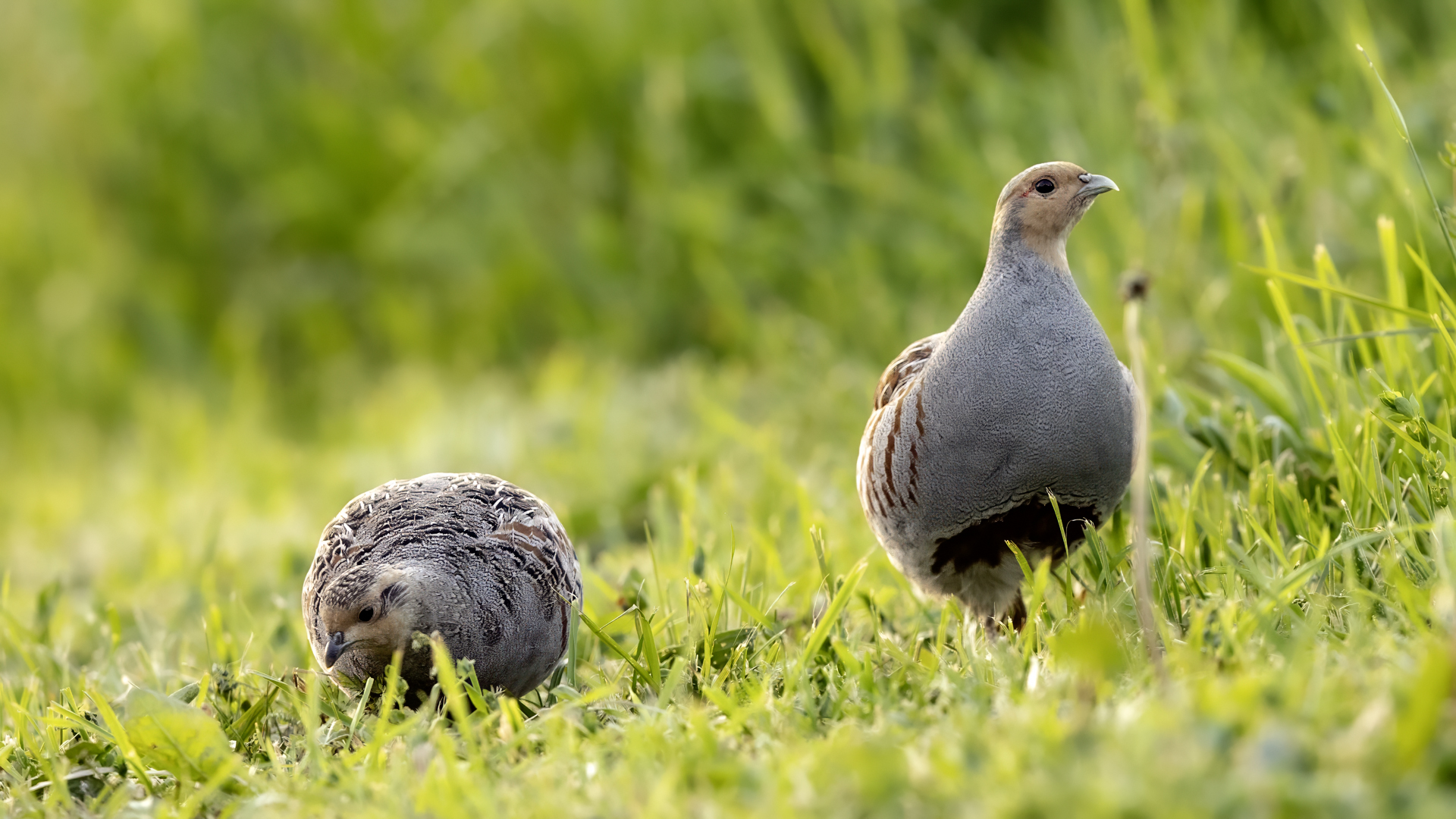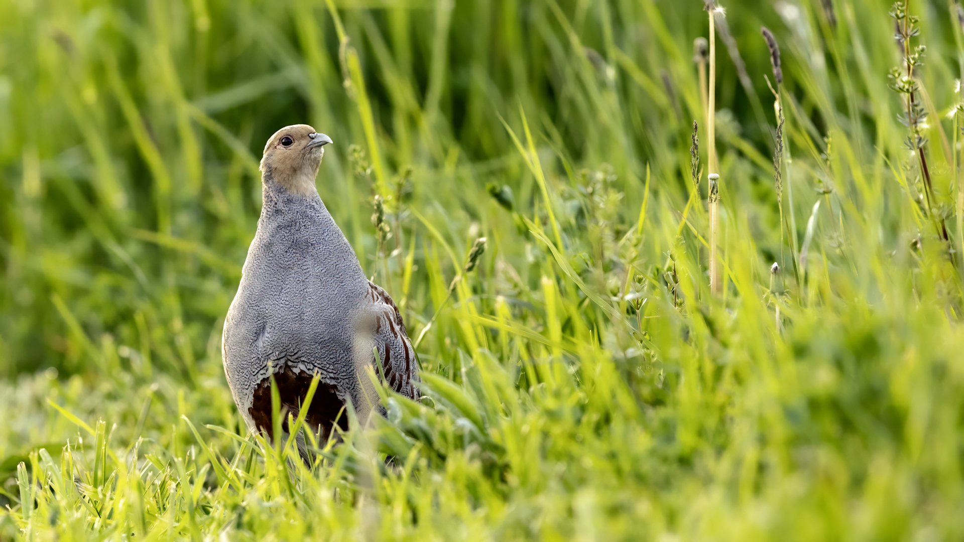 Dwa powroty w miejsce, gdzie fotografowałem pierwszy raz kuropatwy, nie zakończyły się jakimś spektakularnym sukcesem zdjęciowym. Ale prawie półtorej godziny obserwowania kuropatw dało okazję do poznania ich zachowań. Zawsze jeden z ptaków monitorował otoczenie wypatrując niebezpieczeństw. Obserwacja dwóch żerujących ptaków była rzadkością. Najczęściej samiec stał na straży, a samica posilała się lub ucinała sobie krótka drzemkę. Niestety i tym razem odległość była znaczna i bez konwerterów się nie obyło. Do tego mocno żółte poranne oświetlenie też nie ułatwiało powstania lepszych zdjęć. Ważne, że wiadomo gdzie wrócić, i oby kuropatwy nie zmieniły swych zwyczajów...