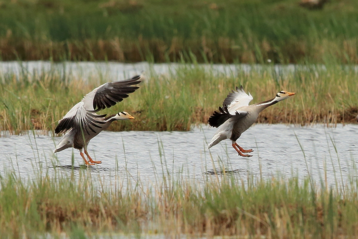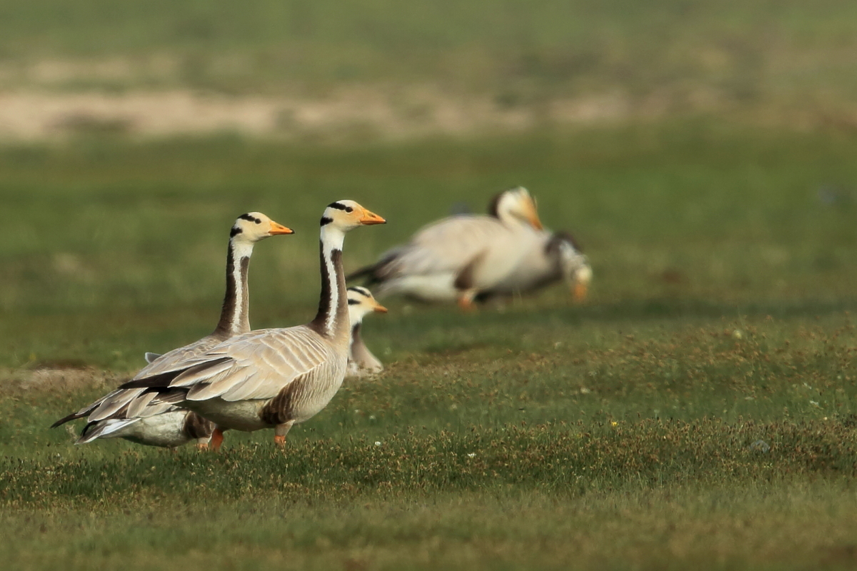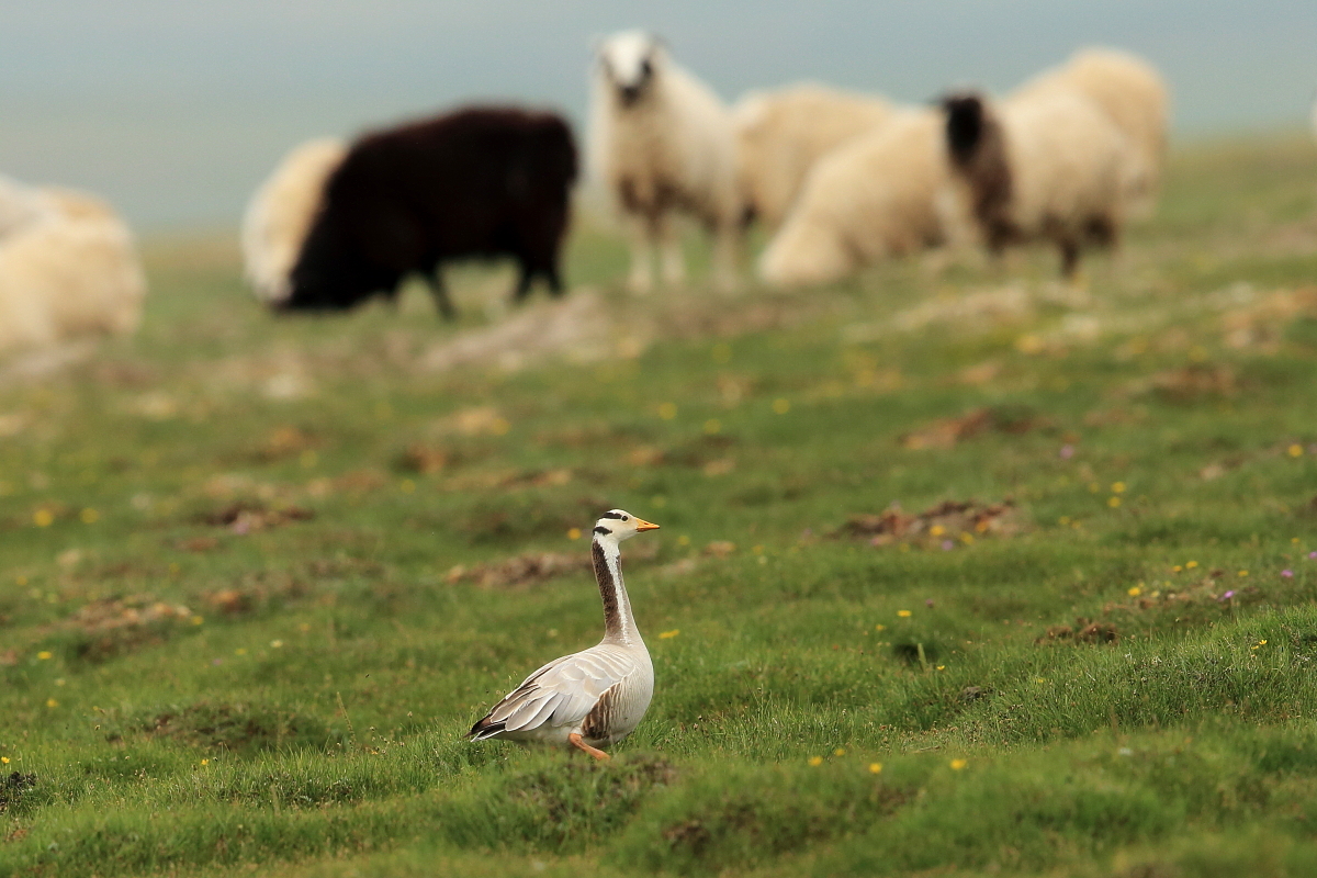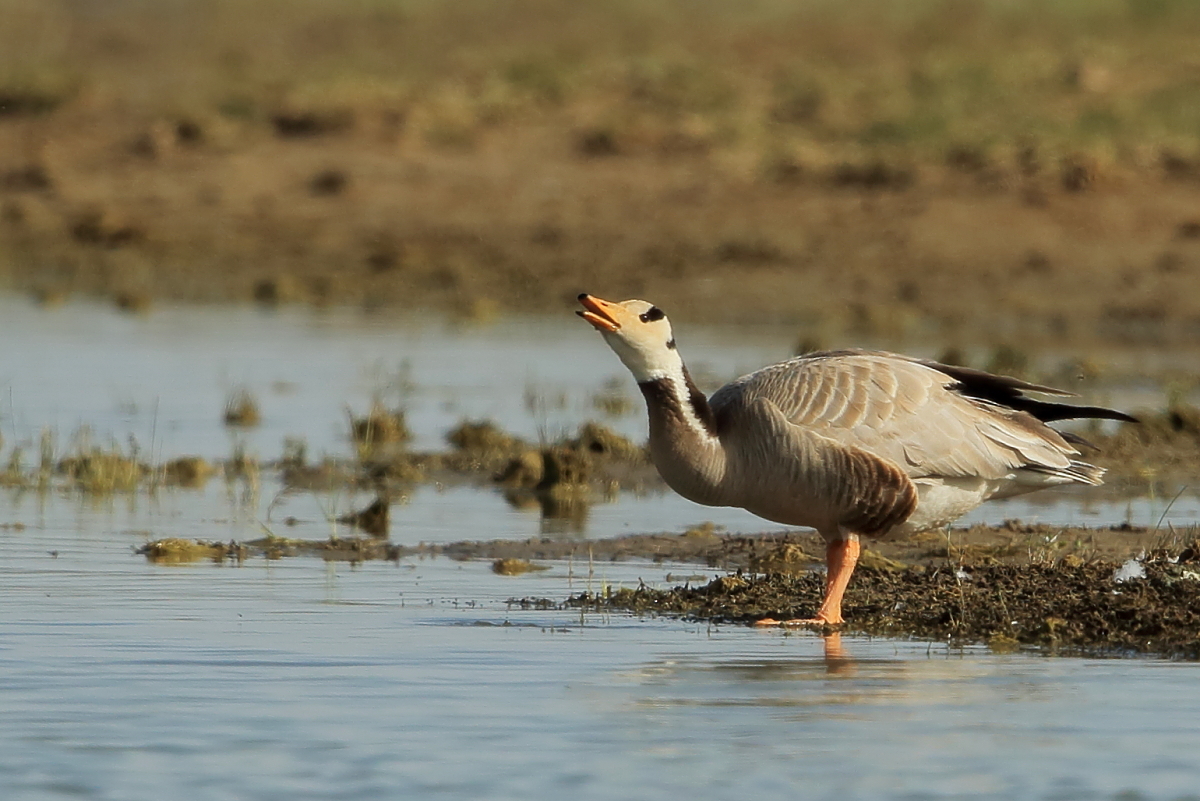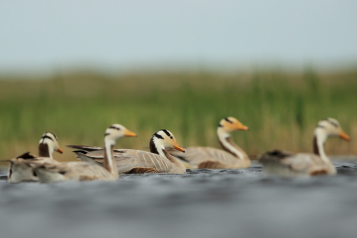 We saw bar-headed geese on several occasions during our trip. We could observe them near water, often in the company of ruddy shelducks and Mongolian herring gulls. We never saw single specimens, but always small flocks numbering several or a dozen or so specimens. The best pictures were taken on a little pond, with camouflage, although I just wanted to photograph red-crested pochards. I did not succeed with red-crested pochards, but pictures of bar-headed geese and Mongolian herring gulls were taken. On the right side, for a moment, horned grebes appeared, but they were at a significant distance. In the middle of the pond there was a small islet, where all the above mentioned species and the grey heron had their nests. Unfortunately I neglected the recording of the geese’s sound and it is of poor quality. The soundtrack has been cleaned from the voices of white-winged terns, which were much closer than the geese and produced sounds much more often.