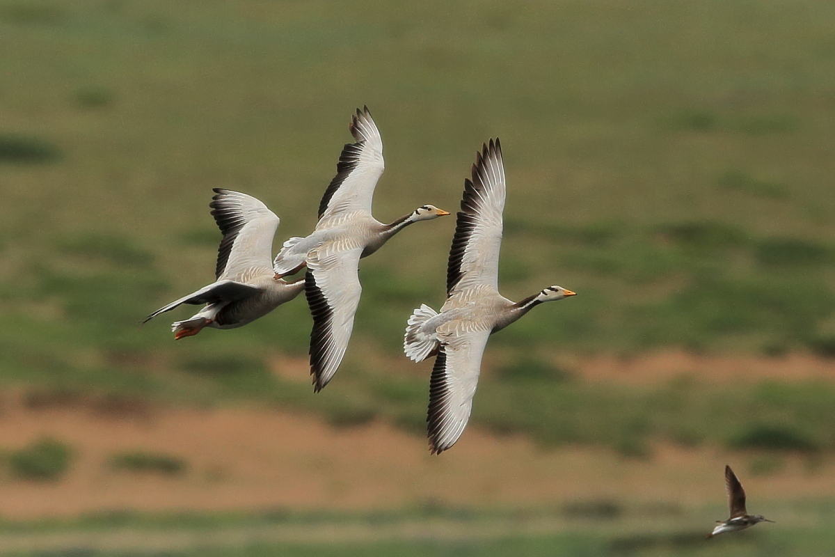 1. Pallas's Sandgrouse (T,V),2.Himalayan Vulture (T)3.Pallas's Sea-Eagle.(T)4.Demoiselle Crane(T).5.Upland Buzzard (T). 6.Siberian Scoter (T).7.Rufous-tailed Rock-Thrush (T).8.Saker falcon.9.Golden Eagle.10.Azure Tit (T,V).11.Horned Lark  (T,V).12.Red-billed Chough (T,V).13.Mongolian Lark (T).14.Mongolian Herring Gull (T,G).15.Bar-headed Goose (T, V).16.Amur Falcon (T,V).17.Rock Sparrow (T,V).18.Pine Bunting (T,V).19.Desert Wheatear (T,V).20. Merlin (T).21.Isabelline Shrike (T).22.White-crowned Penduline-Tit (T,V). 23.Oriental plover (T). 24.Citrine wagtail (T). 25.Greater Sand Plover (T).26.Red-crested pochard (T).27.Daurian redstart (T).28.Eastern marsh harrier (T).29.Swan Goose (T).30.Dusky Warbler.31.Taiga Flycatcher.32.Pacific Swift.33.Thick-billed warbler. 34.Asian brown flycatcher.35.Daurian jackdaw.36. Richard's Pipit. 37.Garganey. 38..Asian Short-toed Lark.
