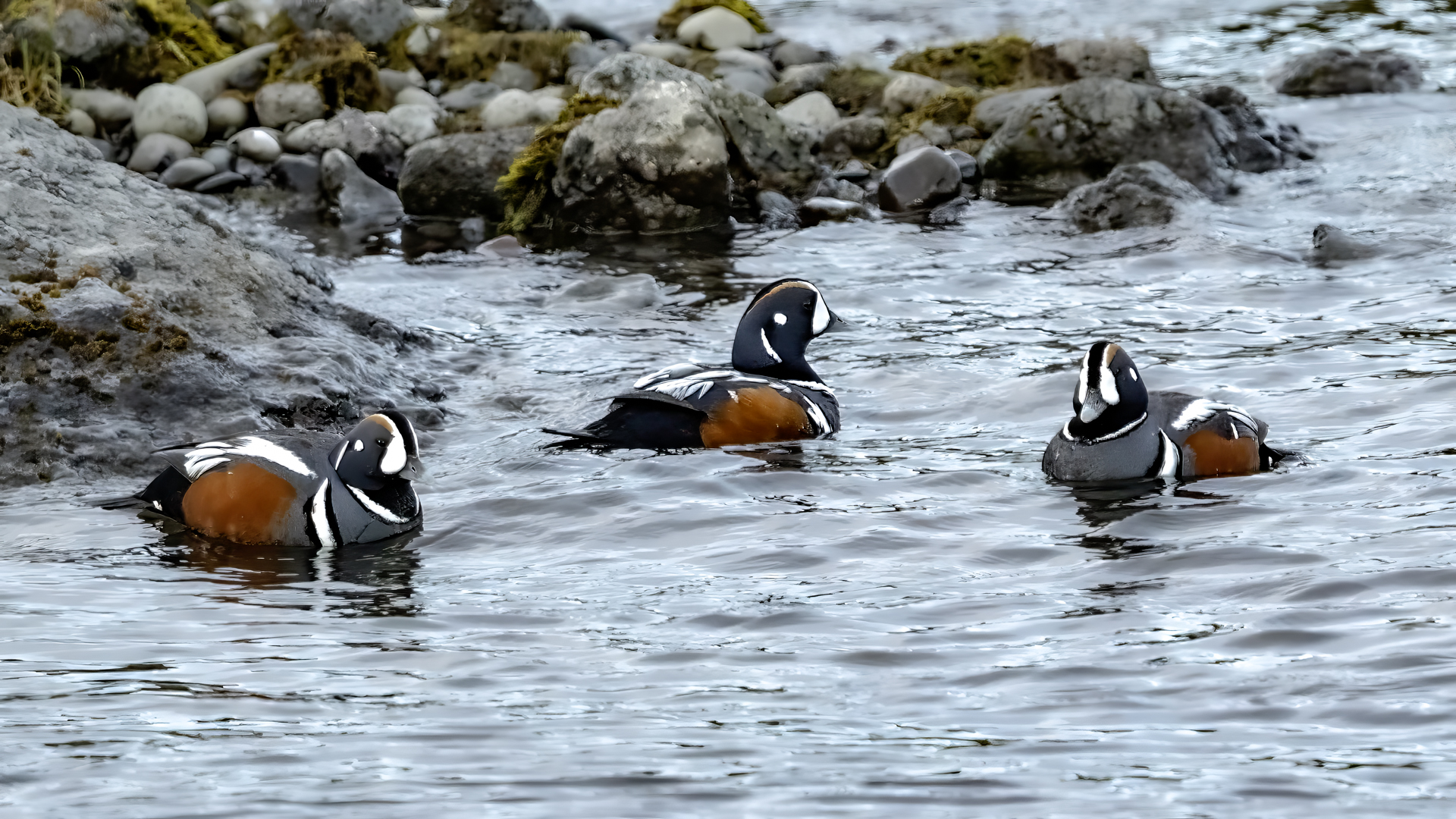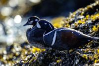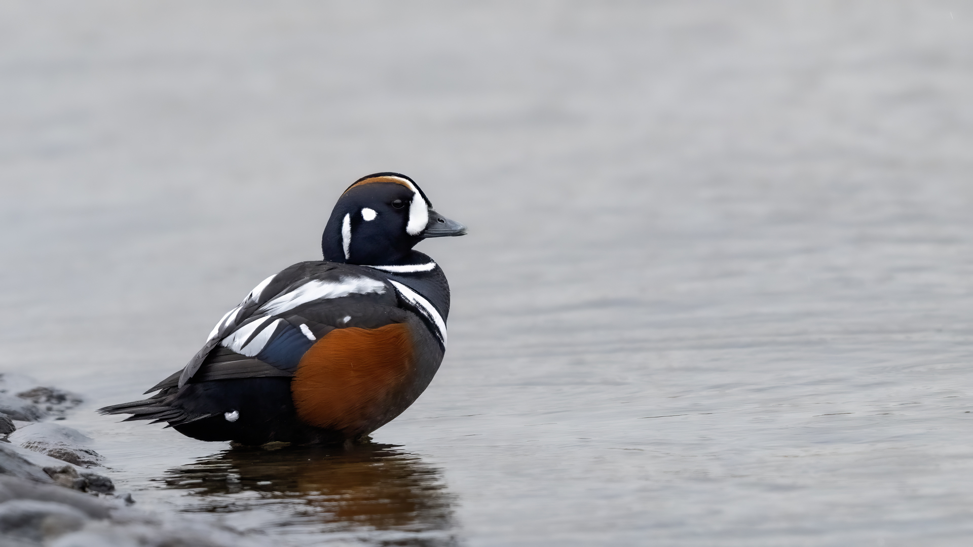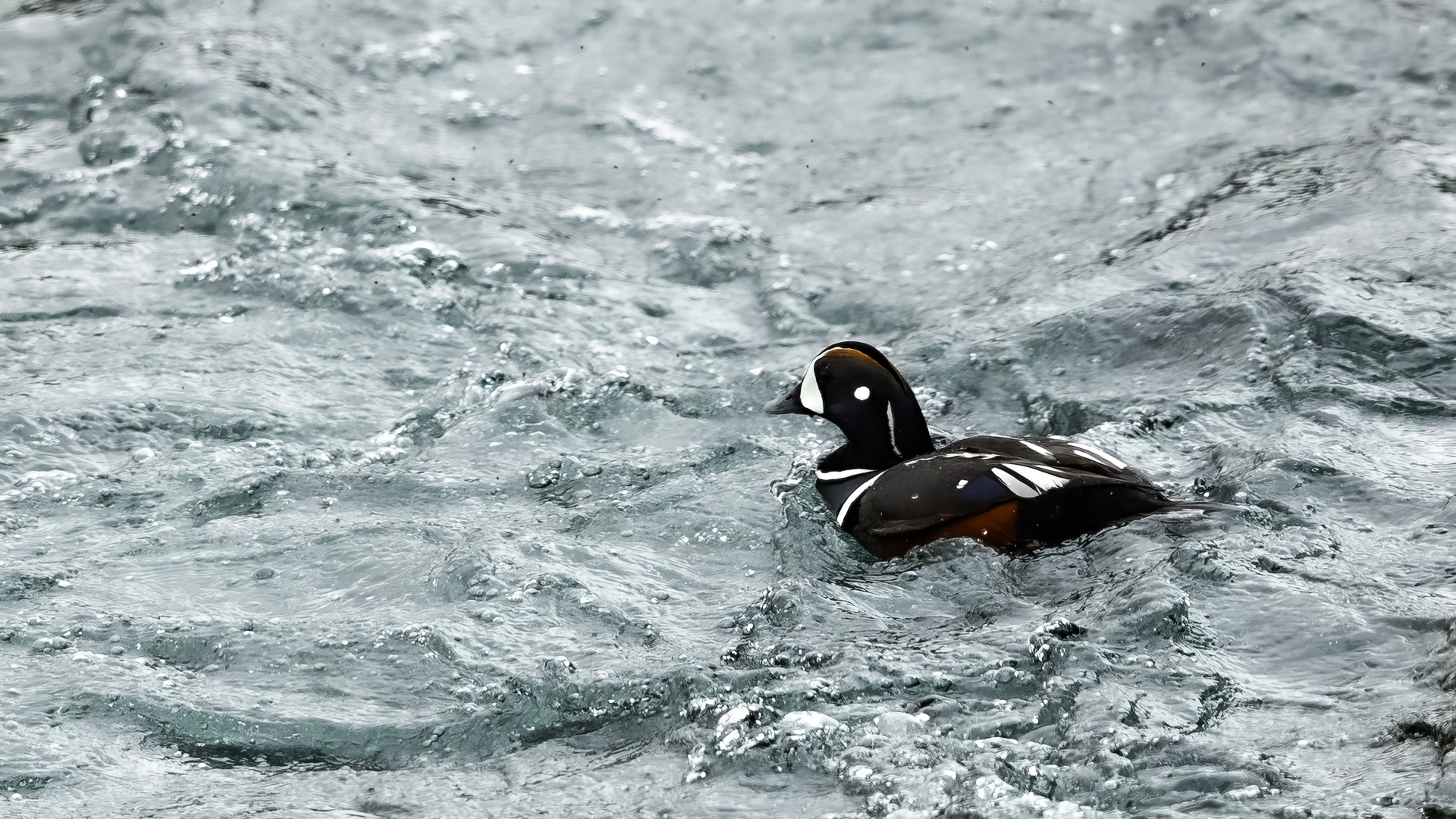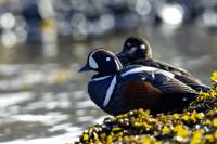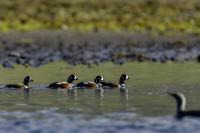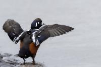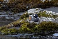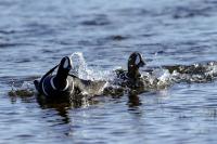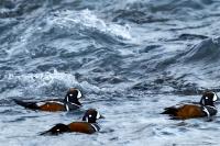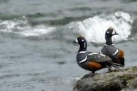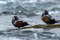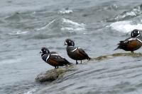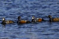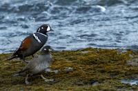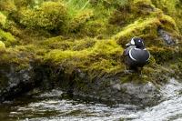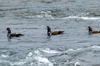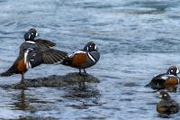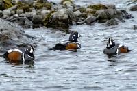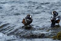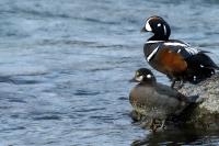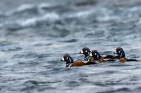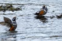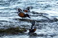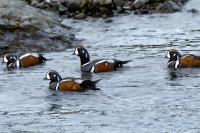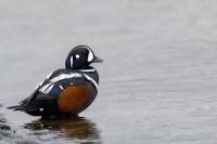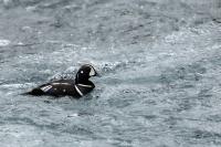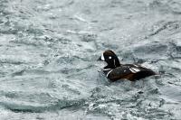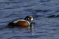 In Iceland it happened to me to run into  the Harlequin Duck a few times. Always in the mainstream of quite swift rivers. Sometimes I could see them basking on coastal rocks. It is a colorful duck reaching to 800 grams of weight and up to 70 cm of wingspan. The best photos were taken during the shooting red-throated loon, where harlequin ducks flowed a little further. Fortunately I managed to spot  it, as my eyes was fixed on loons so much that common eiders sitting nearby I noticed only when leaving the bank of the river. Unfortunately the ducks were quite skittish and did not allow me to reduce quite a long distance between us. They were always watching attentively and receding slowly. Harlequin ducks in Europe are found only in Iceland. There the population is estimated at 14 thousand individuals in winter (2014).