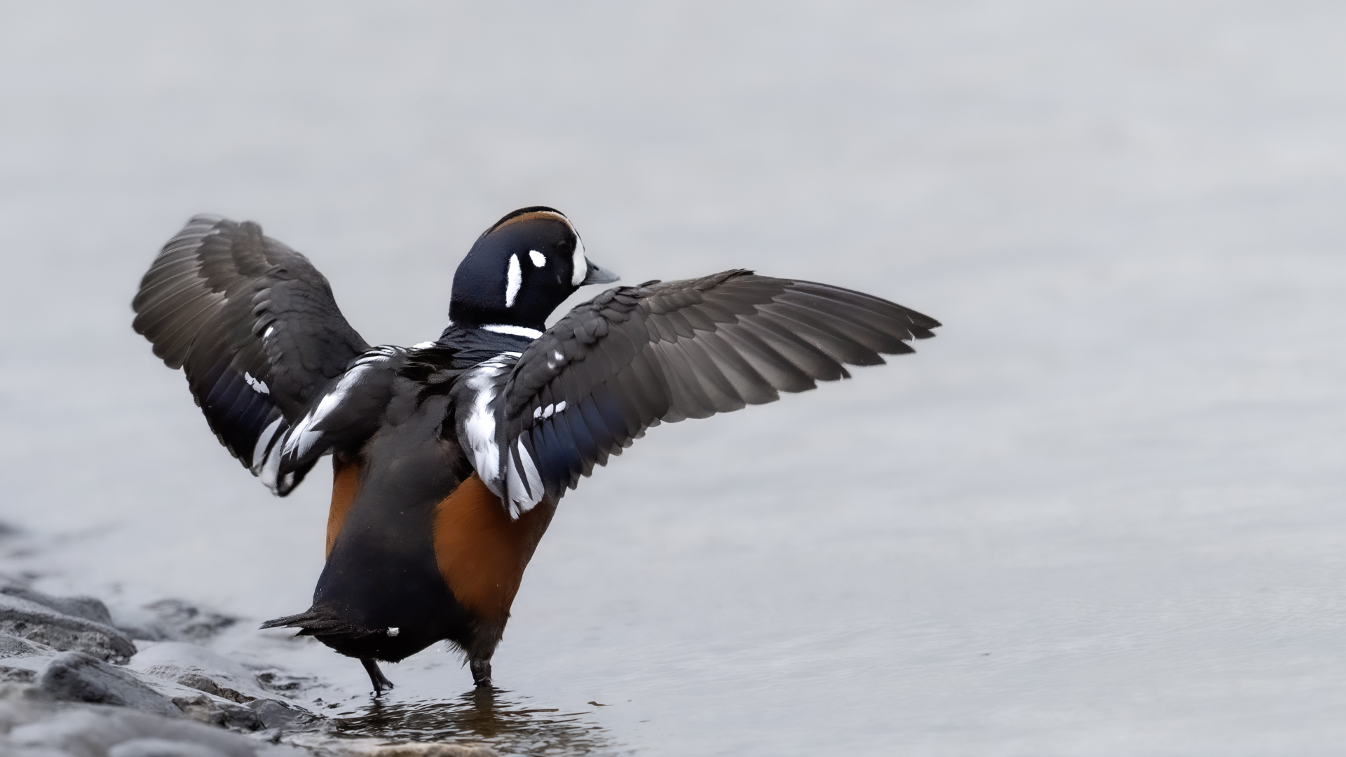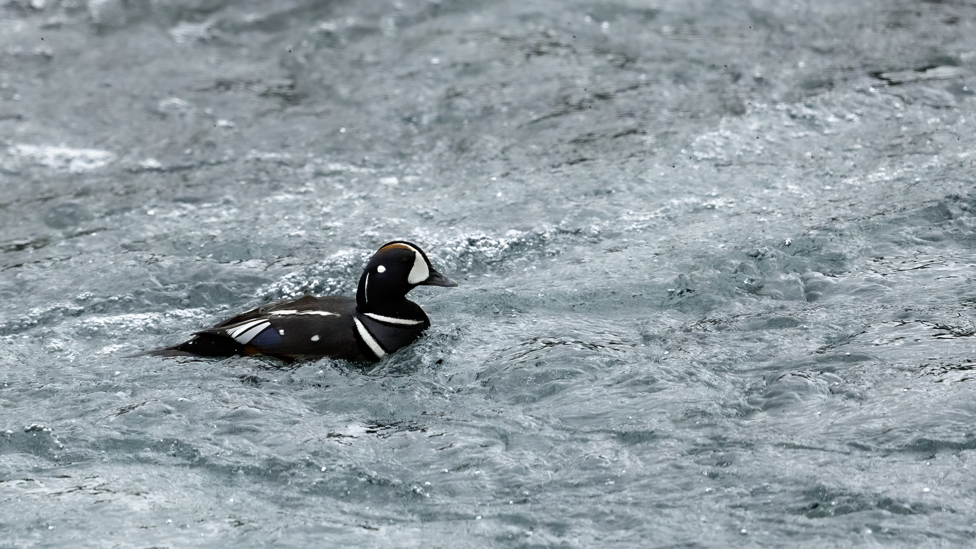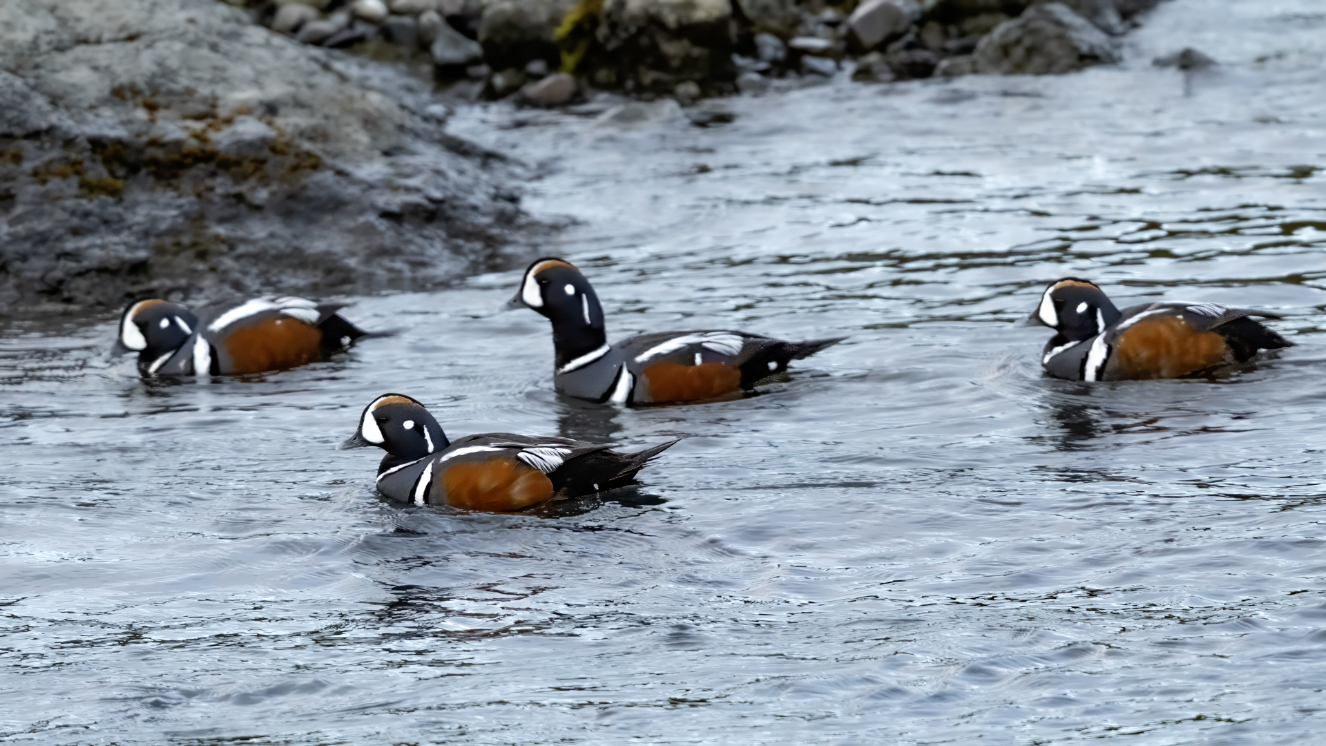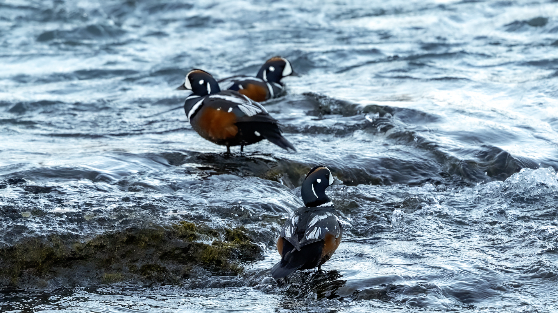 In Iceland it happened to me to run into  the Harlequin Duck a few times. Always in the mainstream of quite swift rivers. Sometimes I could see them basking on coastal rocks. It is a colorful duck reaching to 800 grams of weight and up to 70 cm of wingspan. The best photos were taken during the shooting red-throated loon, where harlequin ducks flowed a little further. Fortunately I managed to spot  it, as my eyes was fixed on loons so much that common eiders sitting nearby I noticed only when leaving the bank of the river. Unfortunately the ducks were quite skittish and did not allow me to reduce quite a long distance between us. They were always watching attentively and receding slowly. Harlequin ducks in Europe are found only in Iceland. There the population is estimated at 14 thousand individuals in winter (2014).