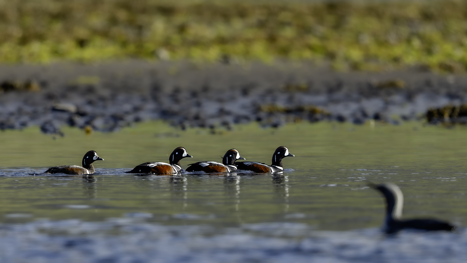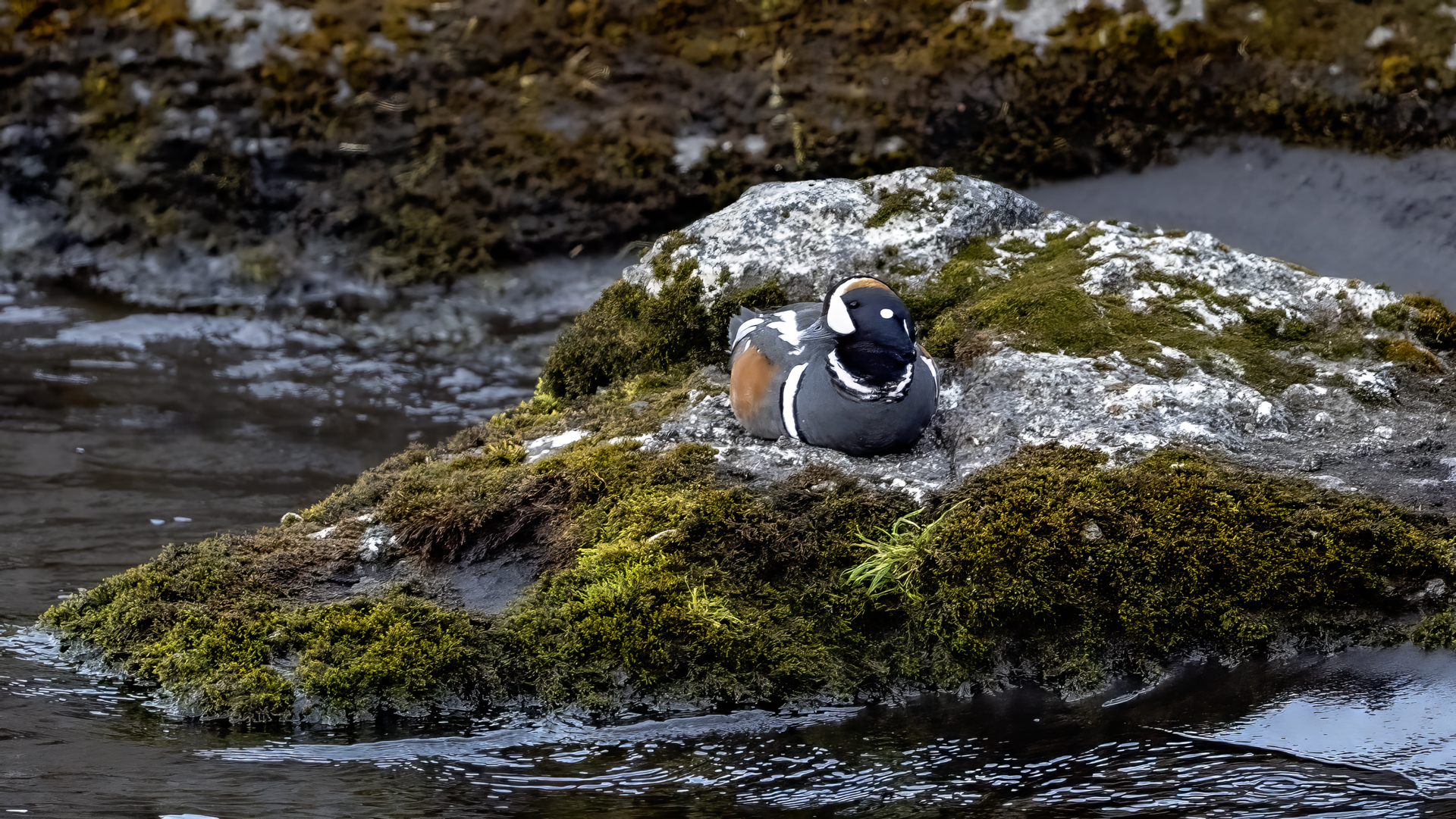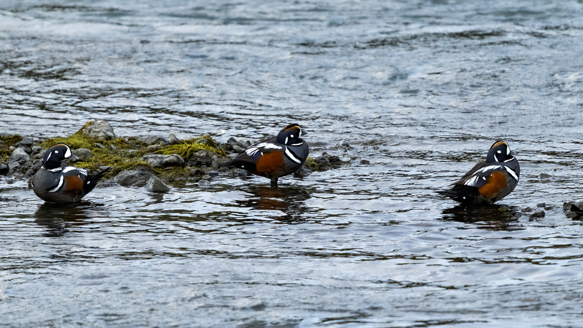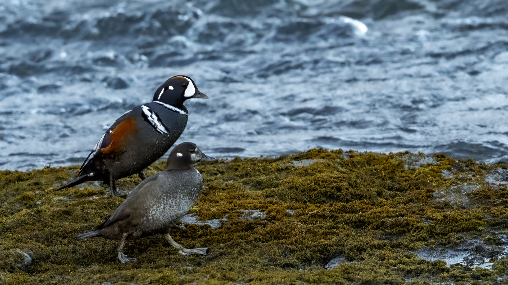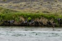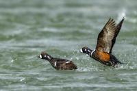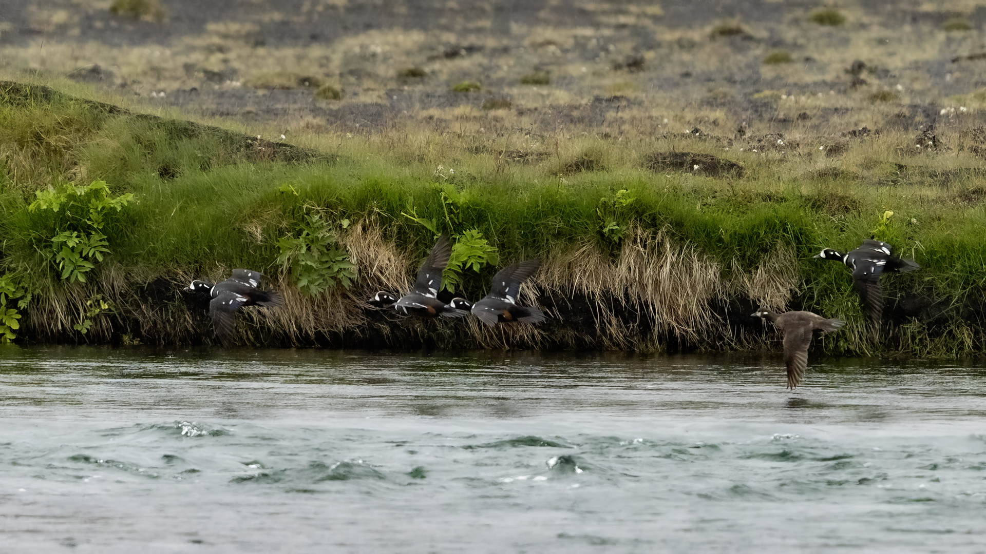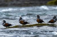 We have seen harlequin ducks in Iceland many times. But to take more interesting shots more time is needed. First of all we have to find out where the birds usually occur, preferably it should be a bushy place where there is no steep bank and there is a flat space. Then, we would have to devote many hours to hide and wait for them to come back to the place. It was difficult to take good pictures when moving, most often I photographed from the high banks of rushing rivers, which were steep and a few meters high and thus not interesting view in terms of taking photos. The scared birds flew out of the range of the lens.