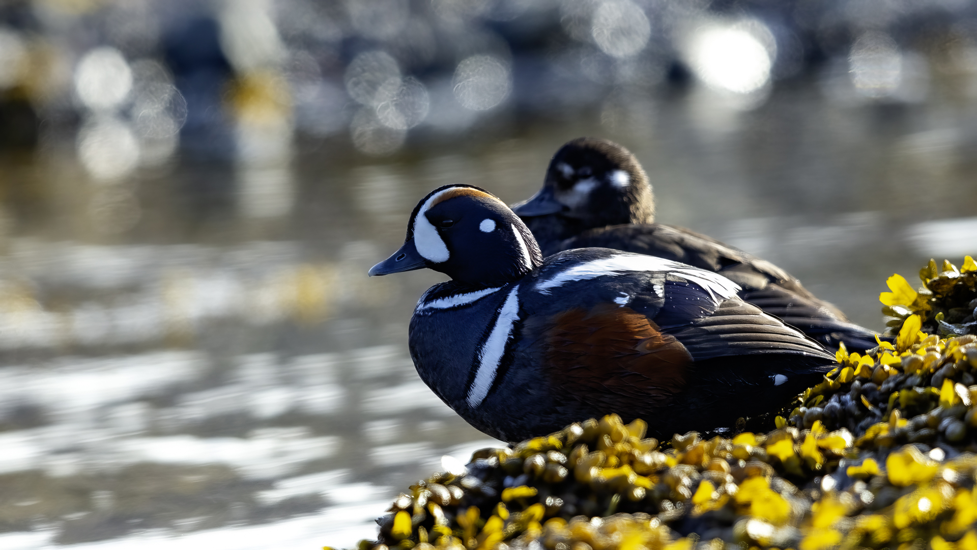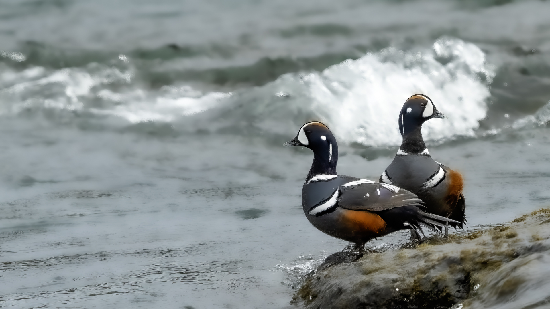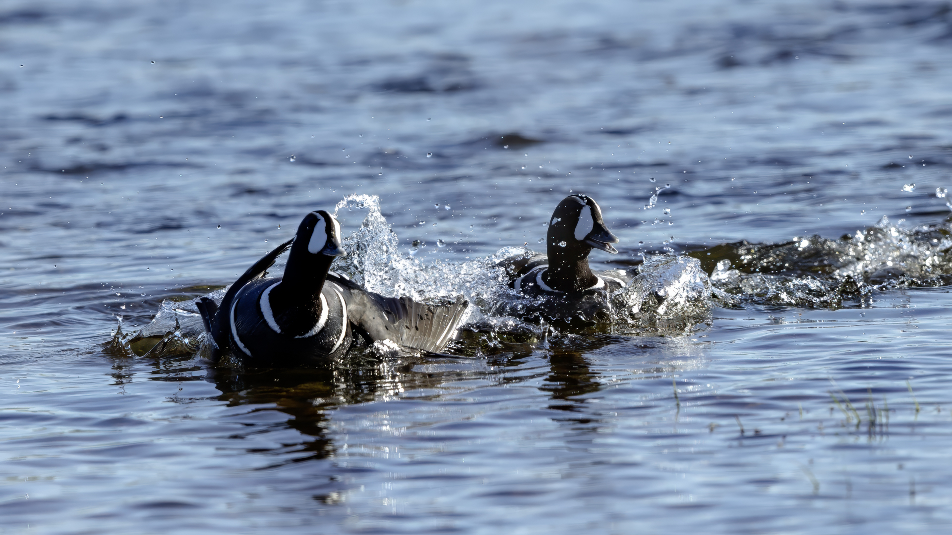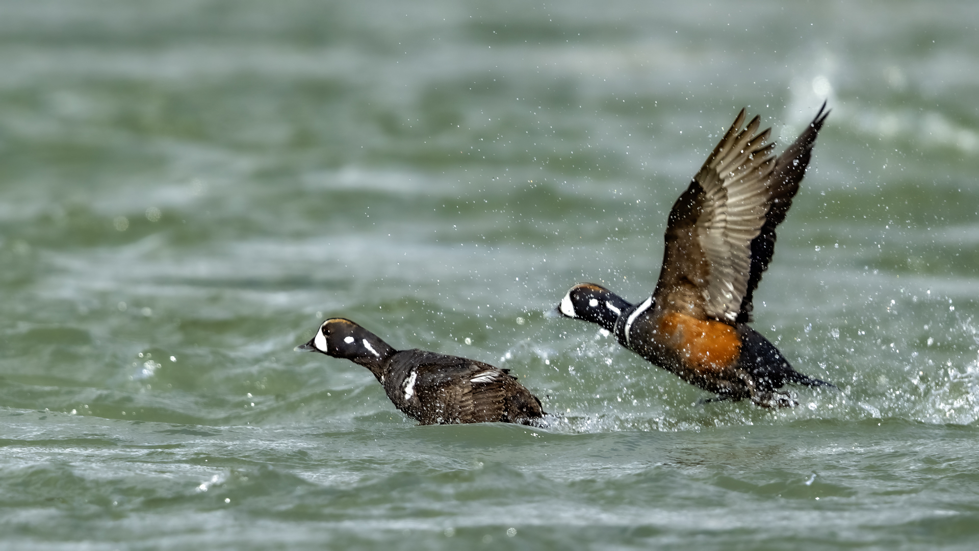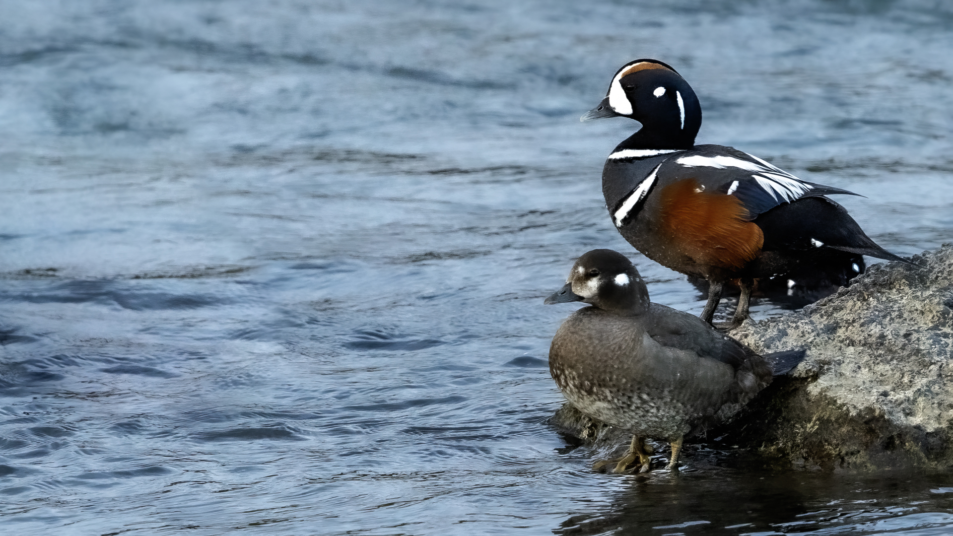We have seen harlequin ducks in Iceland many times. But to take more interesting shots more time is needed. First of all we have to find out where the birds usually occur, preferably it should be a bushy place where there is no steep bank and there is a flat space. Then, we would have to devote many hours to hide and wait for them to come back to the place. It was difficult to take good pictures when moving, most often I photographed from the high banks of rushing rivers, which were steep and a few meters high and thus not interesting view in terms of taking photos. The scared birds flew out of the range of the lens.