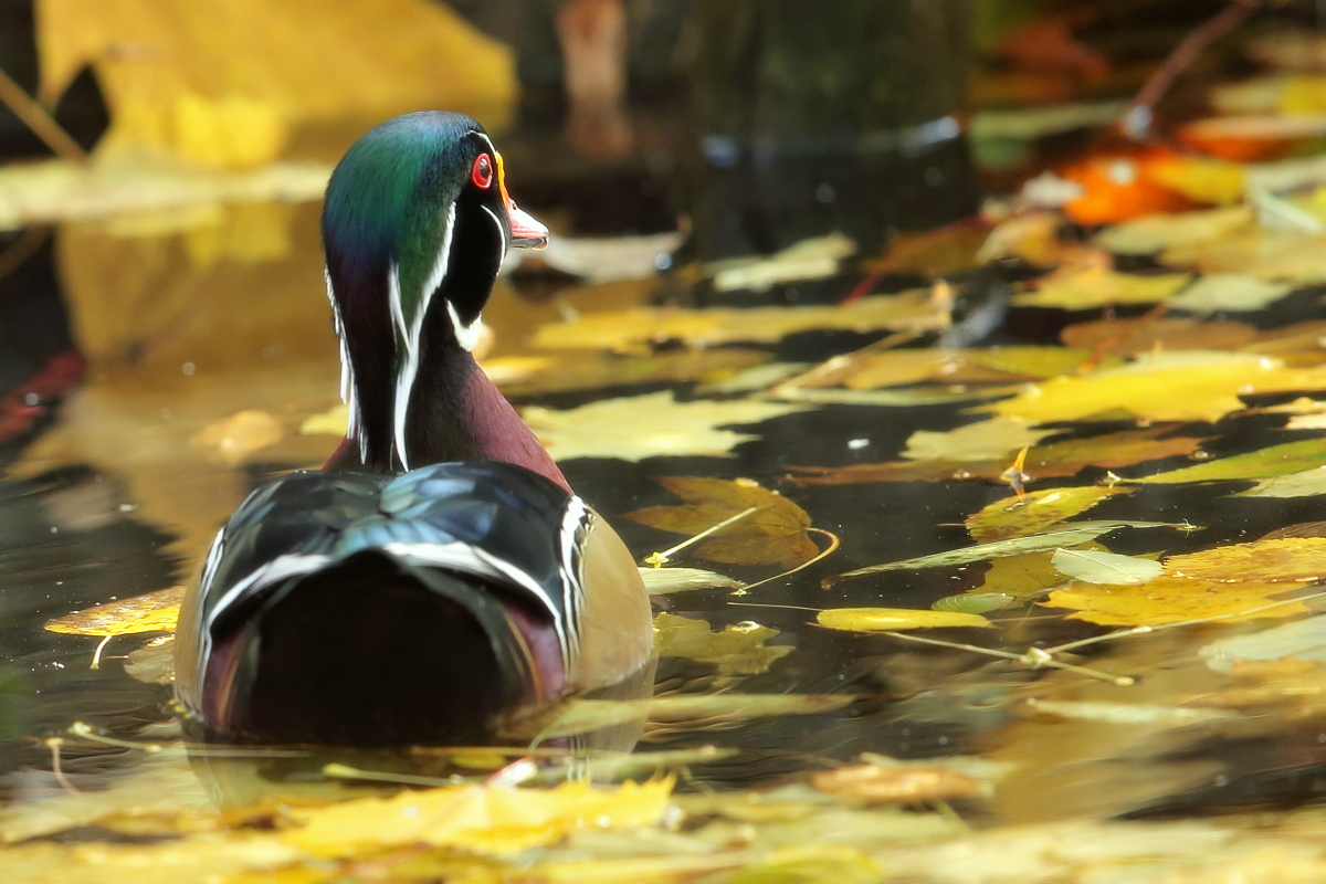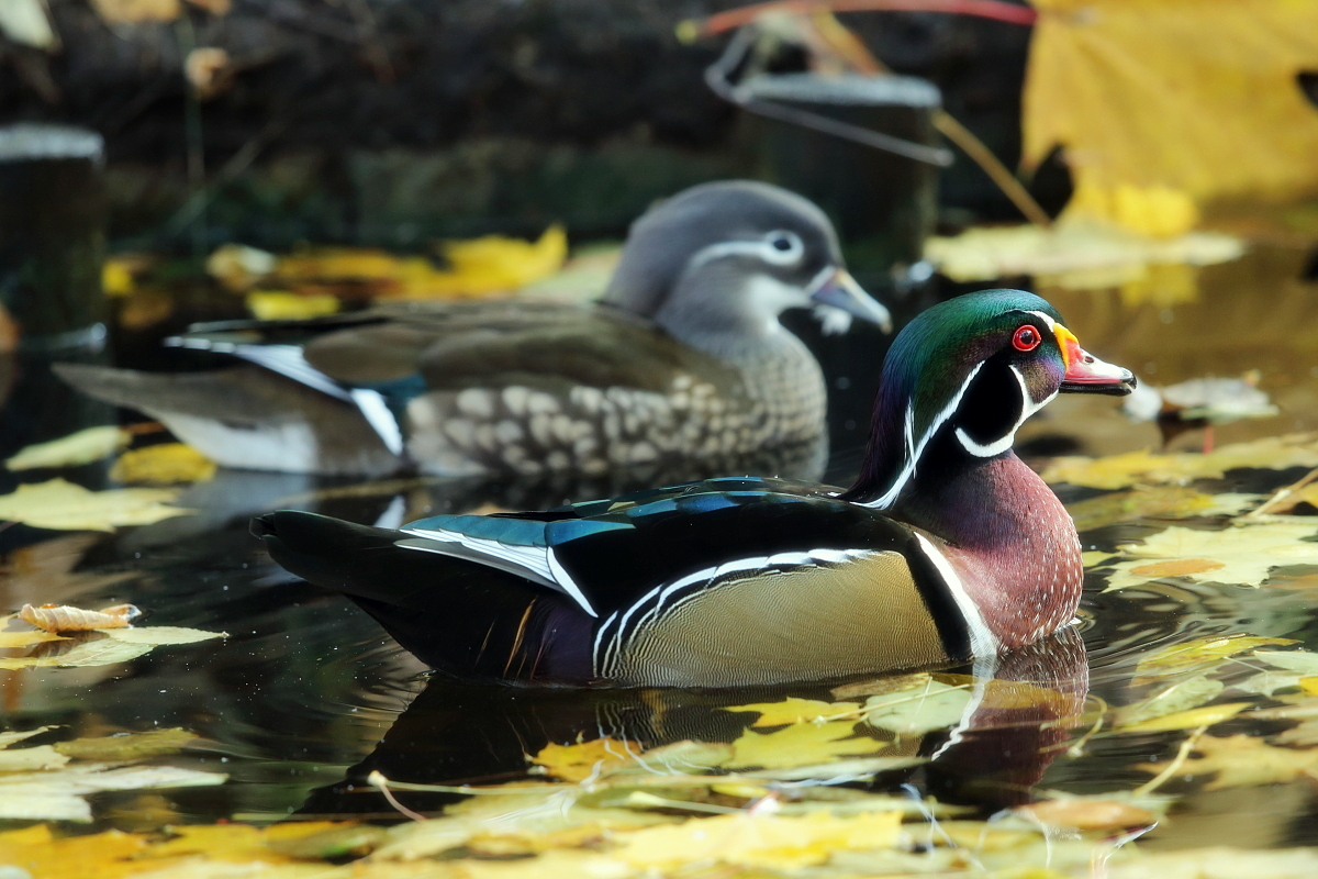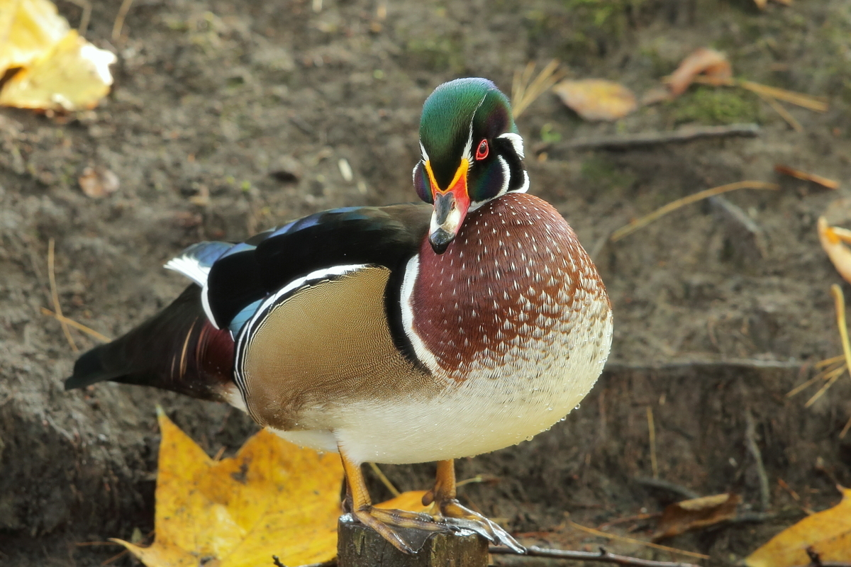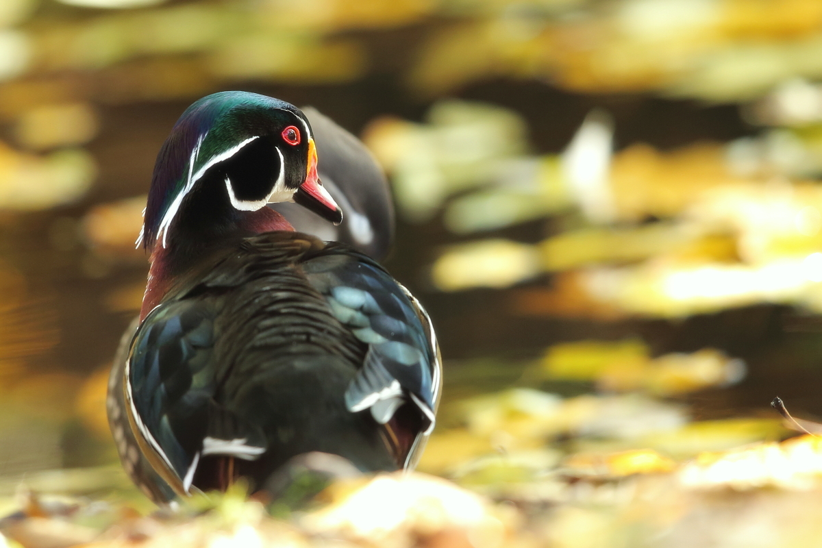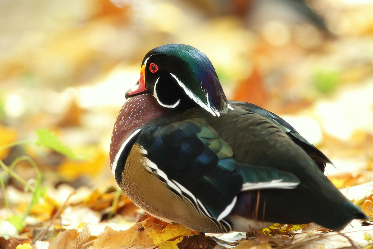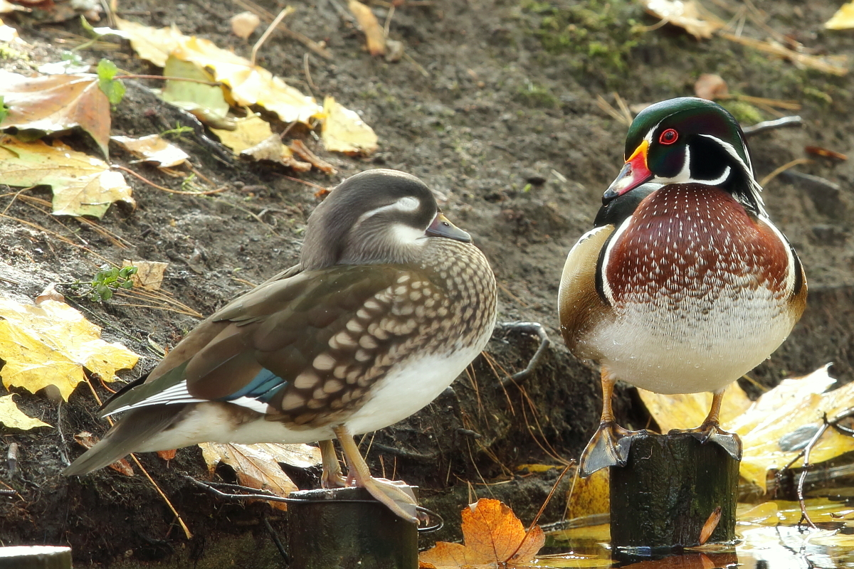 Pictures of the Wood Duck that are published here were taken in a park in Warsaw's Łazienki (Royal Baths). Searching for the duck on our water bodies is useless. Nonfreezing water in winter, sense of security and the fact that people like to fatten birds in the park are conducive to the occurrence of such "misfits" of our fauna as the Wood Duck or the Mandarin Duck. They probably escaped from some breeding farm. The Carolina Duck in nature is found only in North America. It is close to the Mandarin Duck in size, in which company it lives in Łazienki. Wingspan is about 70 cm with a weight of about 0.6 kg. Not only the physical features but also the habits of those species are similar, not to mention the beautiful coloration of males. Wood Ducks incubate eggs in a nest located on a tree. The one-day juveniles must sometimes make a jump from a height of several meters to reach the water body, where they find the first meal. We'll see in time if they assimilate enough to reproduce there in Warsaw’s Royal Bath. I could see one couple there. Conditions in our country seem to be comfortable for the Mandarin Duck, at least in Warsaw, because their population is growing (see also the “last minute news 10/2013” the Mandarin Duck ). What about Wood Ducks? We'll see, anyway I’ll check it when occurs the opportunity to walk around this beautiful park.