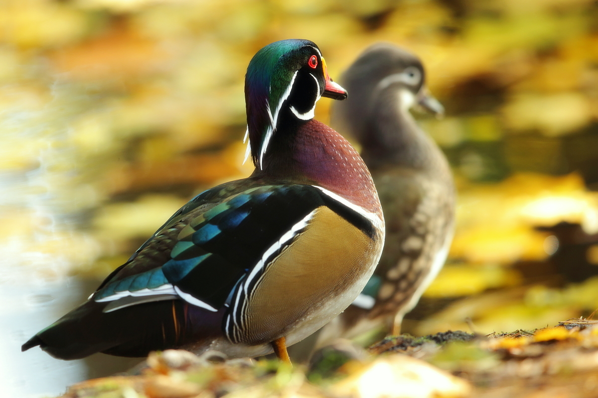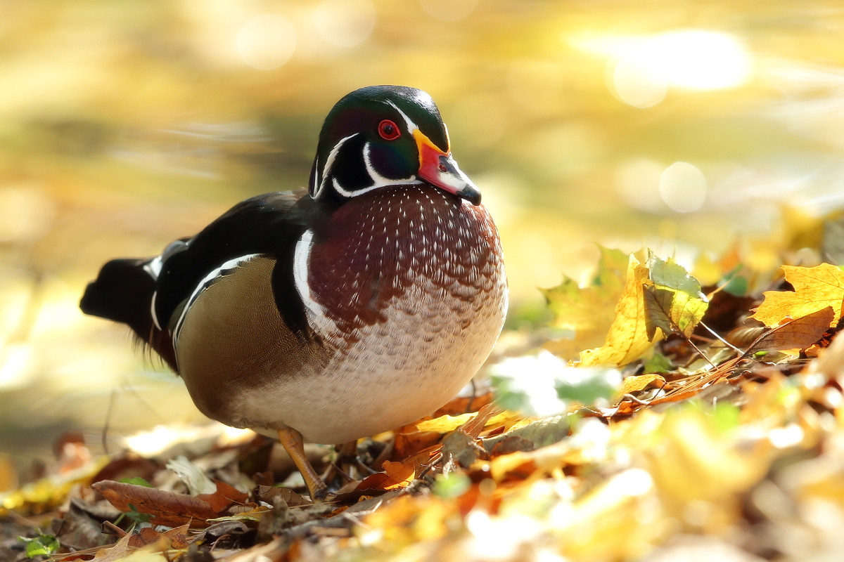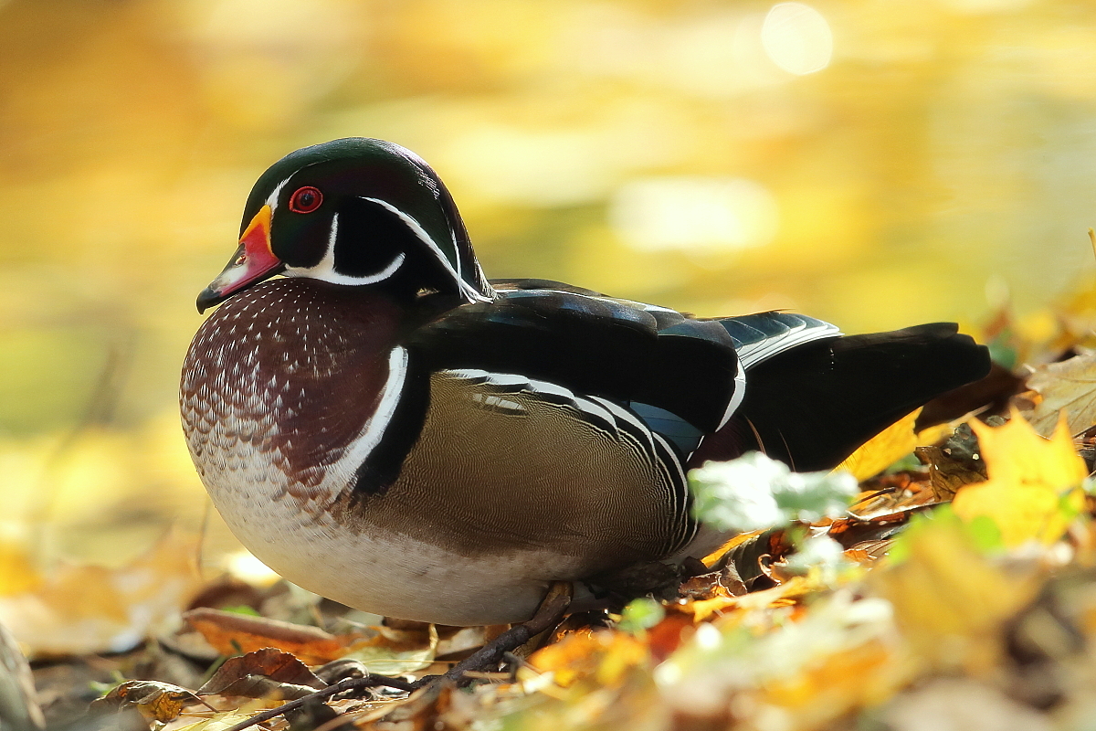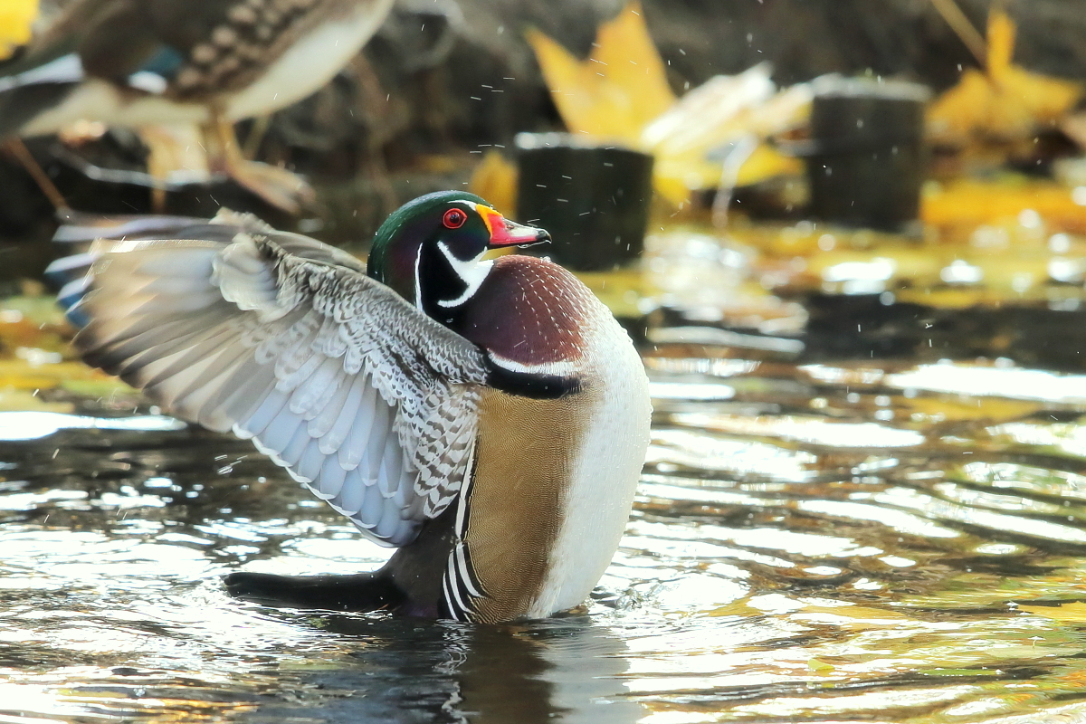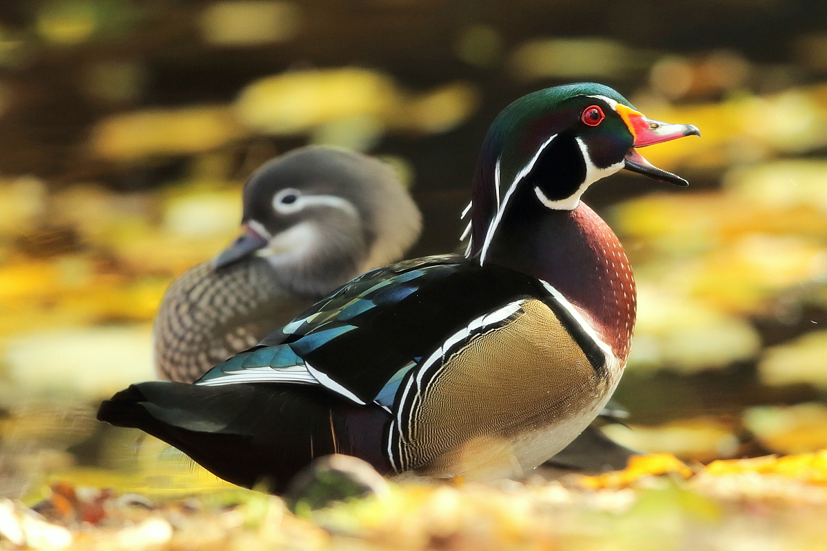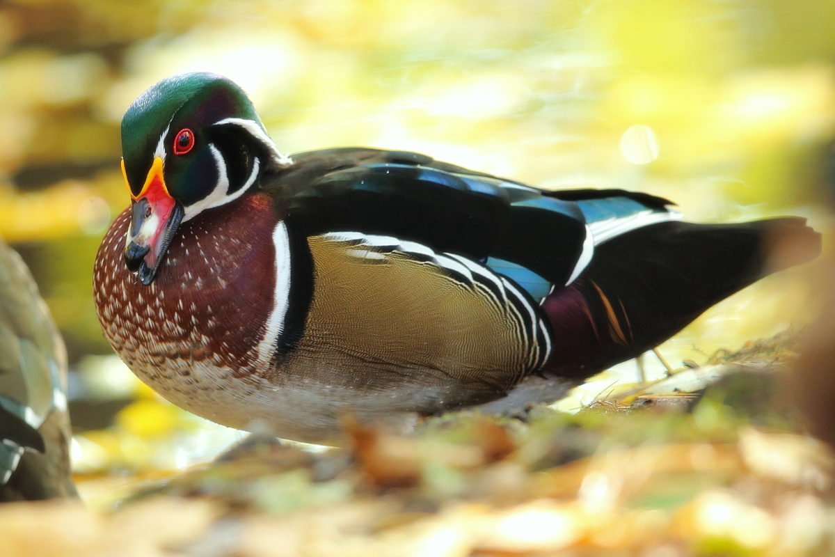 Pictures of the Wood Duck that are published here were taken in a park in Warsaw's Łazienki (Royal Baths). Searching for the duck on our water bodies is useless. Nonfreezing water in winter, sense of security and the fact that people like to fatten birds in the park are conducive to the occurrence of such "misfits" of our fauna as the Wood Duck or the Mandarin Duck. They probably escaped from some breeding farm. The Carolina Duck in nature is found only in North America. It is close to the Mandarin Duck in size, in which company it lives in Łazienki. Wingspan is about 70 cm with a weight of about 0.6 kg. Not only the physical features but also the habits of those species are similar, not to mention the beautiful coloration of males. Wood Ducks incubate eggs in a nest located on a tree. The one-day juveniles must sometimes make a jump from a height of several meters to reach the water body, where they find the first meal. We'll see in time if they assimilate enough to reproduce there in Warsaw’s Royal Bath. I could see one couple there. Conditions in our country seem to be comfortable for the Mandarin Duck, at least in Warsaw, because their population is growing (see also the “last minute news 10/2013” the Mandarin Duck ). What about Wood Ducks? We'll see, anyway I’ll check it when occurs the opportunity to walk around this beautiful park.