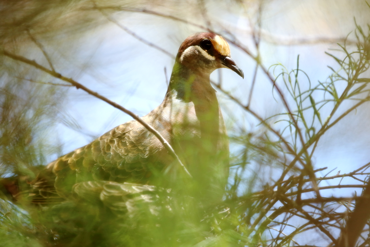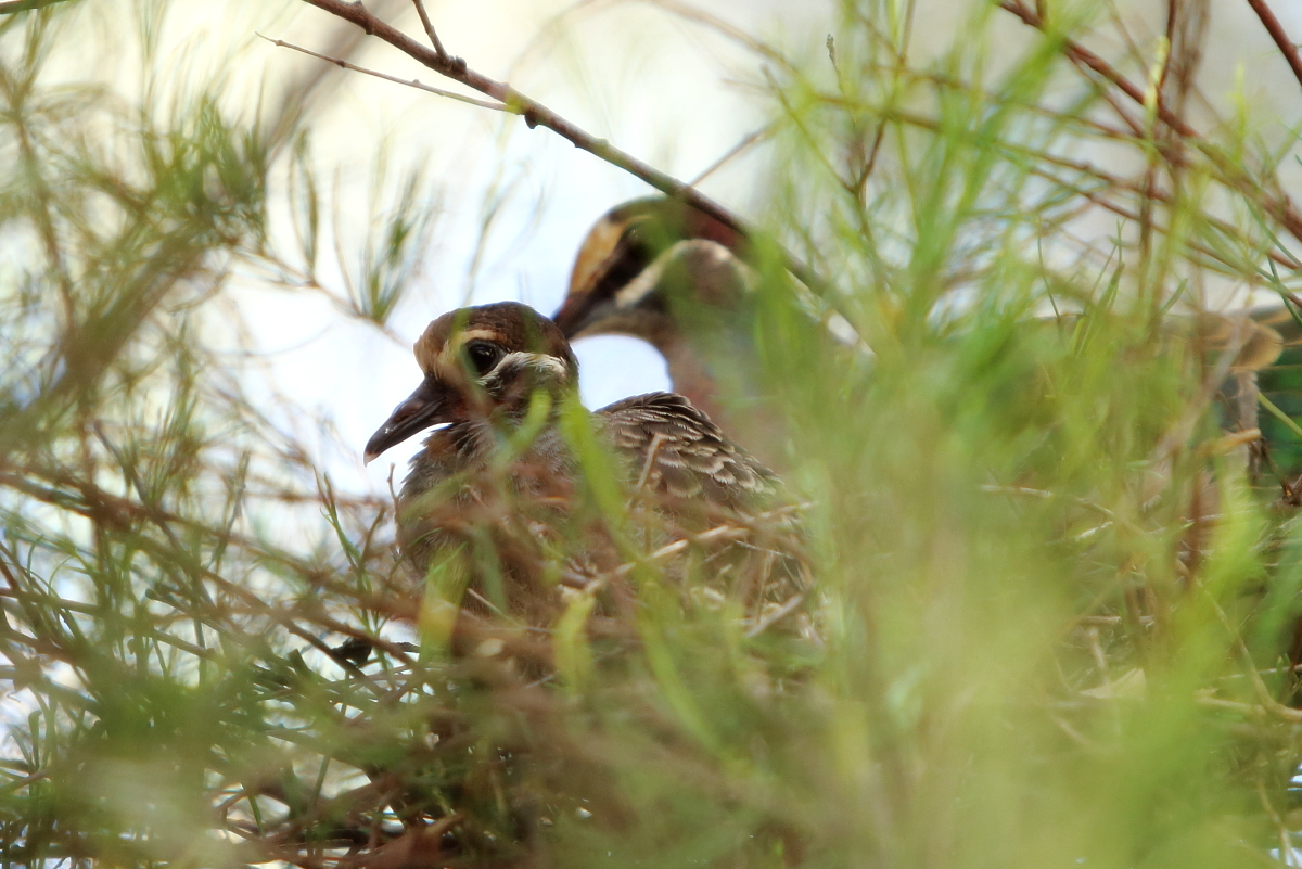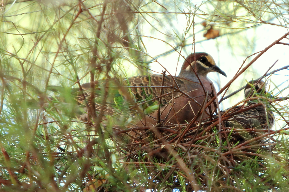 It is a species of quite massively looking pigeon. The Common Bronzewing allowed me to take pictures together with its offspring in Uluru in central Australia. It was a pity but twigs of trees everywhere around made taking a nice, clean picture hardly possible.