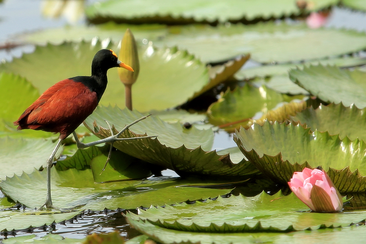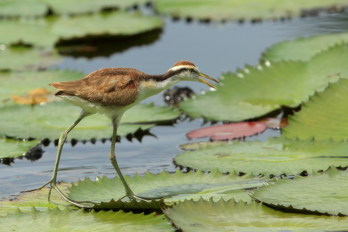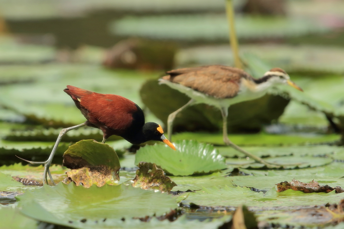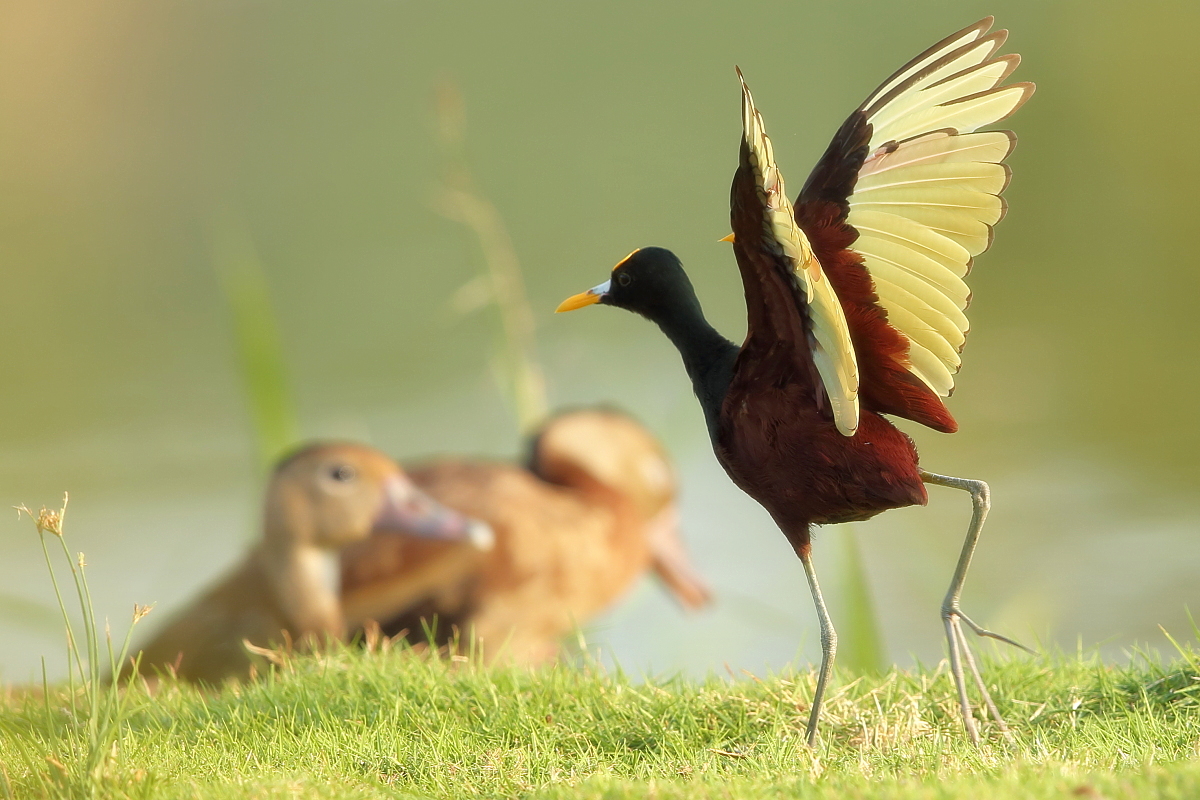 The third species of jacana goes to my gallery. This time the best and most interesting display of jacanas was created on my website. There were several meetings with the northern jacana but two of them in the light of an interesting color. Once I managed to shoot adults with adolescent juvenile. I took so many pictures that it was difficult to select them for the gallery. Here we have some pictures showing the characteristic long fingers/claws of the jacana. Jacana are of filigree physique. Their weight is less than 170 grams and a wingspan about 60 centimeters.
