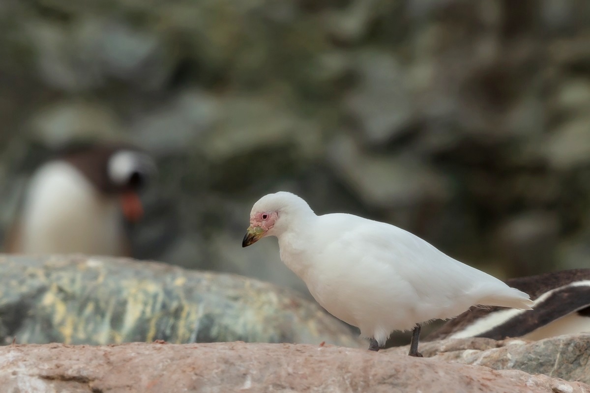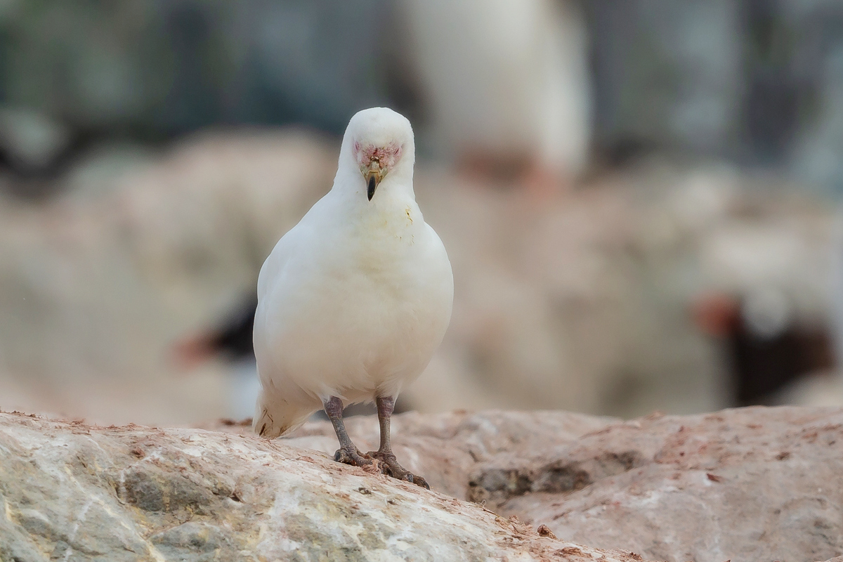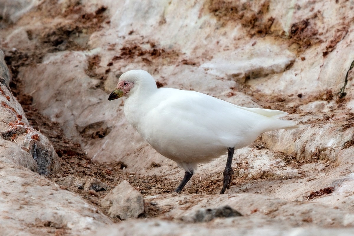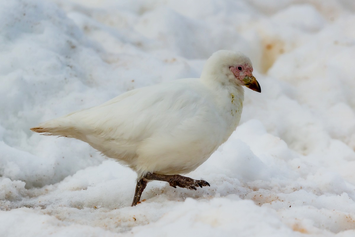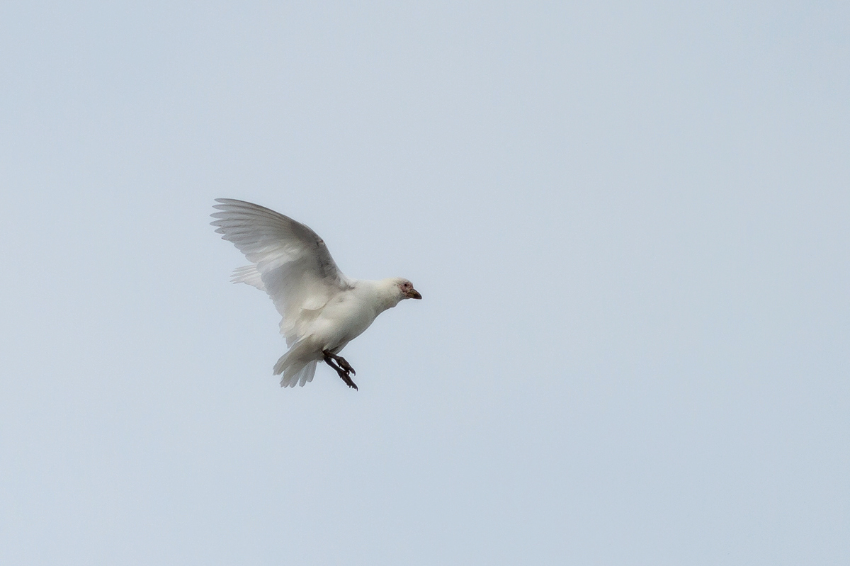 It happened to me to encounter sheathbills twice. Their most distinctive feature is feeding among penguin colonies. They eat the remains of undigested food, but can also be a threat to newly hatched chicks or not protected penguin eggs. Penguins were watching sheathbills but did not care about them too much and chased them rarely. Snowy sheathbill occurs in Antarctica and Tierra del Fuego. Their weight does not exceed 600 grams and a wingspan of 80 centimeters. They were not skittish, but when the distance was less than 8-10 meters they always took flight.