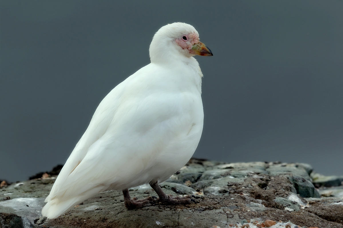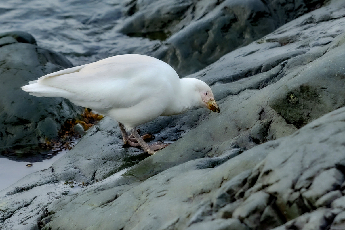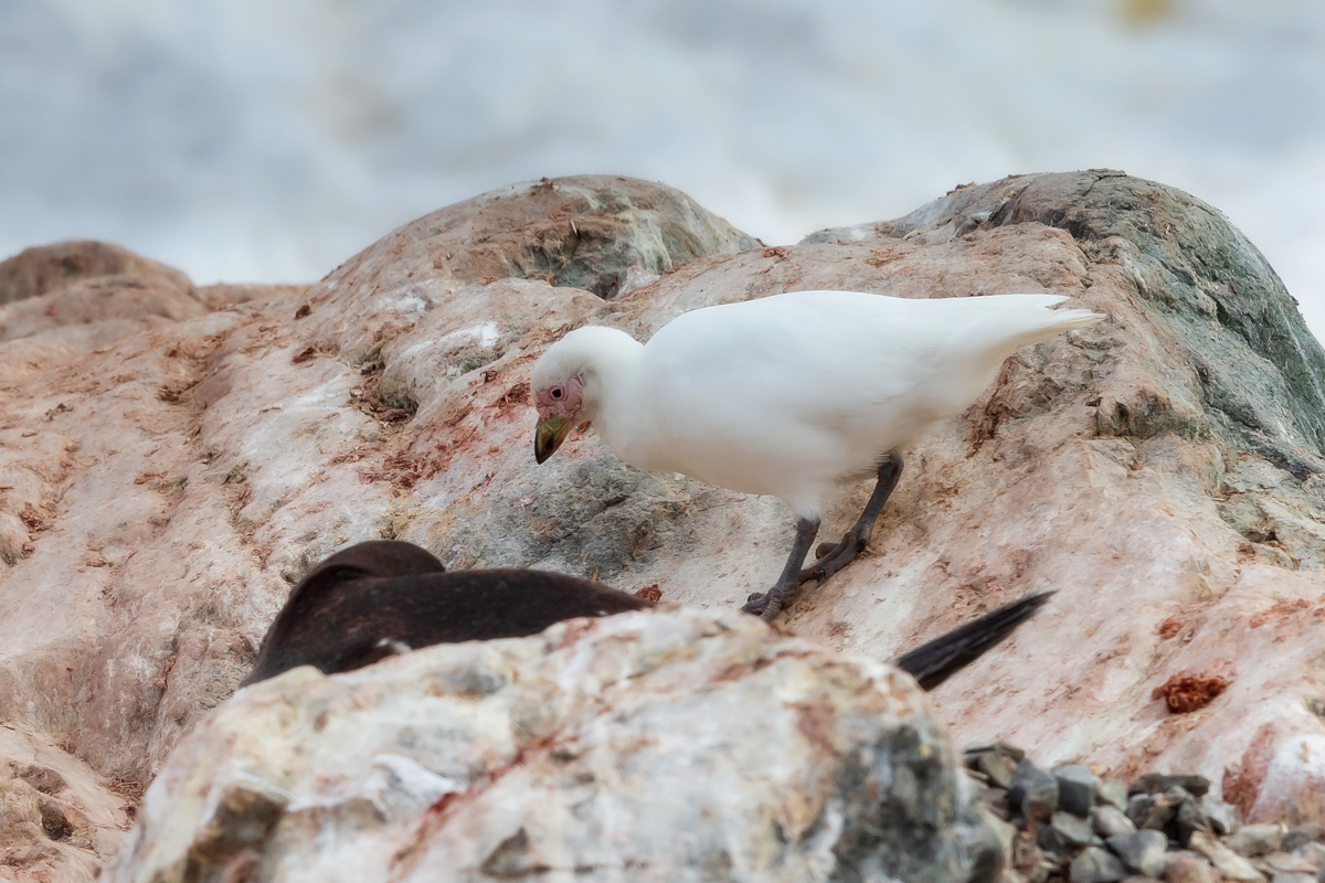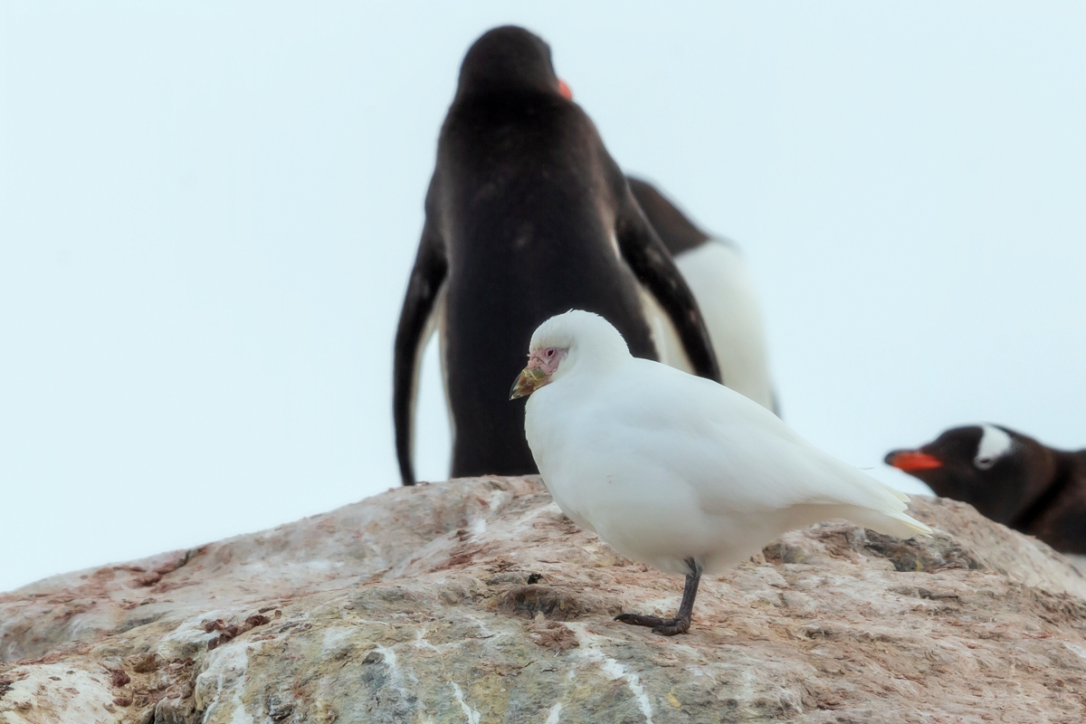 It happened to me to encounter sheathbills twice. Their most distinctive feature is feeding among penguin colonies. They eat the remains of undigested food, but can also be a threat to newly hatched chicks or not protected penguin eggs. Penguins were watching sheathbills but did not care about them too much and chased them rarely. Snowy sheathbill occurs in Antarctica and Tierra del Fuego. Their weight does not exceed 600 grams and a wingspan of 80 centimeters. They were not skittish, but when the distance was less than 8-10 meters they always took flight.