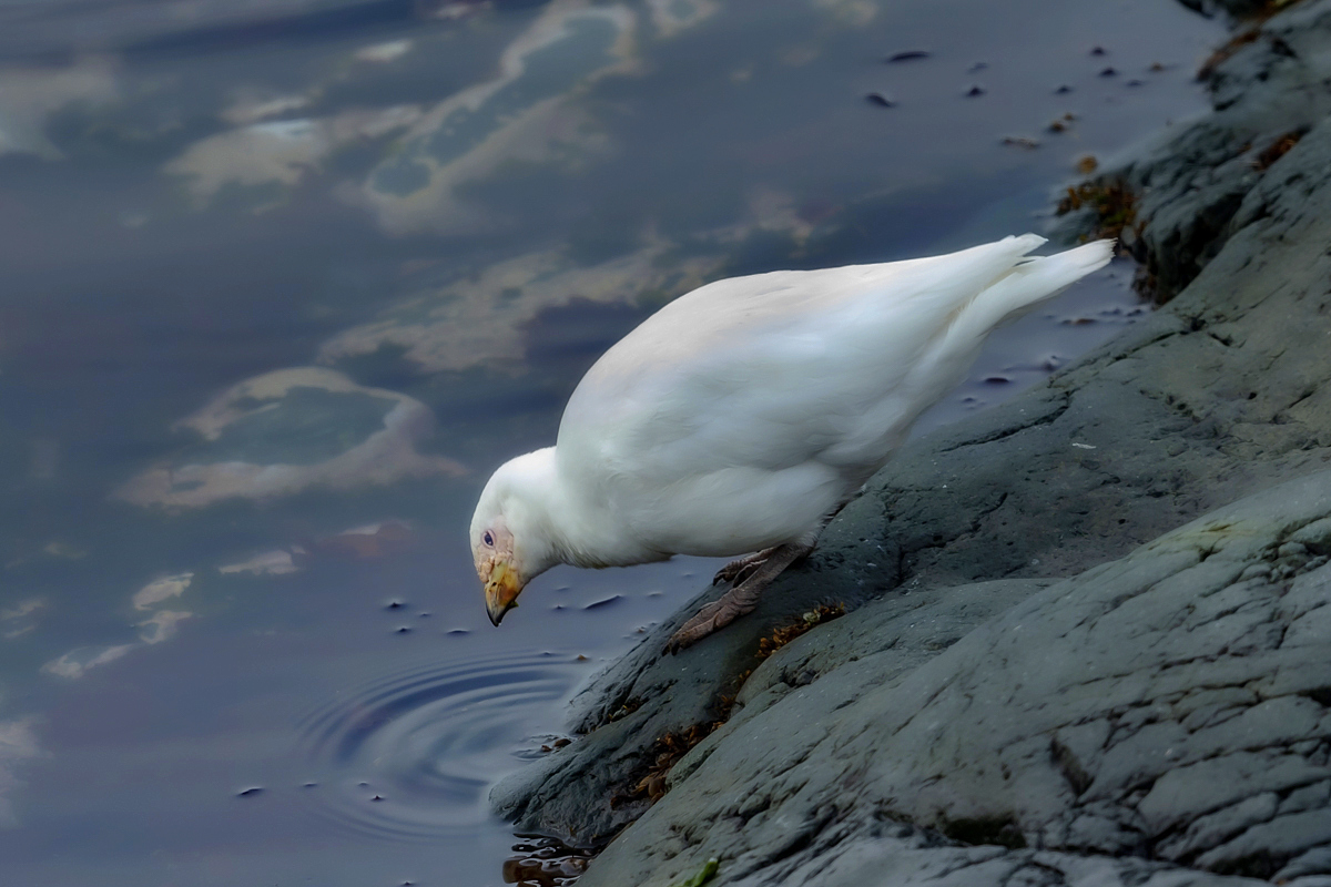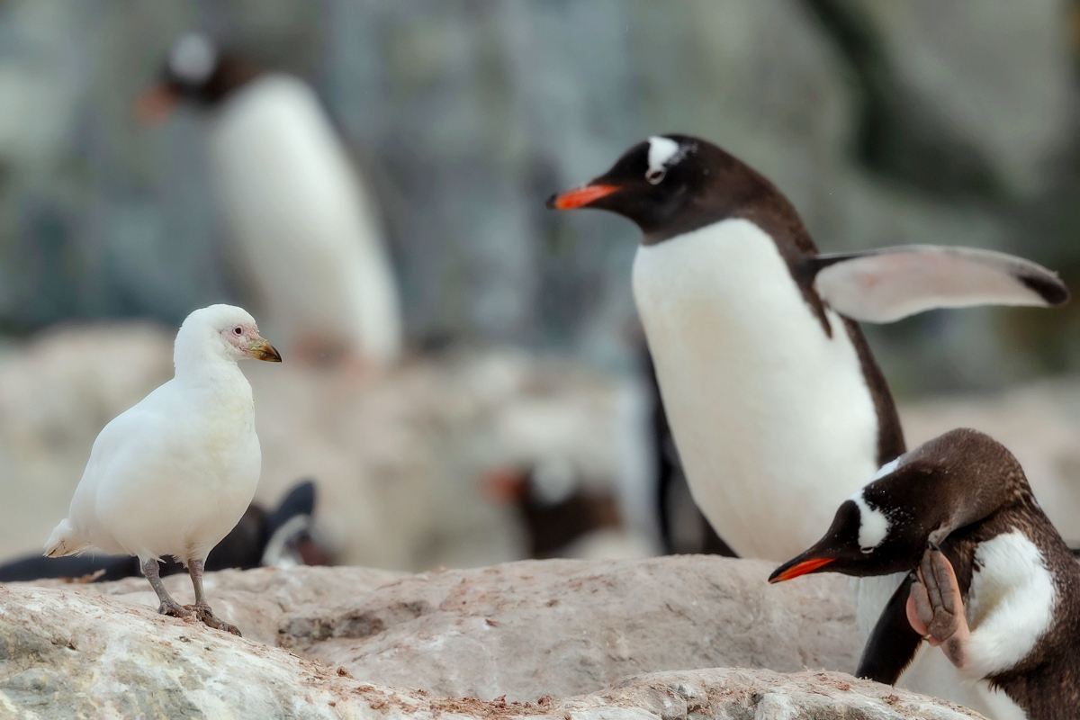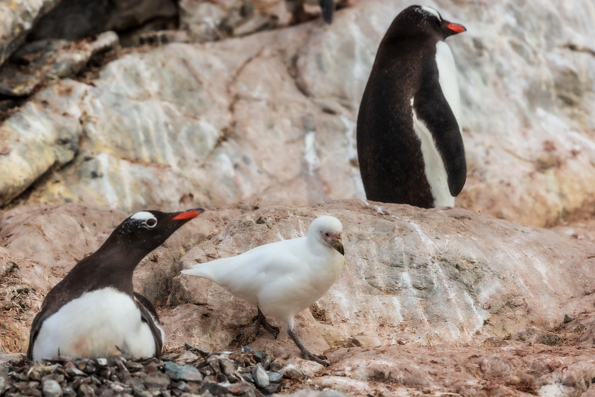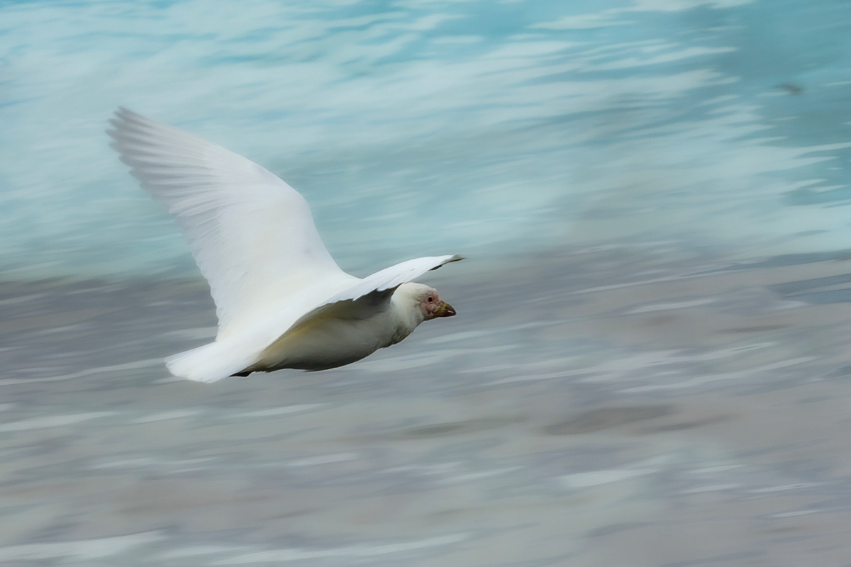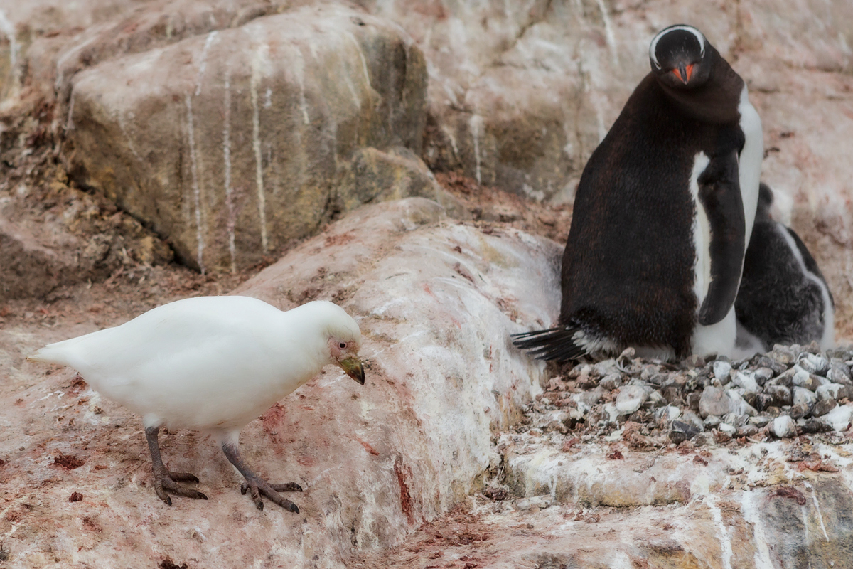 It happened to me to encounter sheathbills twice. Their most distinctive feature is feeding among penguin colonies. They eat the remains of undigested food, but can also be a threat to newly hatched chicks or not protected penguin eggs. Penguins were watching sheathbills but did not care about them too much and chased them rarely. Snowy sheathbill occurs in Antarctica and Tierra del Fuego. Their weight does not exceed 600 grams and a wingspan of 80 centimeters. They were not skittish, but when the distance was less than 8-10 meters they always took flight.