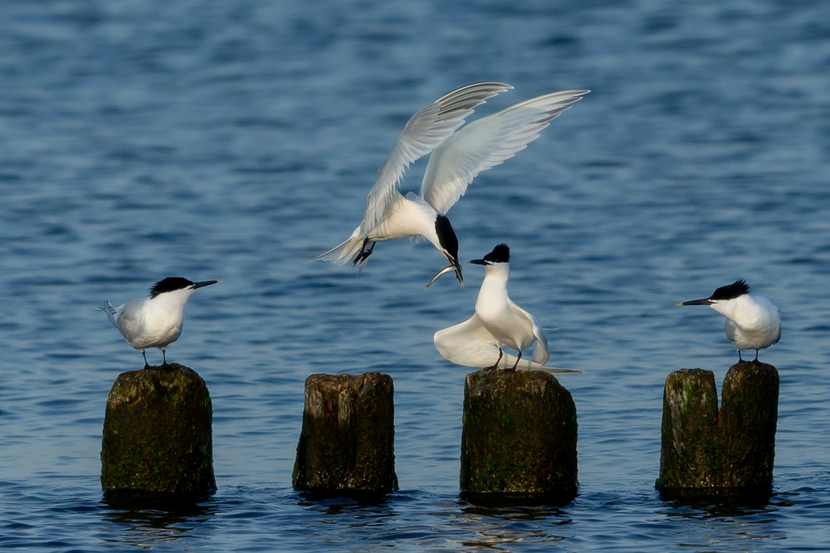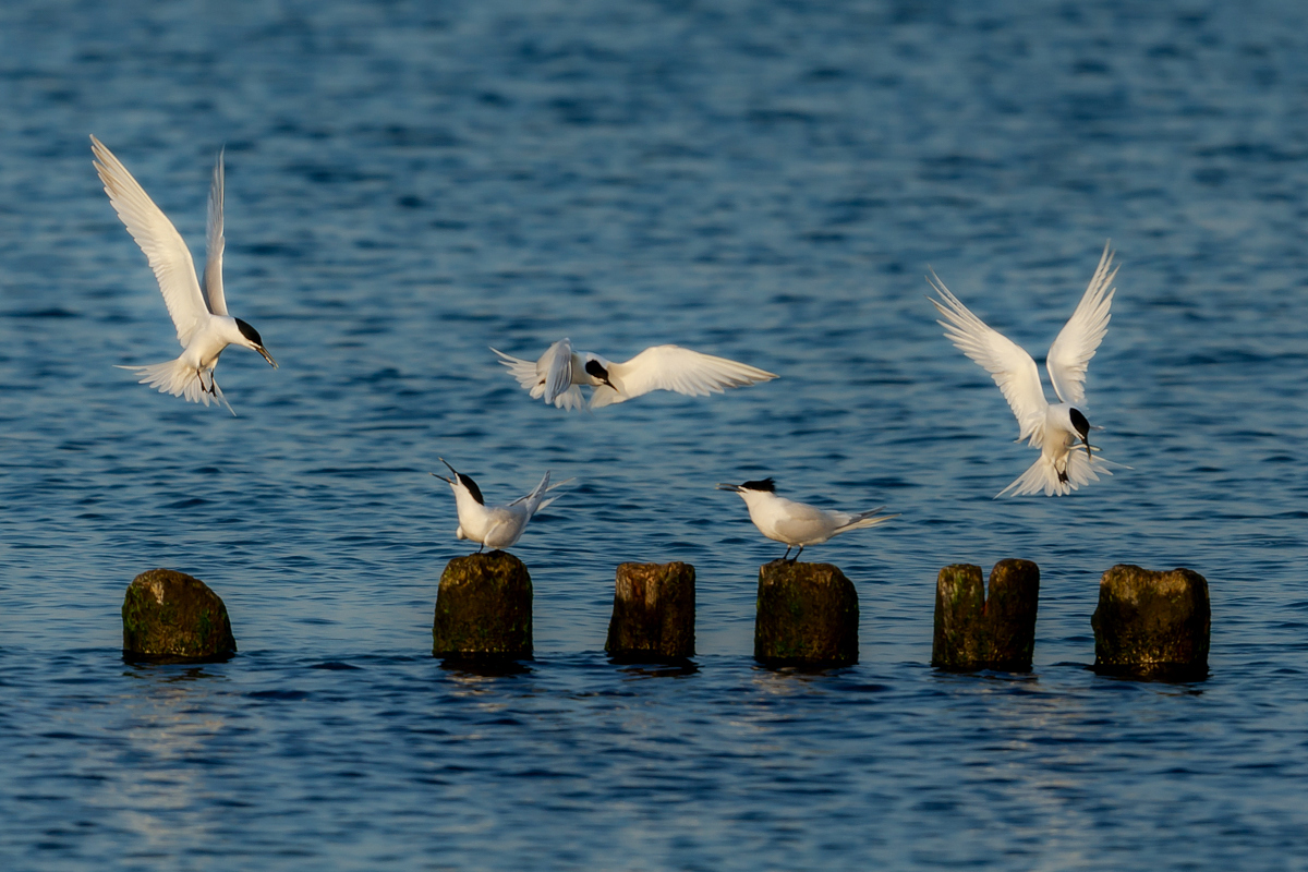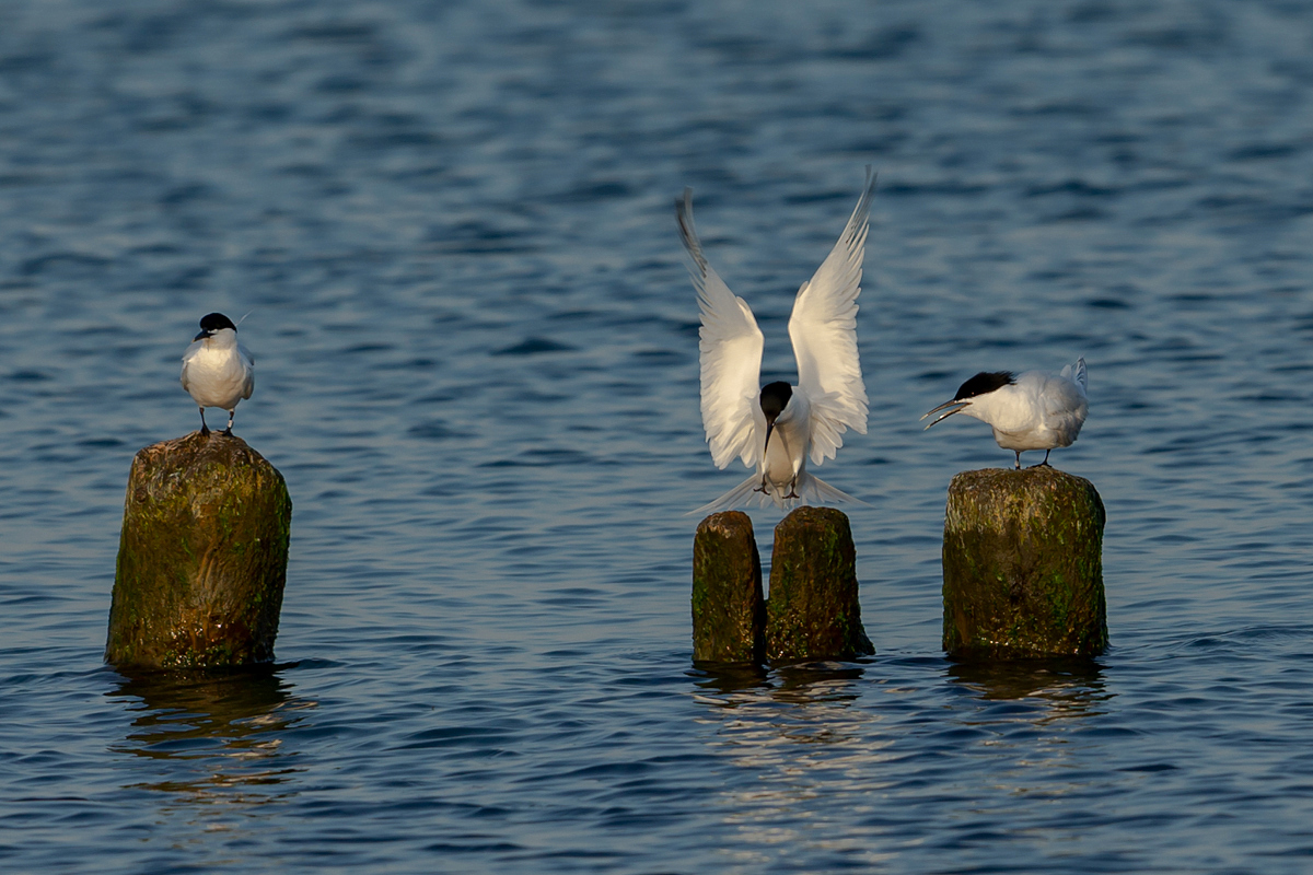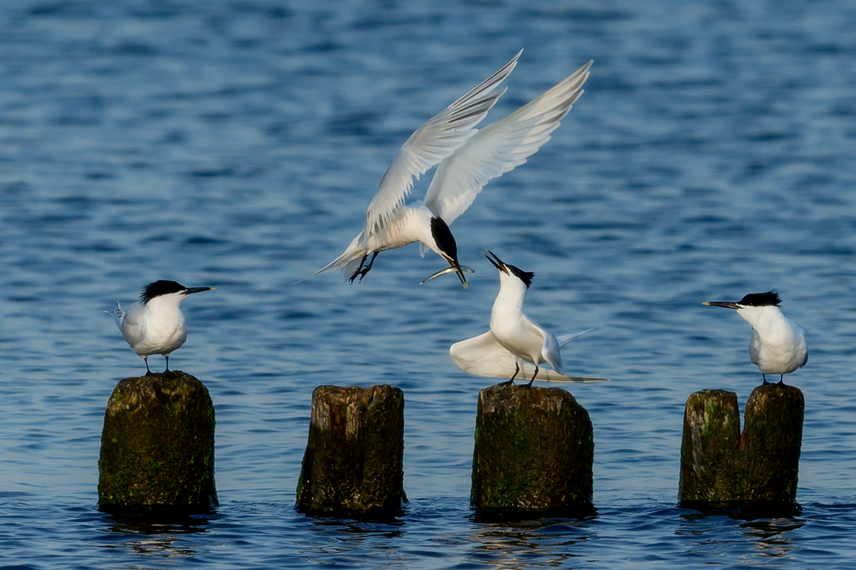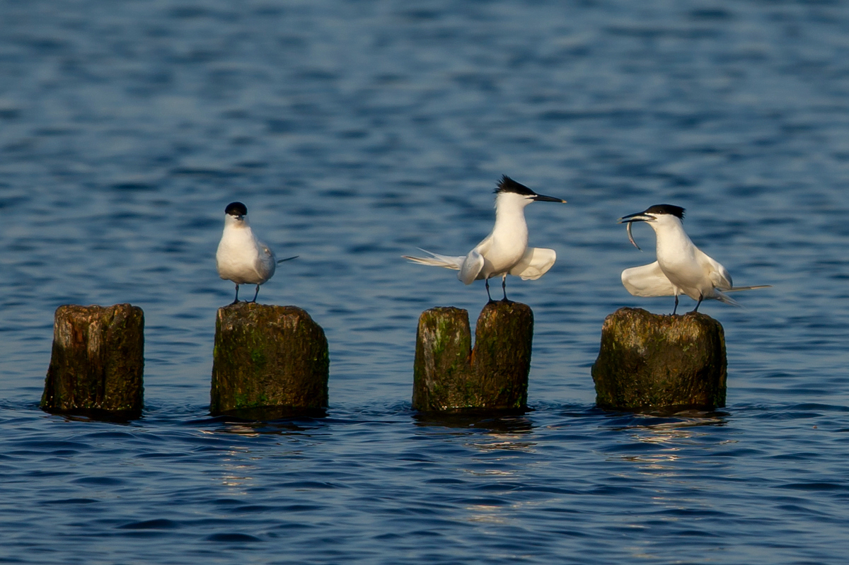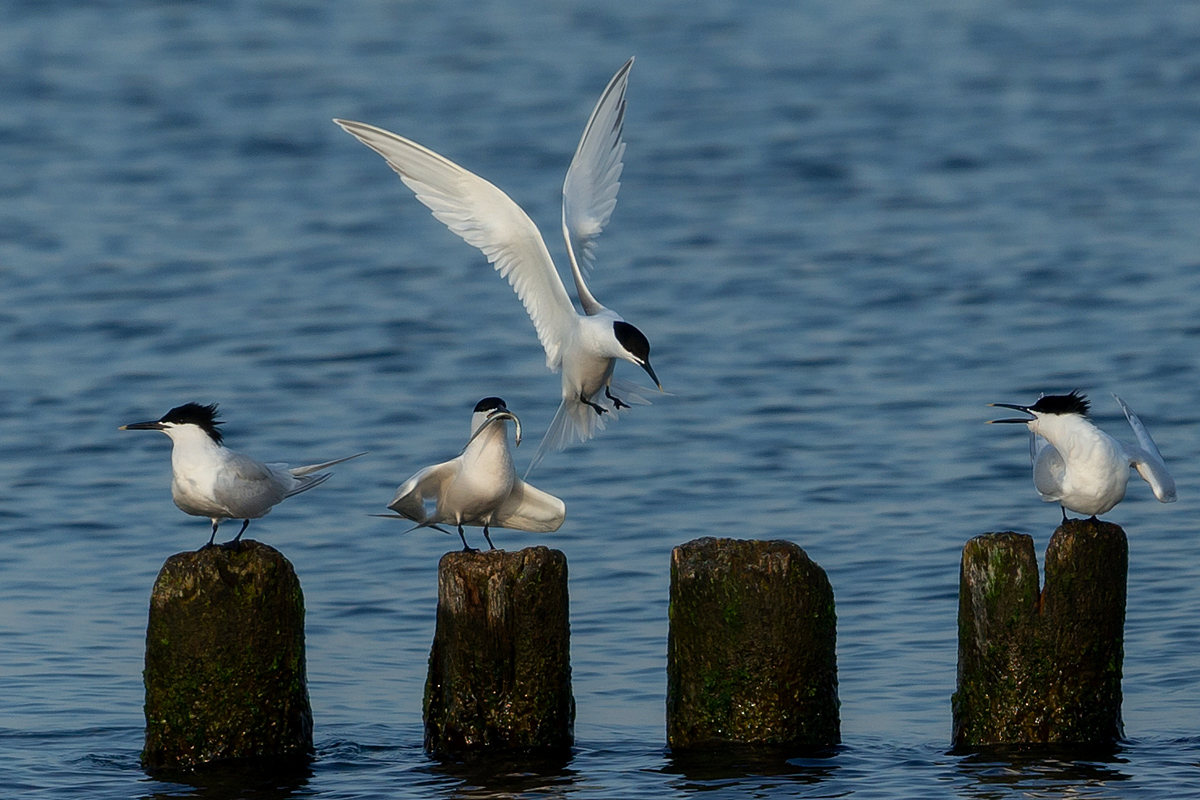 I wish such changes as the one that happened to this gallery occurred more often on my website. During one day of photographing I created a full gallery documenting beautiful morning scenes with the Terns in the foreground. More than this, I succeeded in recording their sounds. The males demonstrated their masculine prowess and skill at fishing. When you listen to the recording attentively, you can hear a splash of water. The males nose-dived into water chasing after fish. They fell into water really fast and they usually emerged from water with fish. The females, seated on the breakwater, looked at them attentively. The males were landing on the breakwater with the fish they caught and expected to win the female birds’ favours. Some of them submitted to their charm, appreciating their skill, and fed on the fish. The males who turned down swallowed their prey. They appeared to be very pragmatic in this respect. Welcome to the gallery.