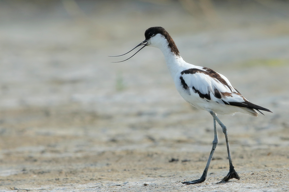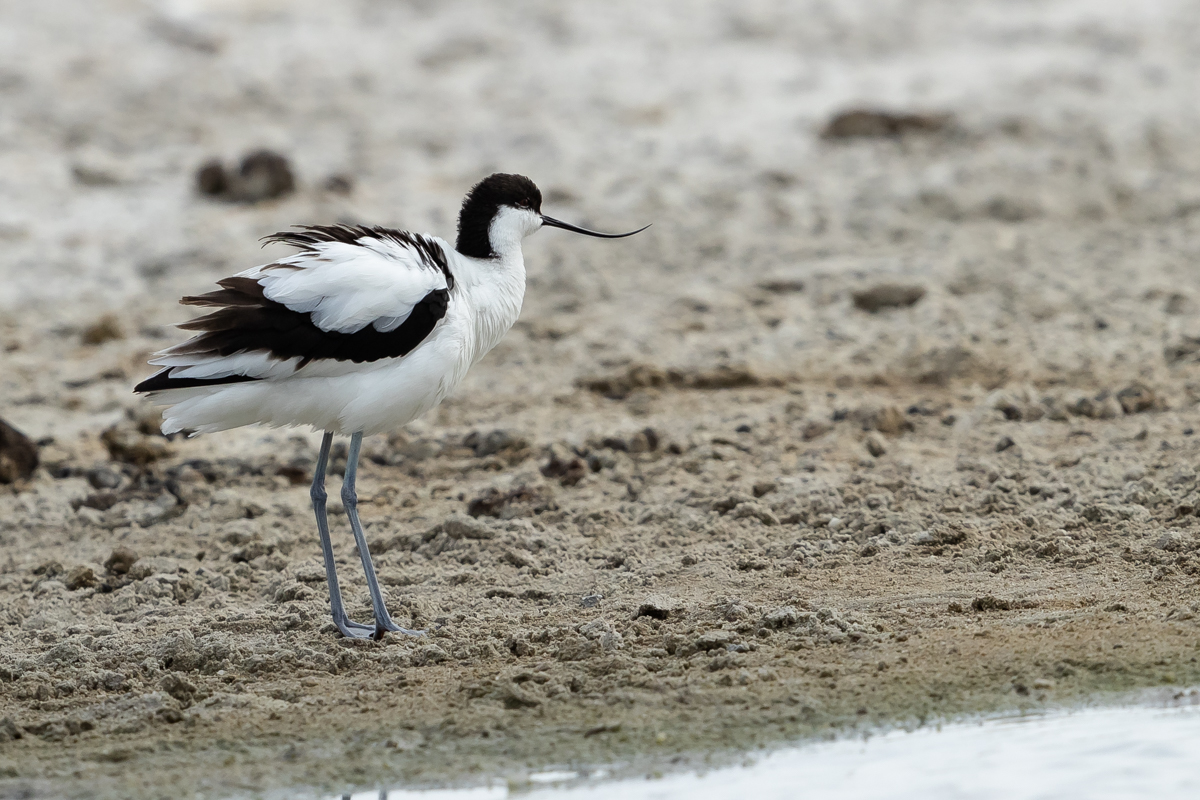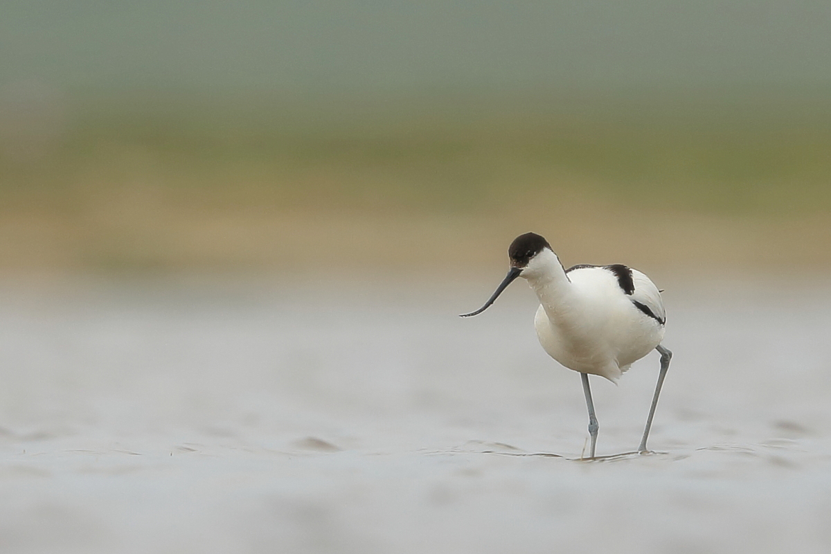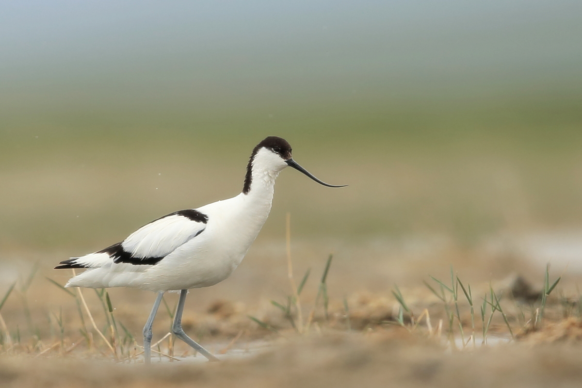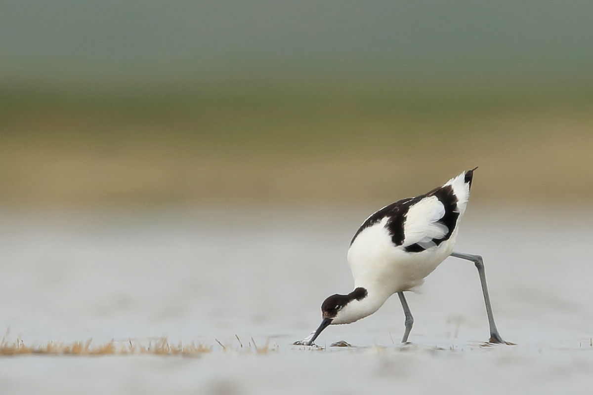 It occurs on the coasts of Europe and Asia most frequently. In Poland, an extremely rare visitor, though more and more often their hatching is said to be seen in our country. The pictures were taken in the Netherlands within the midday break in shooting the baillon’s crake. After a short conversation with the Dutch bird-watchers it was clear that pied avocets can be easily shot not so far away on the coast. They were not many there, probably less than 10 individuals living beside the colony of black-headed gulls and sandwich terns. They were not afraid of us and allowed to take pictures without camouflaging. Light was the biggest problem as it was a sunny cloudless day. We waited a few hours for better light conditions in the afternoon. Also the audio recording was a big trouble. Pied avocets could be heard occasionally, but colony of gulls and terns were active and noisy all the time, and they were in number of hundreds of individuals. To make matters worse we could hear the noise of civilization, and finally paramotor put an end to the audio recording. I hope to have one more opportunity to exchange this imperfect, short audio recording for a better one in the future, but for now it is like that . Pied avocets reach a weight of 0.4 kilogram, and their wingspan is less than 80 centimeters. In the case of these birds their height is also worth pointing, as it is about 0.5 meters. Avocet in fact belongs to the stilt family, Recurvirostridae, and their legs so long are specific of the family of those birds. Despite quite low weight their figure is rather tall.