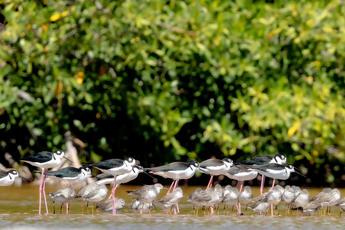 1.Tricolored Heron. 2.Killdeer. 3.Bananaquit (T,V). 4.Black-and-white Warbler (T). 5.Cape May Warbler. 6.Smooth-billed Ani (V). 7.Black-throated Blue Warbler. 8.Yellow-faced Grassquit. 9.Northern Parula. 10.Northern Mockingbird. 11.Prairie Warbler. 12.American Redstart. 13.Ovenbird. 14Turkey Vulture. 15.Red-legged Thrush (T). 16.Grey Plover (PL). 17.Feral pigeons (PL,T). 18.Black-crowned Night Heron (PL). 19.Royal Tern (T,V). 20.Willet. 21.Lesser Yellowlegs (PL,T). 22.Magnificent Frigatebird (T). 23.American Kestrel. 24.Little Blue Heron. 25.Greater Yellowlegs (PL,T). 26.Black-necked Stilt. 27.Short-billed Dowitcher. 28.Greater Antillean Grackle. 29.Green Heron. 30. West Indian Whistling-Duck. 31.Snowy Egret. 32.Great Egret (PL). 33. Least Grebe. 34.Sanderling.