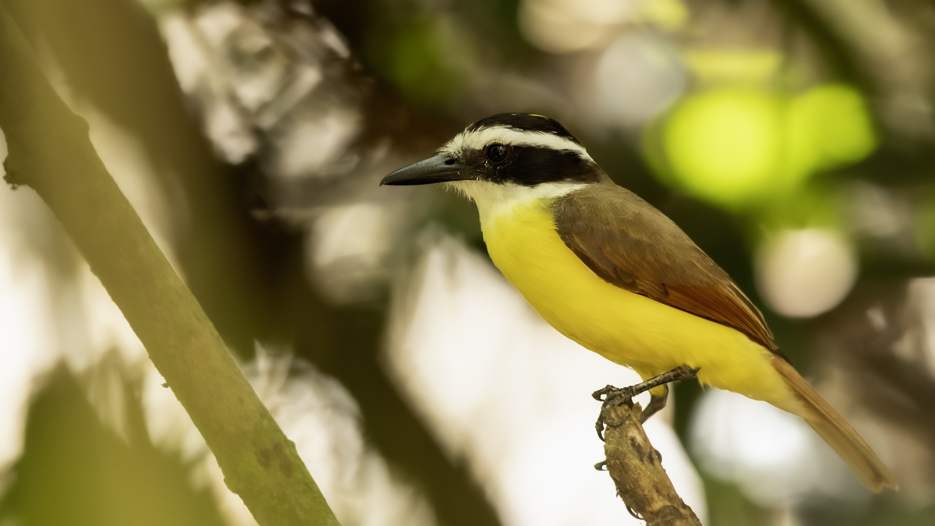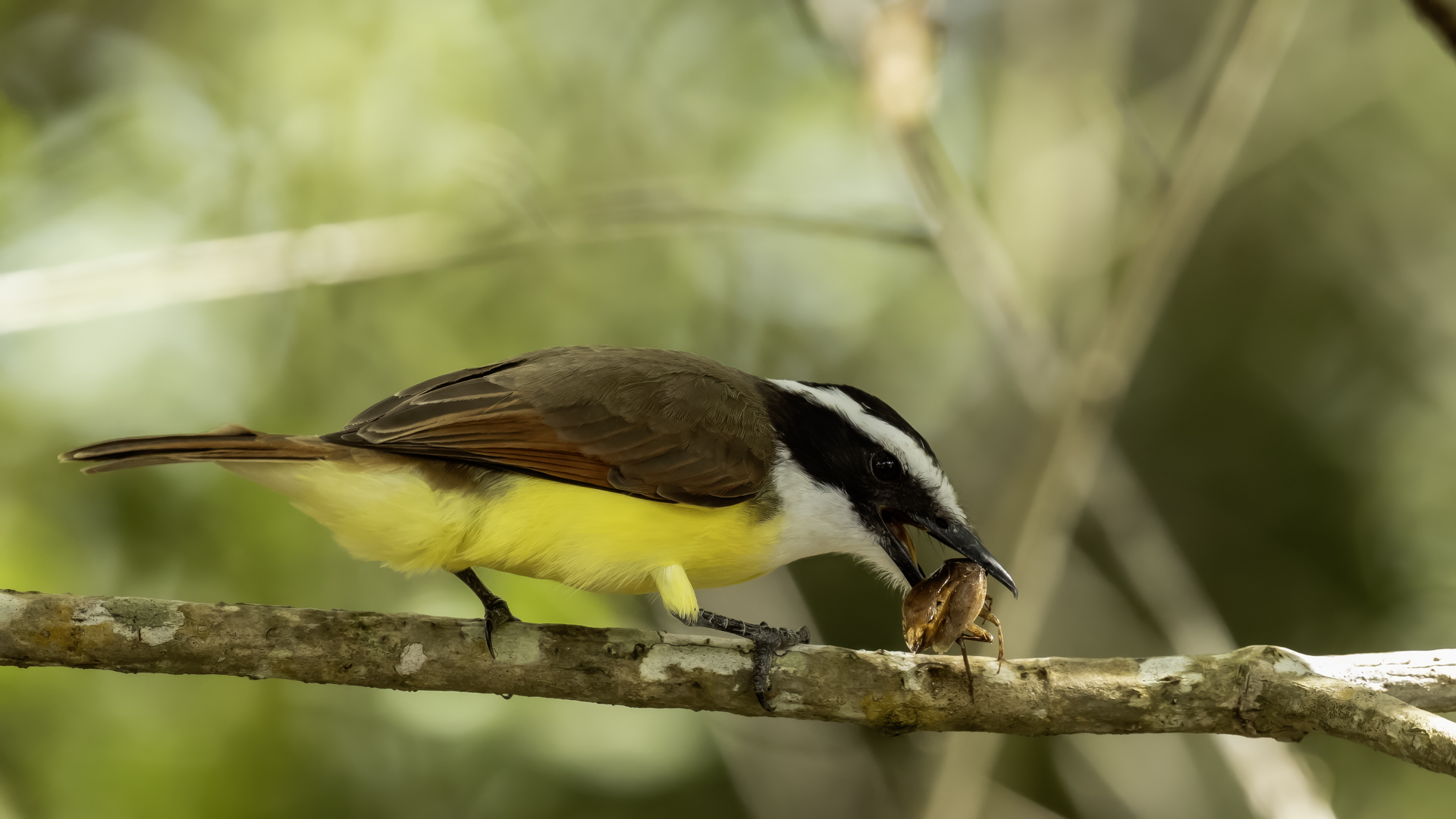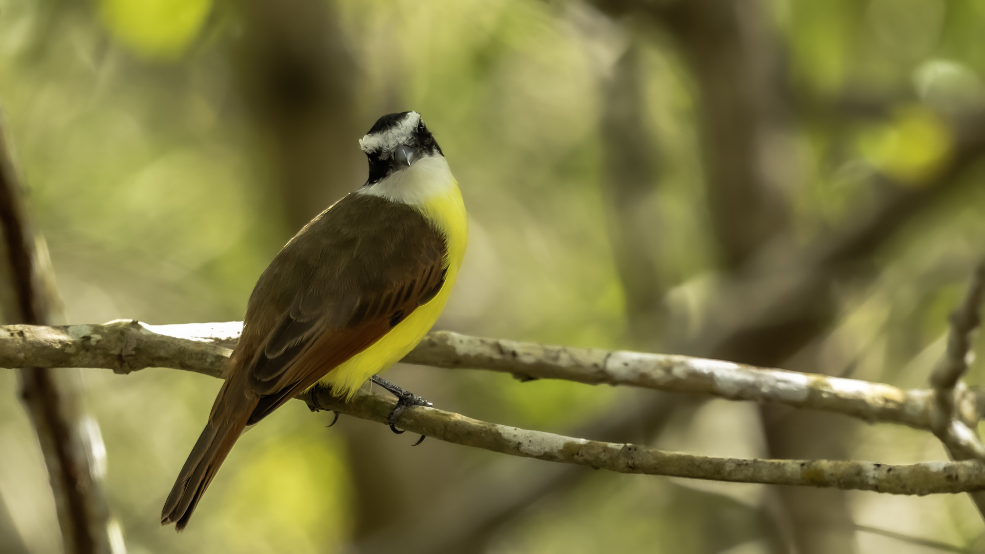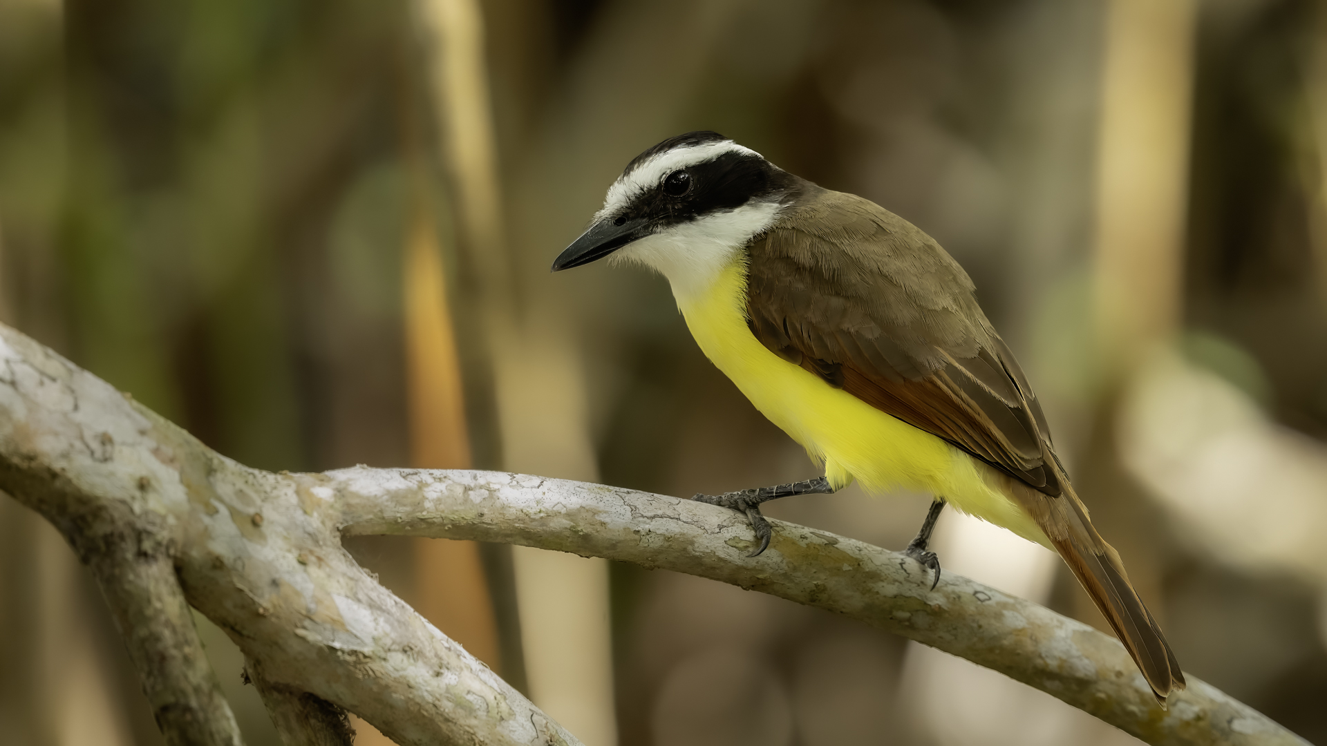 In the vicinity of Iguazu the great kiskadee occured quite commonly, but I always could see them a long way off, keeping a distance. Once, while I was walking on the lawns of the hotel at sunrise, a great kiskadee came really close. I was alone and behaving calmly so the bird was more curious than scared. It was early in the morning so while waiting for the light I hung the camera on my arm and tried to record sounds. I managed to record a few sounds of the great kikkadee’s voice, and this time the only obstacle was the sound of a white-throated sparrow, whose voice was prevailing in this part of the park this morning. The great kiskadee weight is about 60 grams. It occurs in Mexico and South America.