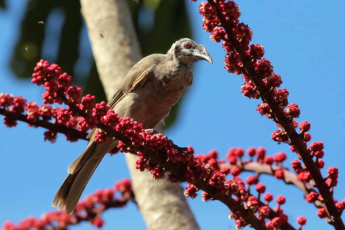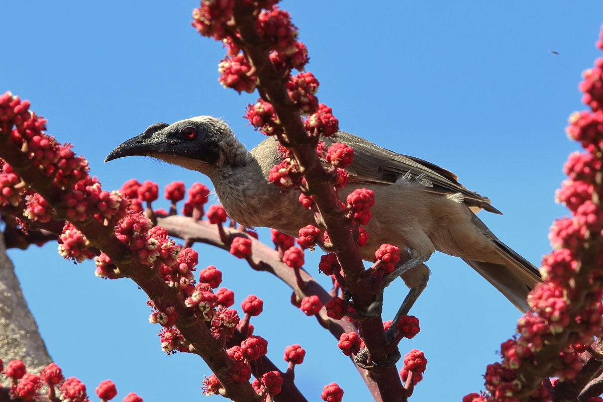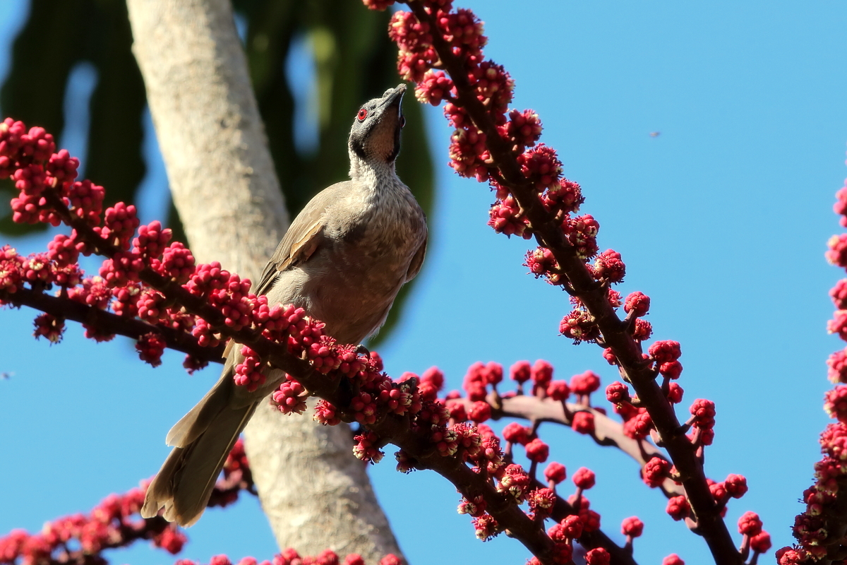 Shooting the Helmeted Friarbird I had the impression that it was a miniature dinosaur. Especially because of its head and beak. Meanwhile the Friarbird belongs to the Meliphagidae family, and in the family there are about 16 species of honeyeaters. The presented species of the Friarbird is the third in my gallery. Friarbirds feed on nectar, but also insects, fruit and flowers..